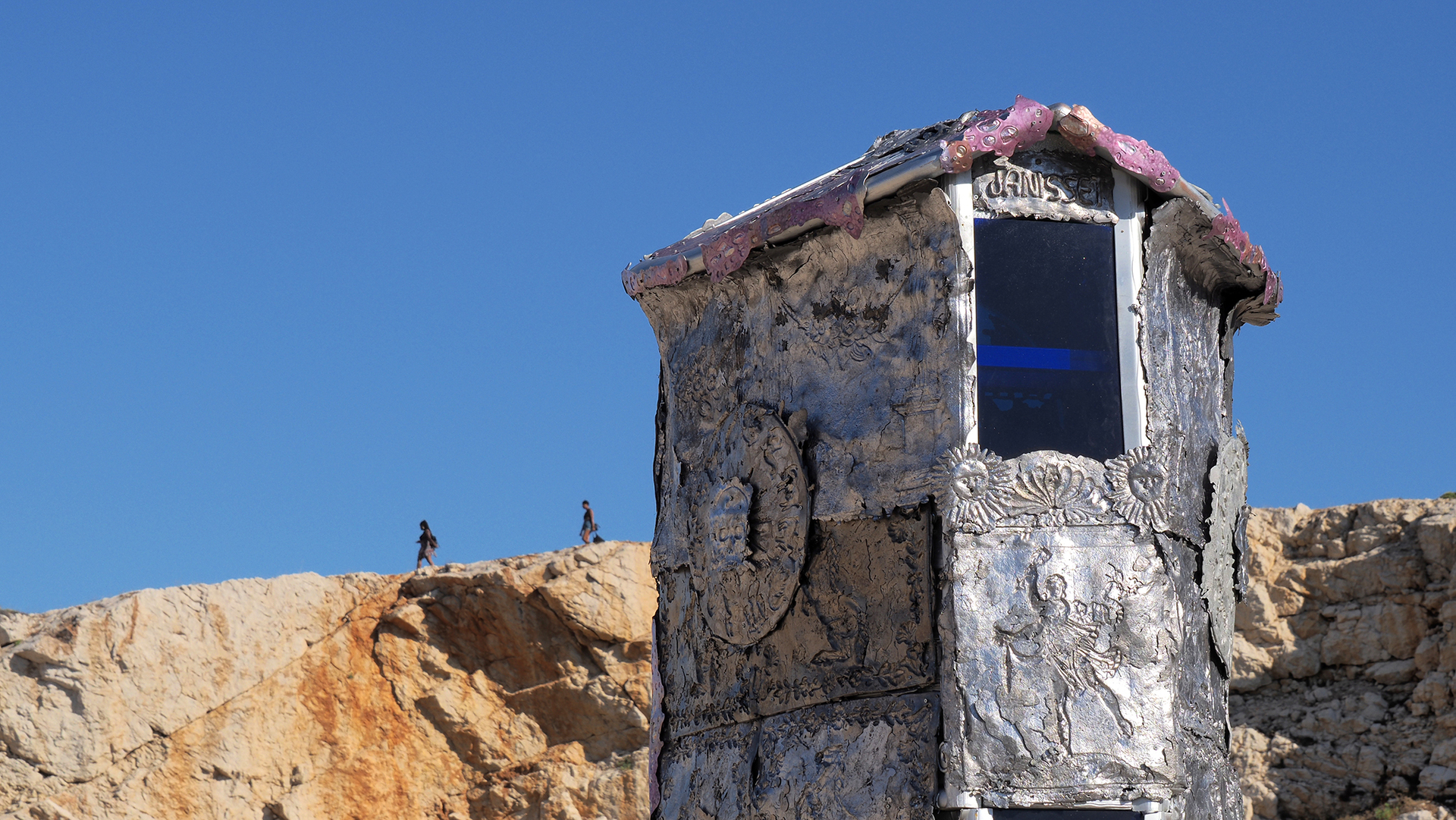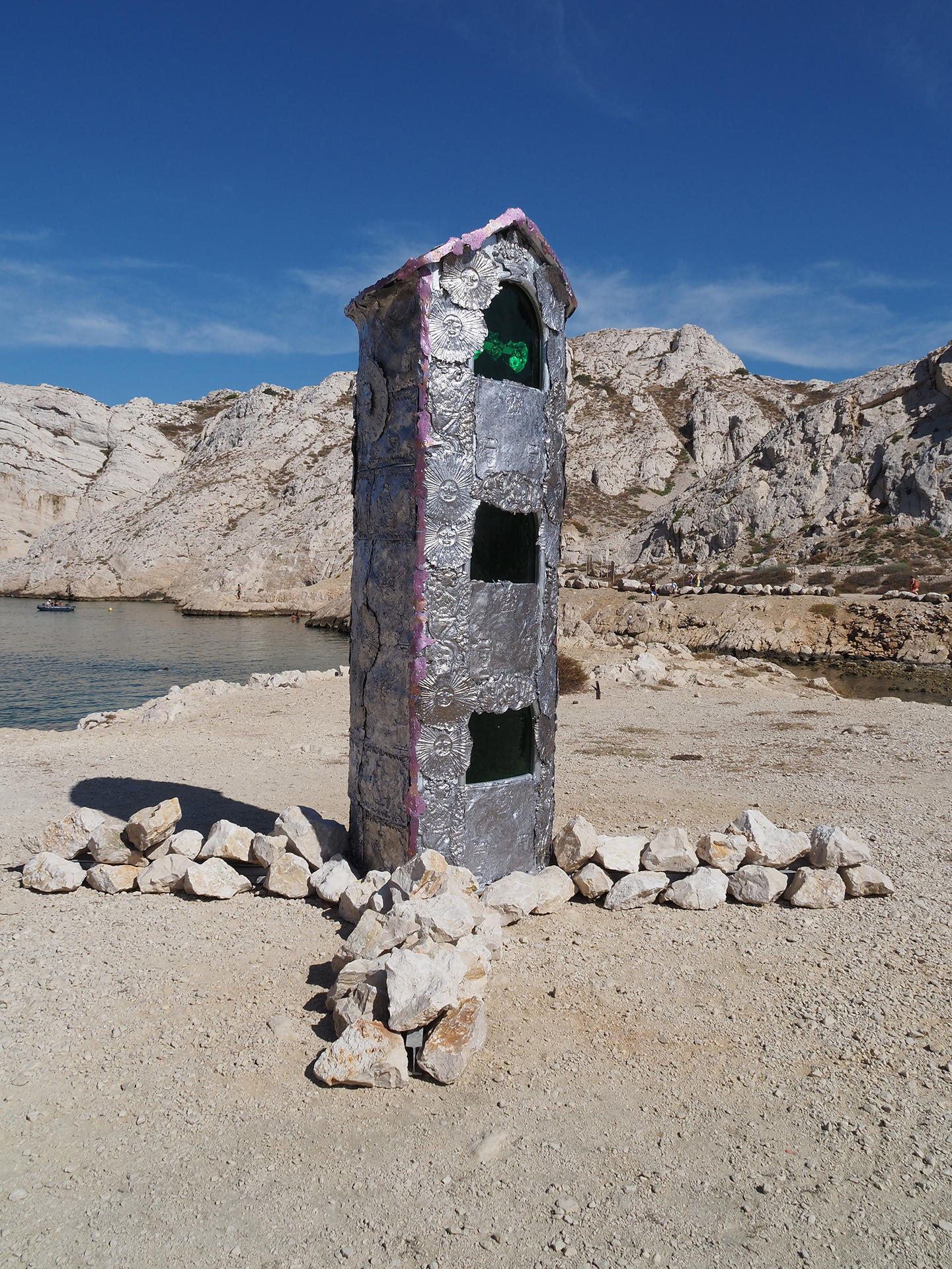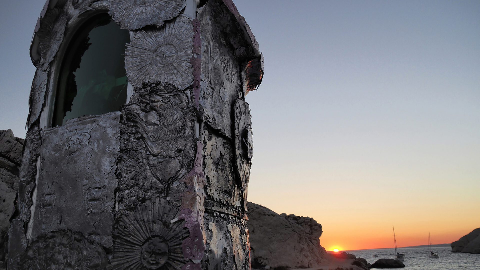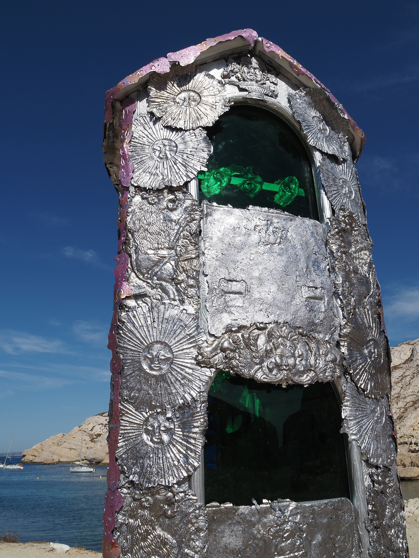 Jean-Baptiste Janisset explains that he is not a fine craftsman: all the symbols he uses are snatched from others. The artist sees himself more as a witness to the past, a creator of syncretism between diverse beliefs and plural existences. Janisset's 'Smile to the Angles of Frioul' building is therefore the center of gravity of a multitude of consciousness. We are thus projected into a place of all and no religion, a new path which Jean-Baptiste Janisset seams to outlined for us.