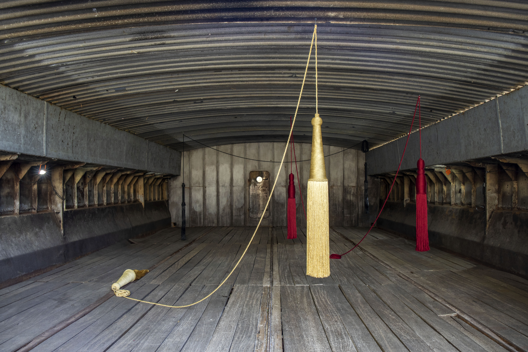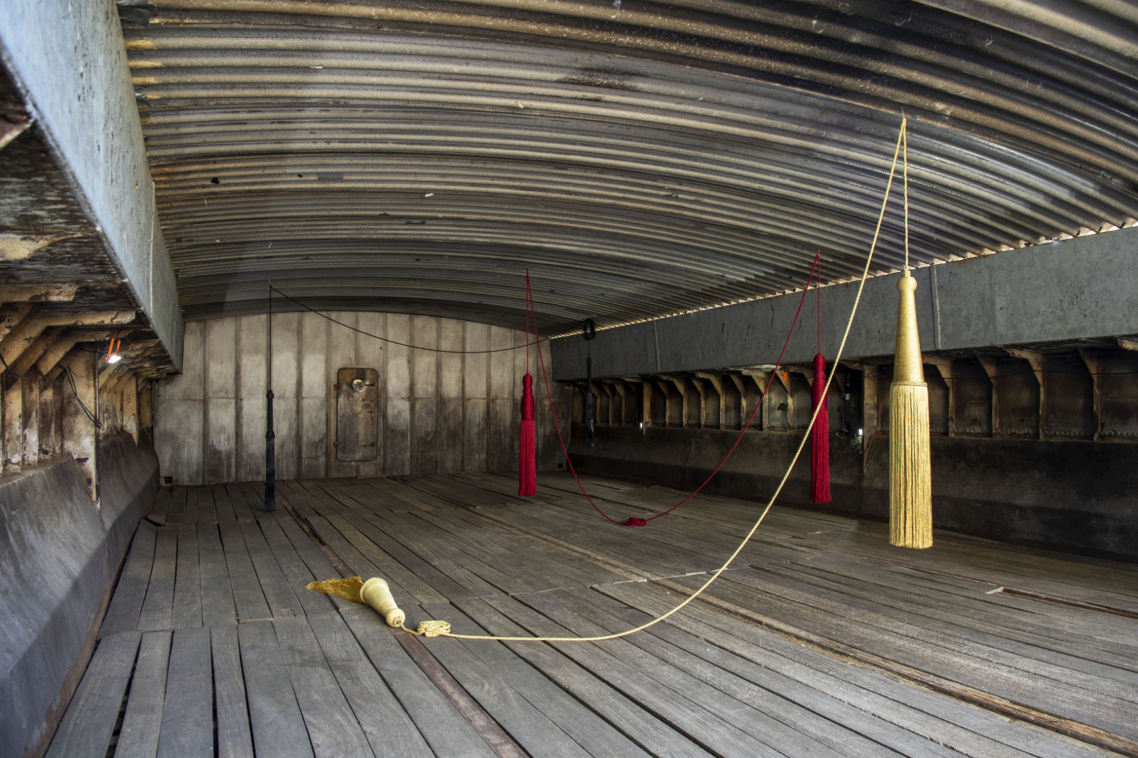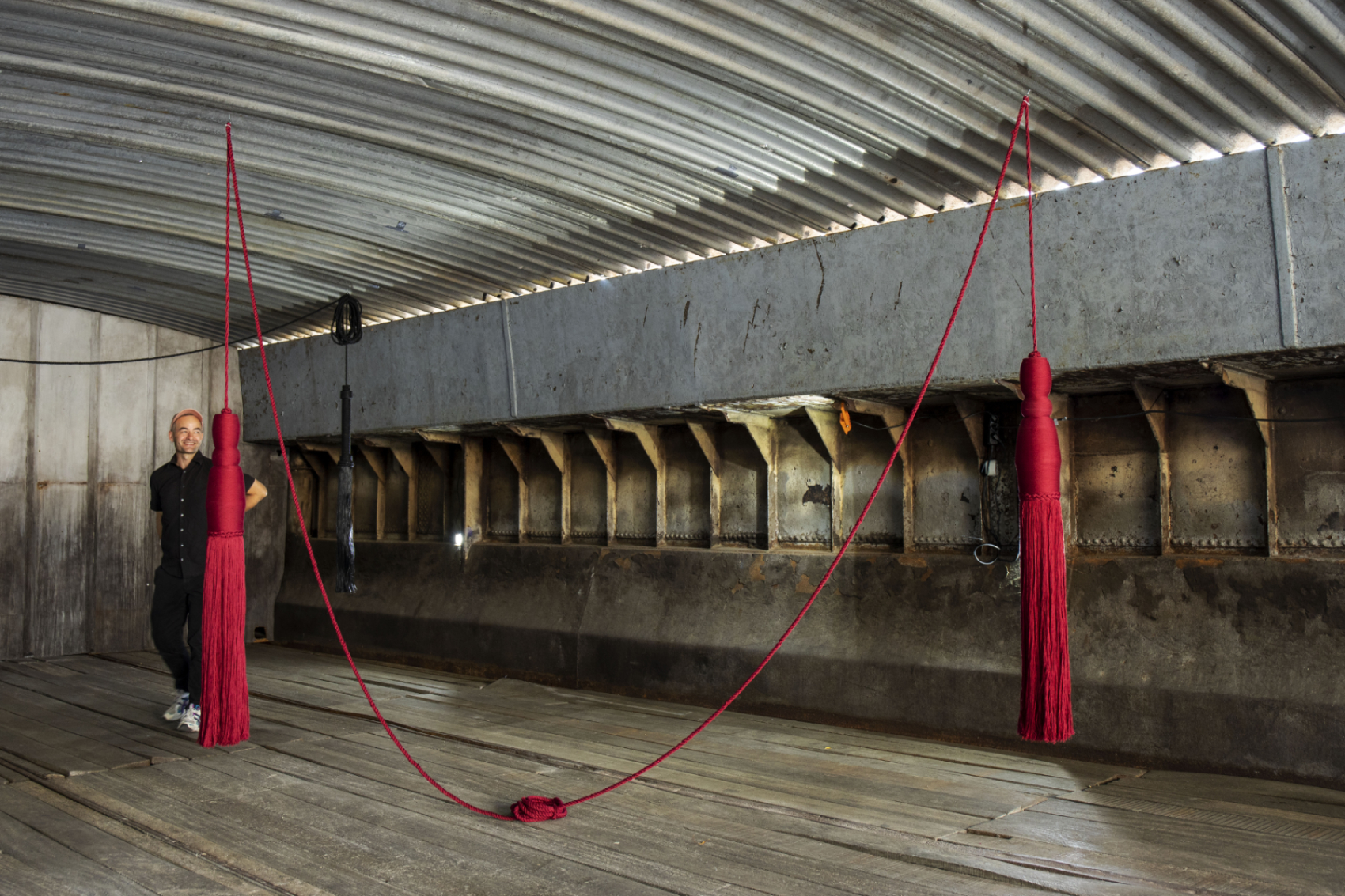 Interested in the symbolic and decorative role of tassels, and their similar functions in notably diverse contexts, Rasmus Søndergaard Johannsen’s fascination is materialising in Wound. He is exhibiting three pairs of tassels on an exaggerated scale: one pair from the military realm, one from the domestic sphere and a third pair from the erotic field. Both the tassels and their connecting ropes are entirely hand-made and hand-wound from thin string or leather. The fabrication of each tassel required several steps and techniques, which the artist meticulously learnt during a two-year research and experimentation process.