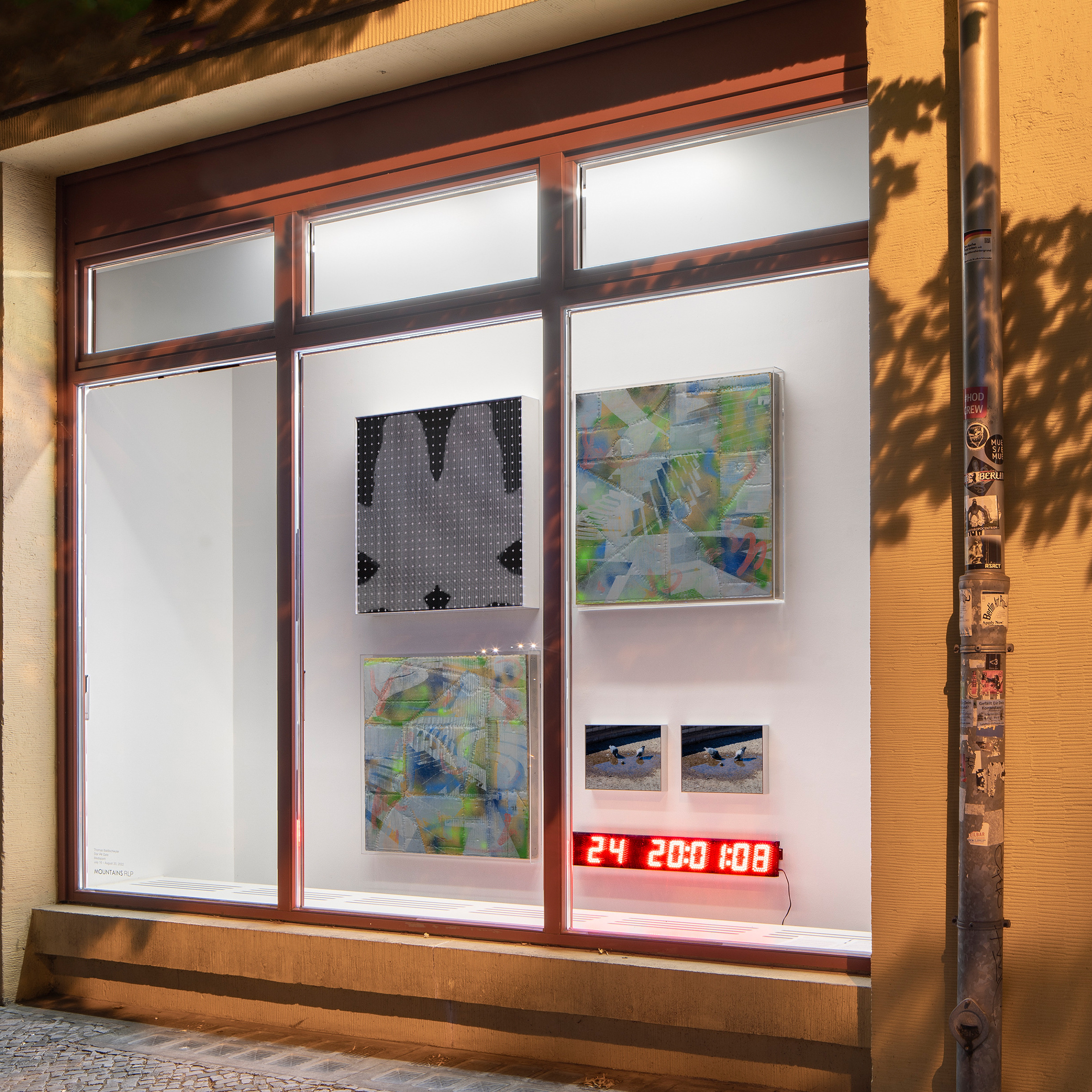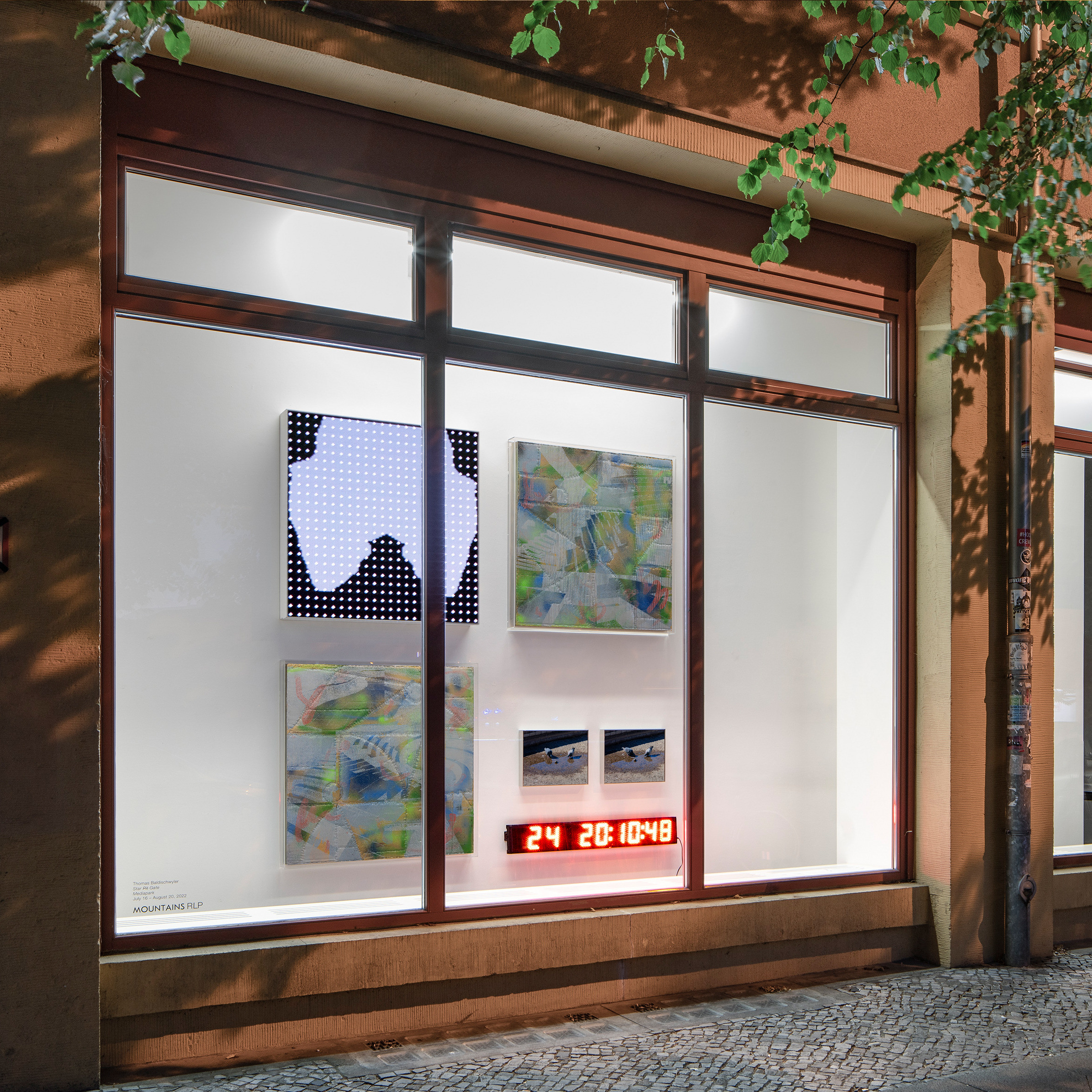 Two collaged objects are now on display in the Mountains window. They use this material and their format reflects an LED display that is also installed. On this display a digital low res travesty of the aforementioned Trumbull technique can be seen. In addition, the irritating double exposure of the invitation card is dissolved and a red time code indicates the end of the quasi-public intervention.