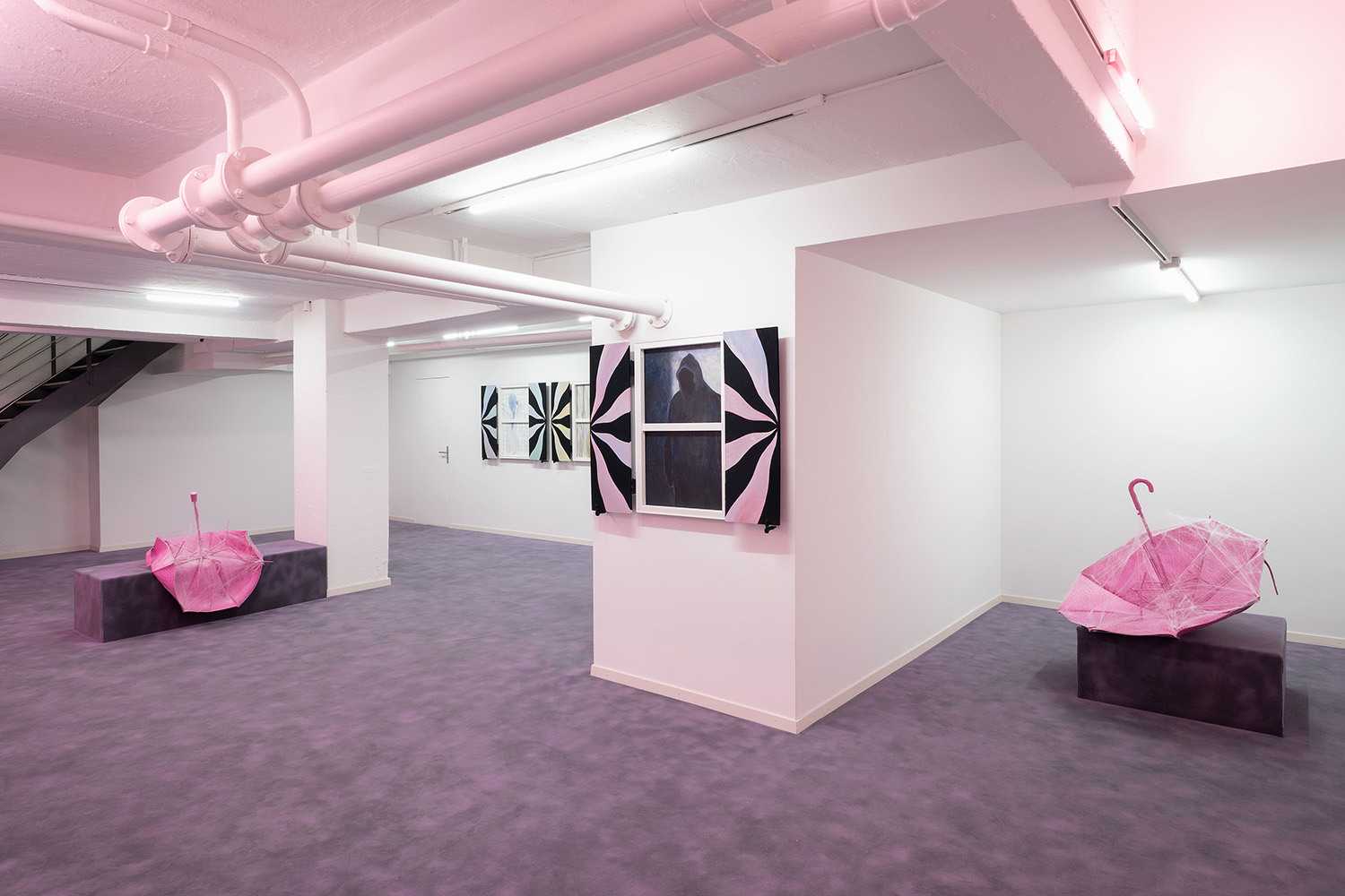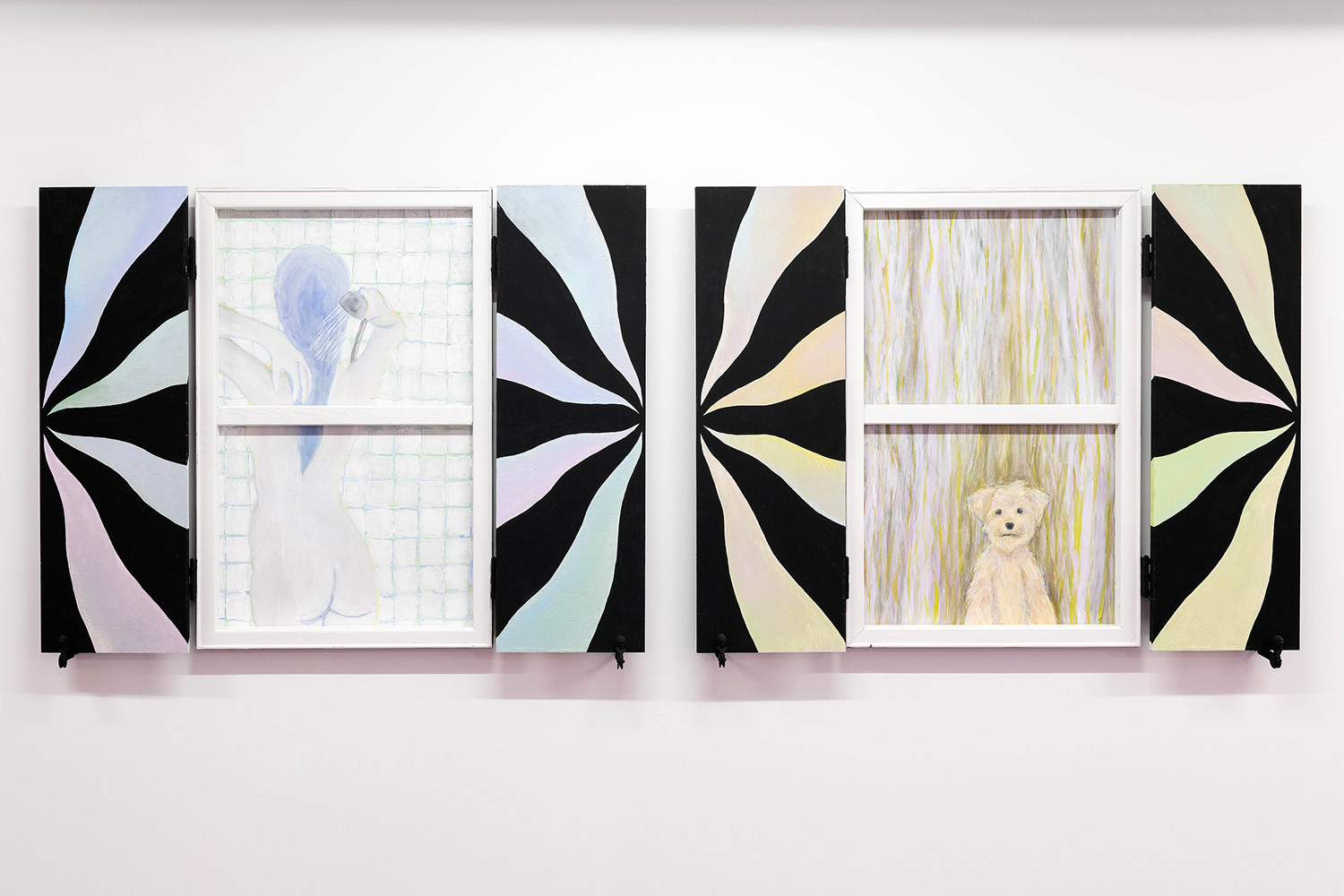 The paintings here have been inverted too, a subtle switch which suggests a window, although painting has traditionally promised itself to be a window already. An equal illusion. Physically inside looking at an illusory inside, one witnesses the banal and stimulating ways voyeurism works. As with Hitchcockâs masterpiece, Rear Window, every portal mirrors the creator and viewer, their desires and fears. Sex, horror, cute and daily- the images pictured transcend the painting while being the painterly. Why else are they boxed in by their opposite? The hardedge, design, neo-geo. The flaming designs, borrowed from those of traditional Swiss alpine architecture, are related to the flags of Swiss mercenary groups from four centuries ago. Fear tactics to confuse an opponent's men as if a burning hoard approaches.