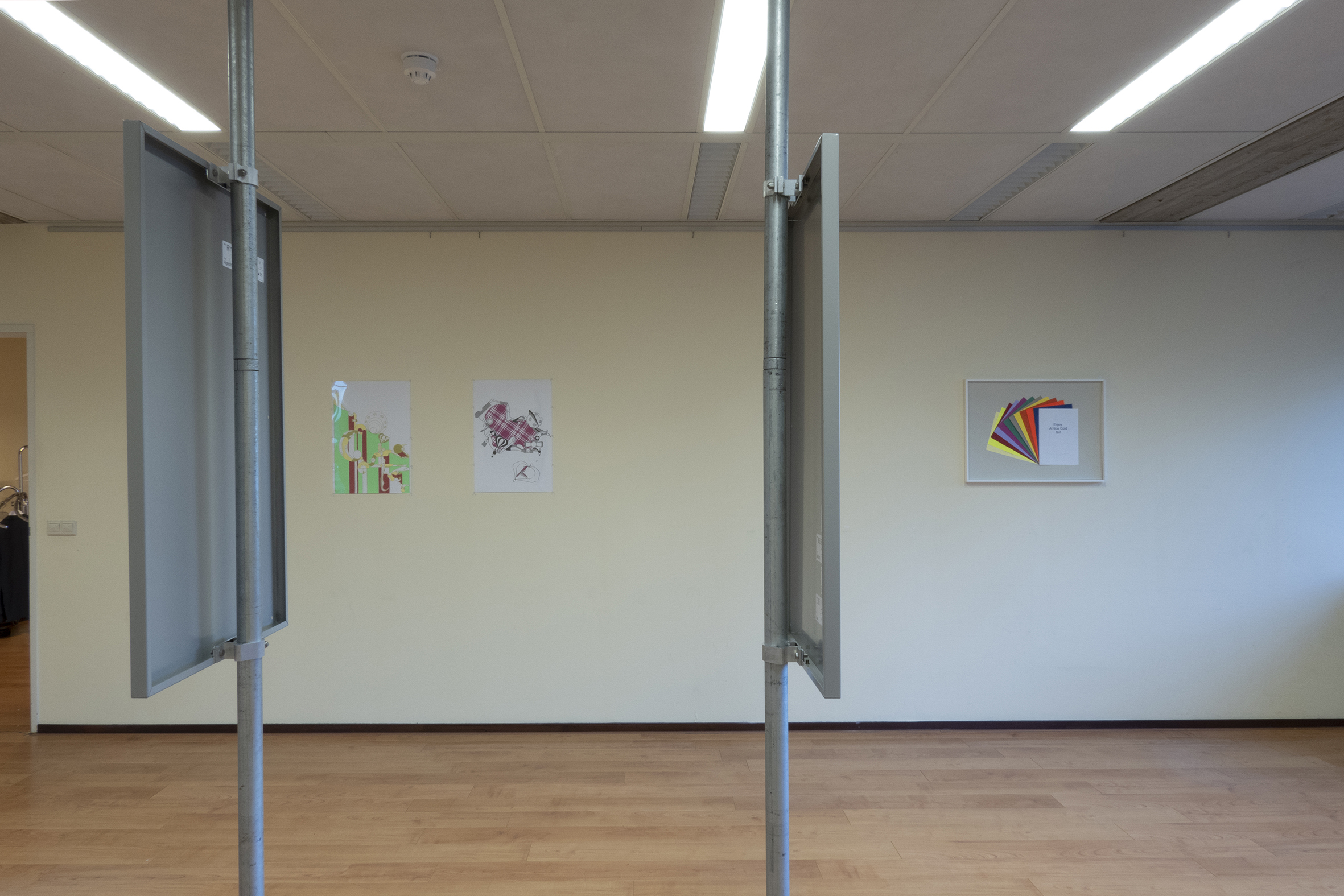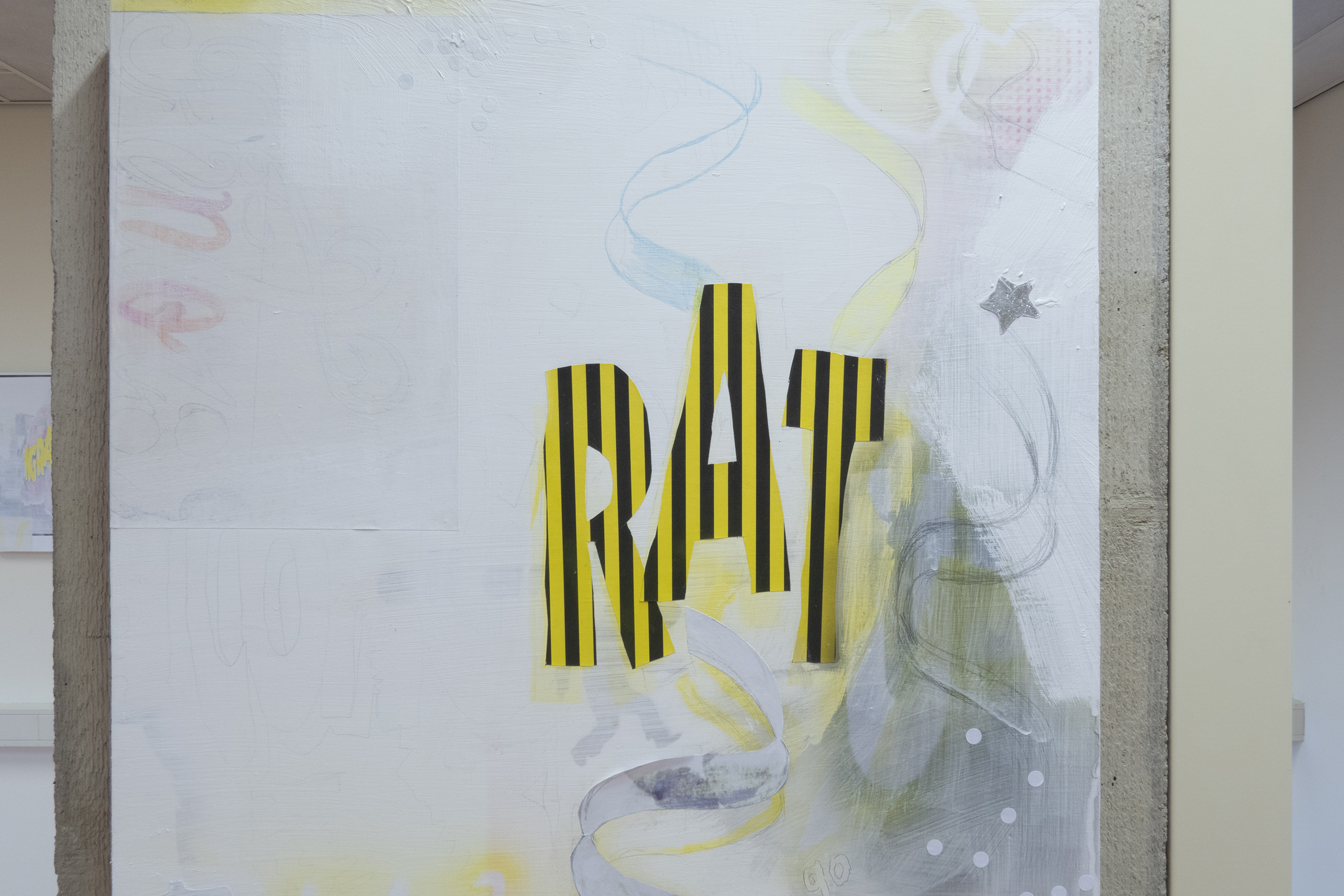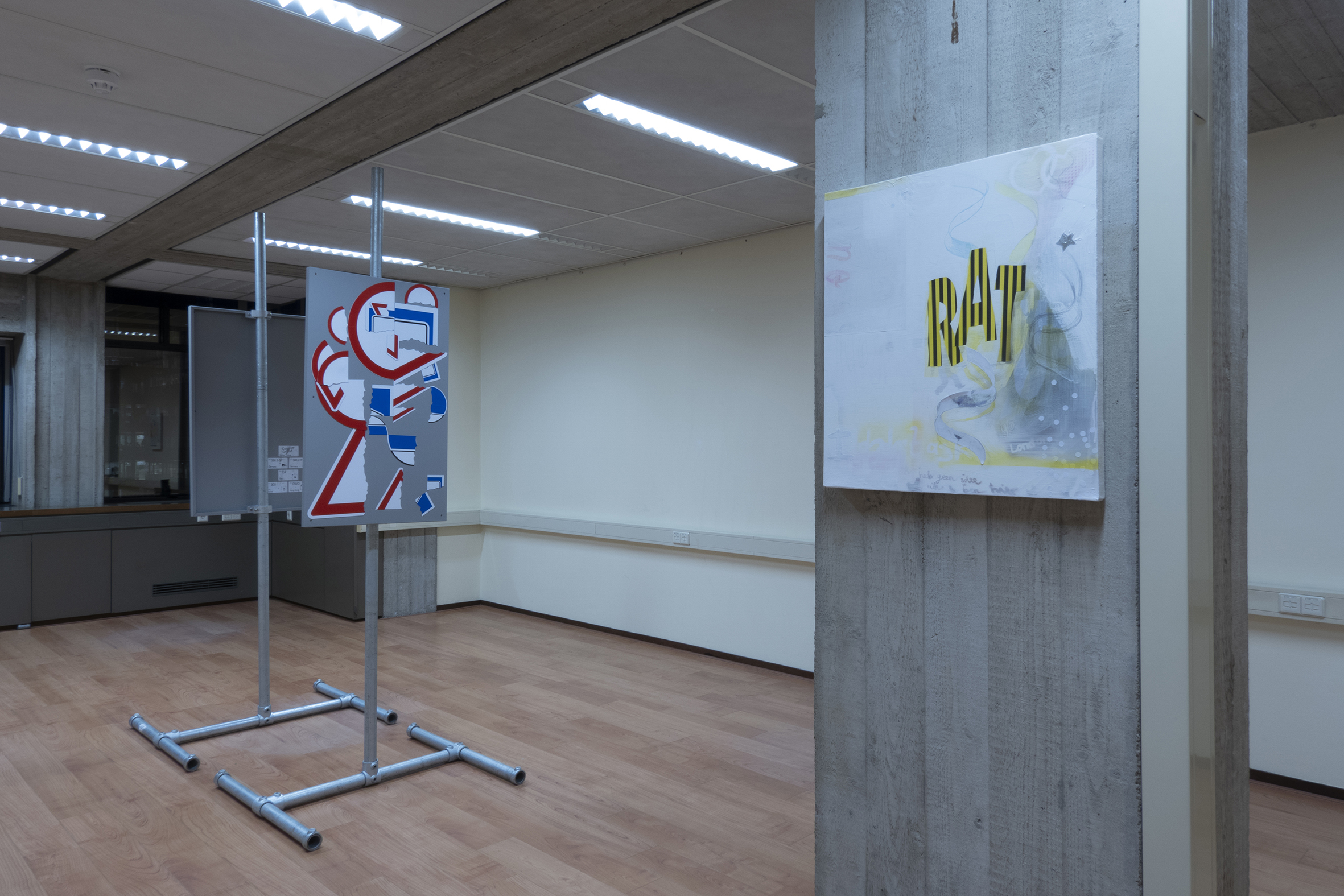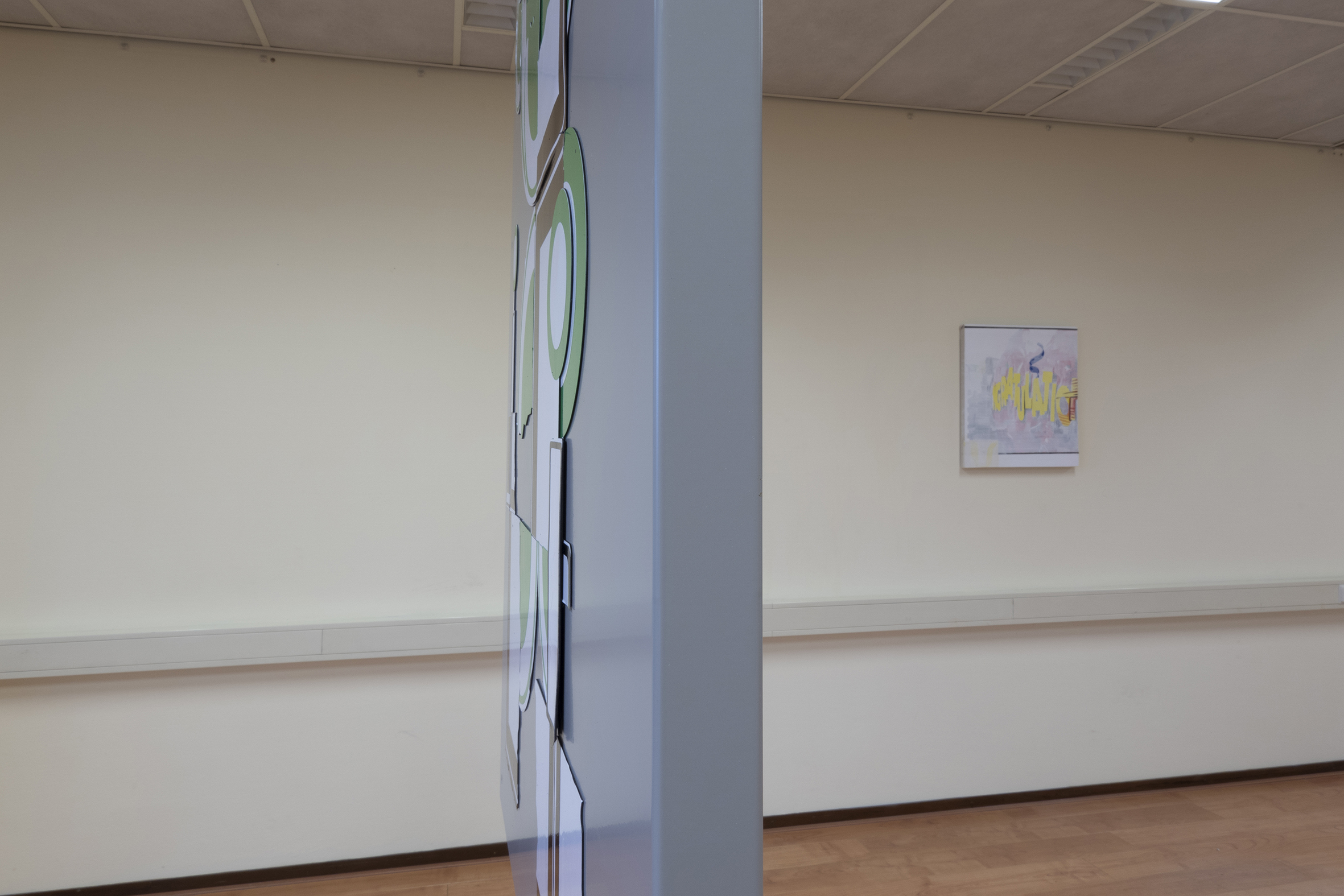 whatever(,)show(â)s up(!) plays games of syntax and symbols, where recognisable signifiers are fractured into layers to a brink of abstraction. Matas Buckus copies the materials of temporary road signs into his own proportions, and the magnetised pieces offer the illusion of sensual autonomy. The cut outs of magnets and layered, monochromatic adhesives form loosely overlapped, pareidolic compositions. The swerving lines of the cuts contrast with the cleaner sign-like shapes to invoke silhouette portraiture, a suggestion of dimension with minimal palette. The diverting colour ways of Hyo Young Chuâs layered silkscreens similarly evade declarations of depth. Drawing typographic elements into compositions, letters become figures with ornaments like clasps, bows, and patches. The dominant white ground is echoed in the work of Millie Rose Dobree, in which the repeated, incomplete greeting of a mylar balloon appears to have rotated between the stretched canvases. The zany lettering floats over a milky ground of wall paint, which shrouds graffiti-doodles and adhesives, somewhere between the wall of a toilet cubicle and a Polaroid of a party in the city.