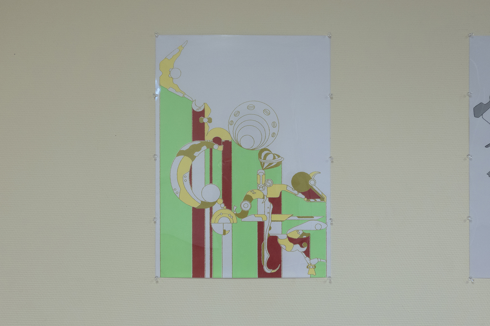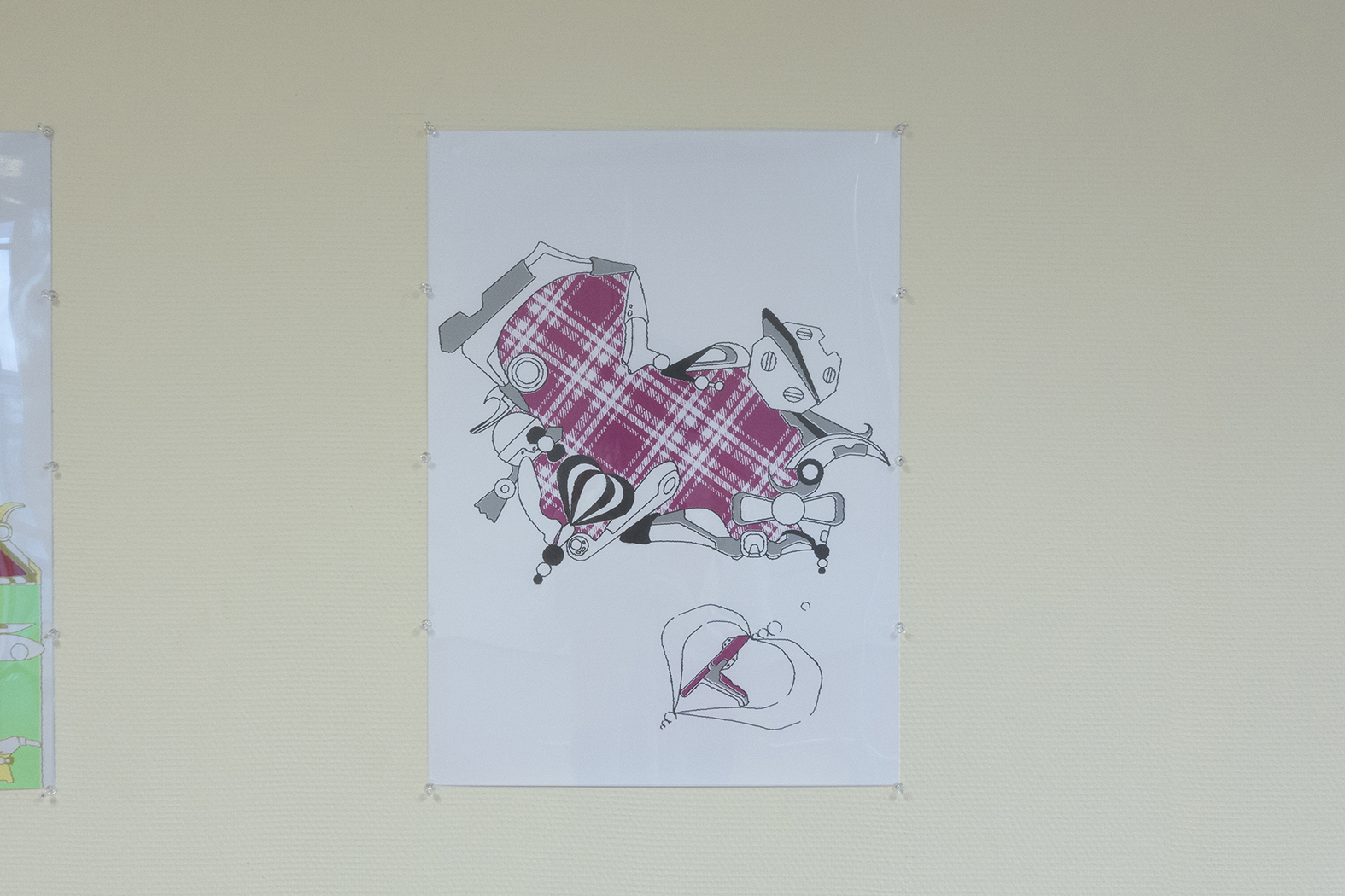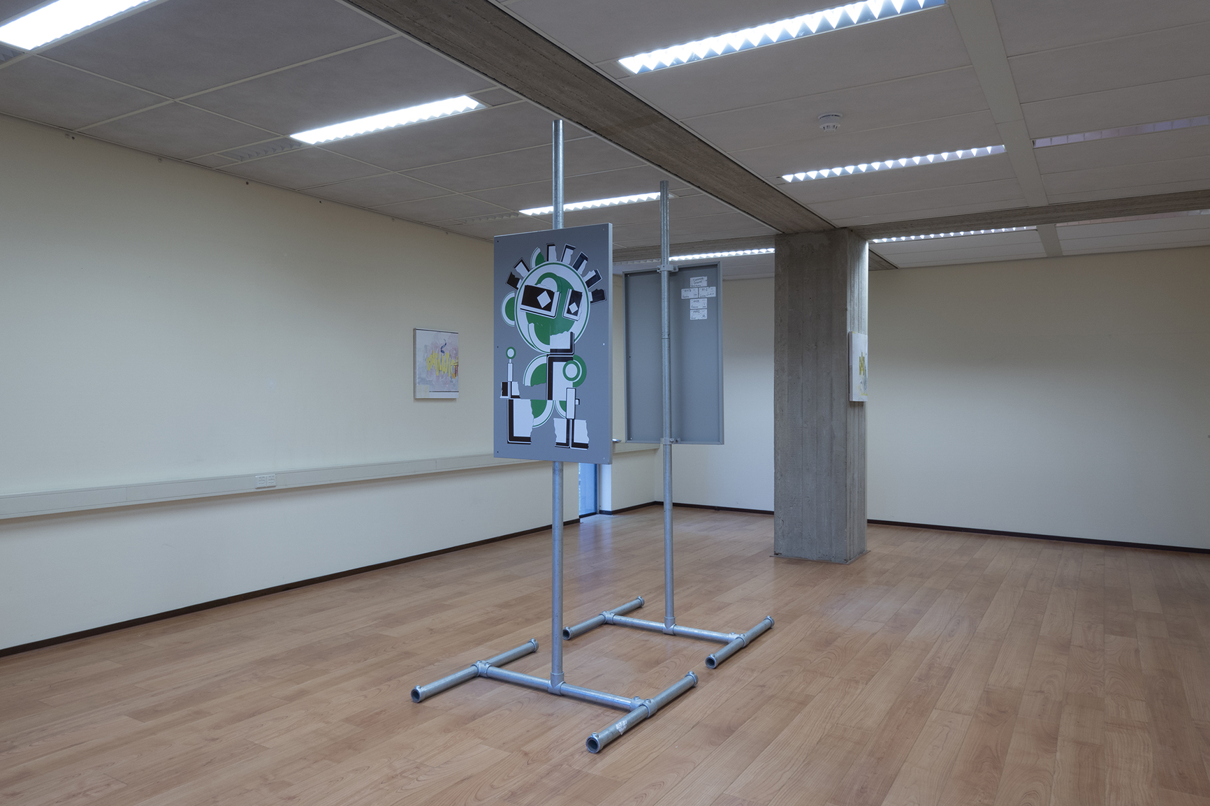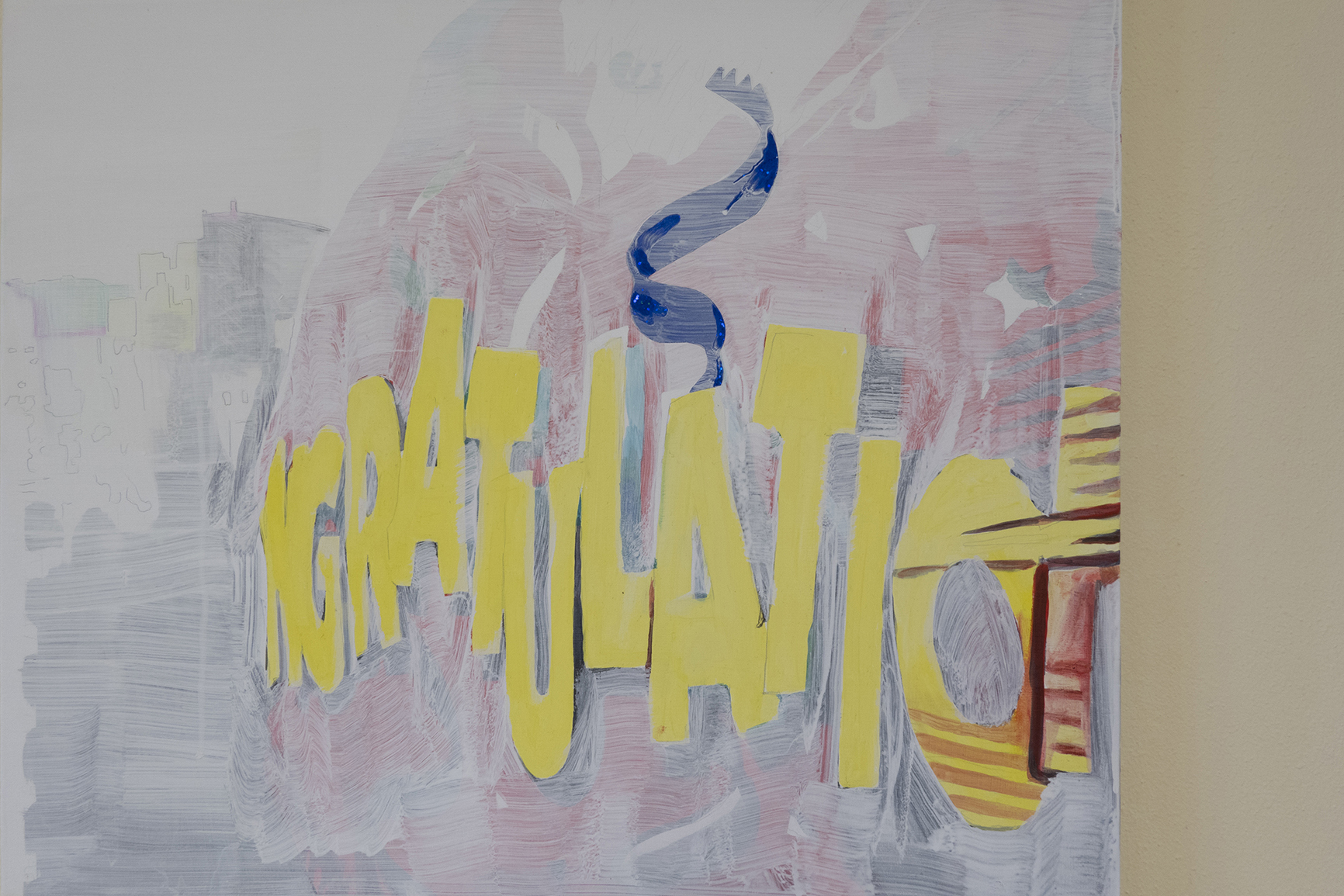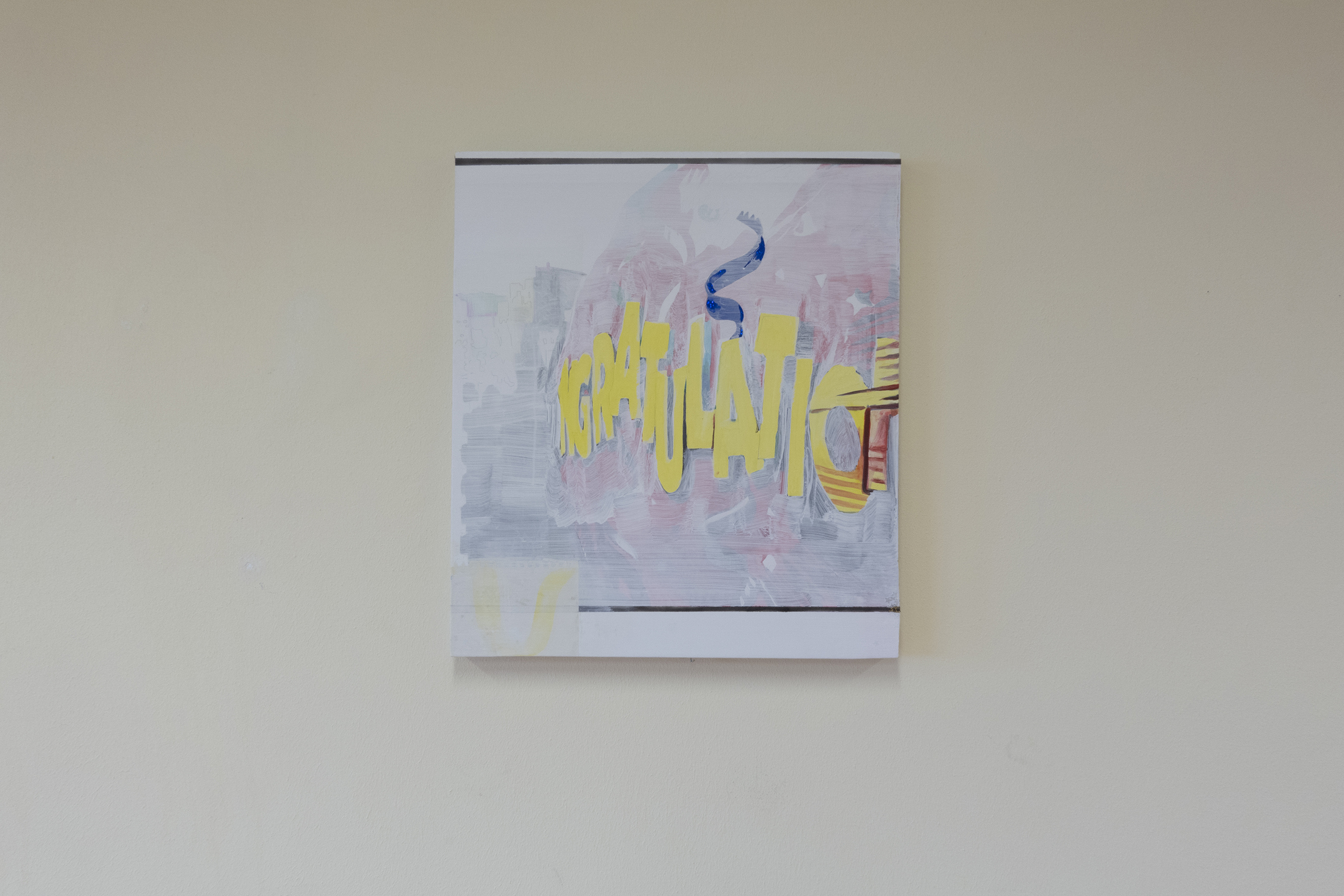 whatever(,)show(â)s up(!) plays games of syntax and symbols, where recognisable signifiers are fractured into layers to a brink of abstraction. Matas Buckus copies the materials of temporary road signs into his own proportions, and the magnetised pieces offer the illusion of sensual autonomy. The cut outs of magnets and layered, monochromatic adhesives form loosely overlapped, pareidolic compositions. The swerving lines of the cuts contrast with the cleaner sign-like shapes to invoke silhouette portraiture, a suggestion of dimension with minimal palette. The diverting colour ways of Hyo Young Chuâs layered silkscreens similarly evade declarations of depth. Drawing typographic elements into compositions, letters become figures with ornaments like clasps, bows, and patches. The dominant white ground is echoed in the work of Millie Rose Dobree, in which the repeated, incomplete greeting of a mylar balloon appears to have rotated between the stretched canvases. The zany lettering floats over a milky ground of wall paint, which shrouds graffiti-doodles and adhesives, somewhere between the wall of a toilet cubicle and a Polaroid of a party in the city.