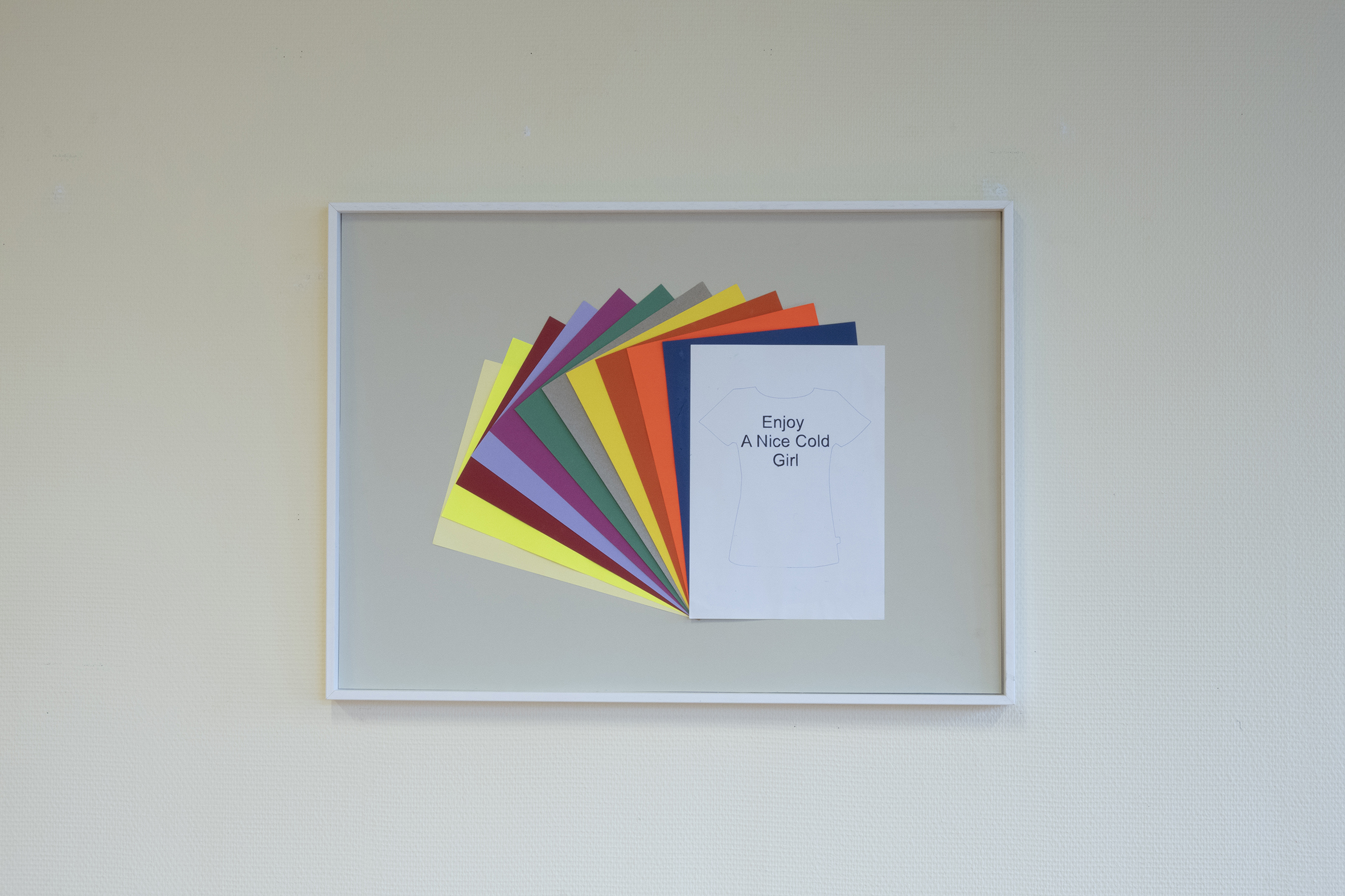 Fernanda Barhumiâs napkin dispenser differently frames the formulated typographical greeting by taking the role of a reply. âGraag Gedaanâ translates directly to âGladly Doneâ, a phrase that absorbs the labour of servitude differently to âYouâre Welcomeâ. Installed on a chrome tray, the typeface invokes the spanish servilletas; Barhumiâs gesture towards cultural difference. Max Gladerâs glued fan of coloured A4 paper is also offered with tray-like framing. The ironic missive of âEnjoy/A Nice Cold/Girlâ is printed on the âtopâ of the stack, leaving the determination of the attitude ambiguous. This work is an unusual part of a larger series of collages that incorporate representations of nostalgic and twee youth culture, often with cut or torn shapes. As with other works in the show, the reproducible multiple is complicated by the demonstration of the hand in its construction.