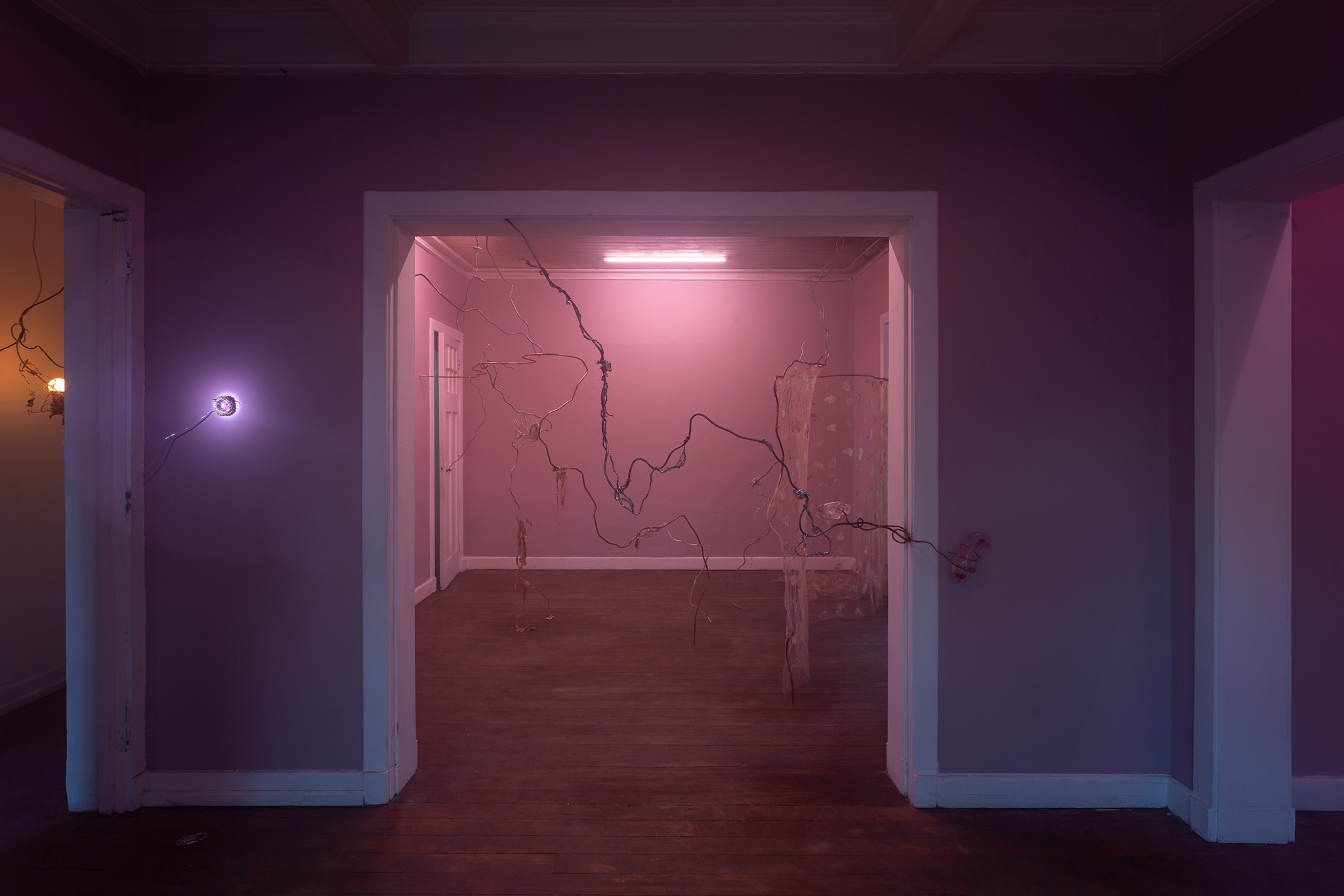 In fabulation-with the color mauve âthe first commercialized synthetic dye, accidentally discovered in 1856â, the detoxifying, glutinous virtues of the flower with the same name and the corporeal mĂ©lange of watery beings, Agua Malva, leaks into contemporary aseptic surfaces and builds up carrying the disturbed materiality of current environmental excesses. Burmannâs crafts generate attention to details that bloom from processes of accumulation and decay.