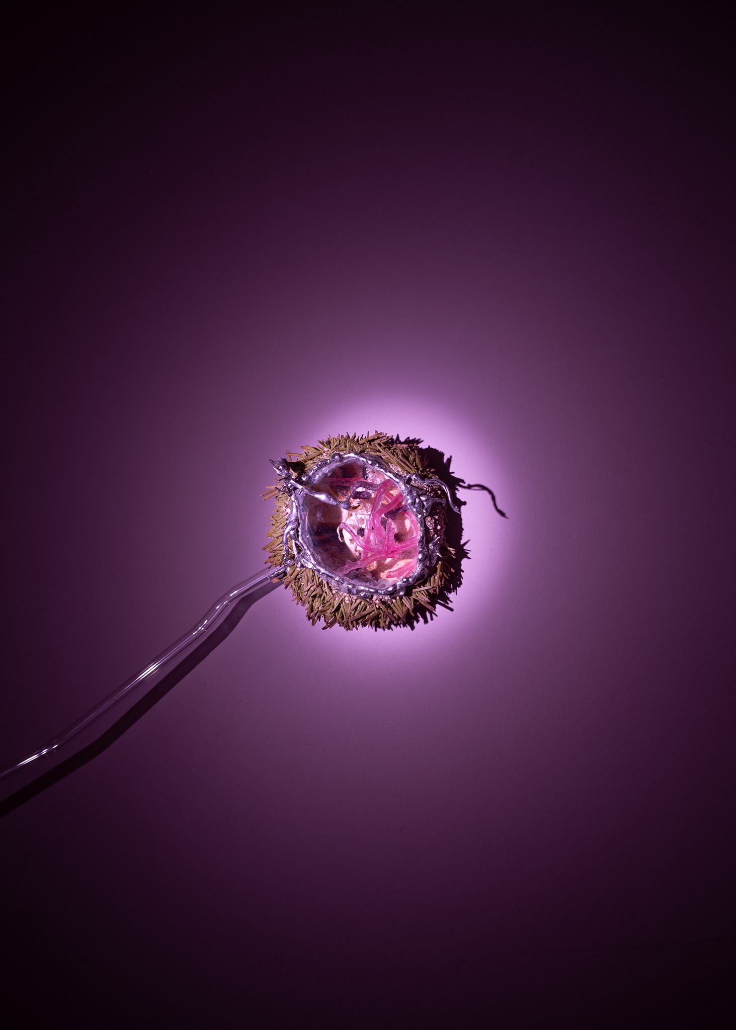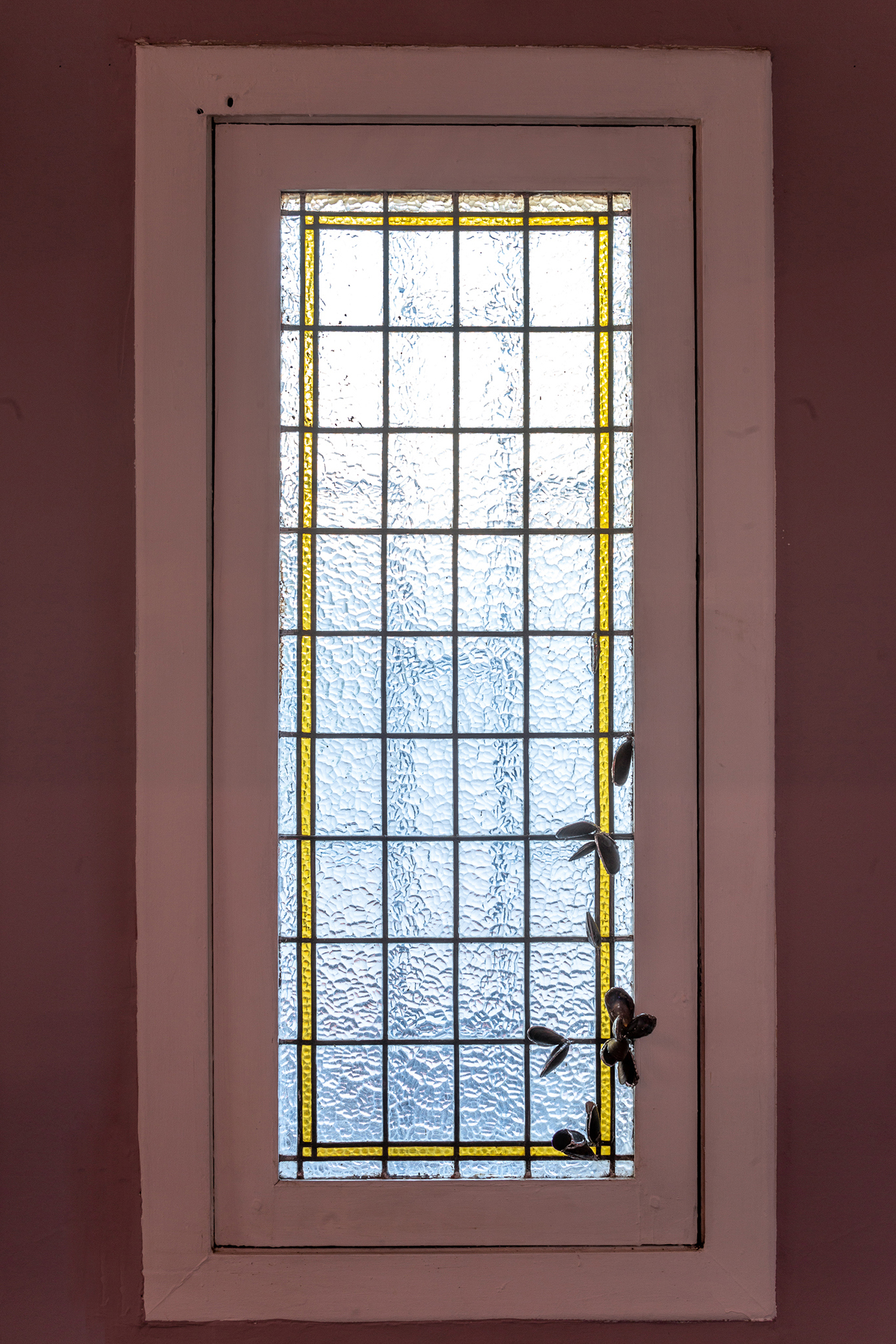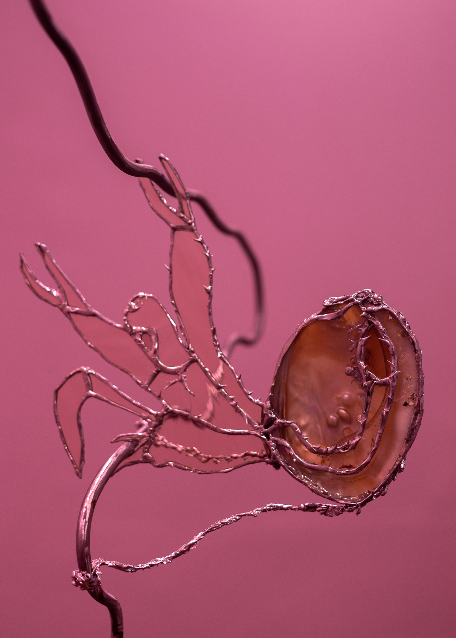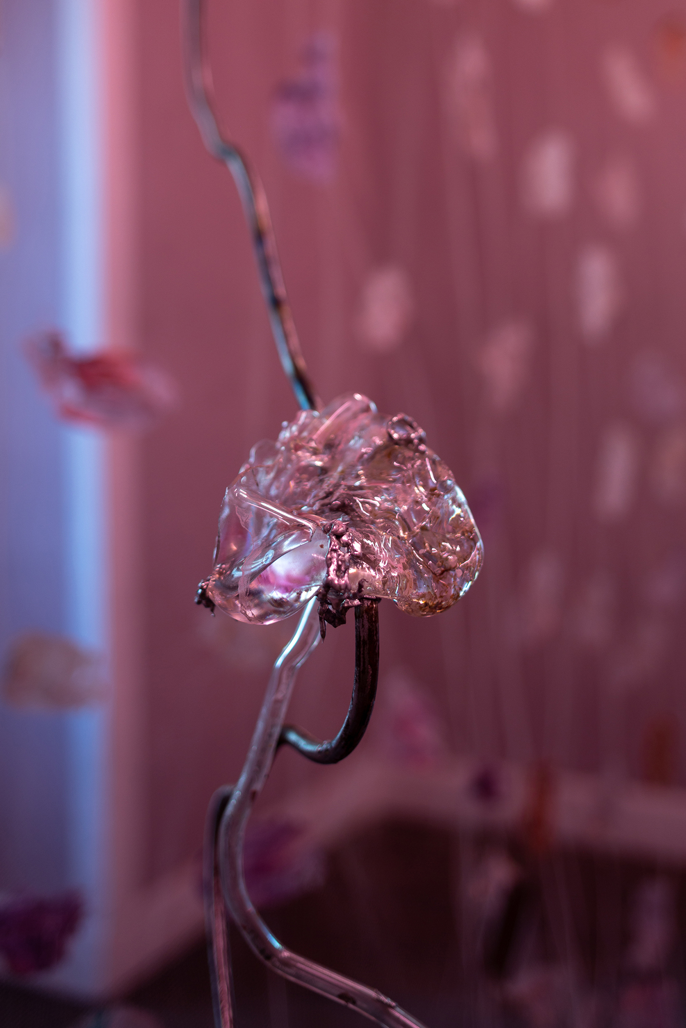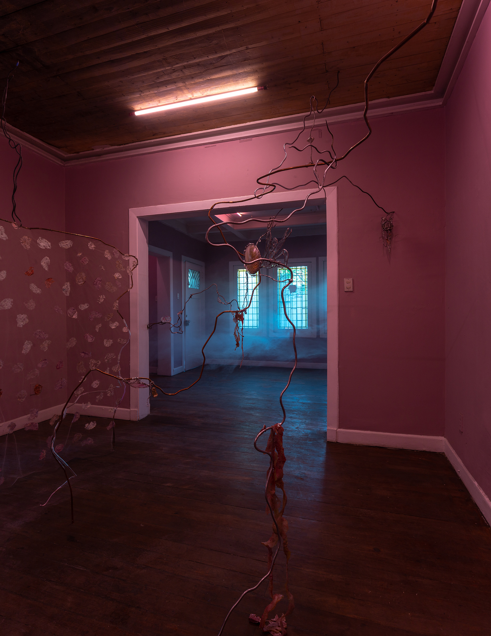 Agua Malva gathers kindred materialities, objects that emerge from common substrates, but that getting affected by physical erosion and human interference transform their states and functions. Sea shells, food leftovers, bent steel and cooper structures, stained and blown glass, nacreous bodies and mirroring surfaces inhabit and exceed the domestic edges of a house that in the same mutable spirit has been morphing the last ten years to host artistic encounters. Elizabeth Burmann's removals, incrustations and growths, intervene the gallery exposing those material phenomena in continuous transformations.