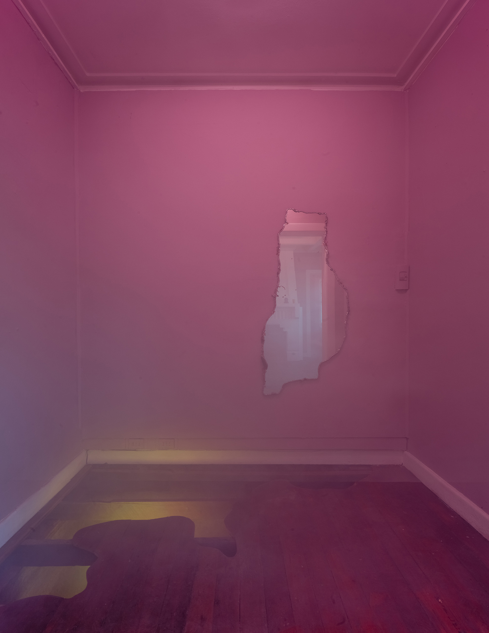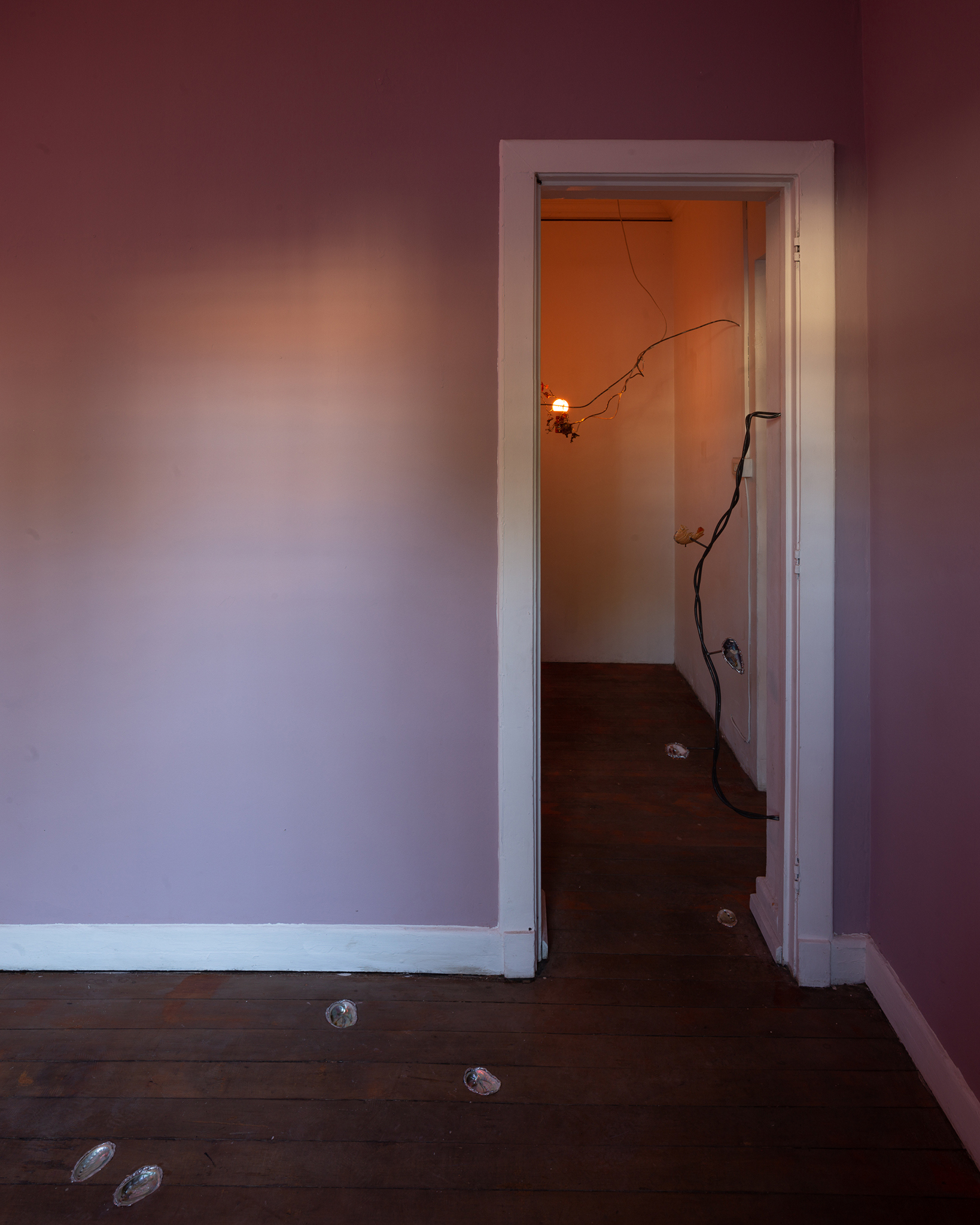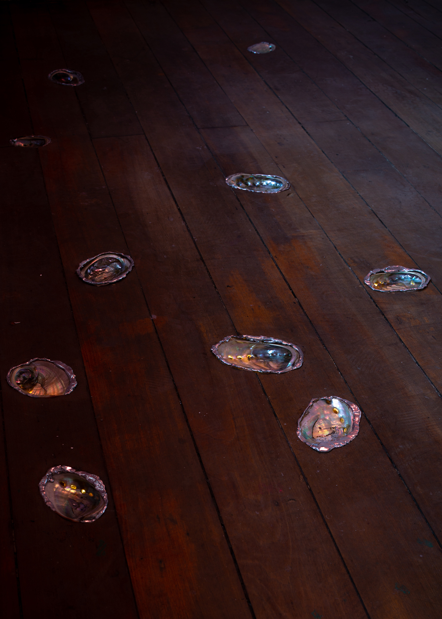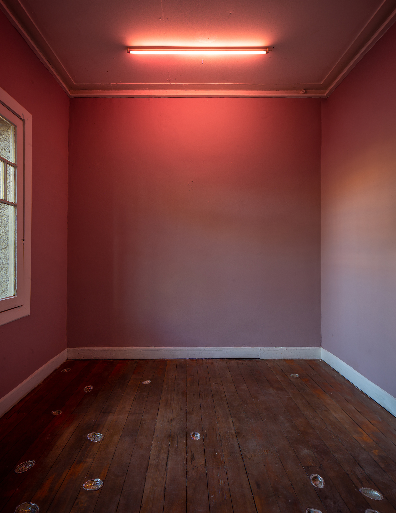 There was a time in this gallery-house when shells dwelled around, and it could be that shells will propagate it again in the future. The wooden floor is an ocean and a midden. At the windows, we are supposed to see-through, look out there and sometimes let bits of the exterior come in. Instead, If we prefer to stick ourselves to the frozen viscosity of glass, the pulverized remains of tiny shells and silica creatures will appear from a hidden realm. This cannot be seen with human eyes, but it's possible to gently attend to their process and welcome them to the house.