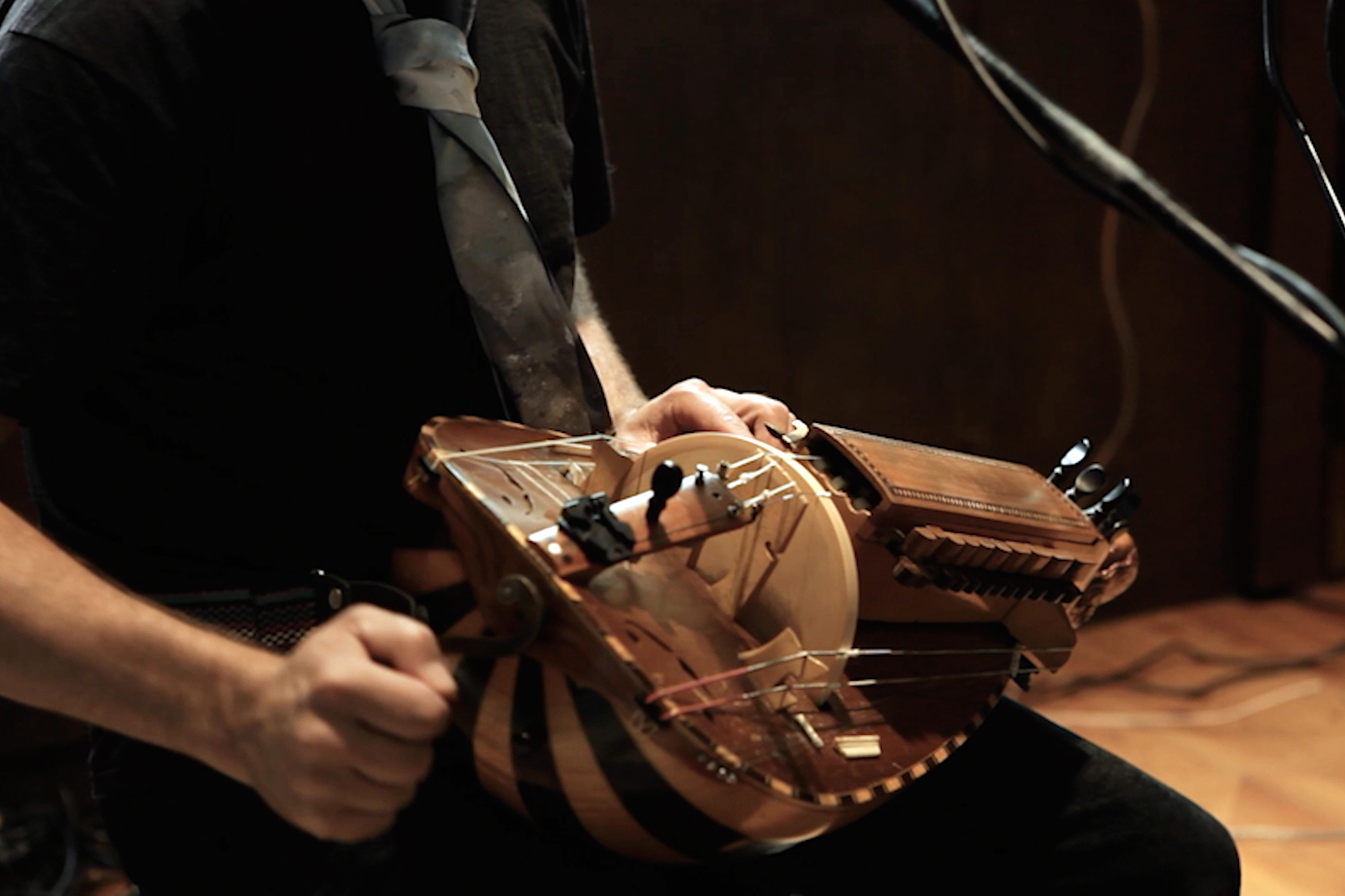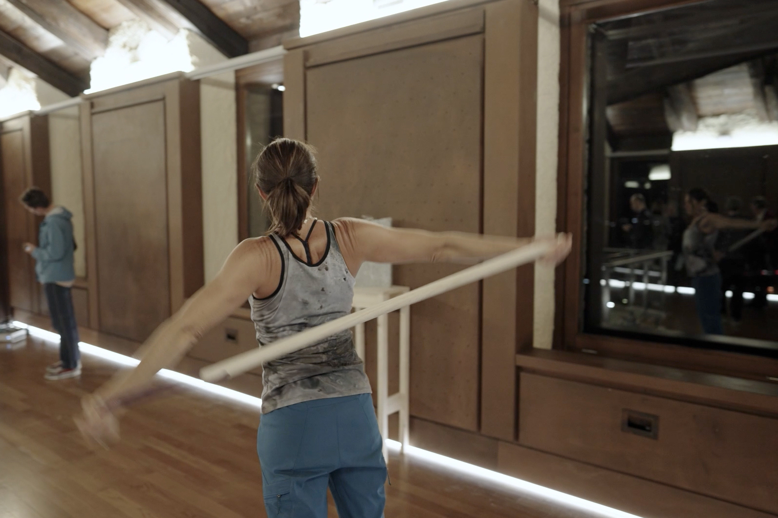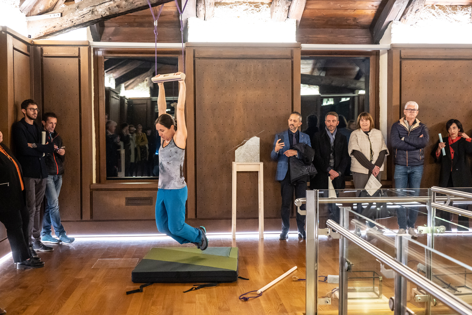 During the opening, two performances are presented to the audience. The first one takes place in Room 14 where Trouveur Valdotèn (Liliana Bertolo and Vincent Boniface) interpret the sounds of the glaciers, mixing them with sung readings in Patois, Italian and French of local poems and stories by legendary authors such as Jane Austen, Rainer Maria Rilke, Arthur Rimbaud and Charles Baudelaire. Accompanied by instruments like the hurdy-gurdy, the accordion, the bagpipe and the bodhran, this performance is a moment of strong identification between the human being and his mountain environment. In the second performance, mountain guides Anna Torretta and Giovanna Mongilardi perform in Room 16 a session of floor exercises and beam routine. These are warm-up movements, training (such as strengthening fingers and arms) and physical preparation which are typical for high altitude climbing, and to prepare the body and mind for muscular effort and concentration.