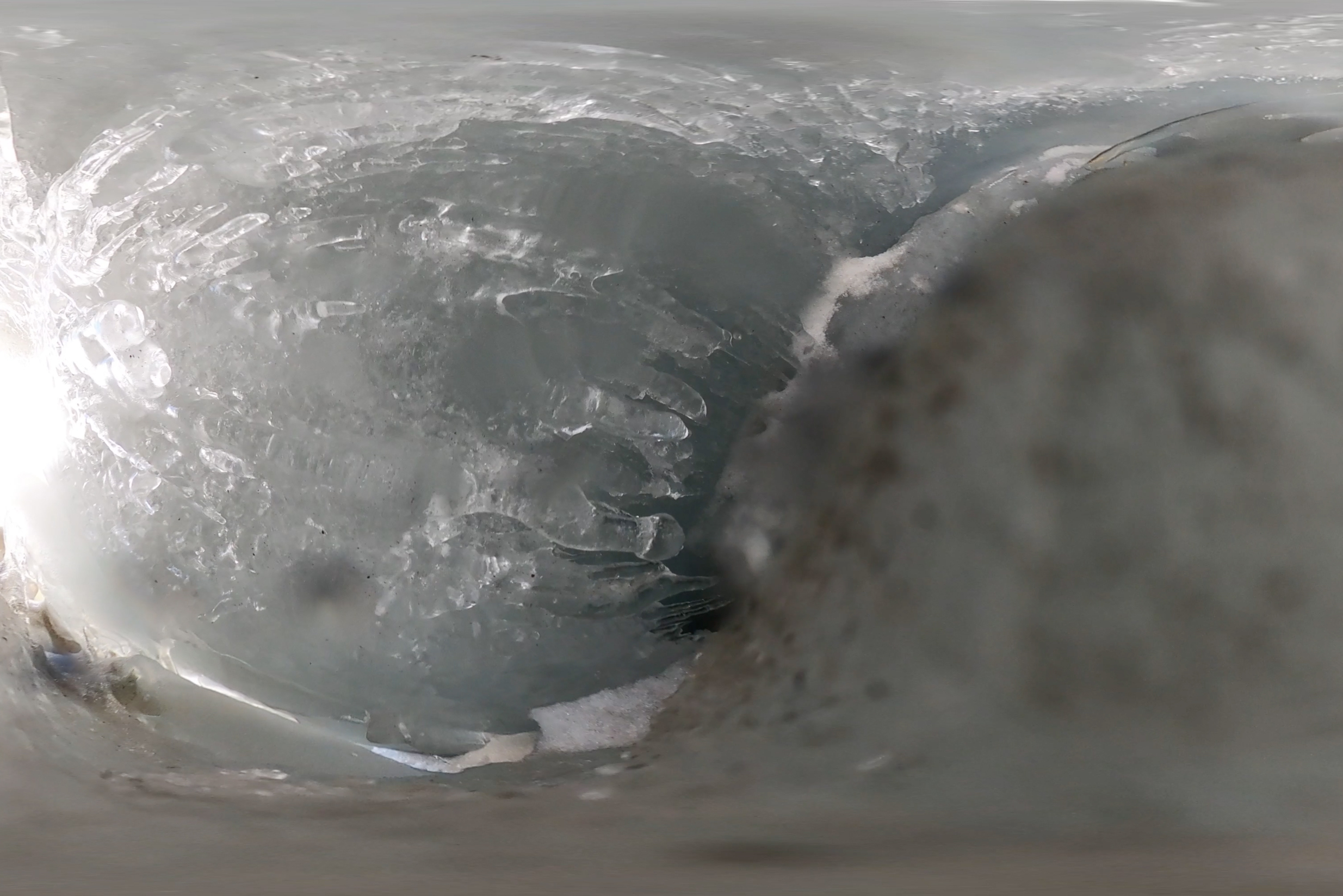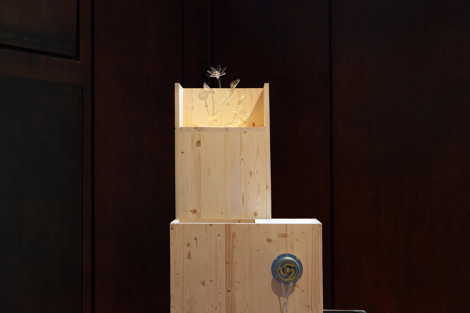 The exhibition opens in Room 14 with a group of wood and metal sculptures consisting of loudspeakers and a video screen. The images and the soundtrack on view here and in Room 16 are the outcome of footage and recordings that the artist made during several excursions on the Italian side of the Mont Blanc massif. Rendered as an almost intrusive immersion in a material hybrid that amplifies and deforms the layers of rock and ice filmed by Gobbi with a 360° camera, the images are interwoven with markedly atmospheric sounds, ethereal depths of the Earth. These tracks are supplemented with narratives collected by interviewing local inhabitants and professionals such as geologists, mountain guides and botanists who specialise in the study of high mountain flora. The storytelling thus enters the flow of sound and images and rethinks it, shifting the focus to a narrative and personal level. Two glass sculptures fragile and almost impalpable of the flower species dryas octopetala and epilobium angustifolium realized by the artist in collaboration with Costantino Bormioli’s laboratory in Altare (Savona) complete the installation.