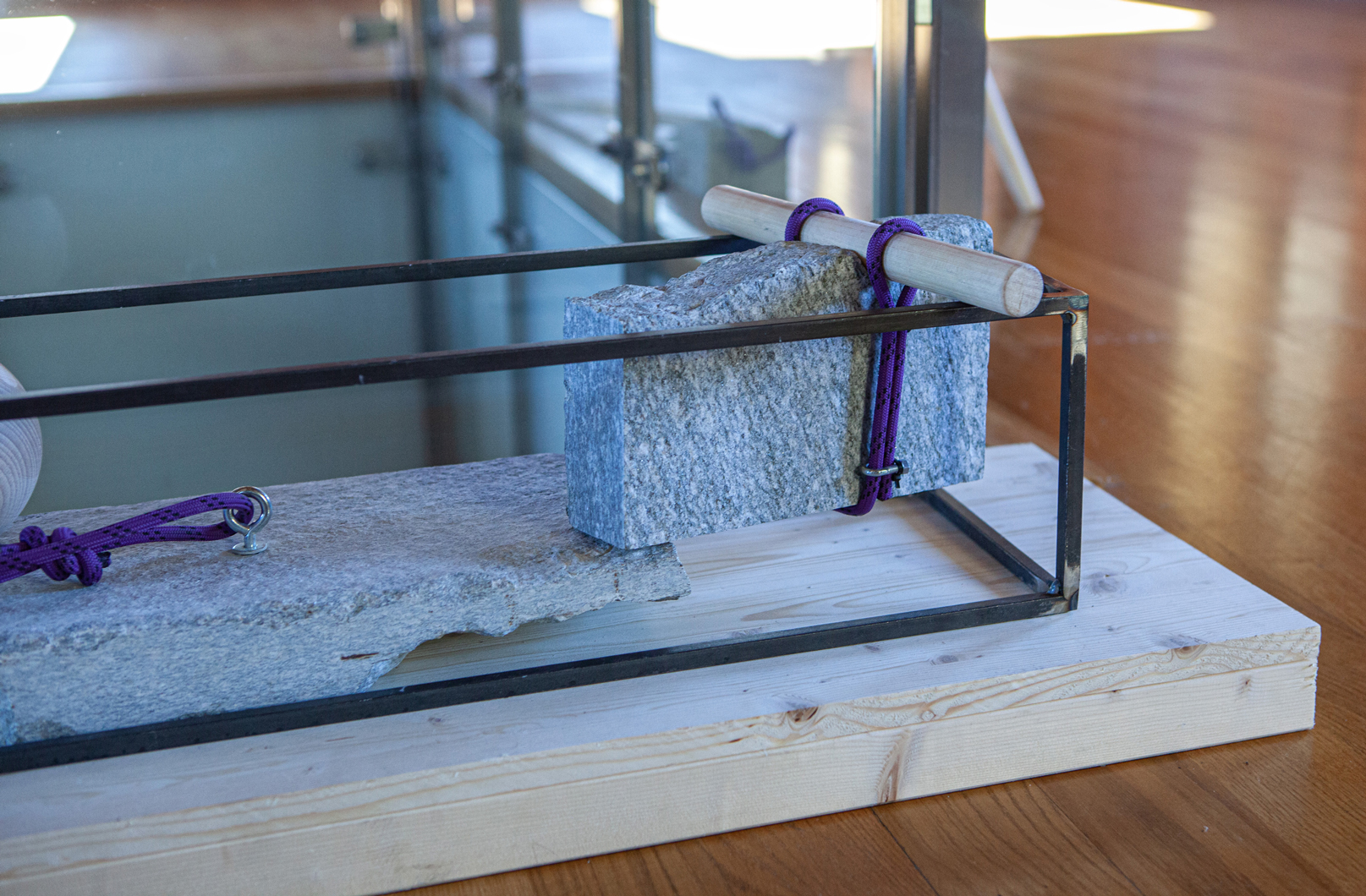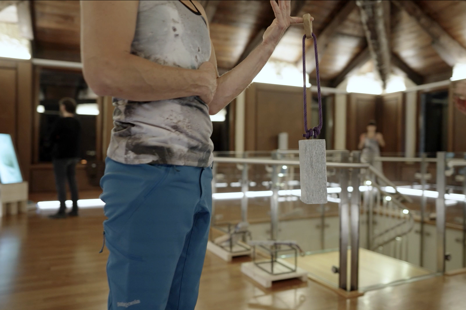 In Room 16 a screen and a sound box mounted on a wooden structure reiterate the concept of verticality, further accentuated by a staging that proceeds elastically, by tensions and releases. Punctuating the itinerary of the exhibition are a series of glass sculptures that have moulded their form by resting on granite boulders placed on wooden plinths. This physical and postural deformation in contact with natural material “is inherent not only in glaciers”, says Gobbi, “but also in bodies climbing rock faces.” The feeling of fragility, helplessness and limitedness is here encapsulated in the gesture of placing such a delicate element poised between rock and air.