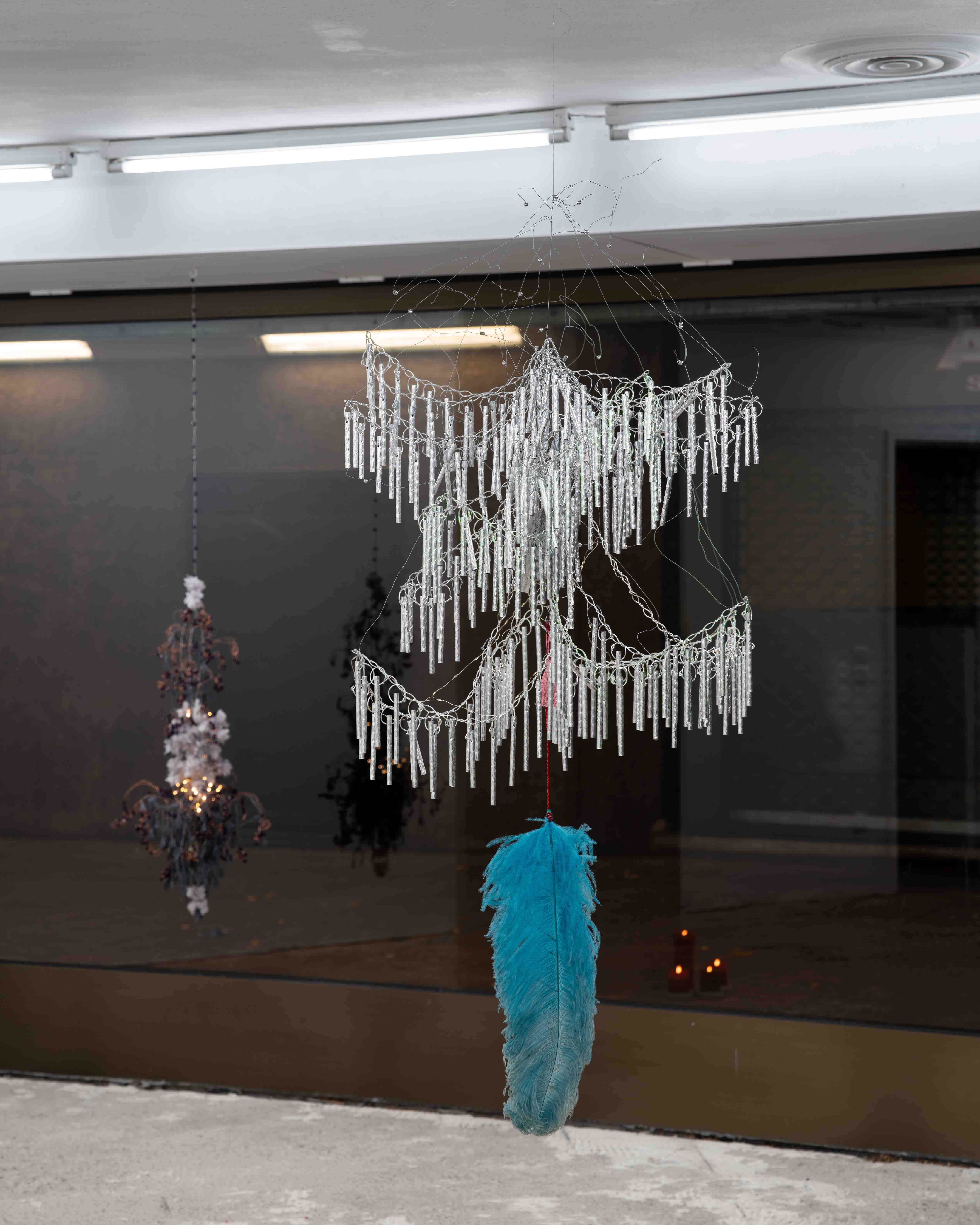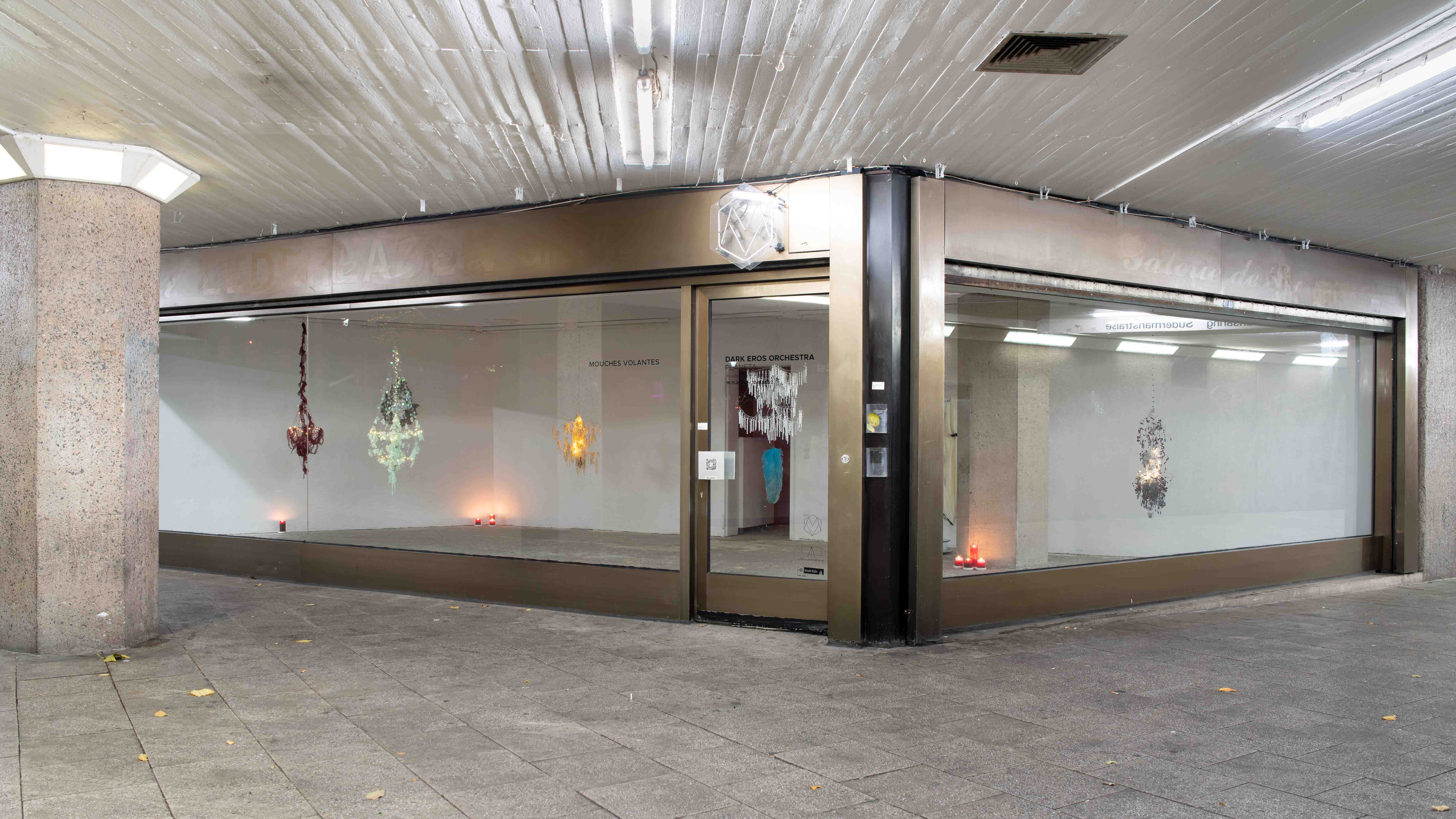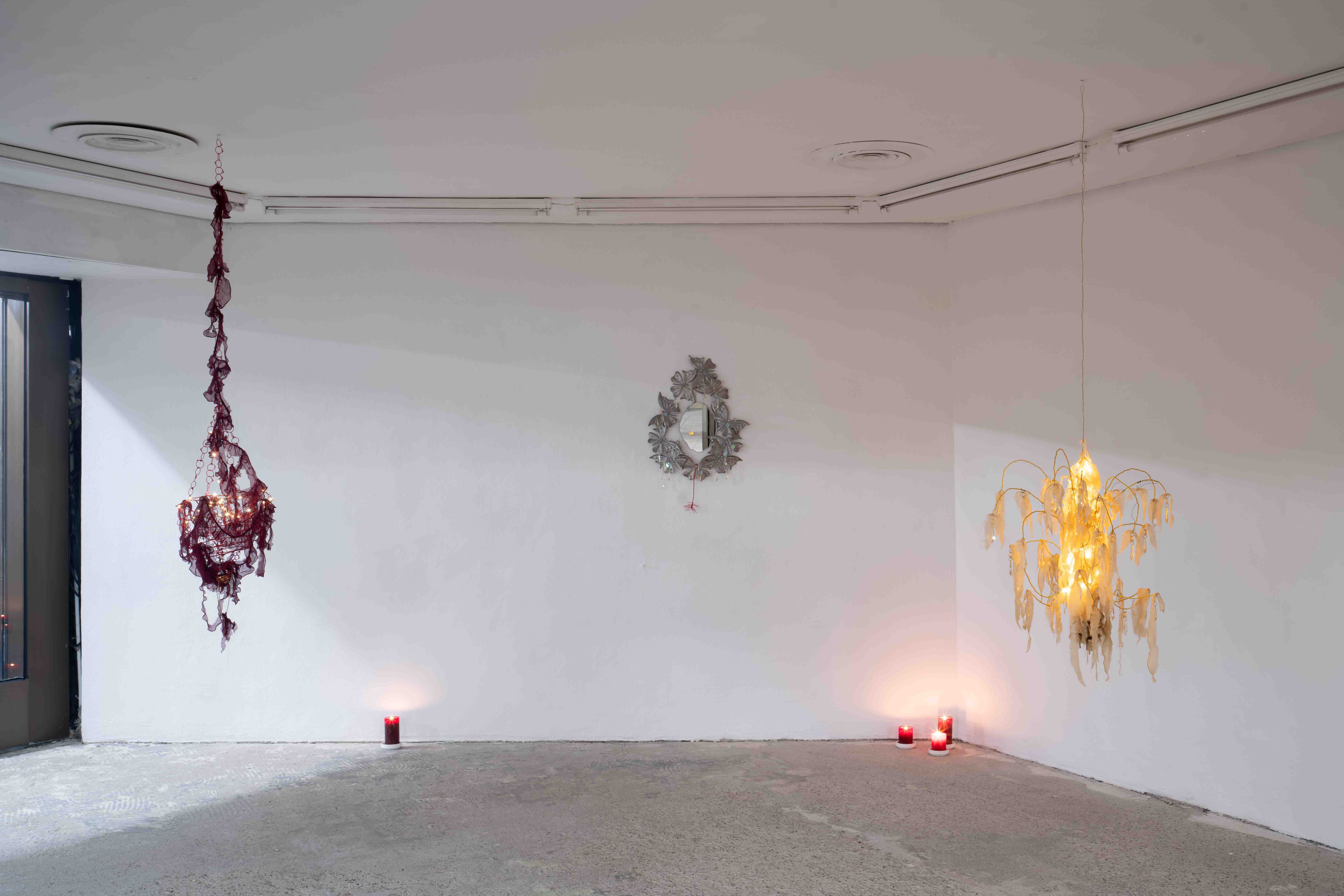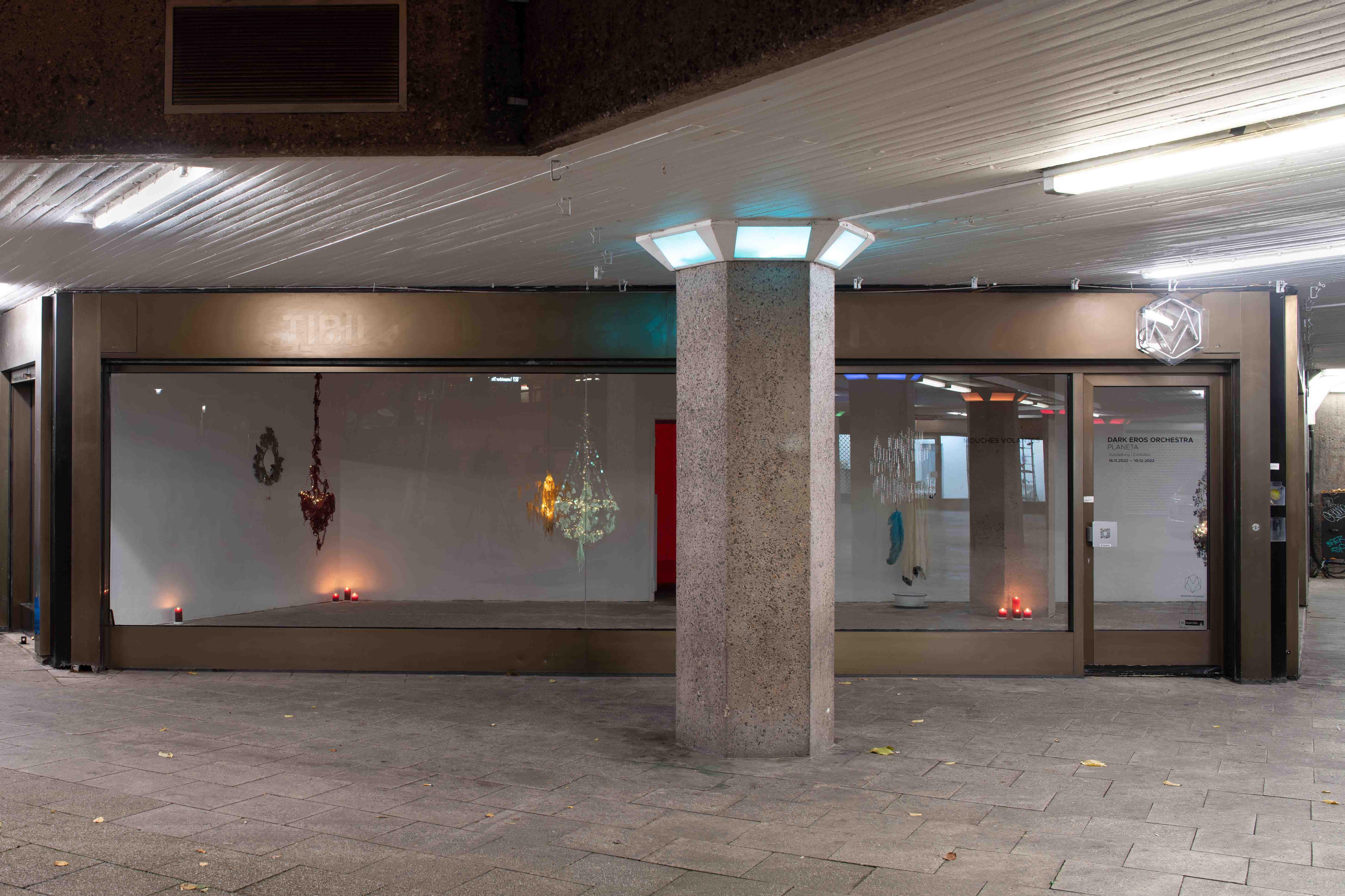 This text is part of Dark Eros Orchestra - it has the same value as all other elements of the exhibition. Accordingly, it is as essential as all the others: like the chandelier-like subject hanging from the ceiling; the performer playing with us; the light inviting the moths; the electricity generated in an invisible place and banished into a battery like a genie in a bottle; the walls of the space someone once built; the air and the wind and the guests joining in to see, connect, and make it all vibrate sonically.We all have a part in it. And because of that, the text writes itself as much through me as it does through you and itself. You are reading me. I am a part of you. You activate me. I am in you. For me, you are generated through me. So it is also for you with me.