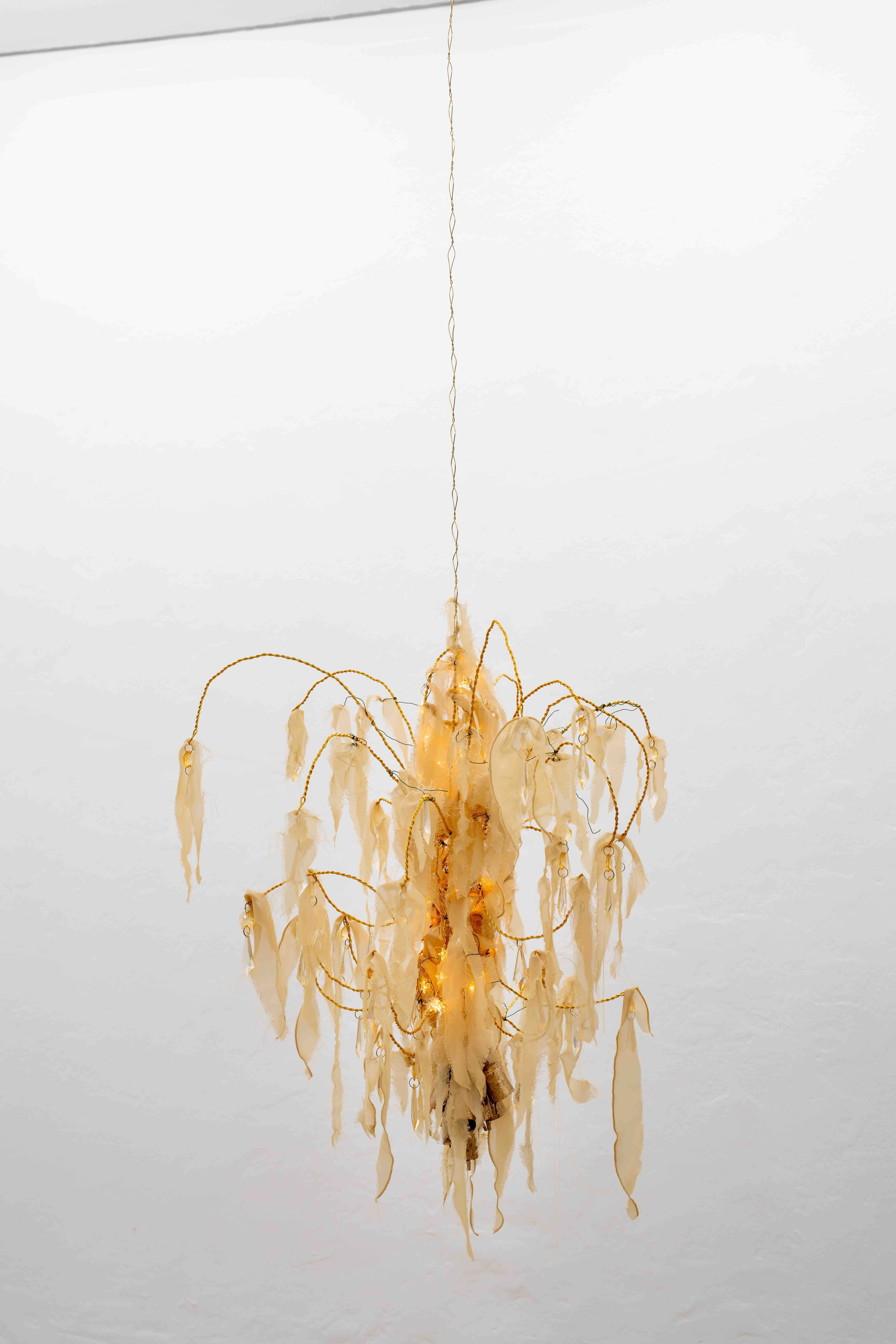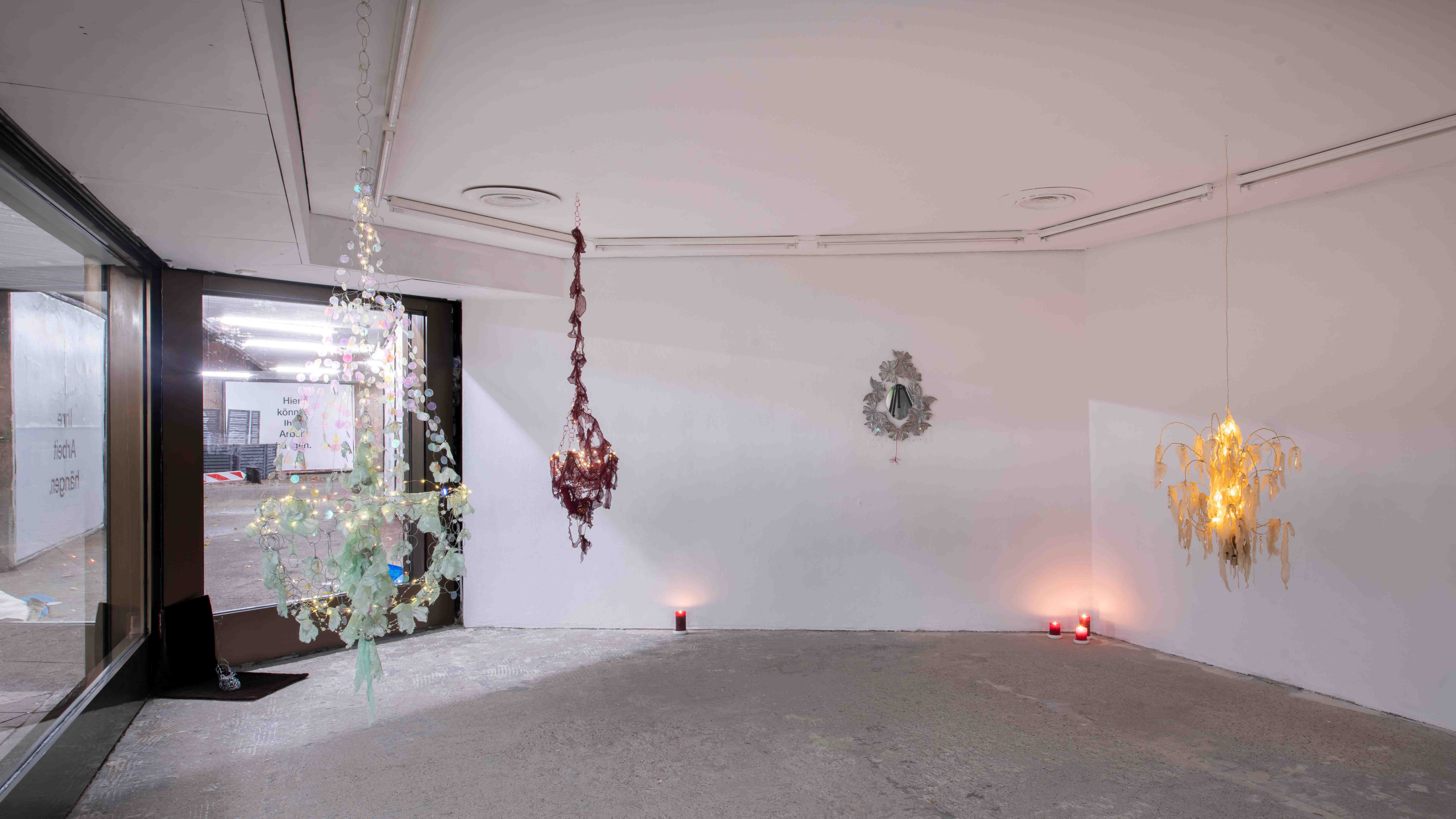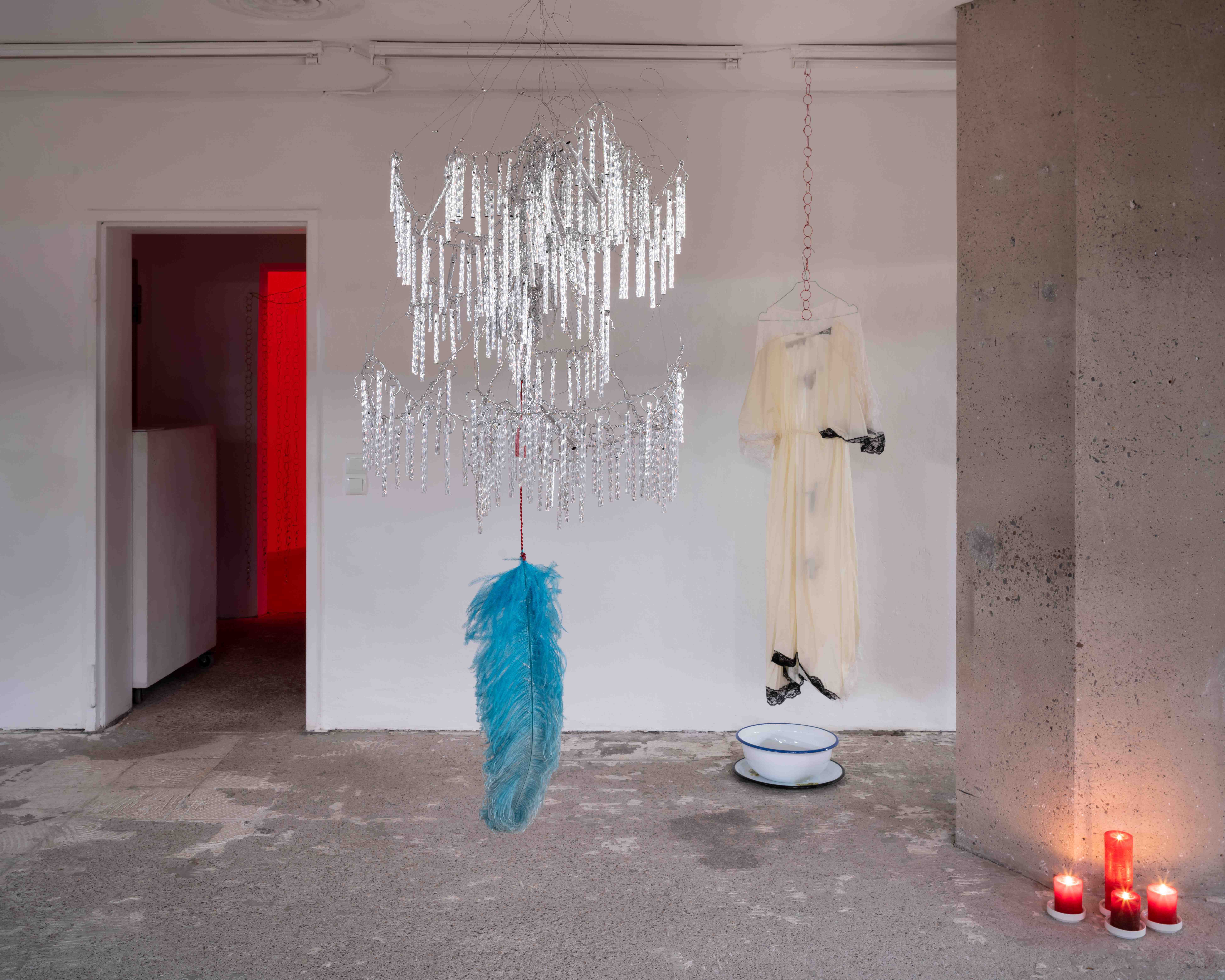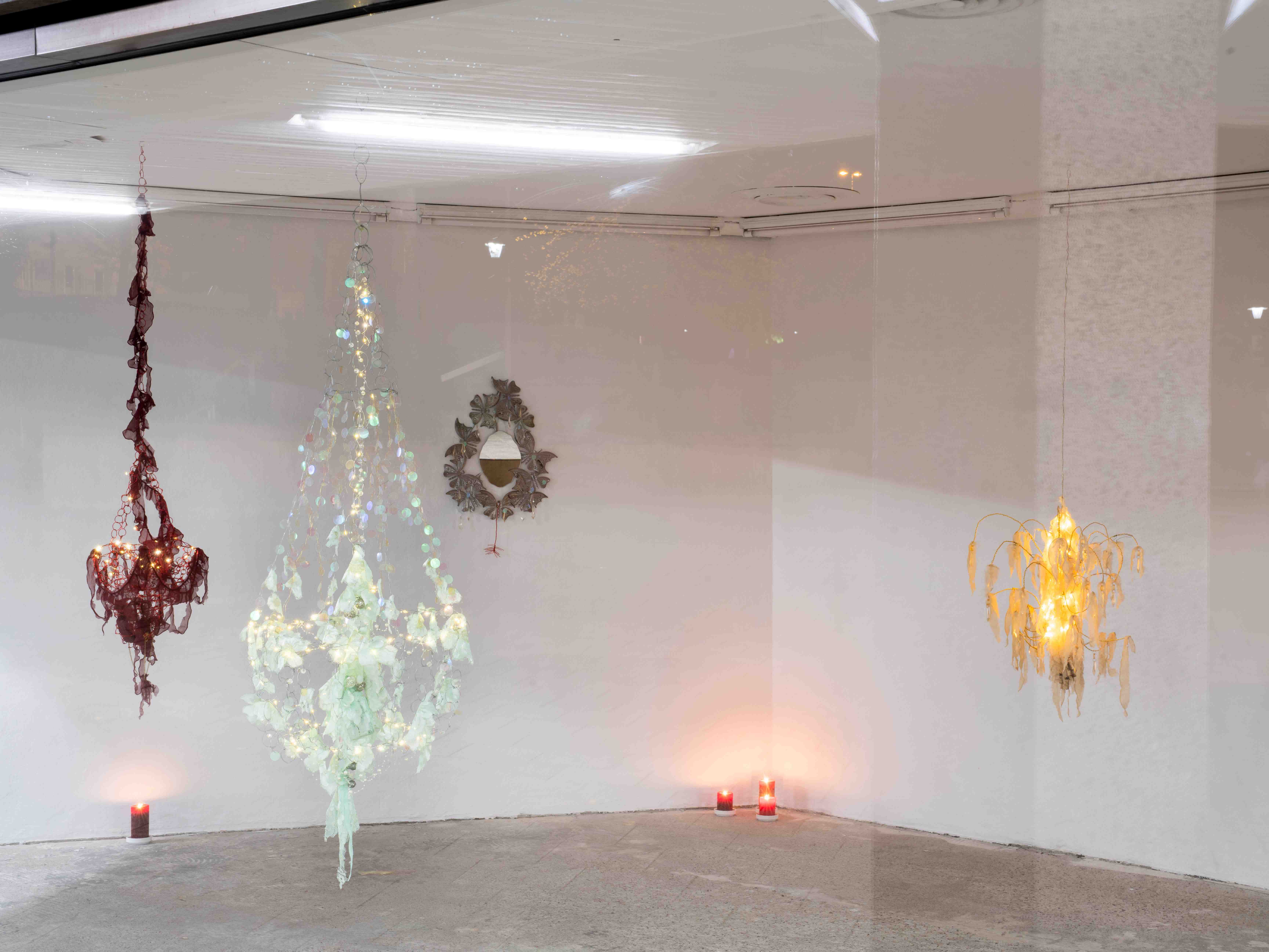 This text is part of Dark Eros Orchestra - it has the same value as all other elements of the exhibition. Accordingly, it is as essential as all the others: like the chandelier-like subject hanging from the ceiling; the performer playing with us; the light inviting the moths; the electricity generated in an invisible place and banished into a battery like a genie in a bottle; the walls of the space someone once built; the air and the wind and the guests joining in to see, connect, and make it all vibrate sonically.We all have a part in it. And because of that, the text writes itself as much through me as it does through you and itself. You are reading me. I am a part of you. You activate me. I am in you. For me, you are generated through me. So it is also for you with me.