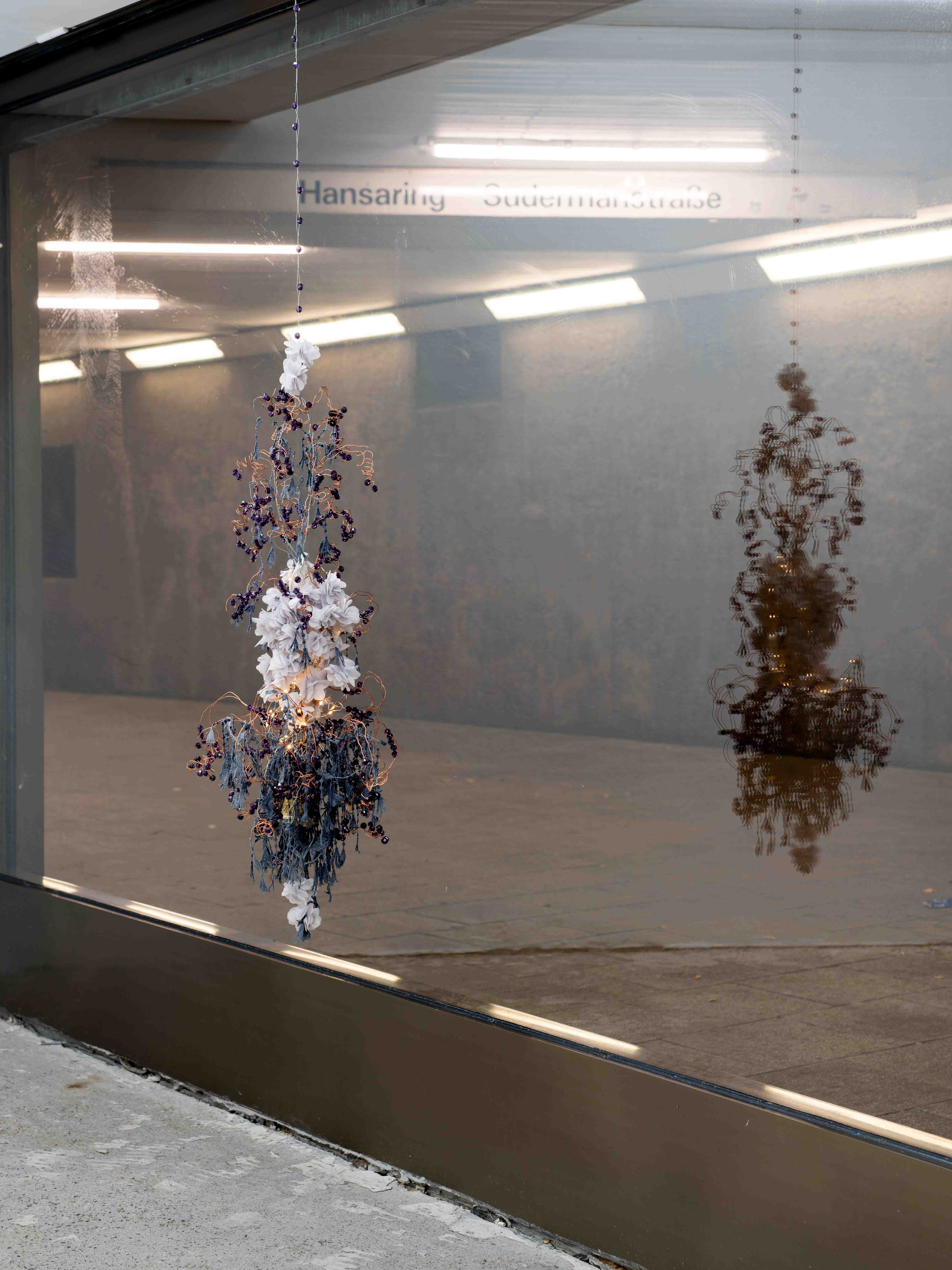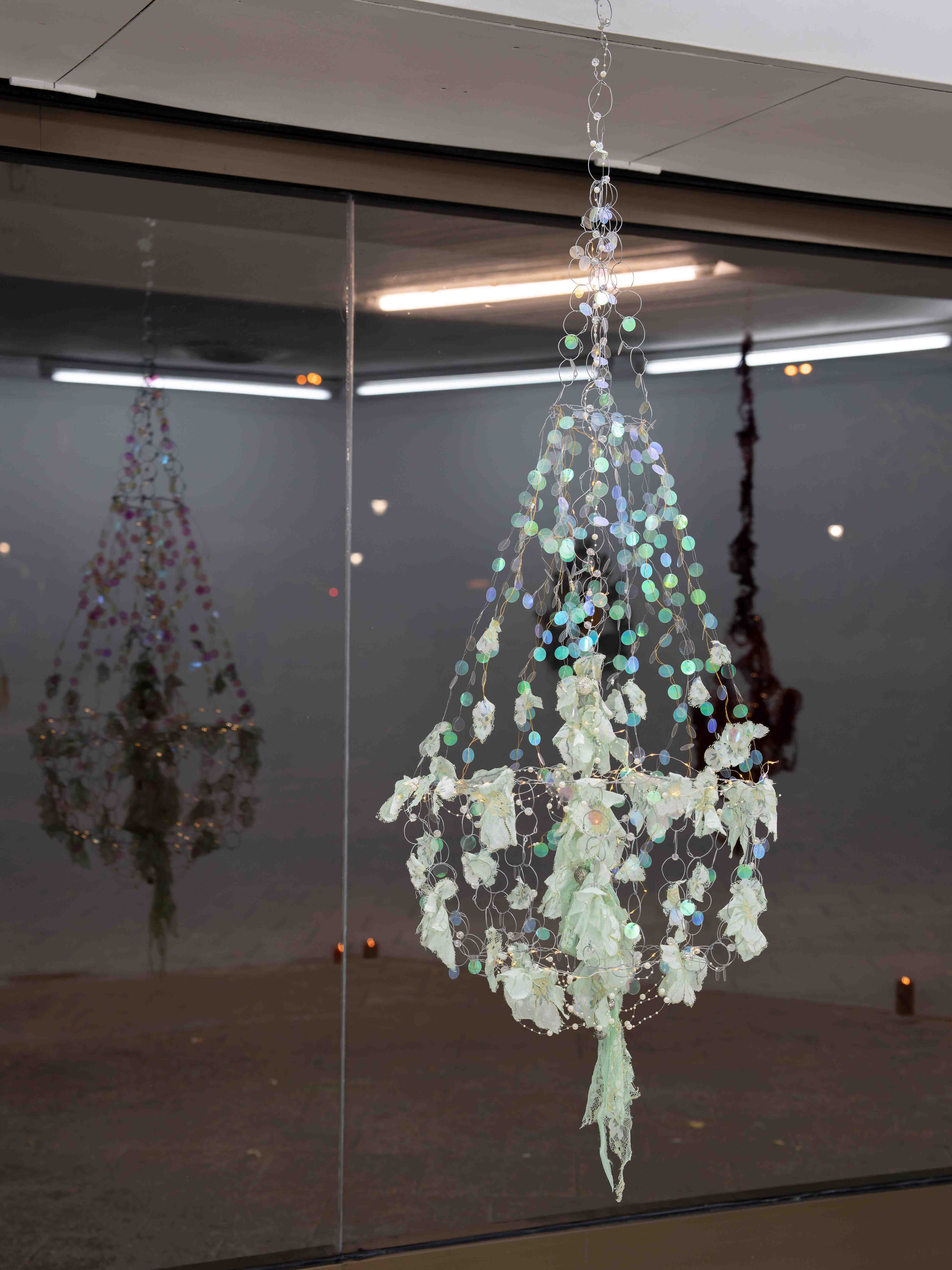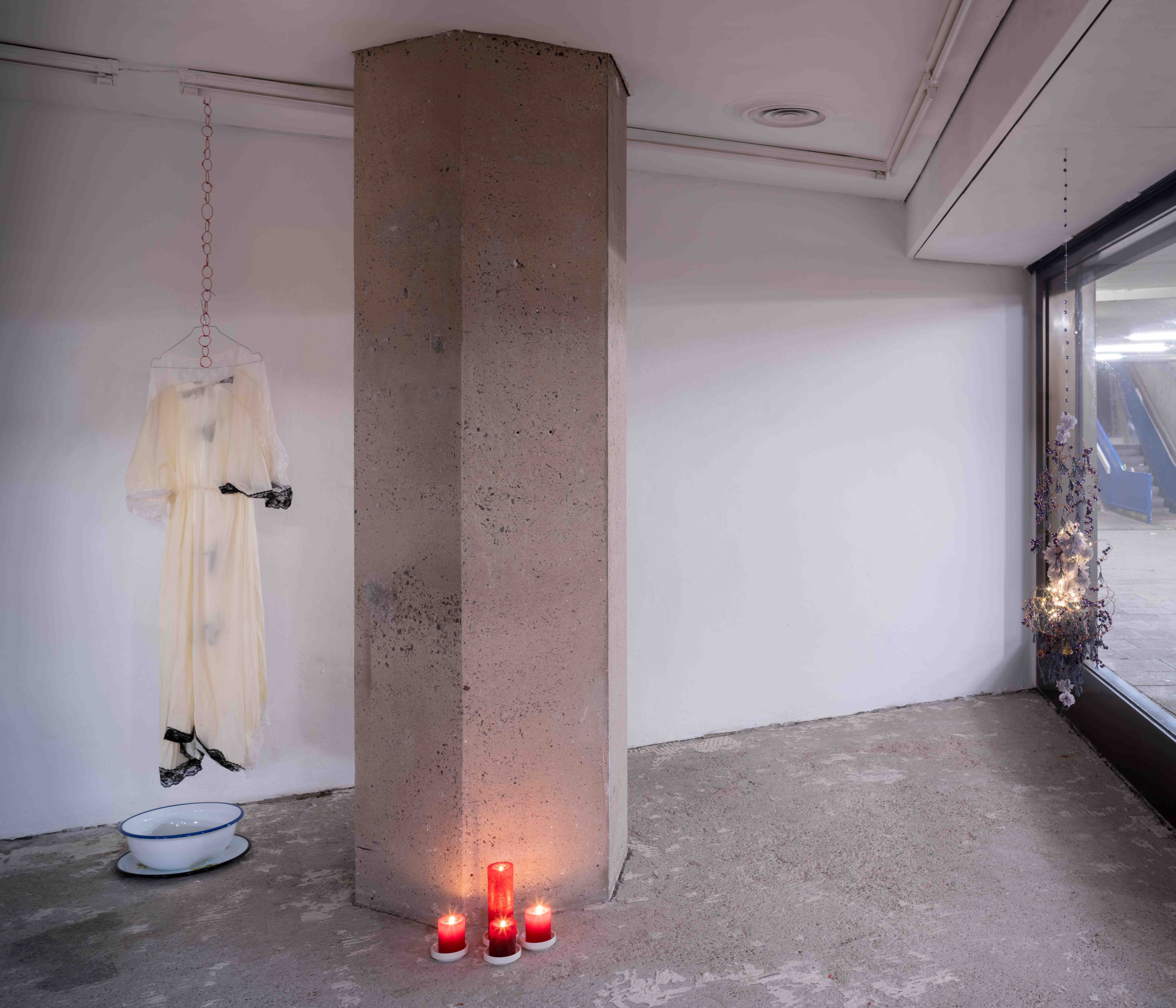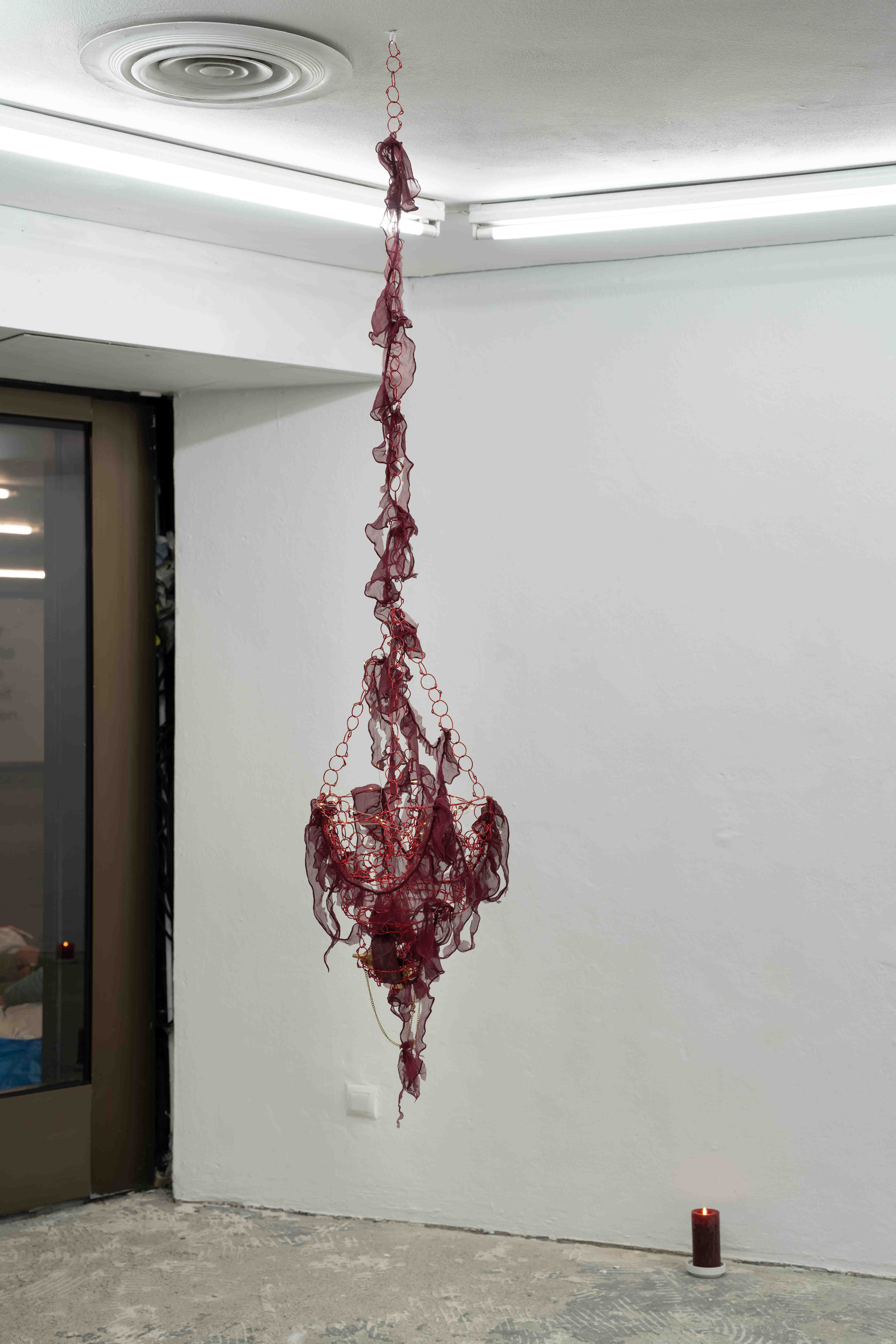 This text is part of Dark Eros Orchestra - it has the same value as all other elements of the exhibition. Accordingly, it is as essential as all the others: like the chandelier-like subject hanging from the ceiling; the performer playing with us; the light inviting the moths; the electricity generated in an invisible place and banished into a battery like a genie in a bottle; the walls of the space someone once built; the air and the wind and the guests joining in to see, connect, and make it all vibrate sonically.We all have a part in it. And because of that, the text writes itself as much through me as it does through you and itself. You are reading me. I am a part of you. You activate me. I am in you. For me, you are generated through me. So it is also for you with me.