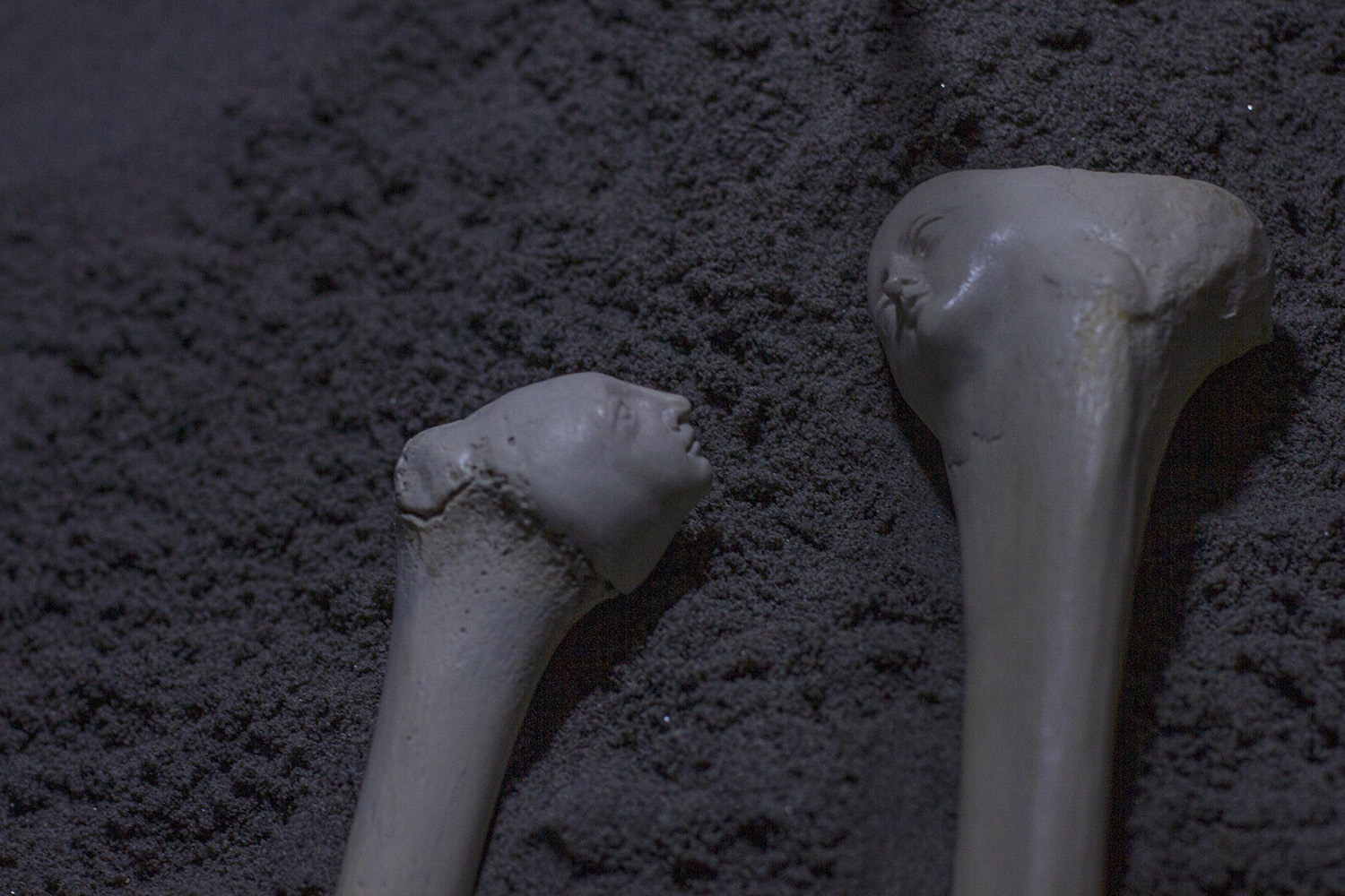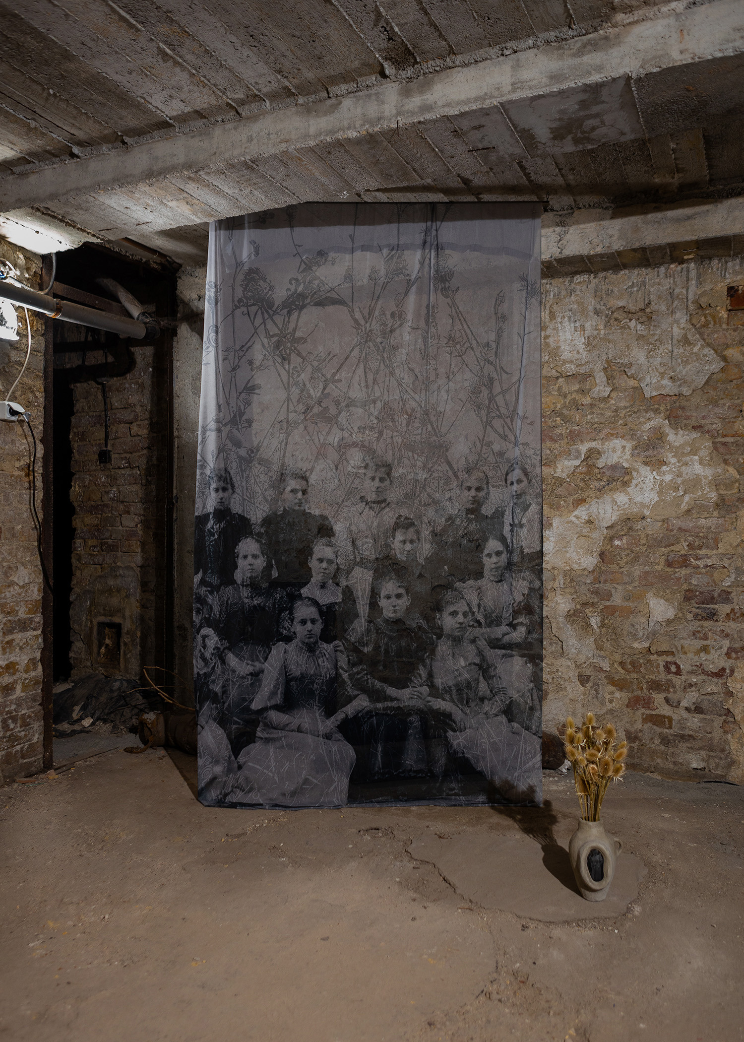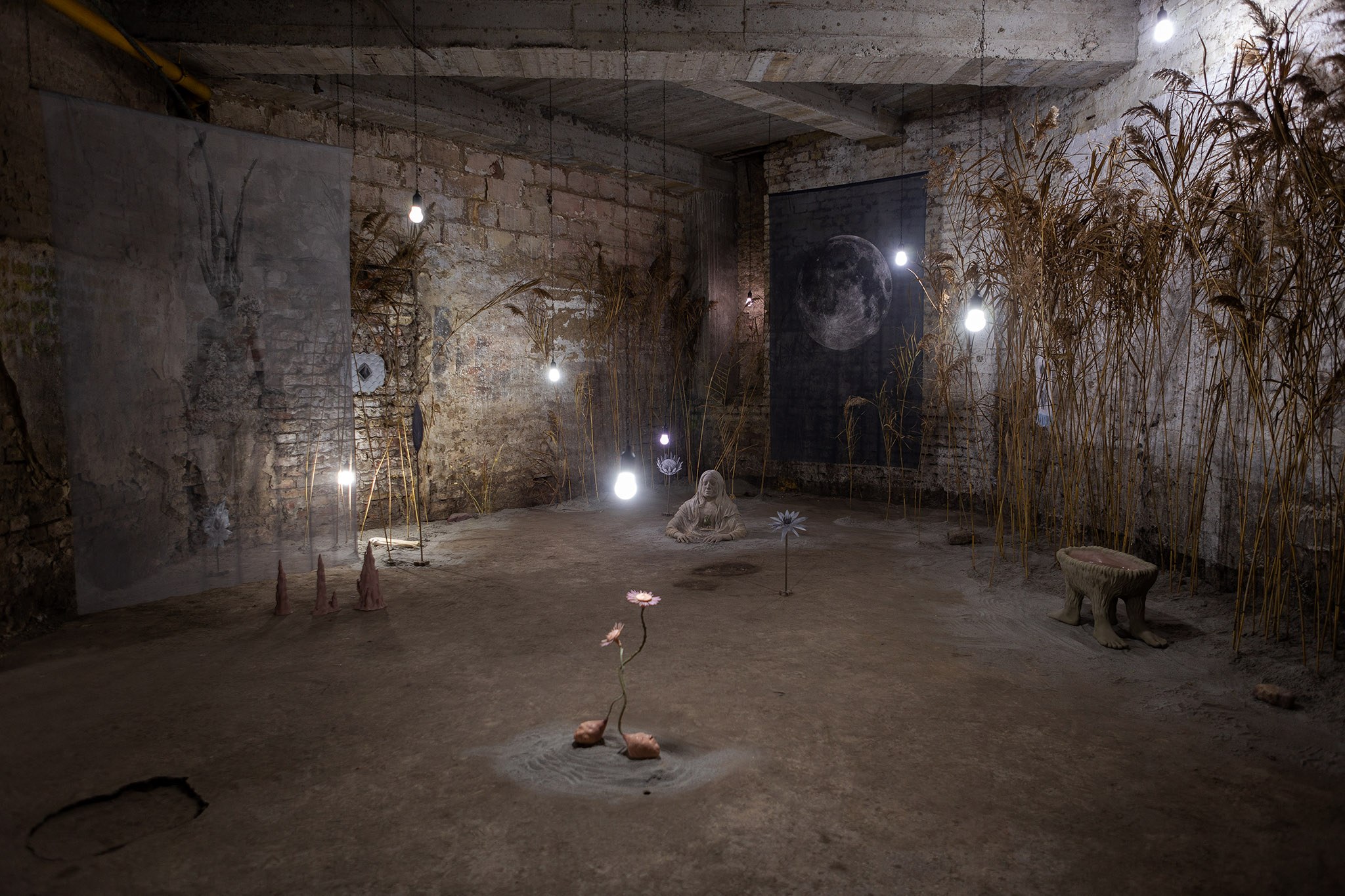 In an age of ecological crisis and post-humanism, animism appears as an alternative in which archaic worldviews and possible futures intersect. This September, Karina Mendreczky and Katalin Kortmann Járay Kortmann, filling the abandoned location of Semmelweis Clinic, a place that gives home to Parallel Vienna, created the daytime of such an animistic space with their artworks. This installation was transformed to the basement of FKSE, as a counterpart to the former event, a night-time vision of a similarly timeless but accessible landscape. By evoking collective memories, their exhibition seeks to answer the question: is it possible to reverse the destruction that humanity has wrought on nature and itself over the last millennia?