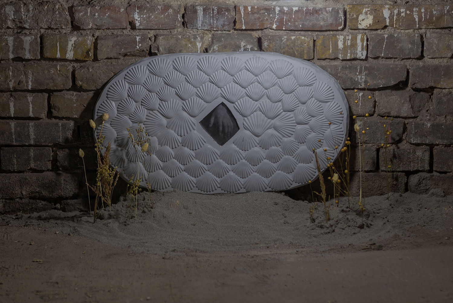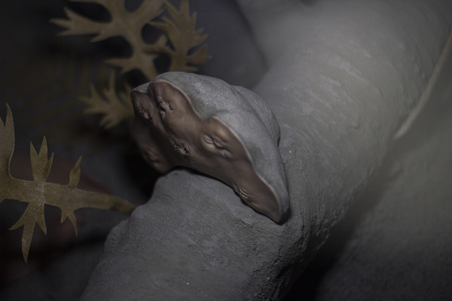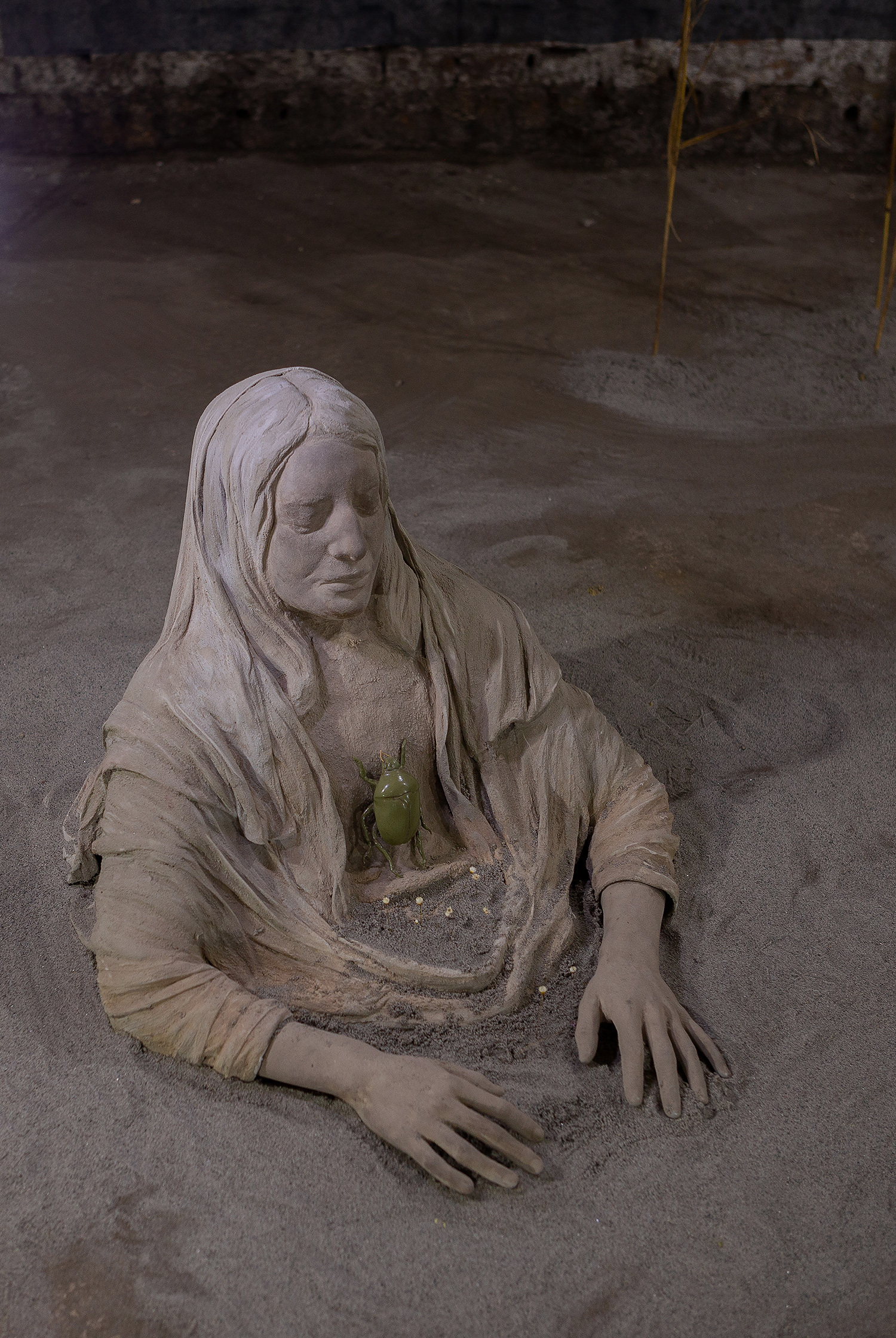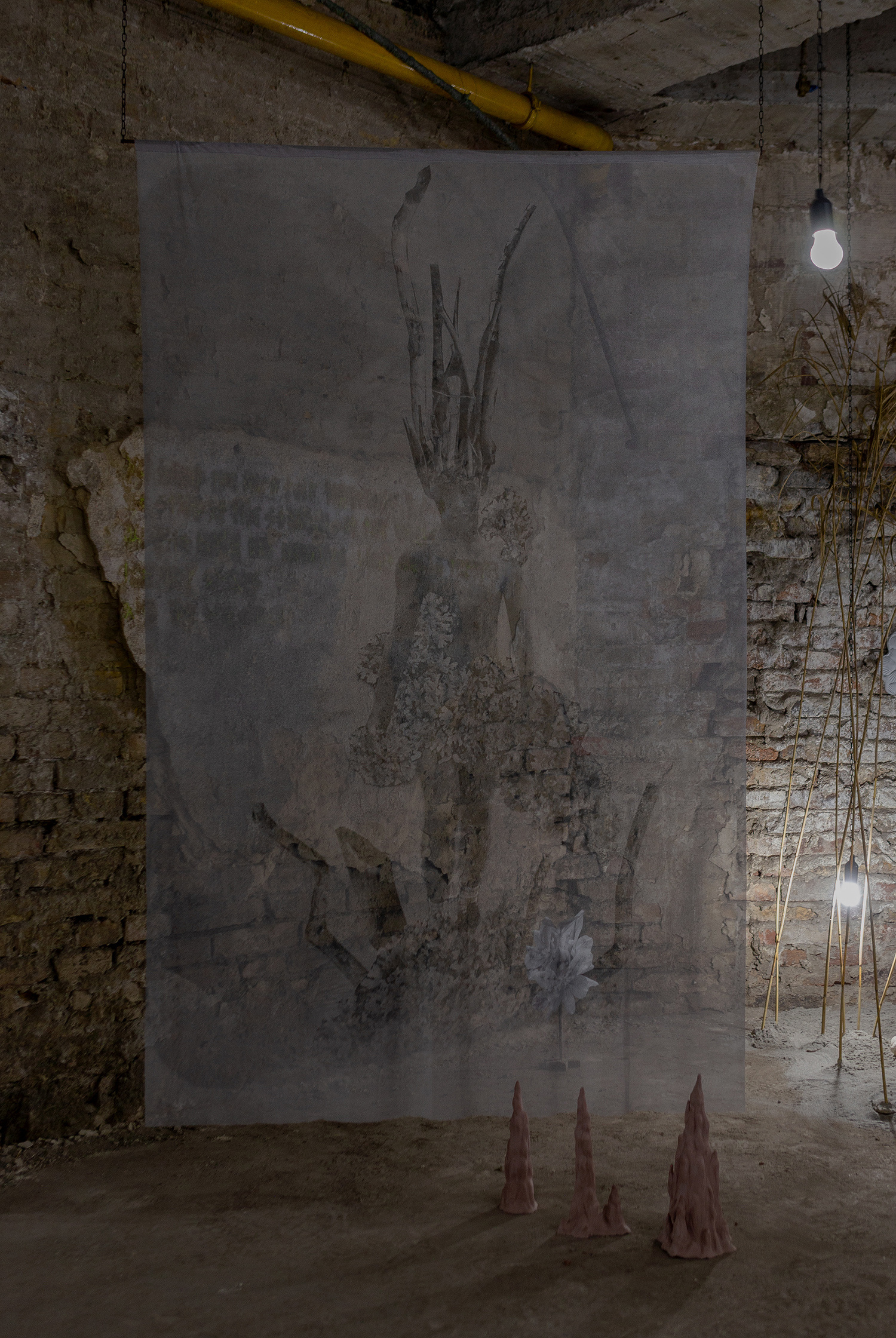 Within their anthropomorphic sculptures, large concrete constructions and gently floating prints, human destruction is thus transformed into a new creation story in which all the grip of ratio seems to disappear. The viewer’s only accompaniment is the recurring motif of the feminine principle, which appears sometimes in the form of natural elements or in the form of embodied archetypes. Wandering around the surrealistic hybrid figures, the transfigured creatures, no one is able to tell anymore, whether it is the past past, a post-apocalyptic future, or the mystical and eerie reality.
