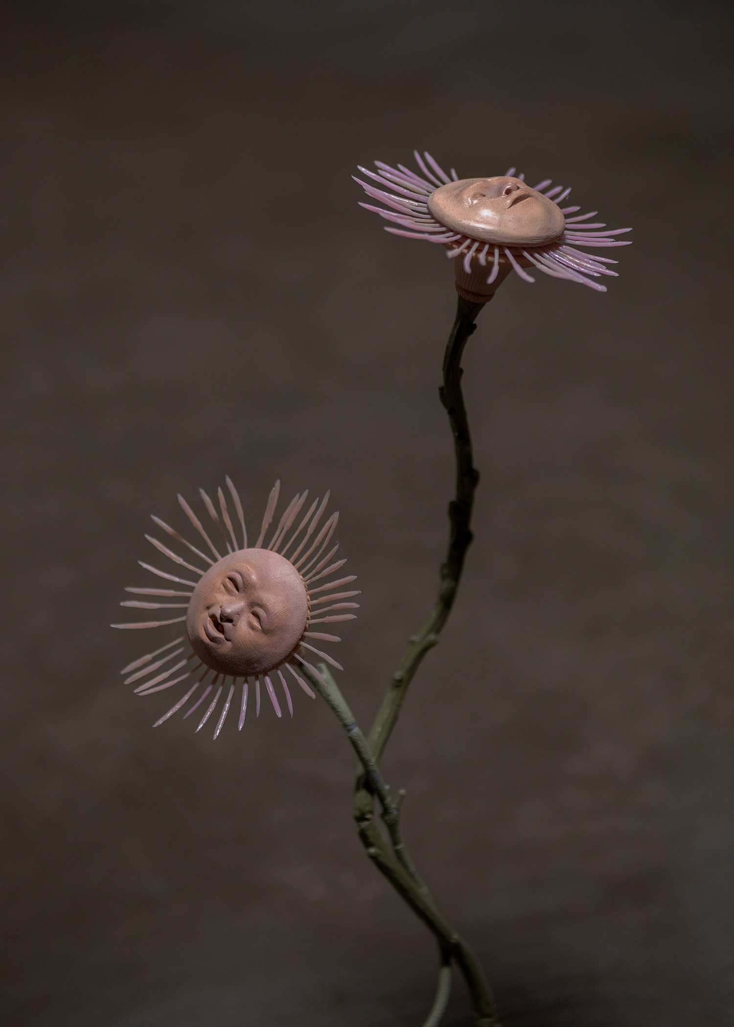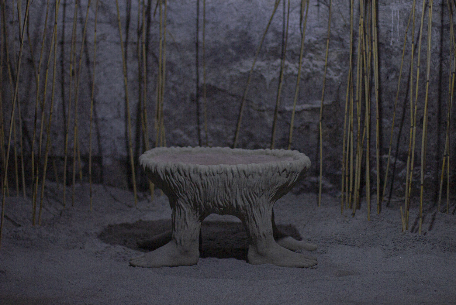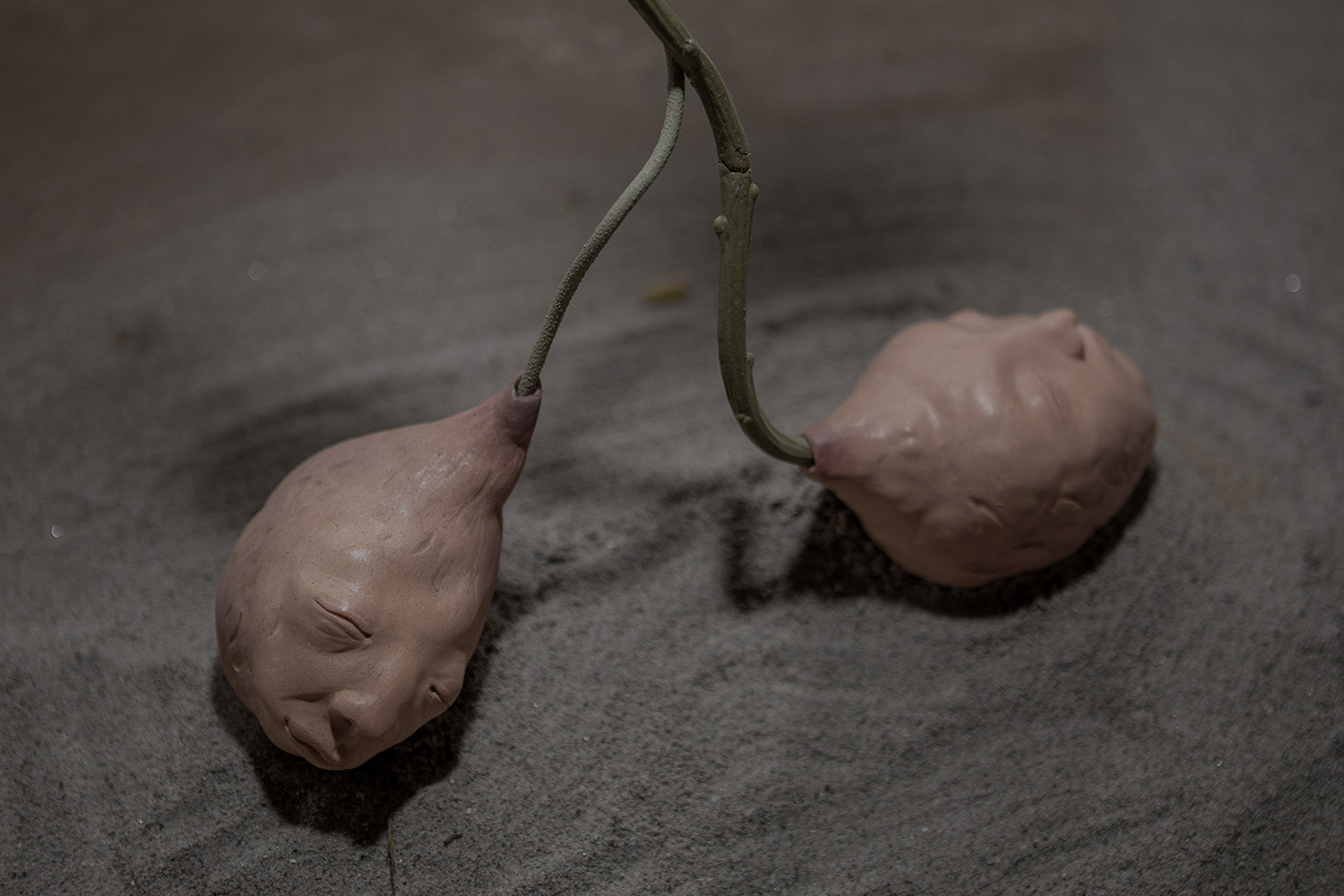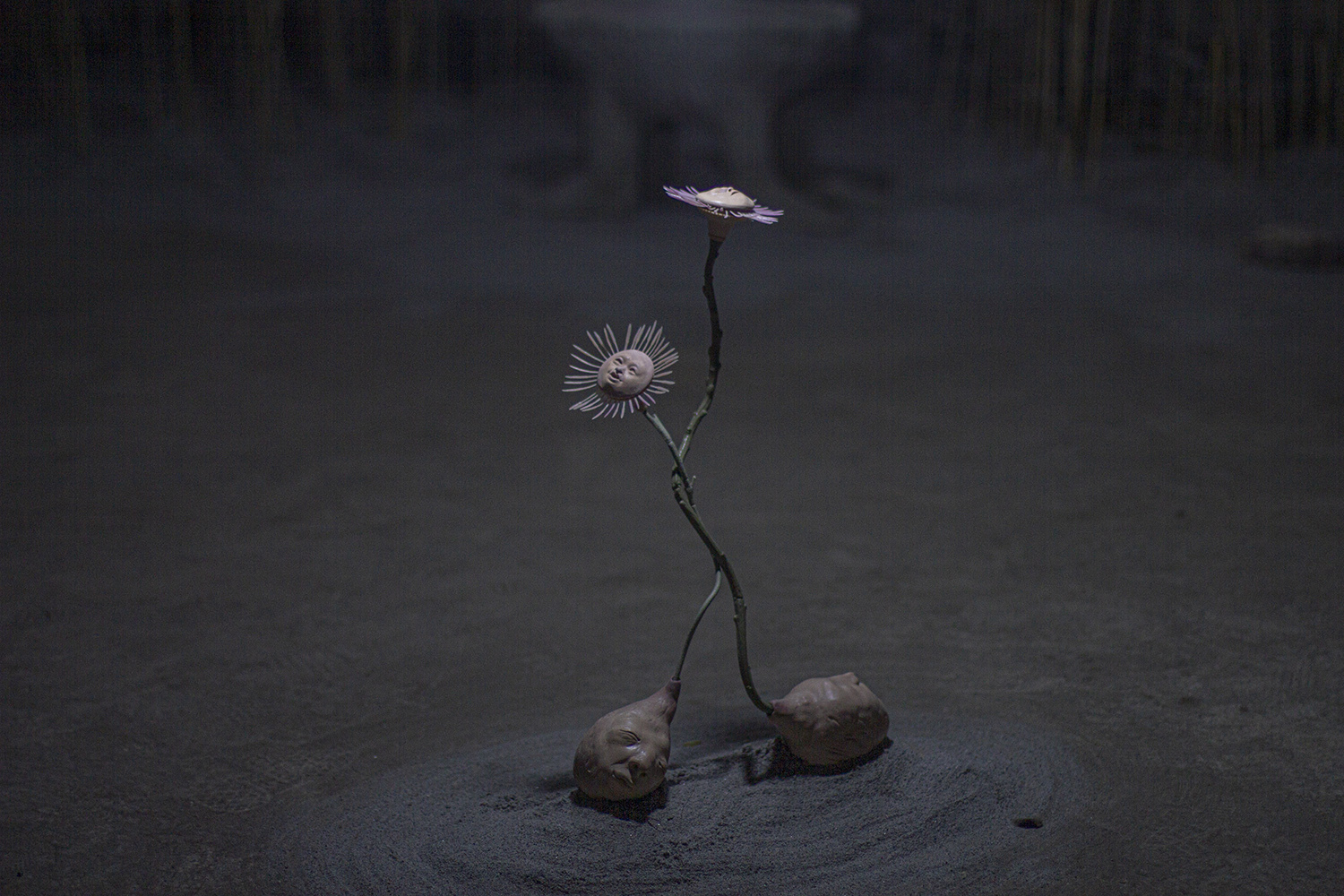 Within their anthropomorphic sculptures, large concrete constructions and gently floating prints, human destruction is thus transformed into a new creation story in which all the grip of ratio seems to disappear. The viewer’s only accompaniment is the recurring motif of the feminine principle, which appears sometimes in the form of natural elements or in the form of embodied archetypes. Wandering around the surrealistic hybrid figures, the transfigured creatures, no one is able to tell anymore, whether it is the past past, a post-apocalyptic future, or the mystical and eerie reality.