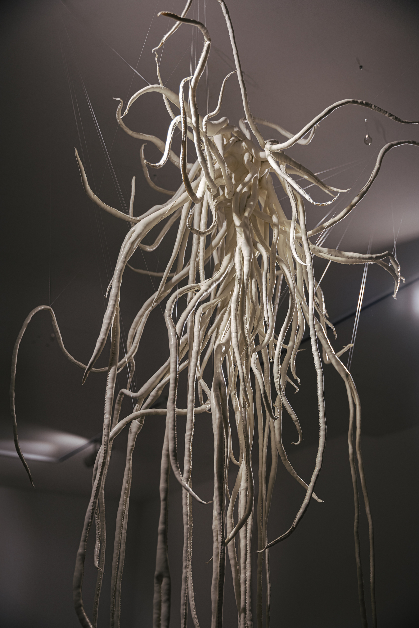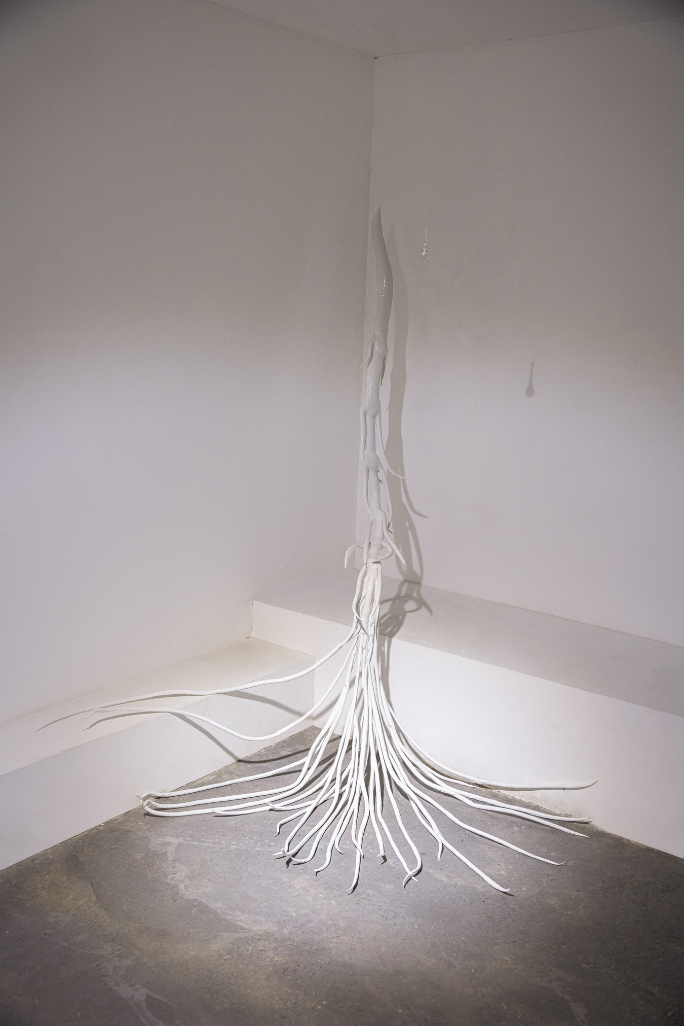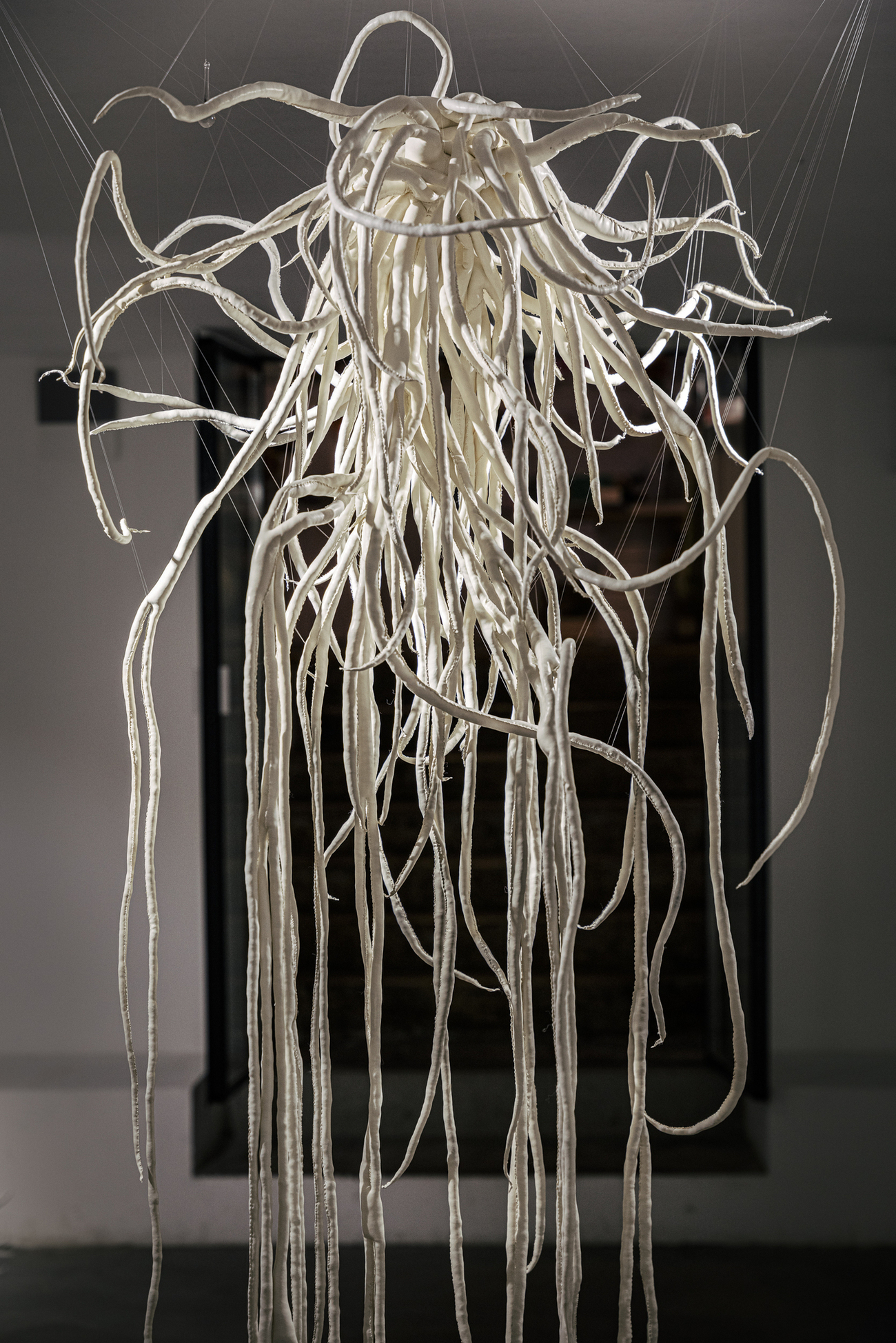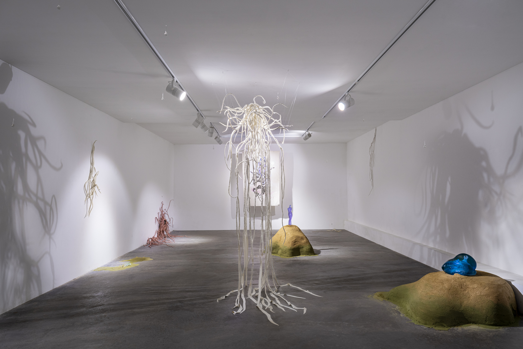 The key scene of an epic of individuation explodes in the space, where the individual is on their way to discover their own spiritual aspects. As they become one with their own shadow side, banished to the terrain of the unconscious, they open their tear ducts to feed the promise of a final reckoning. The uncanny (unheimlich) tentacle-creatures that cover the cave walls are already heralding the end of the self-proclaimed exclusive Anthropocene world. Organically, it is all rotting into another ’subnatural’ reality, while in the Bataillean base matter, that is, in the slimy energy of darkness and irrationality, the womb of rebirth is swaying.