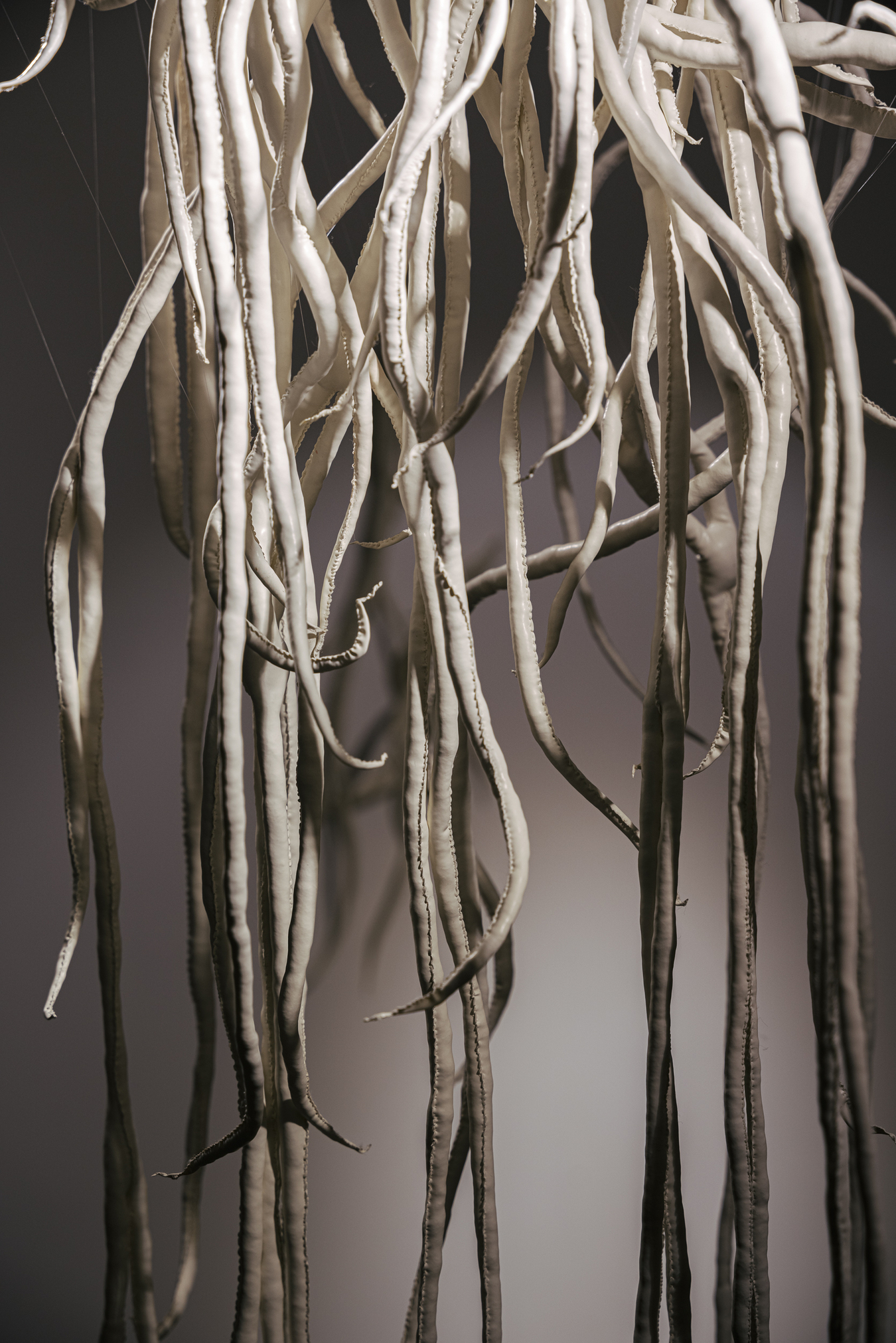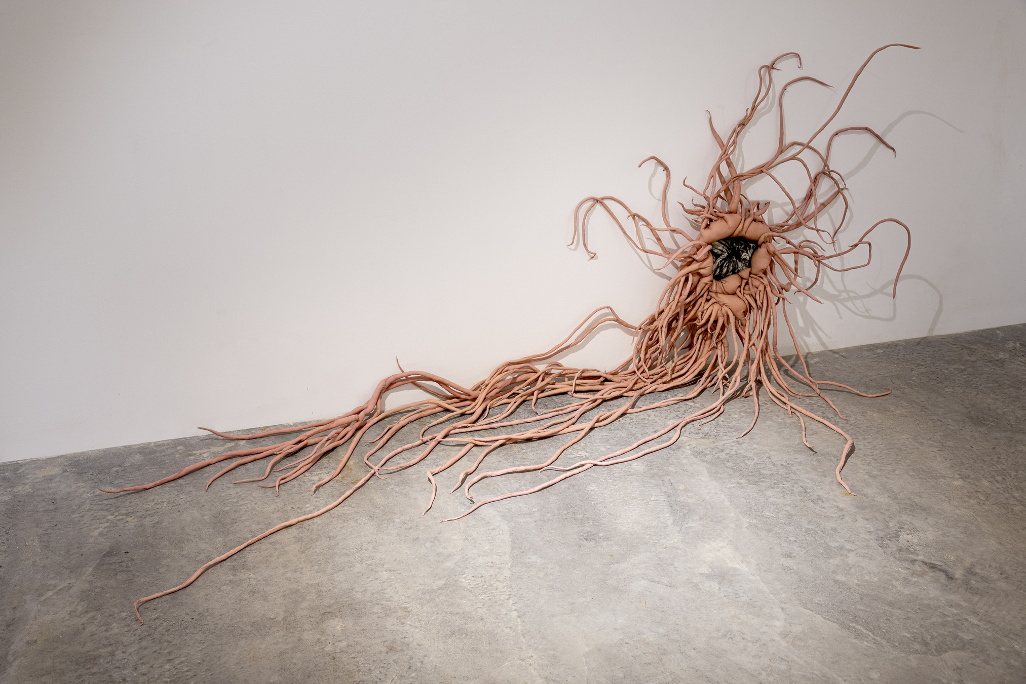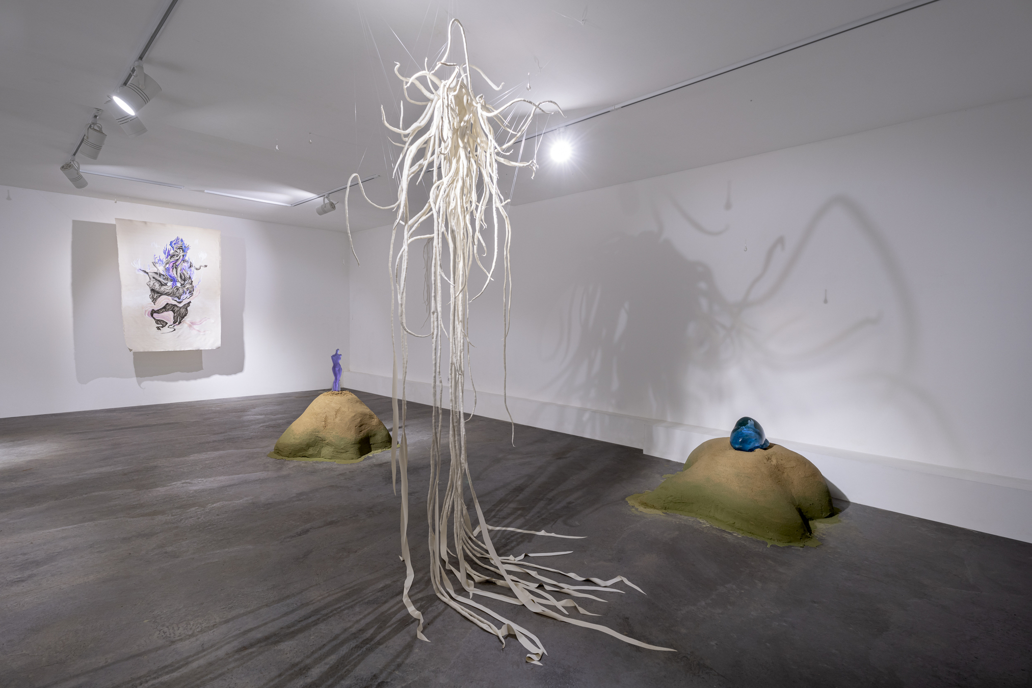 The key scene of an epic of individuation explodes in the space, where the individual is on their way to discover their own spiritual aspects. As they become one with their own shadow side, banished to the terrain of the unconscious, they open their tear ducts to feed the promise of a final reckoning. The uncanny (unheimlich) tentacle-creatures that cover the cave walls are already heralding the end of the self-proclaimed exclusive Anthropocene world. Organically, it is all rotting into another ’subnatural’ reality, while in the Bataillean base matter, that is, in the slimy energy of darkness and irrationality, the womb of rebirth is swaying.
