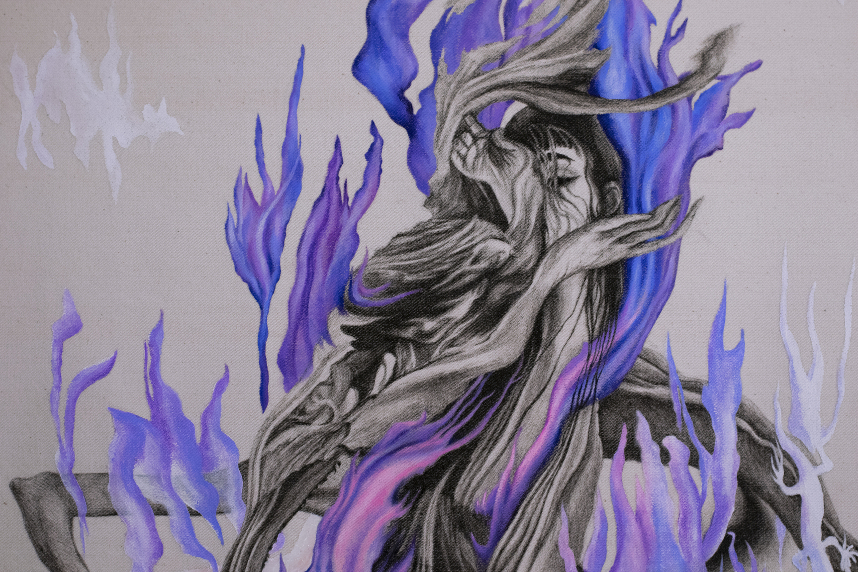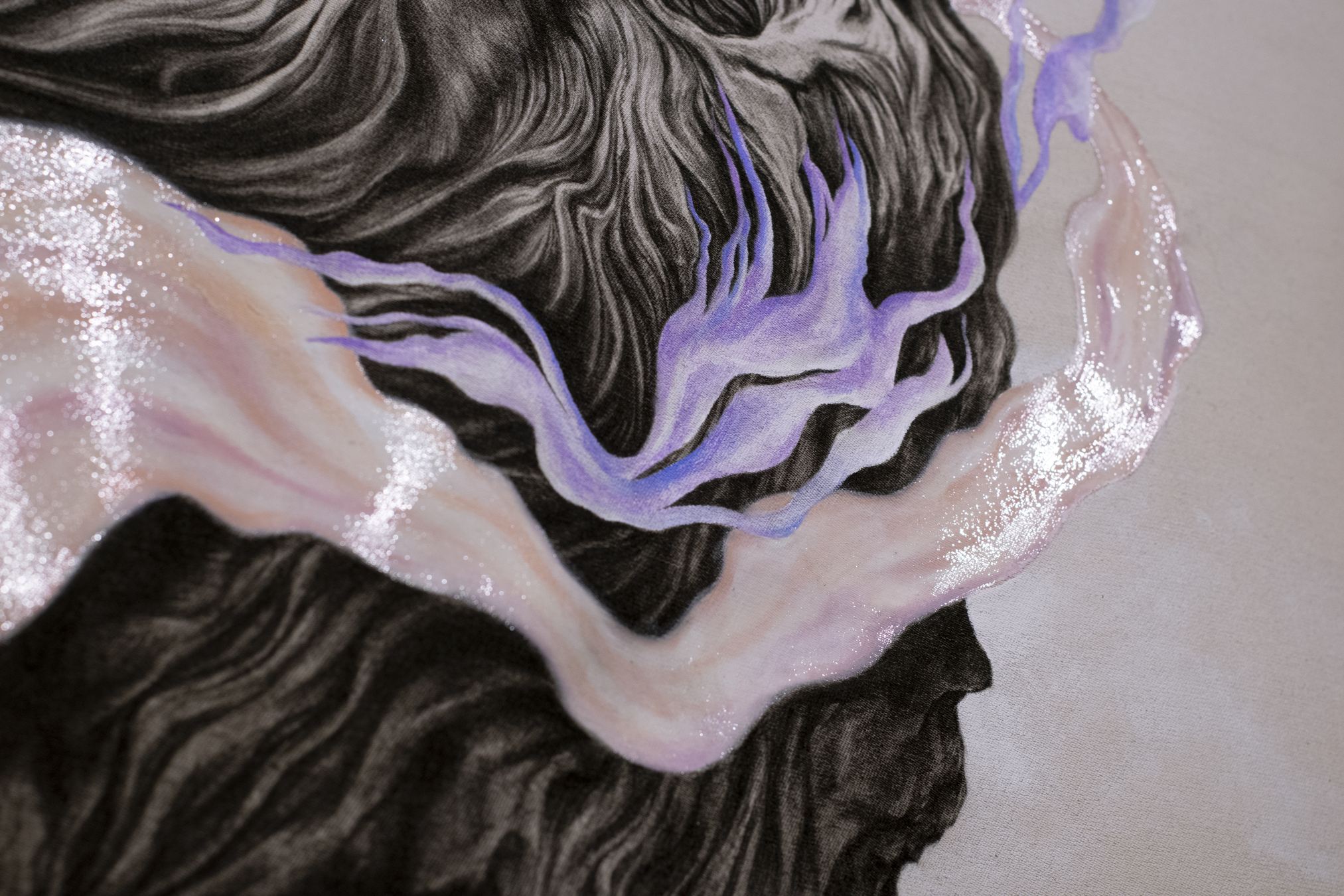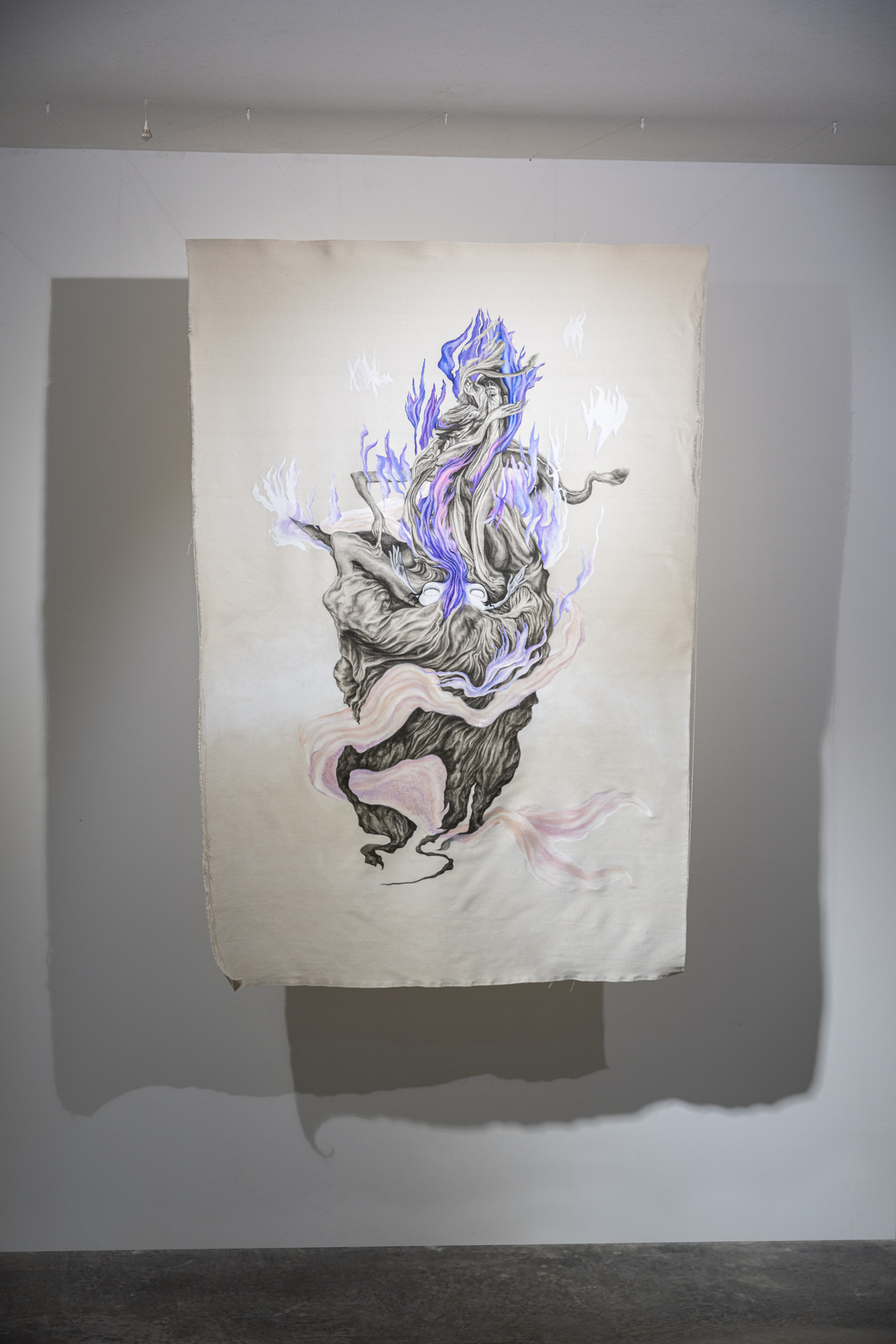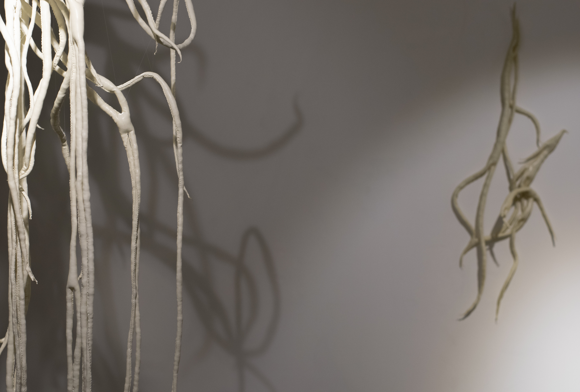 The key scene of an epic of individuation explodes in the space, where the individual is on their way to discover their own spiritual aspects. As they become one with their own shadow side, banished to the terrain of the unconscious, they open their tear ducts to feed the promise of a final reckoning. The uncanny (unheimlich) tentacle-creatures that cover the cave walls are already heralding the end of the self-proclaimed exclusive Anthropocene world. Organically, it is all rotting into another ’subnatural’ reality, while in the Bataillean base matter, that is, in the slimy energy of darkness and irrationality, the womb of rebirth is swaying.