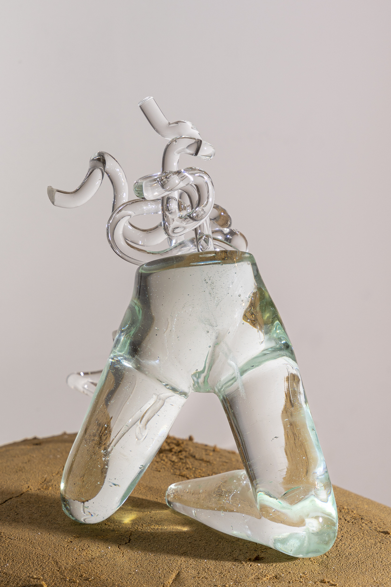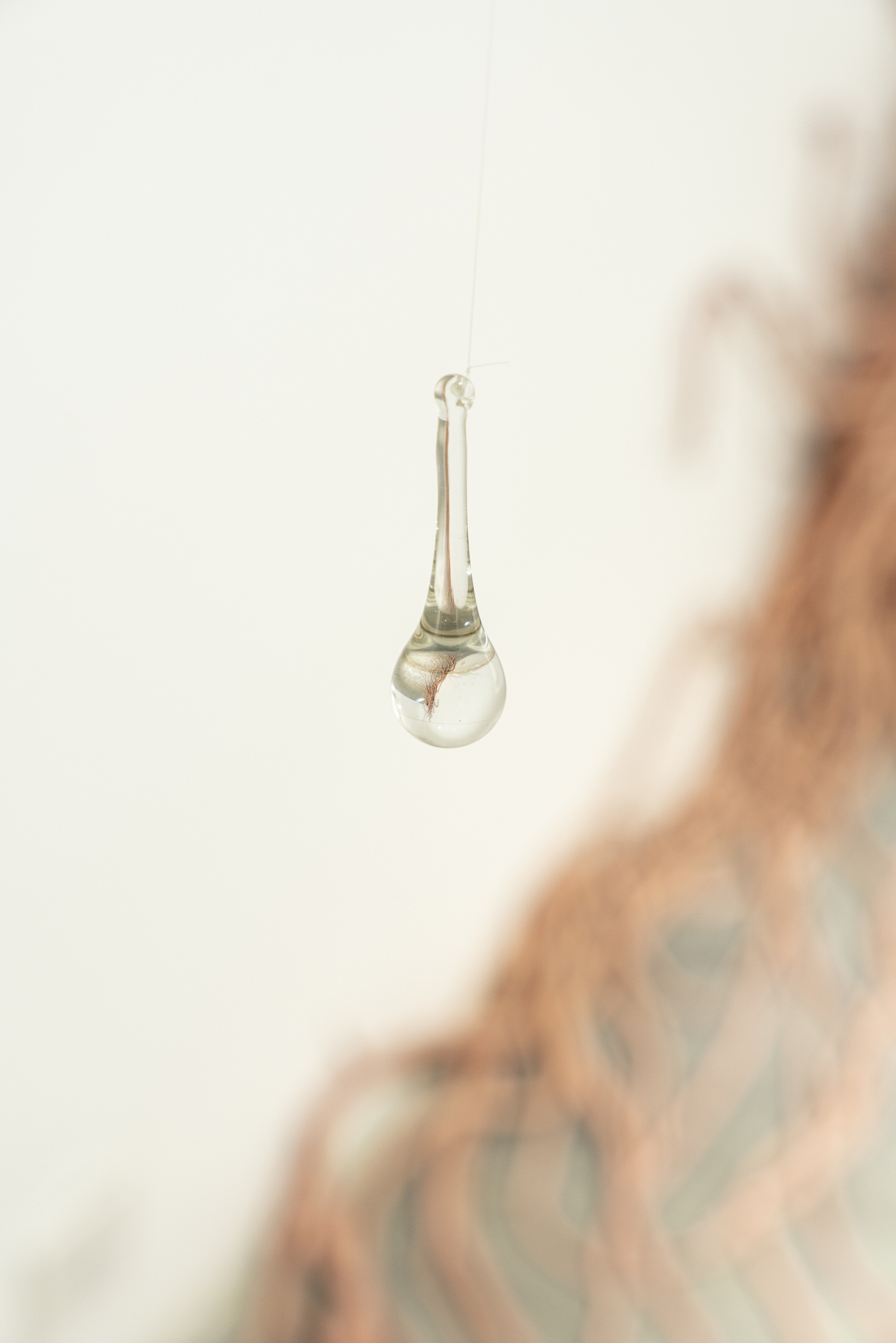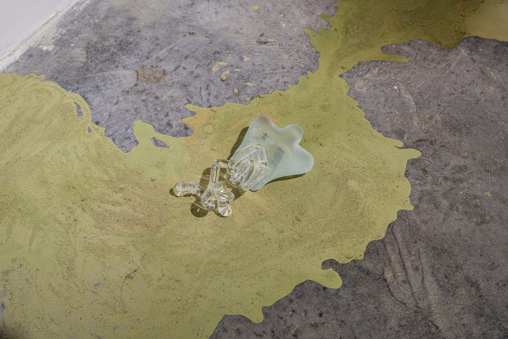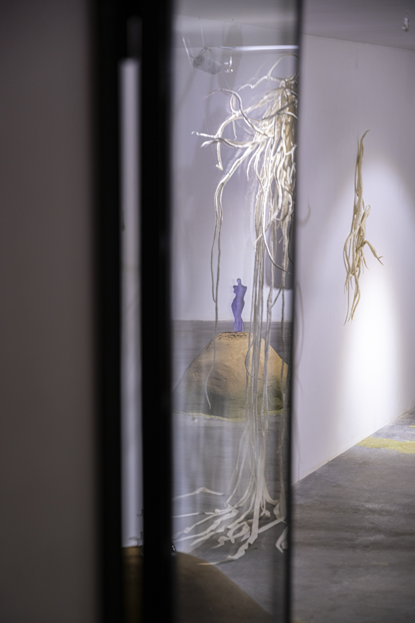 In their first joint exhibition, Stella Koleszár and Eszter Metzing use their art to explore inner processes that have been in motion for more than a year now and have been evolving ever since. They have created an image of an imaginary cave, the damp interior of which reflects several pieces of reality. It echoes the wholeness of being; it plays with the stitches of pain, the dimensions of existence frozen in glass. The cave thus imagined is at once the dream site of the individual, the story of the tales woven by the collective consciousness, a symbolic space of archetypes, and the creation of the exhibiting artists' private mythology. Birth, death, rebirth in the mud.