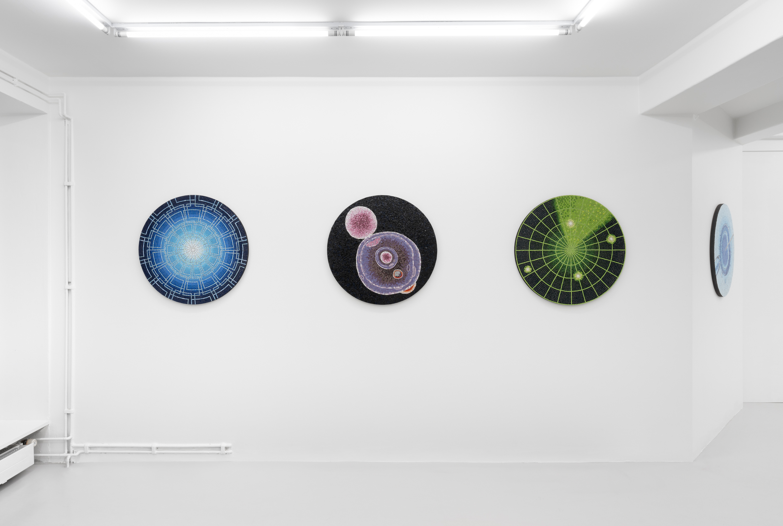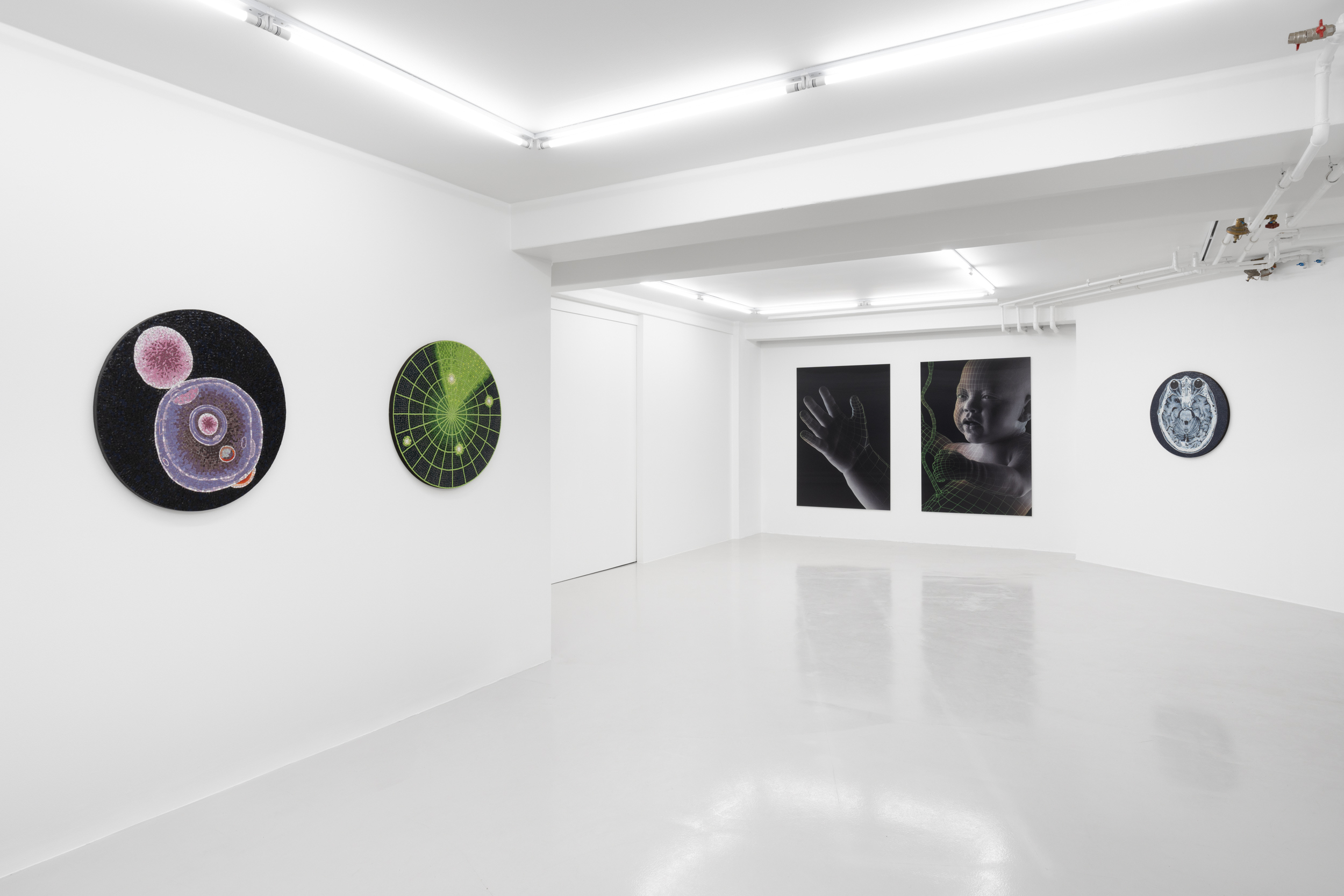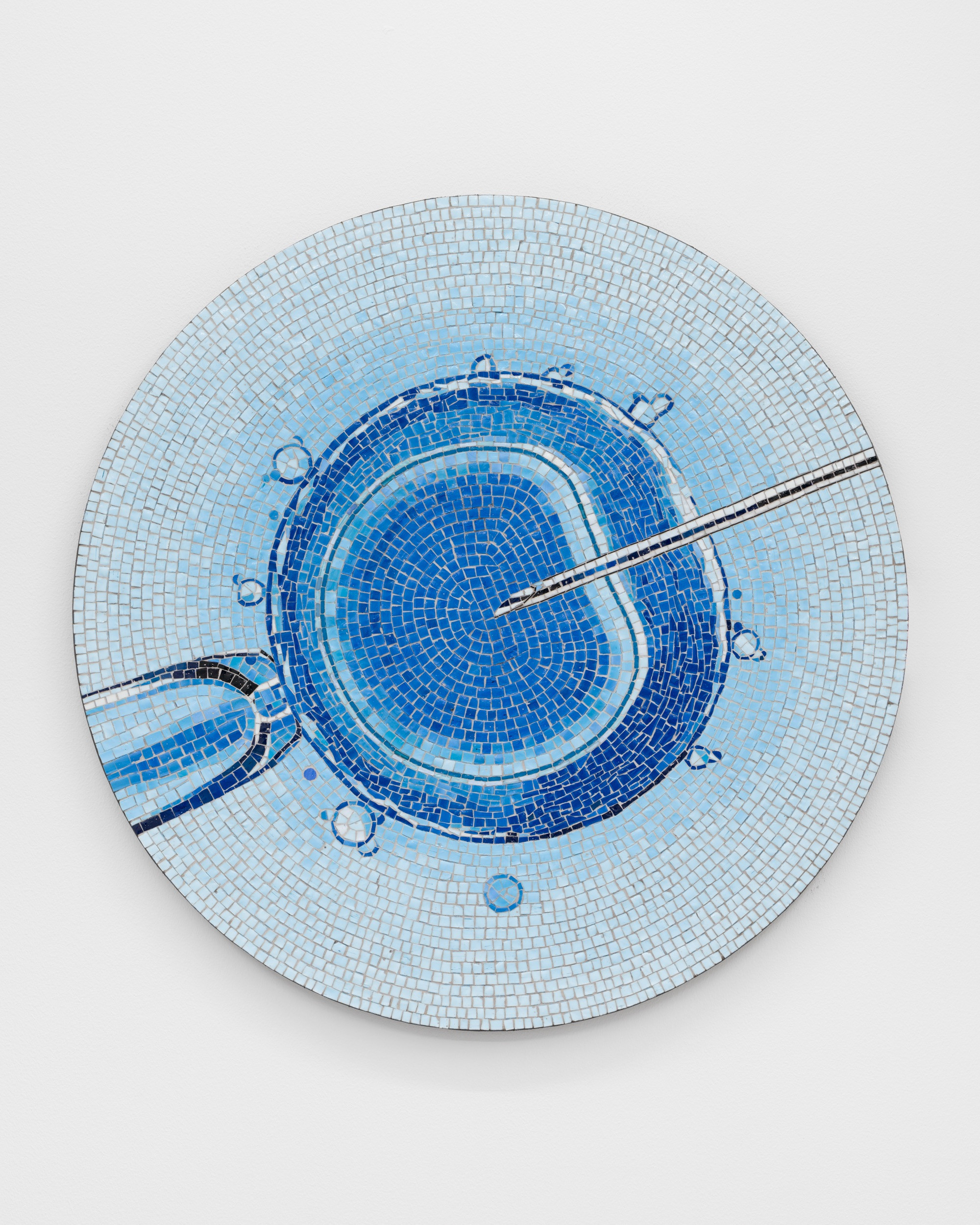 Settergren's selection of motifs from bio- and computer technology become enchanted when produced in mosaic versions, where thousands of tesserae create their surface like pixels in modern digital images. The round mosaic works with contemporary scientific and technological motifs, such as micro injections , are luminous and mysterious, reminiscent of imagery of saints and everyday objects from the mosaics in Byzantium or Pompeii. Settergren's large prints of a fetus also acquire a tinge of mystery and desire when the cool digital and indexical image escapes the gaze as one has to move to see the image change, without having the opportunity to see both versions. This tantalizing frustration and curiosity that we cannot gather our gaze in one vision gives the subject – the free-floating fetus – an eerie and science fiction-like expression.