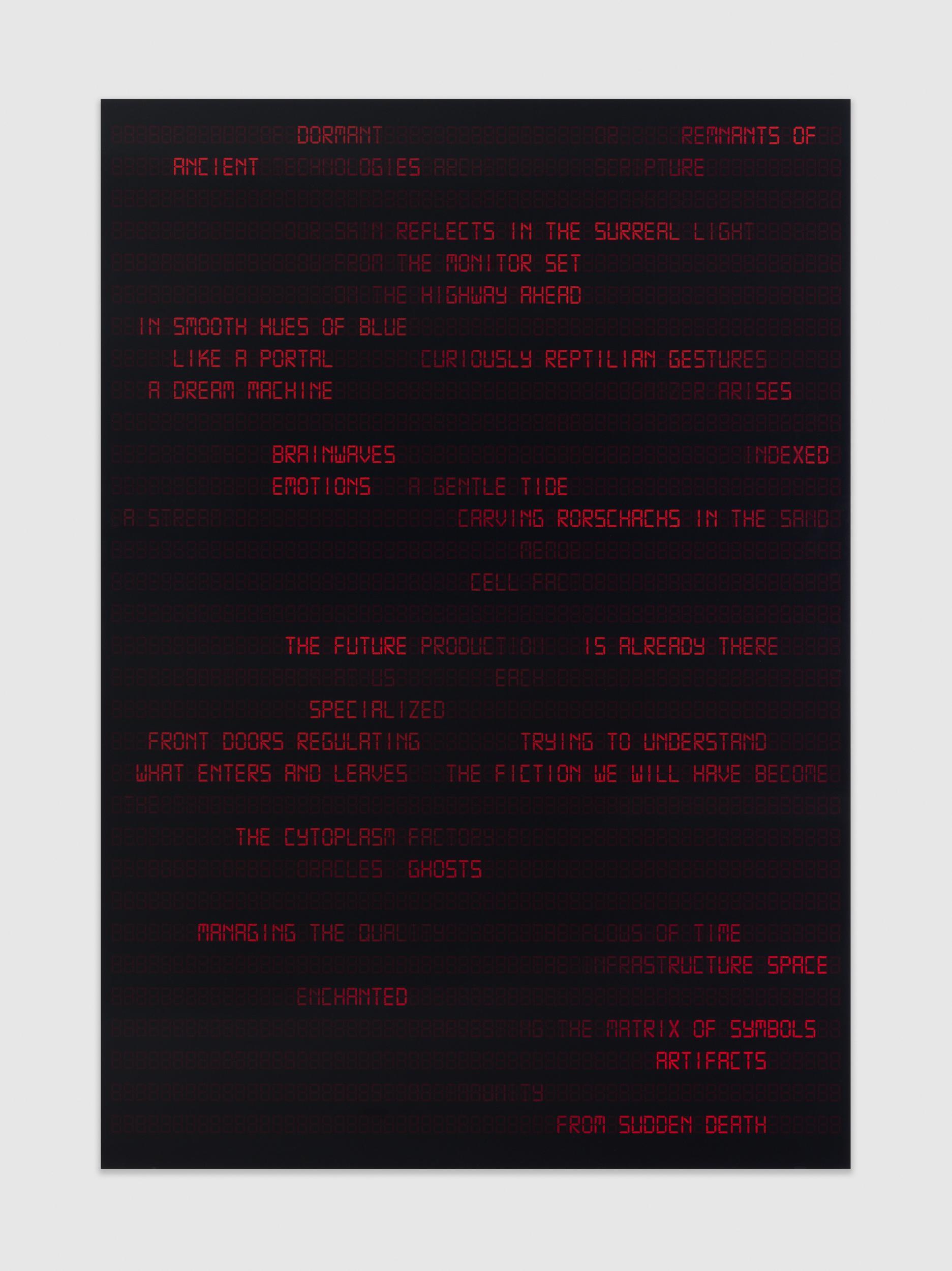 Here Settergren works on several fronts - both internally and externally. On the one hand, he examines how images affect us humans, and on the other hand, he creates new images himself, as if in the process to examine how they affect himself, and with the exhibition, also the affect on the rest of us. With aesthetics that span ancient image technologies, science-fiction visions, contemporary advertising language and natural science's clinical representation of the world, Settergren delves into the logic of imagery, perhaps rendering the works as a kind of fuel for our unconscious, collective, aesthetic memory.