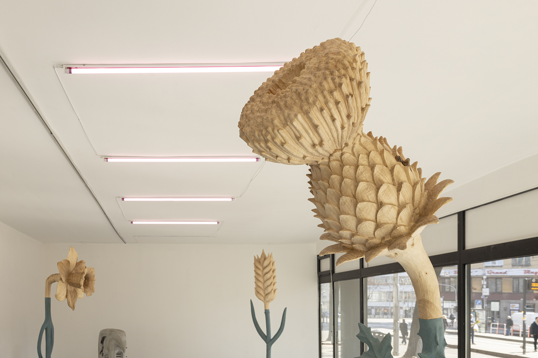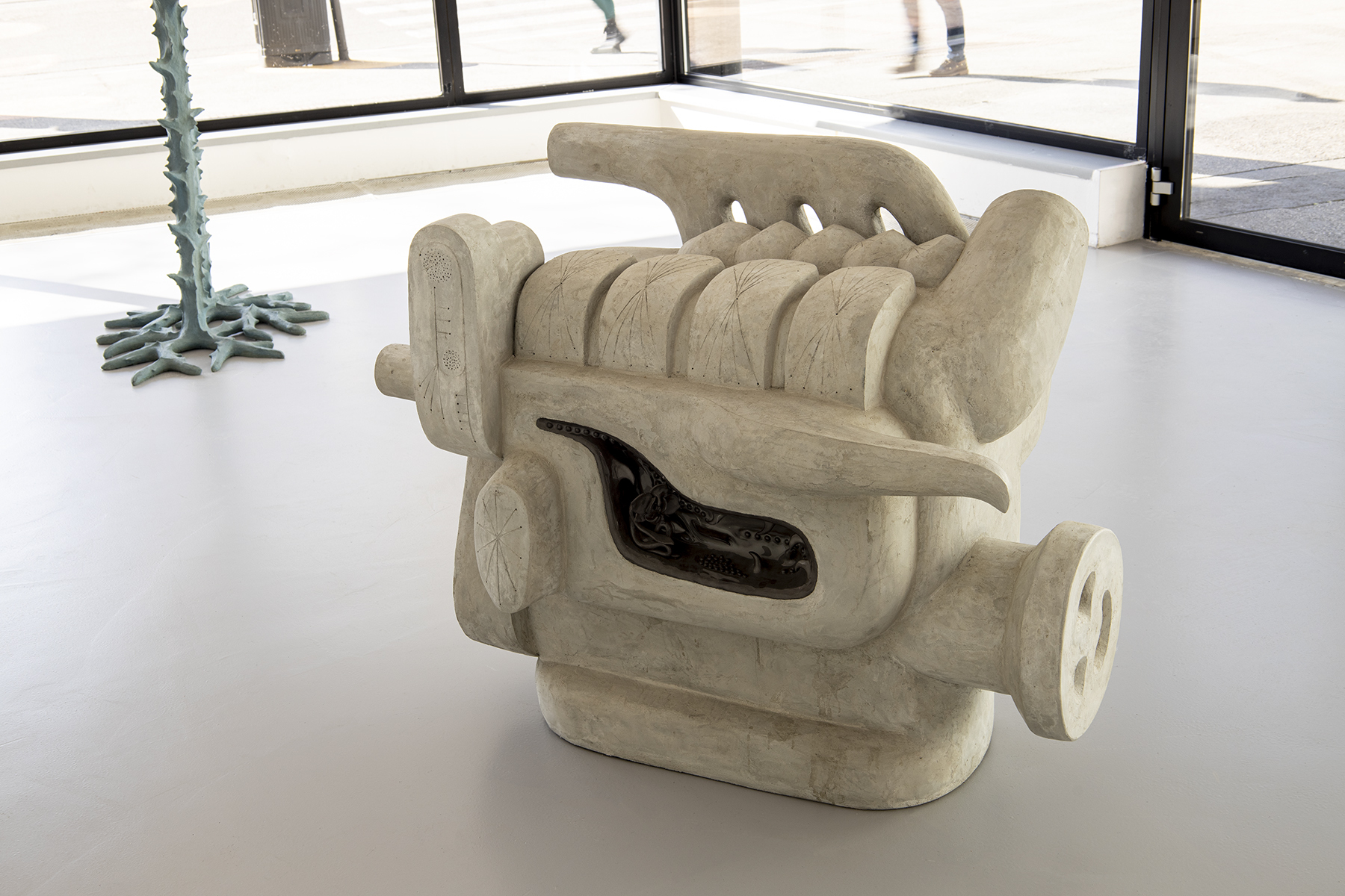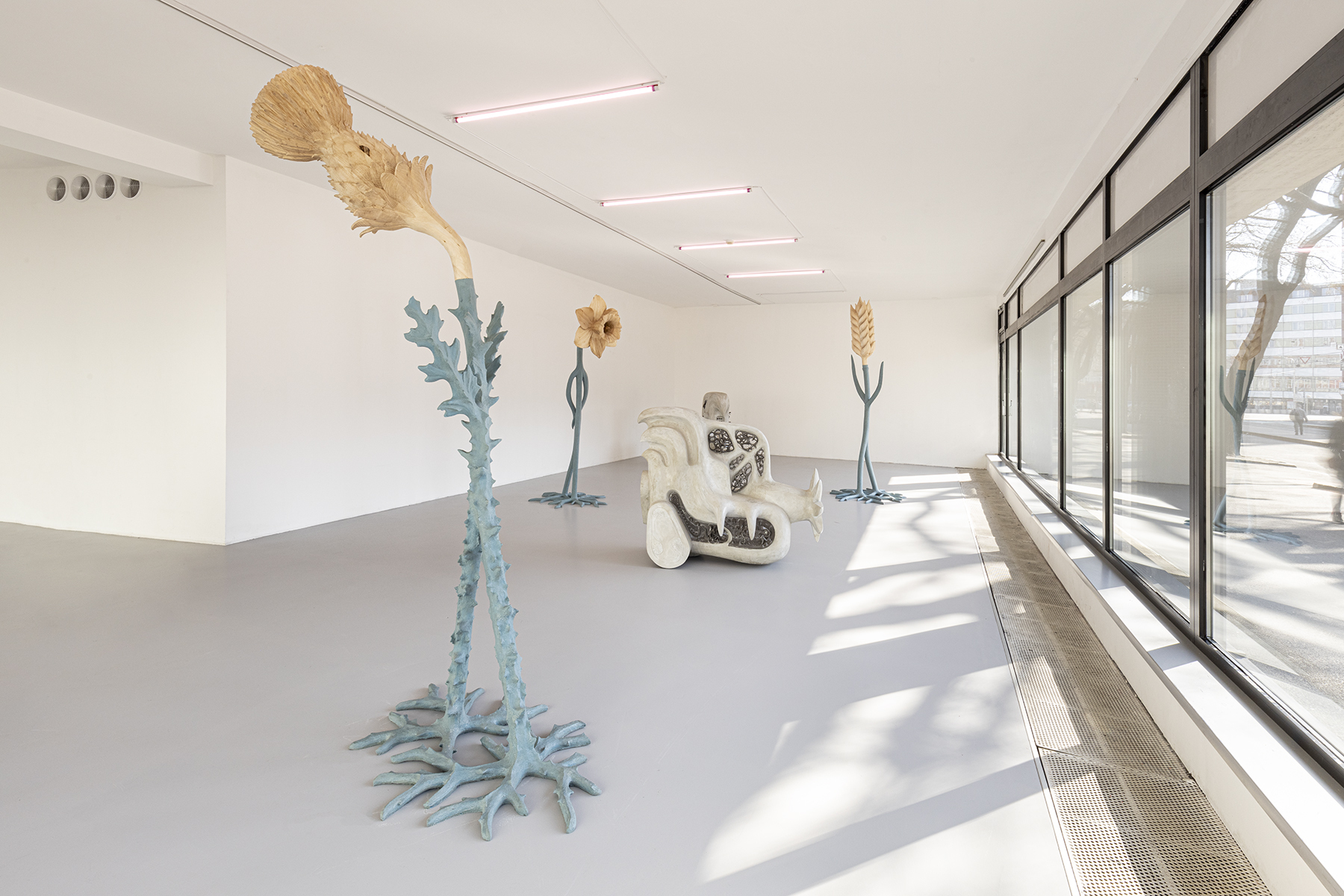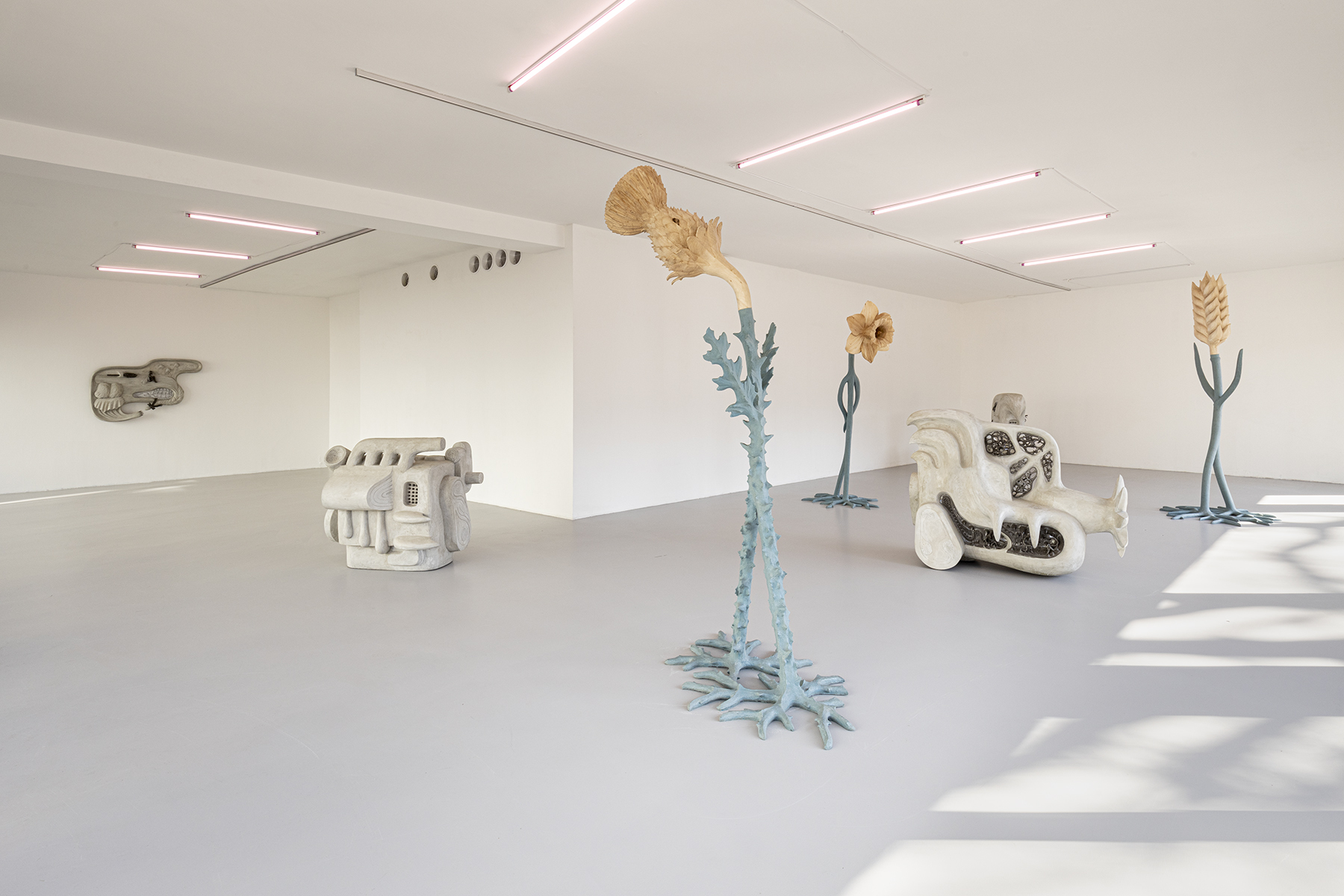 The main protagonists of Edible, Beautiful, Untamed aren’t human. This is a world of modified organisms and machinery – giant vegetation, hybrid insects, and mutated agricultural equipment. Heavy concrete objects with shapes reminiscent of engines are adorned with intricate ceramic vegetal growth. Plants lean over your head, their monumental size the result of some accidental or engineered genetic modification, or – as it may well be – a humbling of a human perspective and privilege. From a fusion of the organic and technological emerges a vision of post-anthropogenic nature; a perhaps monstrous, perhaps fantastic, feral garden.
