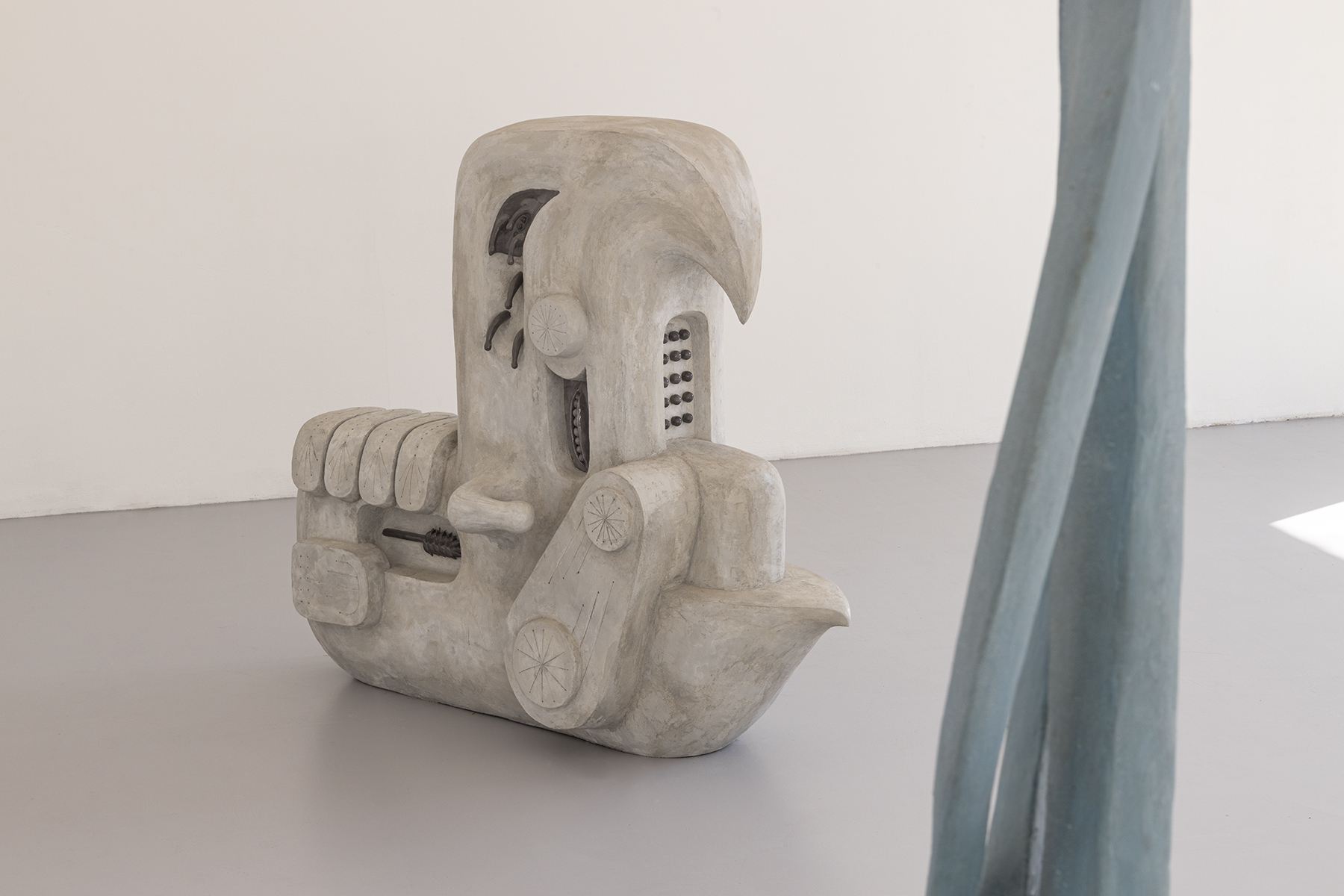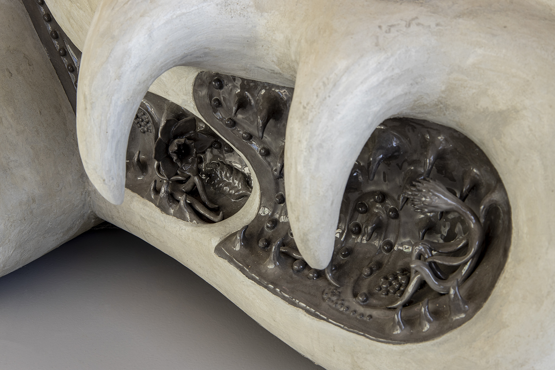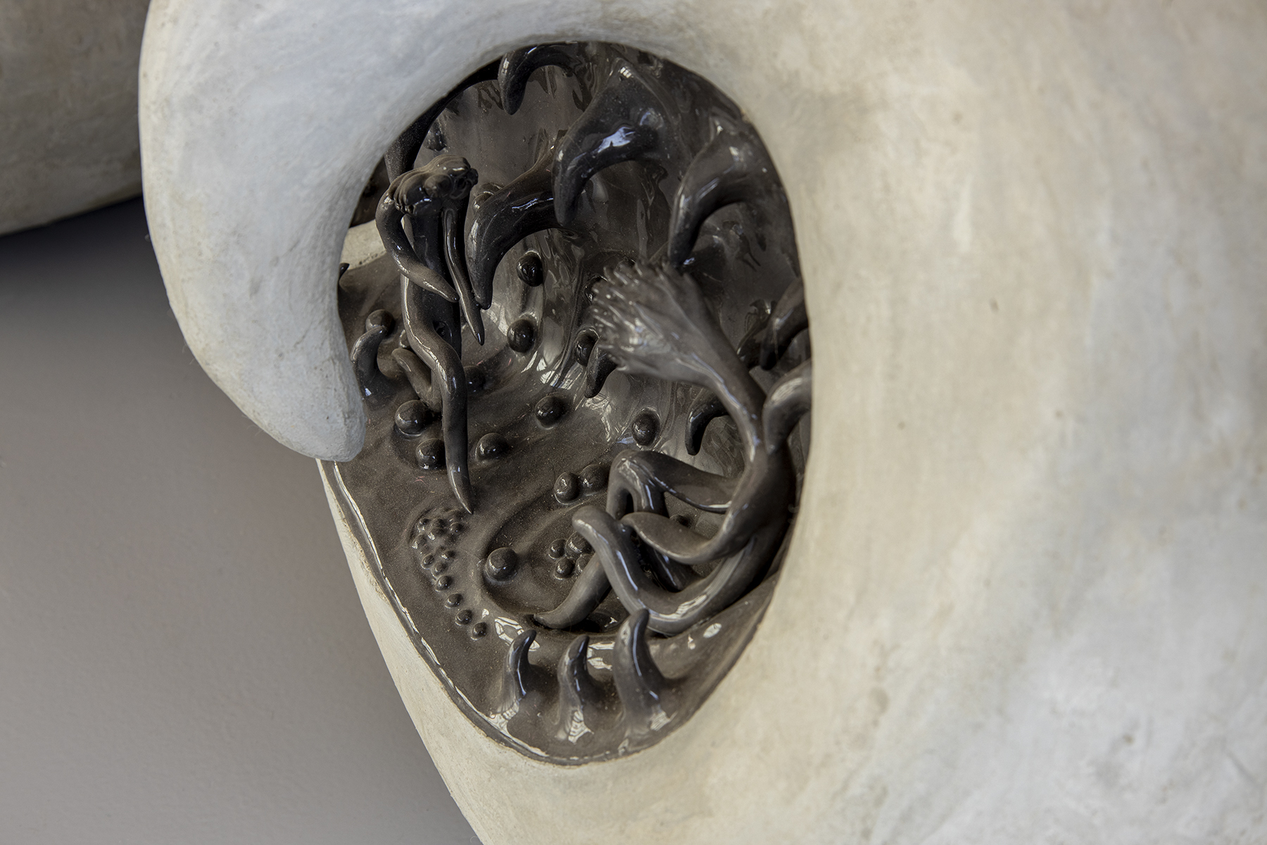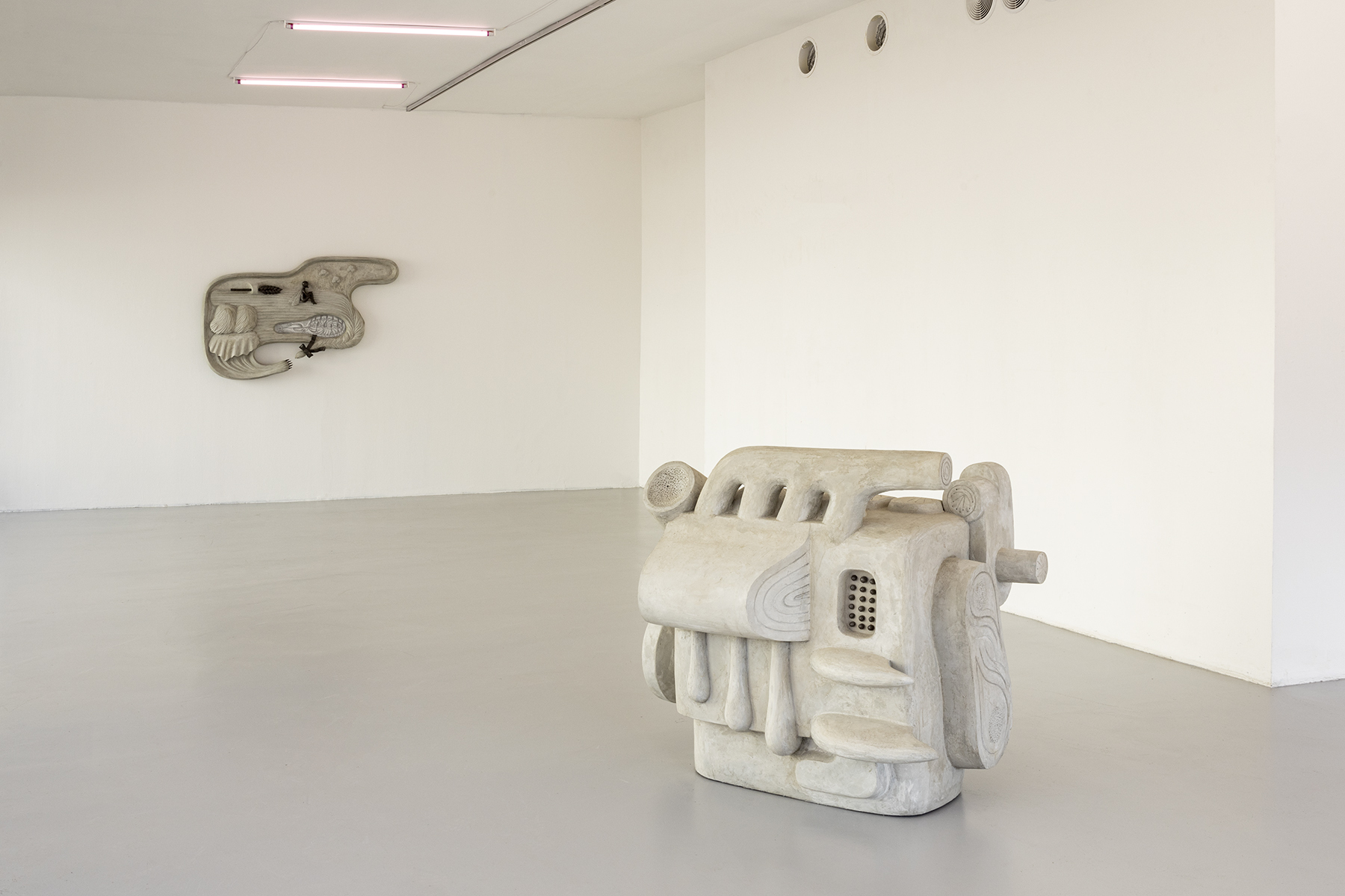 The main protagonists of Edible, Beautiful, Untamed aren’t human. This is a world of modified organisms and machinery – giant vegetation, hybrid insects, and mutated agricultural equipment. Heavy concrete objects with shapes reminiscent of engines are adorned with intricate ceramic vegetal growth. Plants lean over your head, their monumental size the result of some accidental or engineered genetic modification, or – as it may well be – a humbling of a human perspective and privilege. From a fusion of the organic and technological emerges a vision of post-anthropogenic nature; a perhaps monstrous, perhaps fantastic, feral garden.