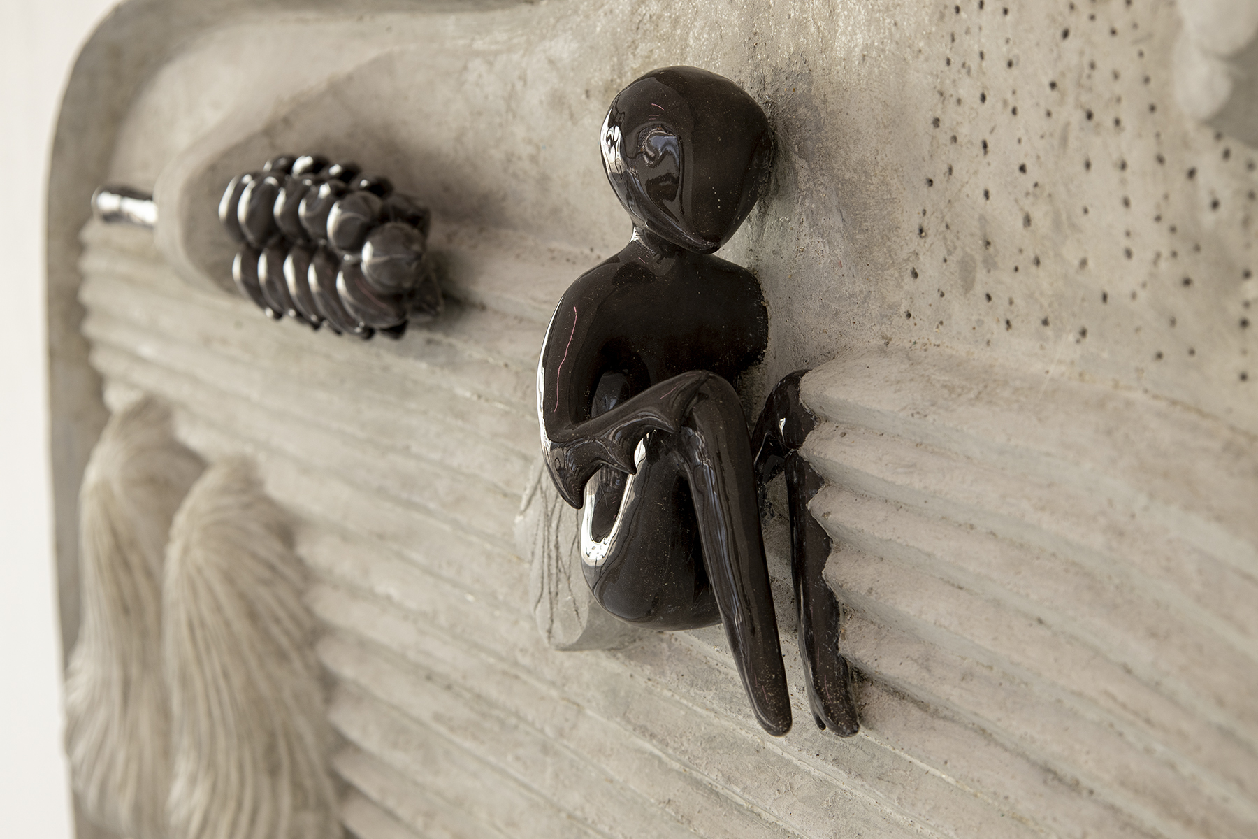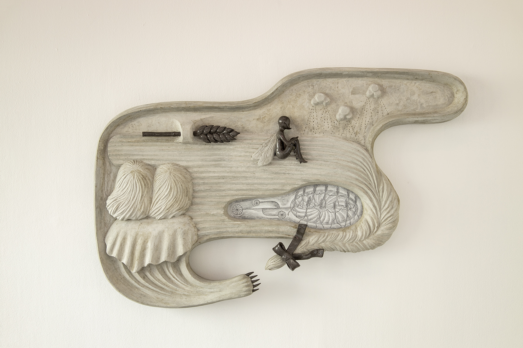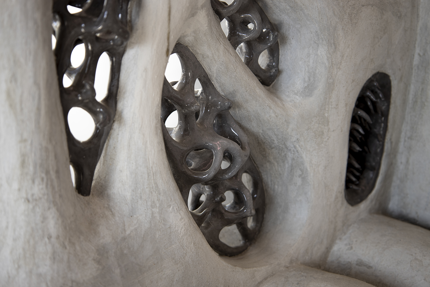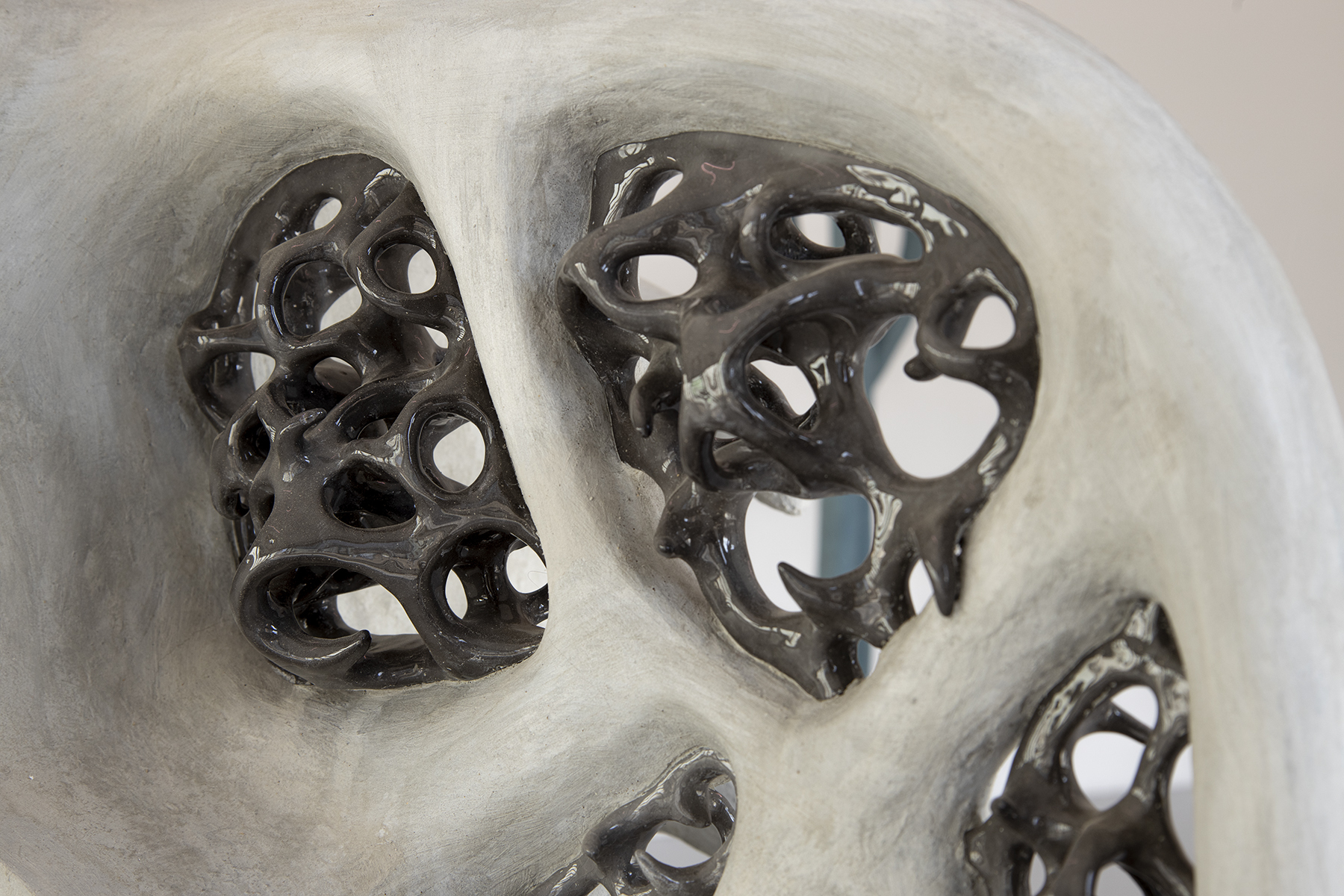 The main protagonists of Edible, Beautiful, Untamed aren’t human. This is a world of modified organisms and machinery – giant vegetation, hybrid insects, and mutated agricultural equipment. Heavy concrete objects with shapes reminiscent of engines are adorned with intricate ceramic vegetal growth. Plants lean over your head, their monumental size the result of some accidental or engineered genetic modification, or – as it may well be – a humbling of a human perspective and privilege. From a fusion of the organic and technological emerges a vision of post-anthropogenic nature; a perhaps monstrous, perhaps fantastic, feral garden.