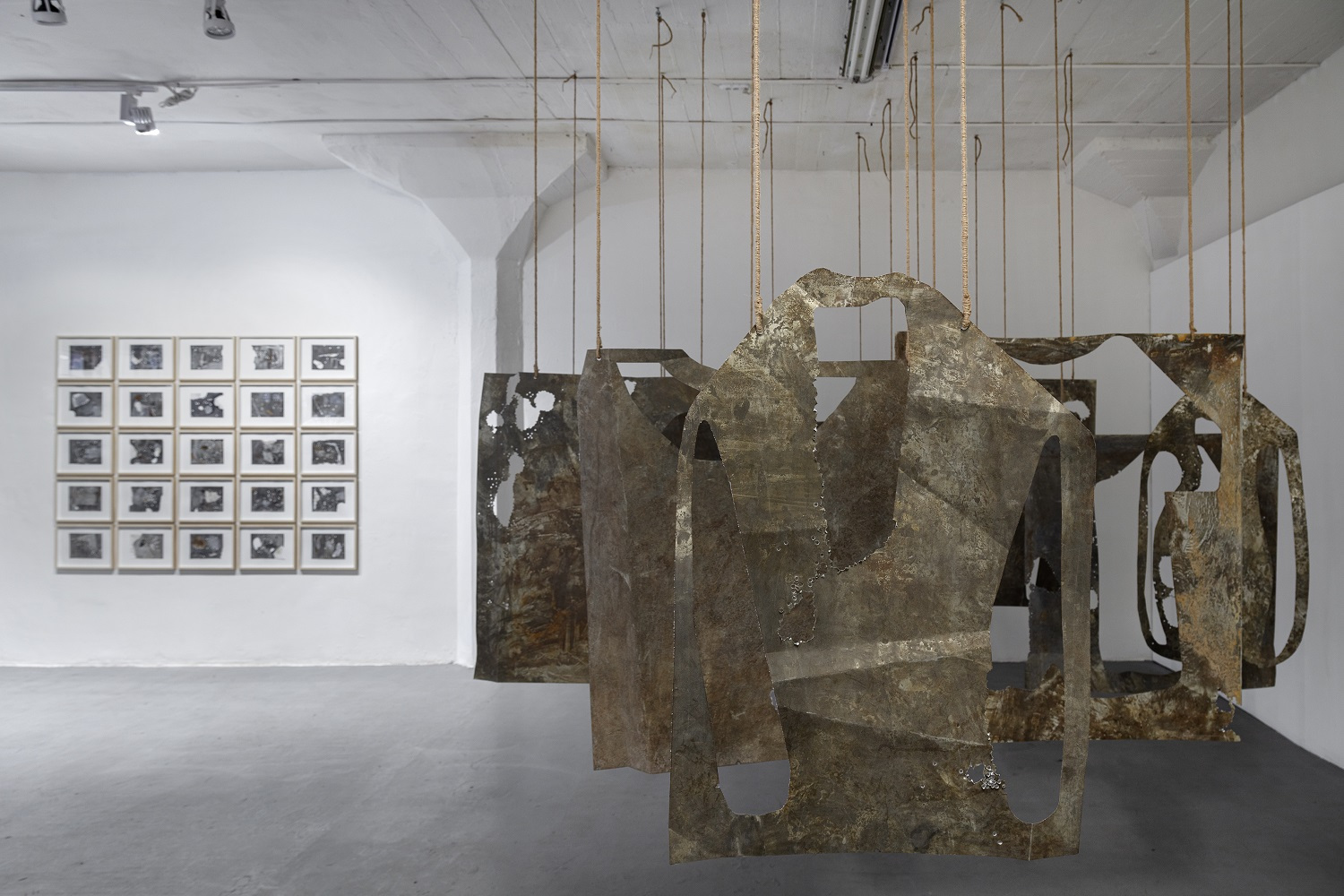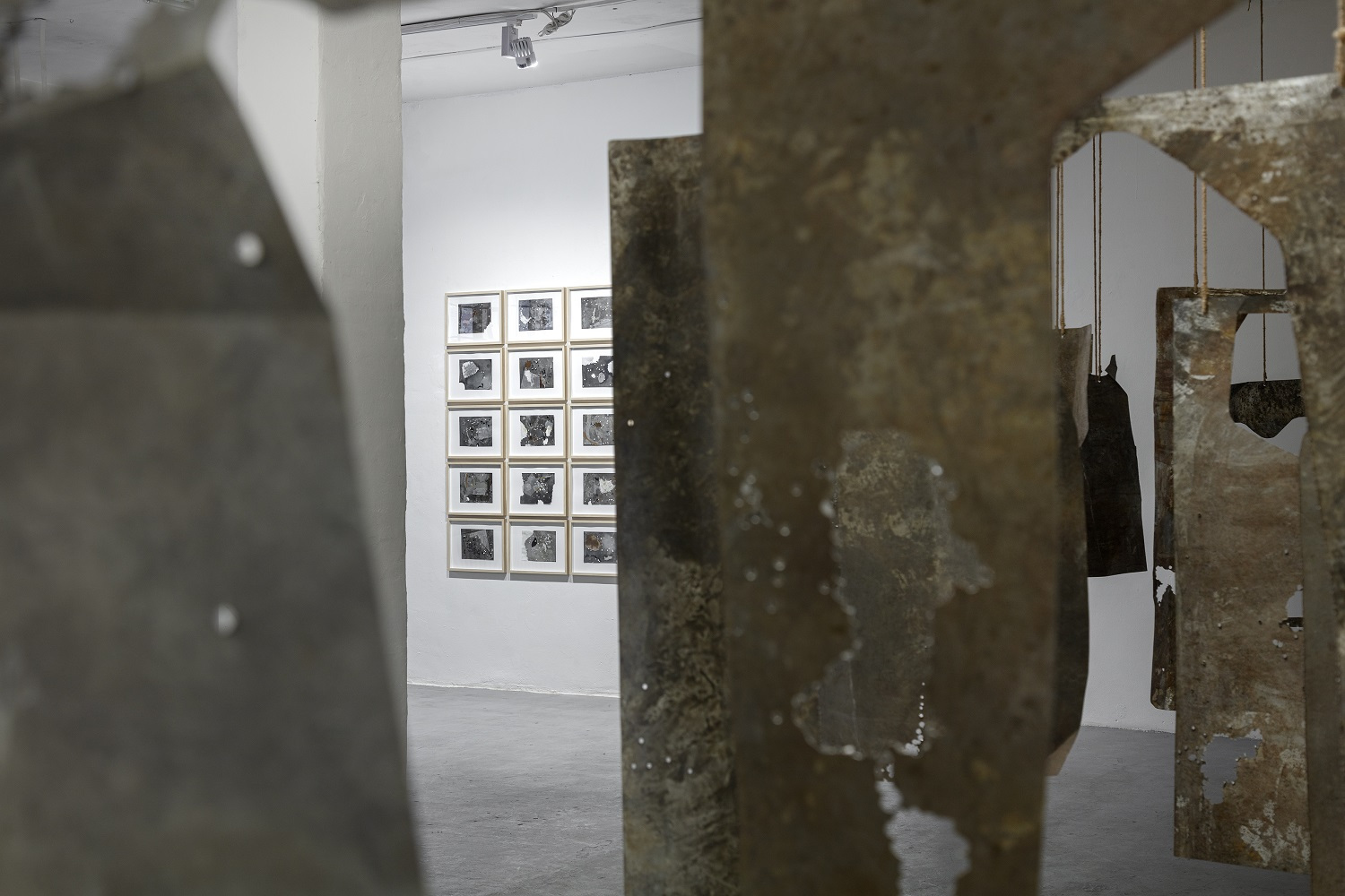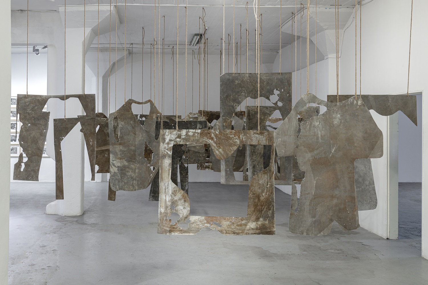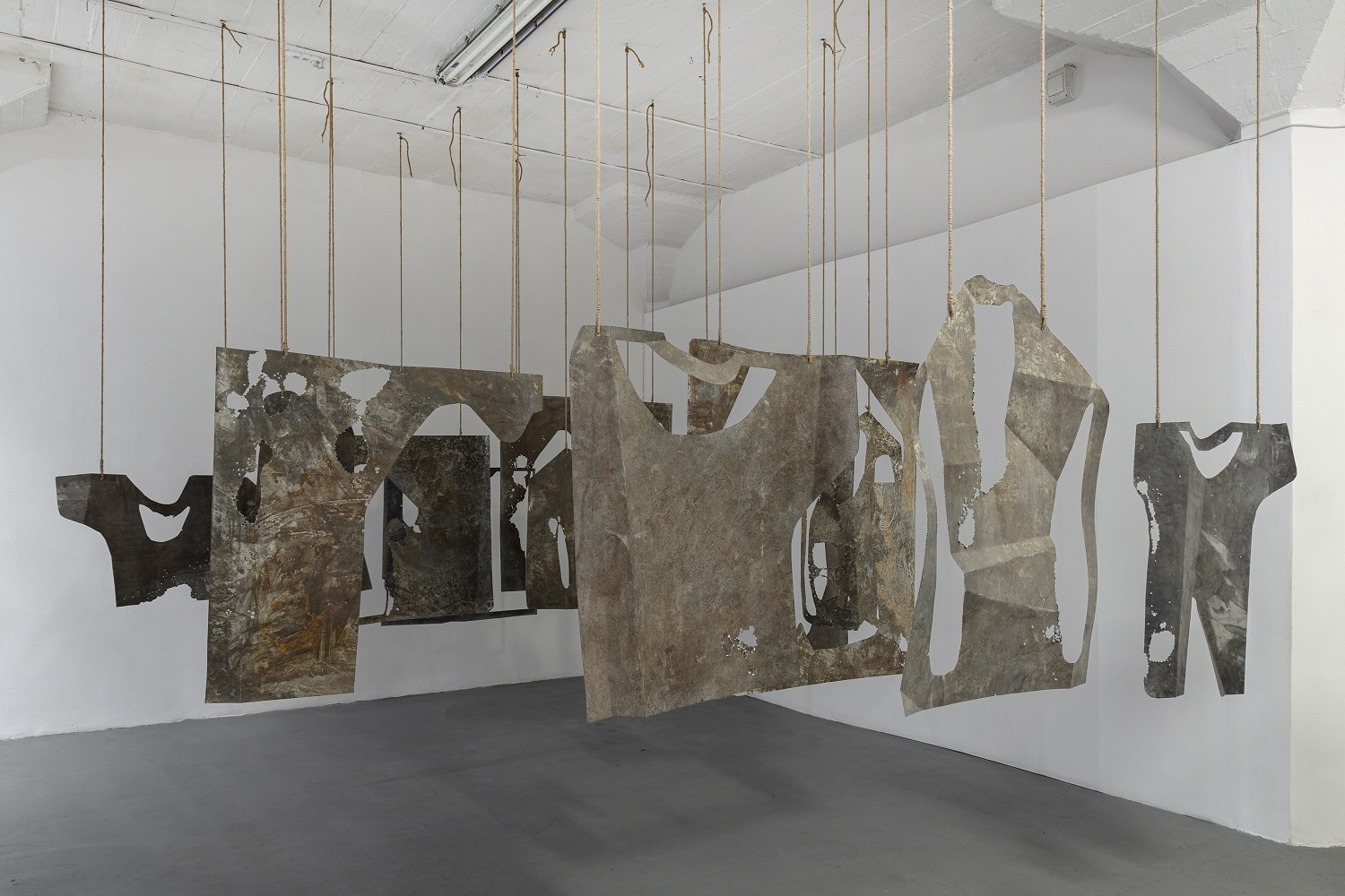 The presented monumental installations and small executions considerably transmit with the architecture of the exhibition space and physical proximity of the viewer. He appears in an entangled crowd full of aluminium sheets (Beyond cycles), which evoke oblivion and fear from losing significance and own existence through the affection of a rust corroding and implementation into the environment of the First Republic factory. A person finds himself at the place that is physical but also a state of being – psychological inward marked by events, affiliation, desire but also displacement.