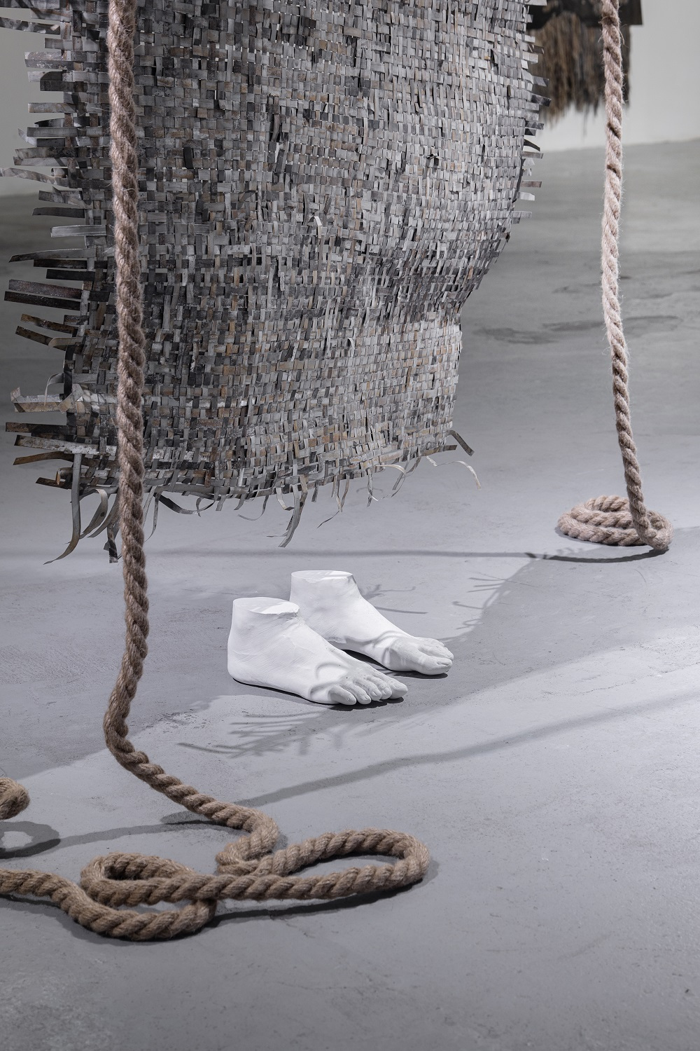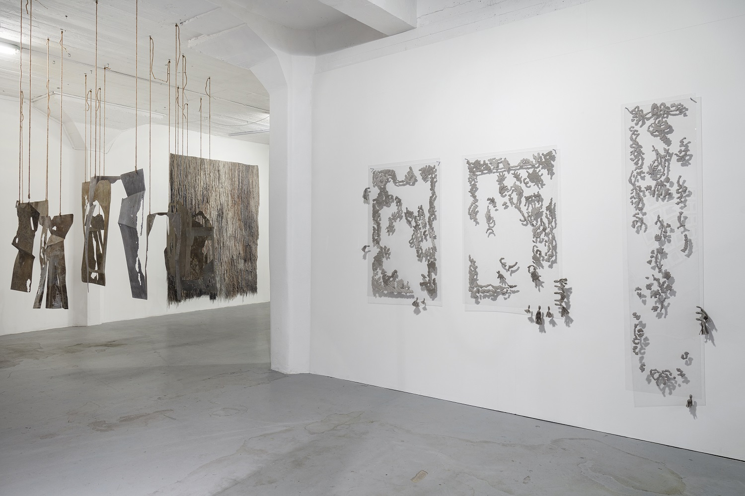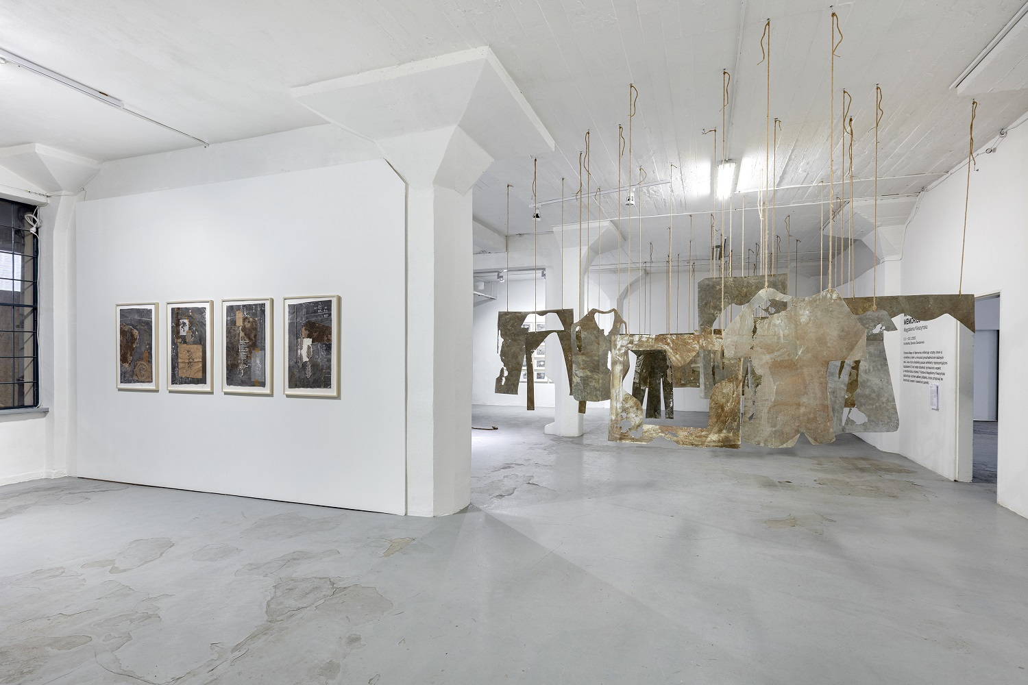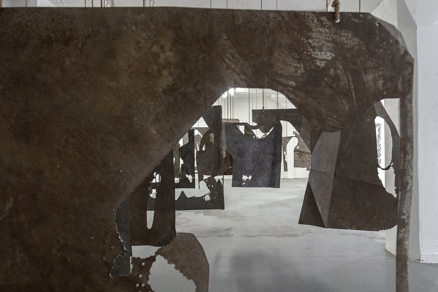 The presented monumental installations and small executions considerably transmit with the architecture of the exhibition space and physical proximity of the viewer. He appears in an entangled crowd full of aluminium sheets (Beyond cycles), which evoke oblivion and fear from losing significance and own existence through the affection of a rust corroding and implementation into the environment of the First Republic factory. A person finds himself at the place that is physical but also a state of being – psychological inward marked by events, affiliation, desire but also displacement.