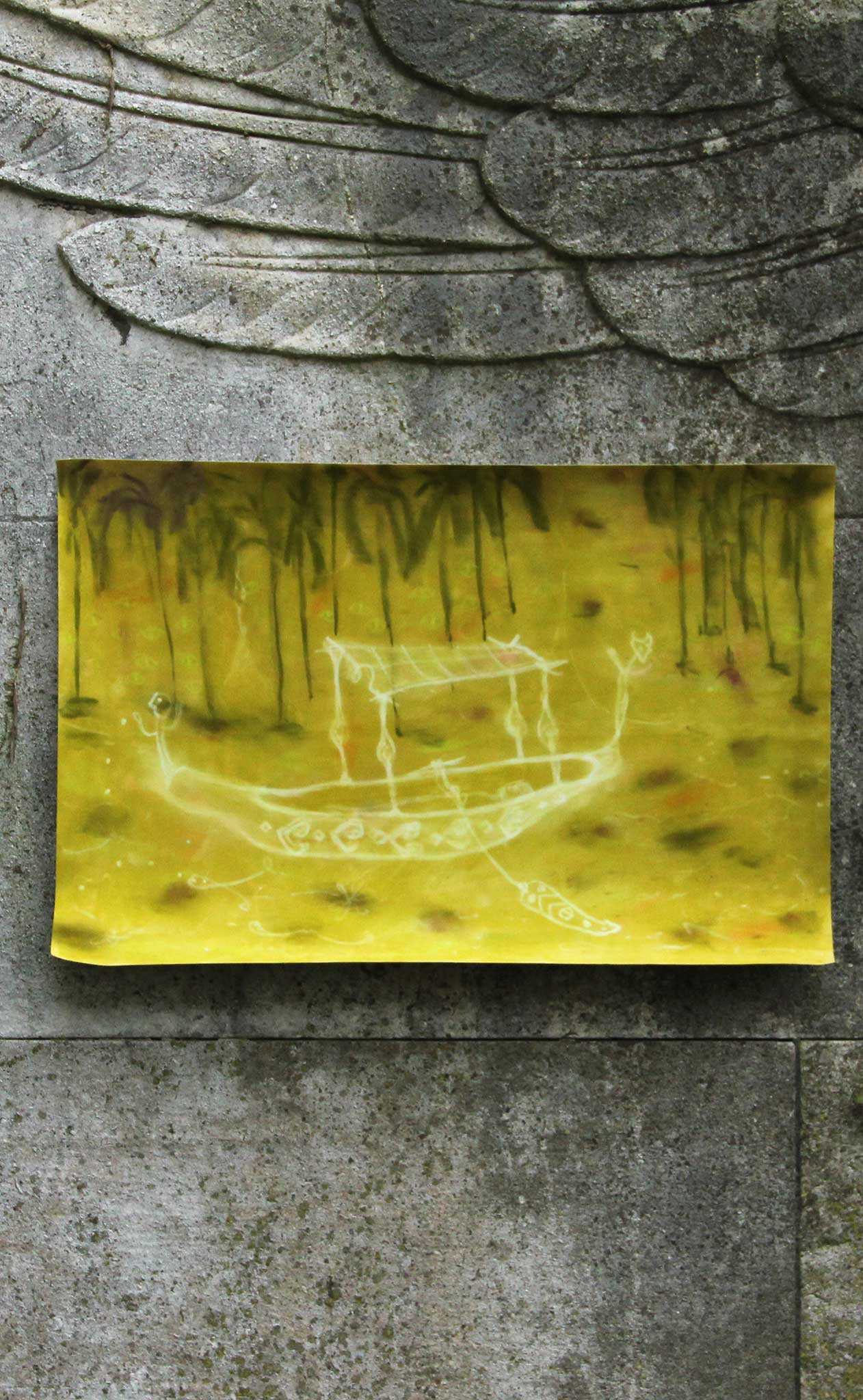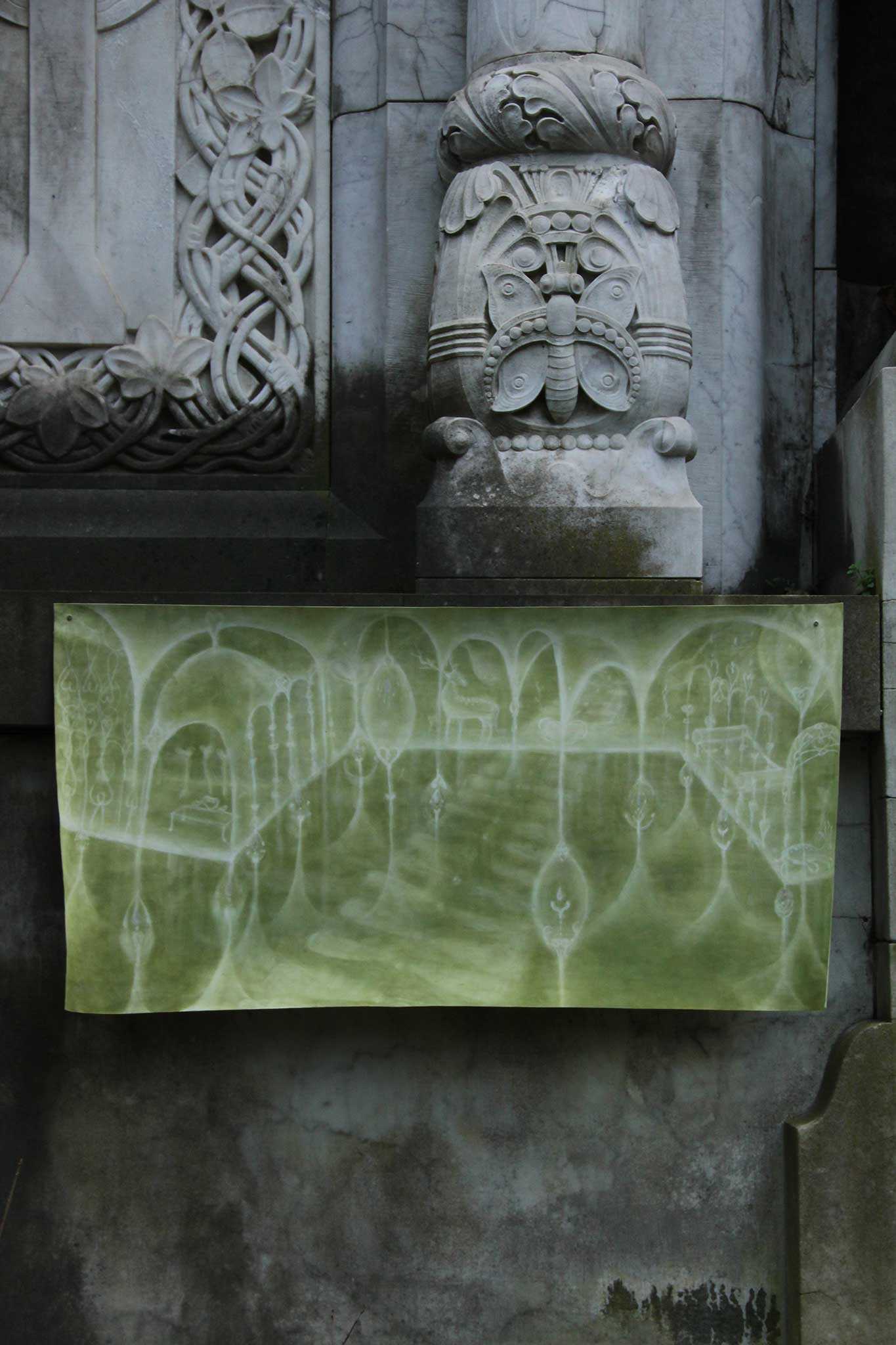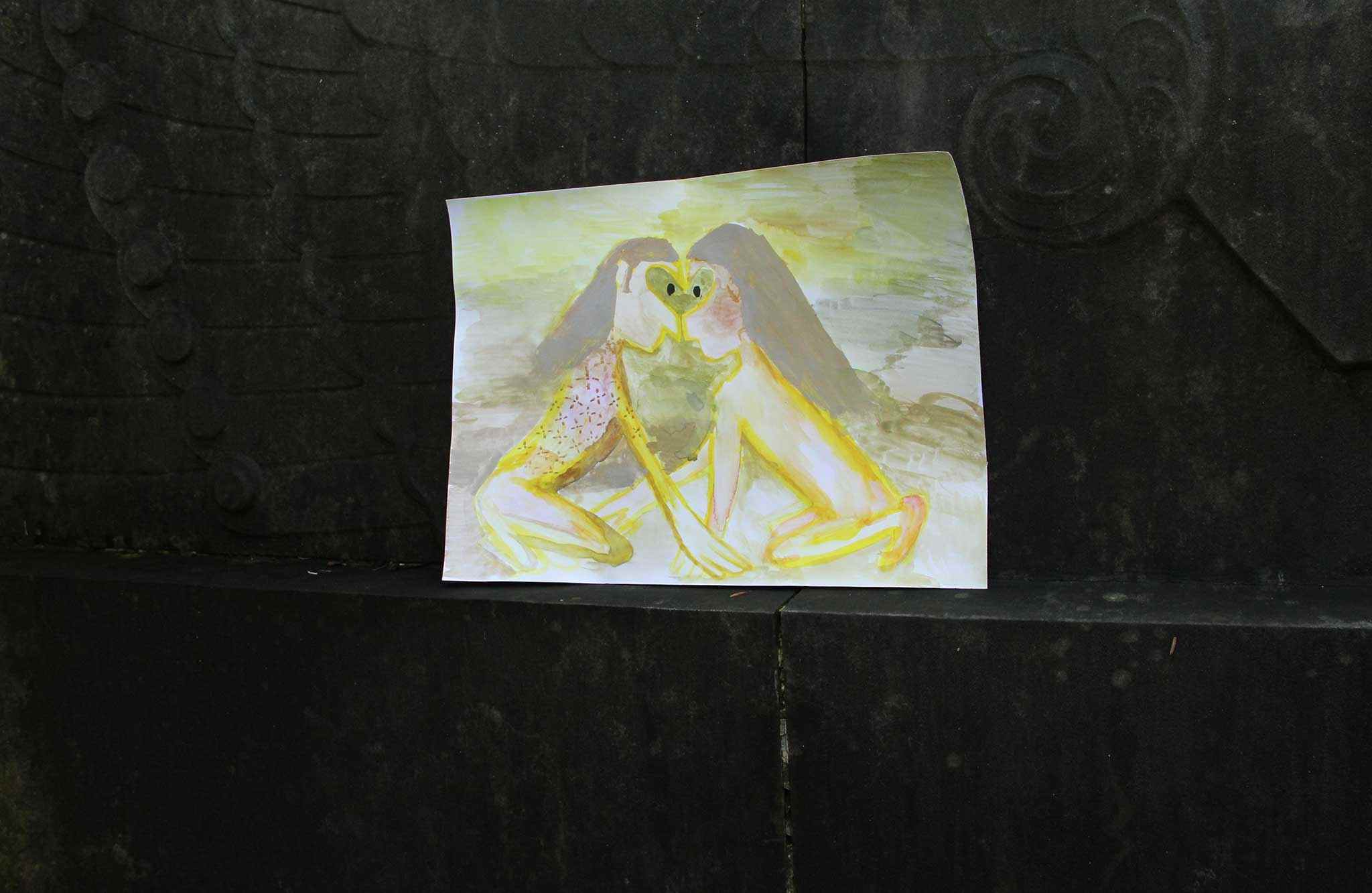 The backdrop of the cemetery allowed the artists to playfully engage with this beautiful heterogeneous space and let the drawings and the silent sculptures come into a full embrace. The drawings and the accompanying haiku that they wrote are letters to the angels and the realm of the dead.