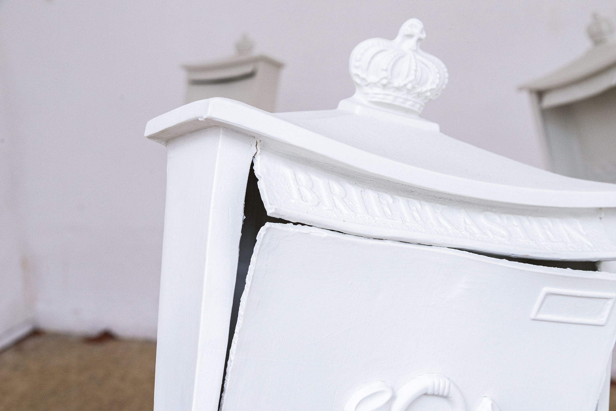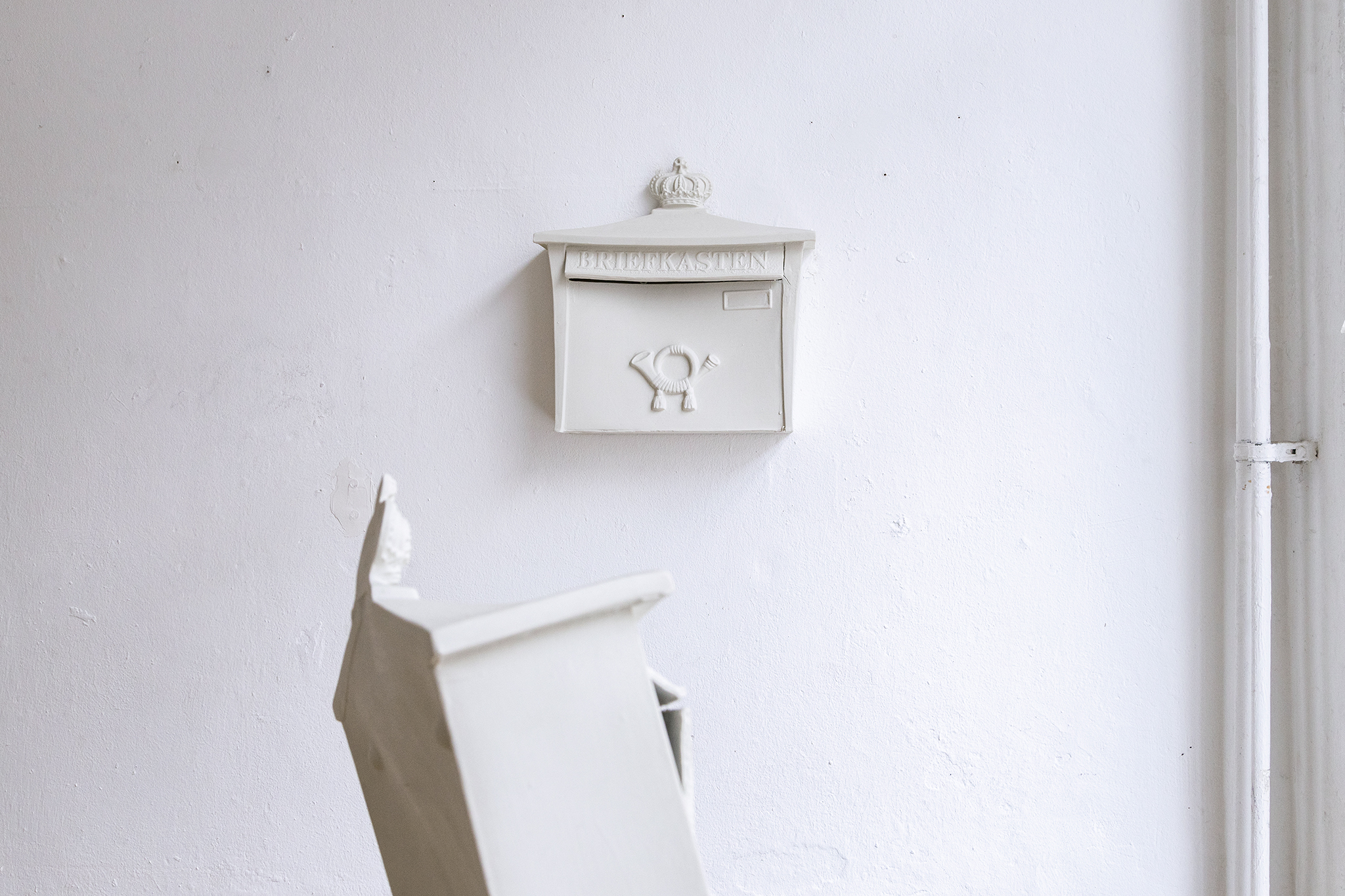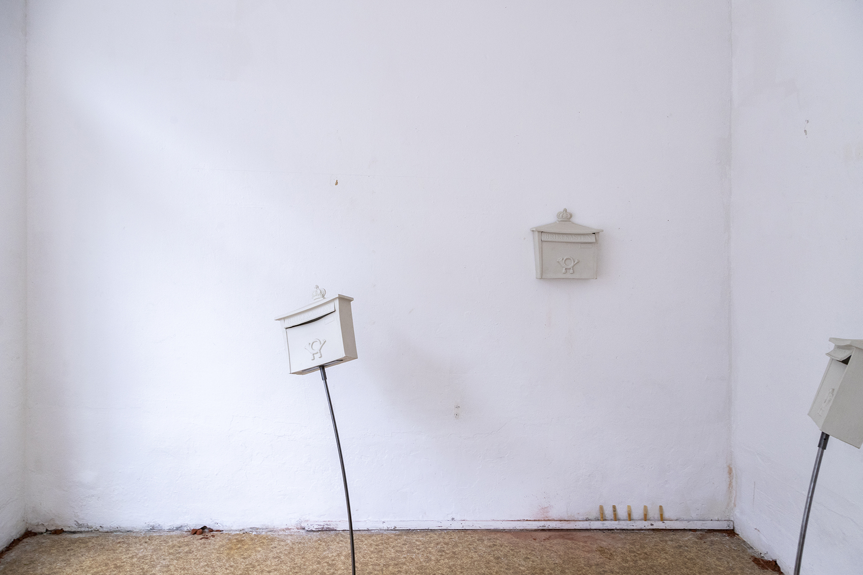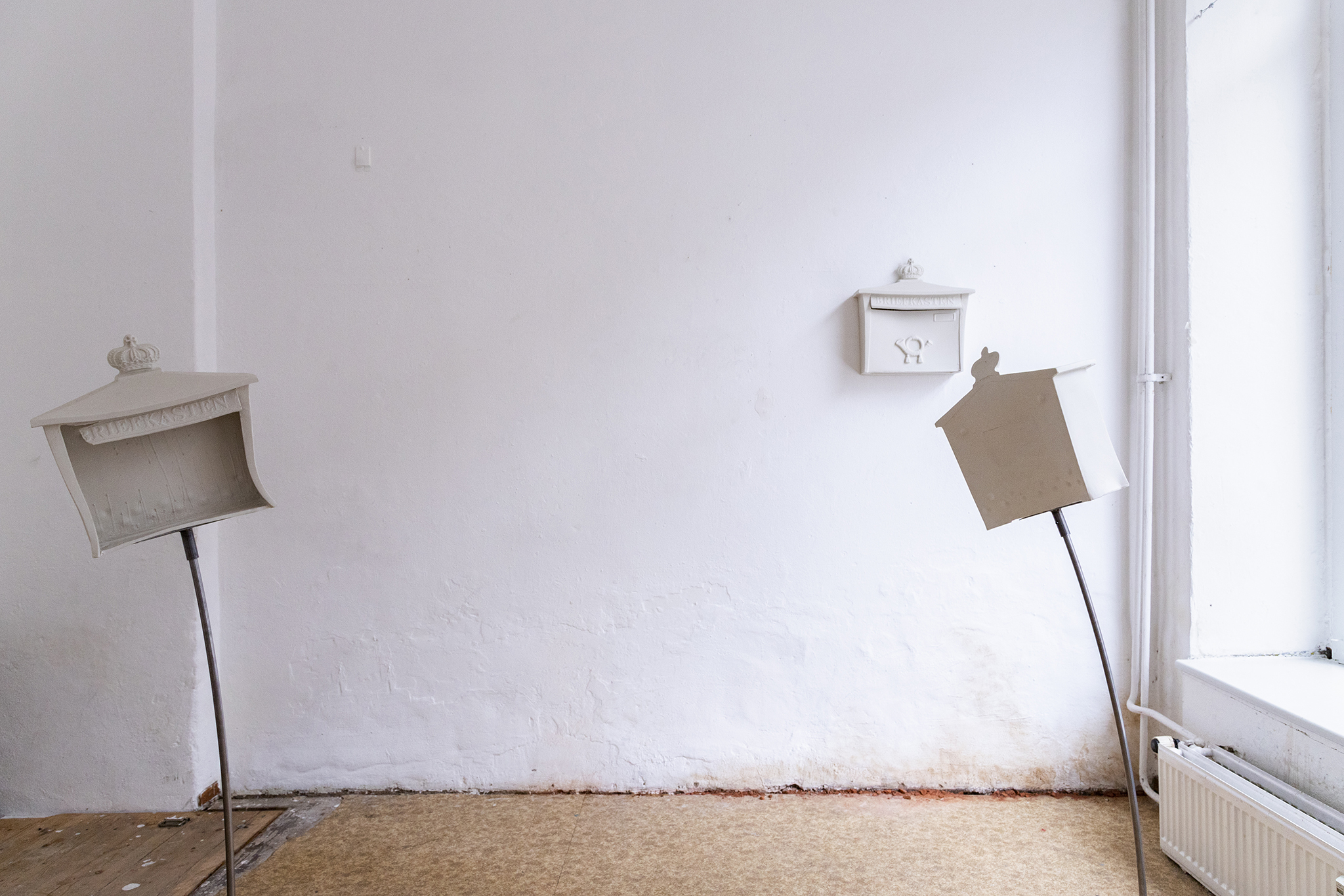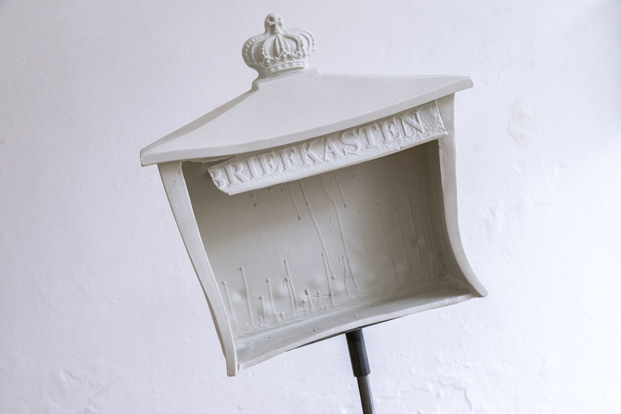 The audio installation consists of six letterboxes cast from porcelain. Four of them are fixed on steel stands, two hang on the wall. Four audio boxes are hidden in the respective boxes. Each audio track is played by an instrument and together they form an orchestra, a partly consonant, partly dissonant musical composition. The porcelain objects are in conversation with one another: They speak a language that remains a mystery to the viewer/listener. Due to the high firing the porcelain form is deformed, some of the boxes have opened or are cracked. Some look as if as if they had exploded: the inserted information already escaped. They hang crookedly on one side and swing slightly, hardly noticeably back and forth. The theme of the work is disturbed communication, not being able to reach an understanding. The helplessness before the limitation of language. When what is said arrives in a different form than one had hoped for. About misunderstandings and the loneliness of the outsider.