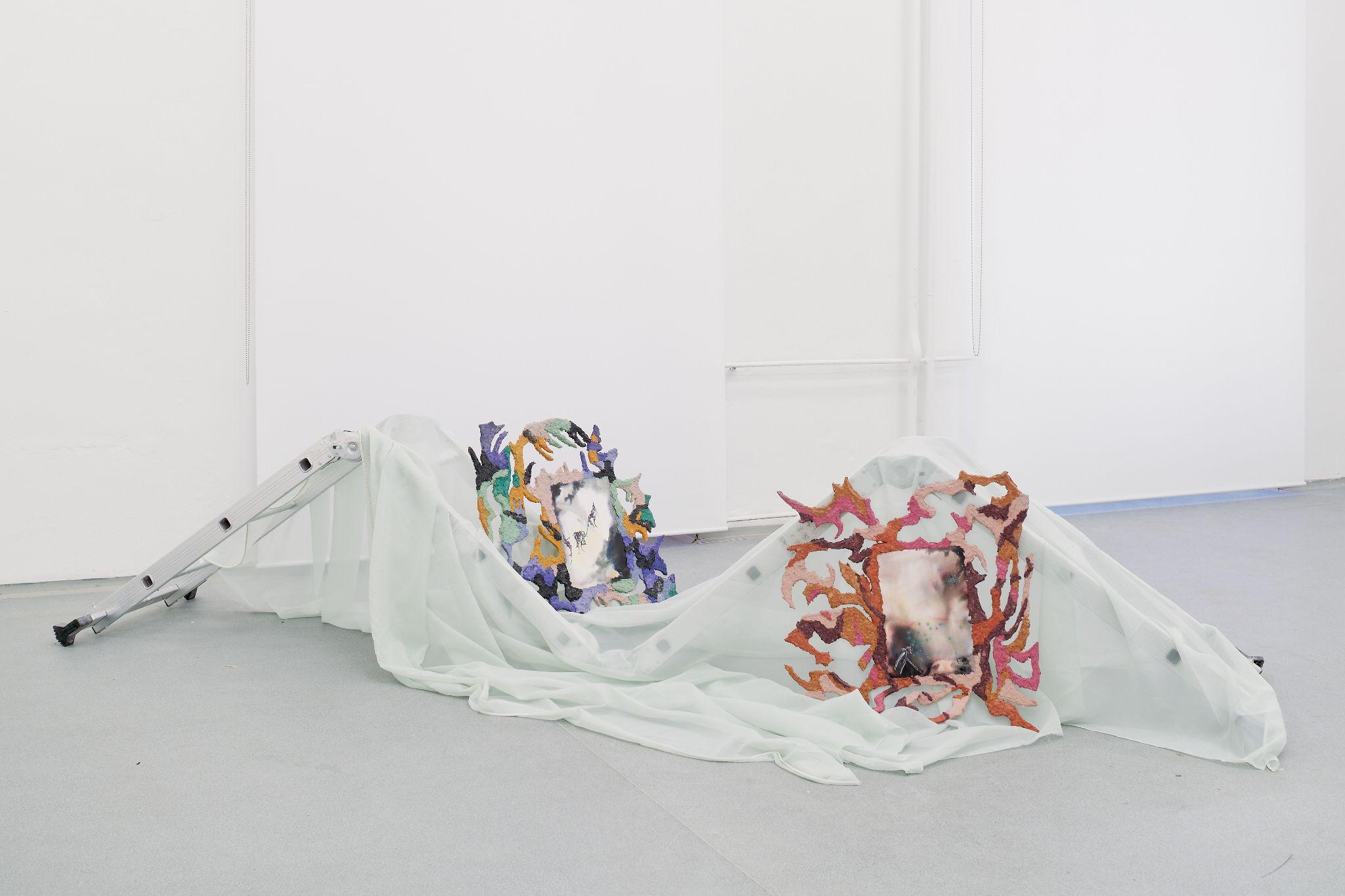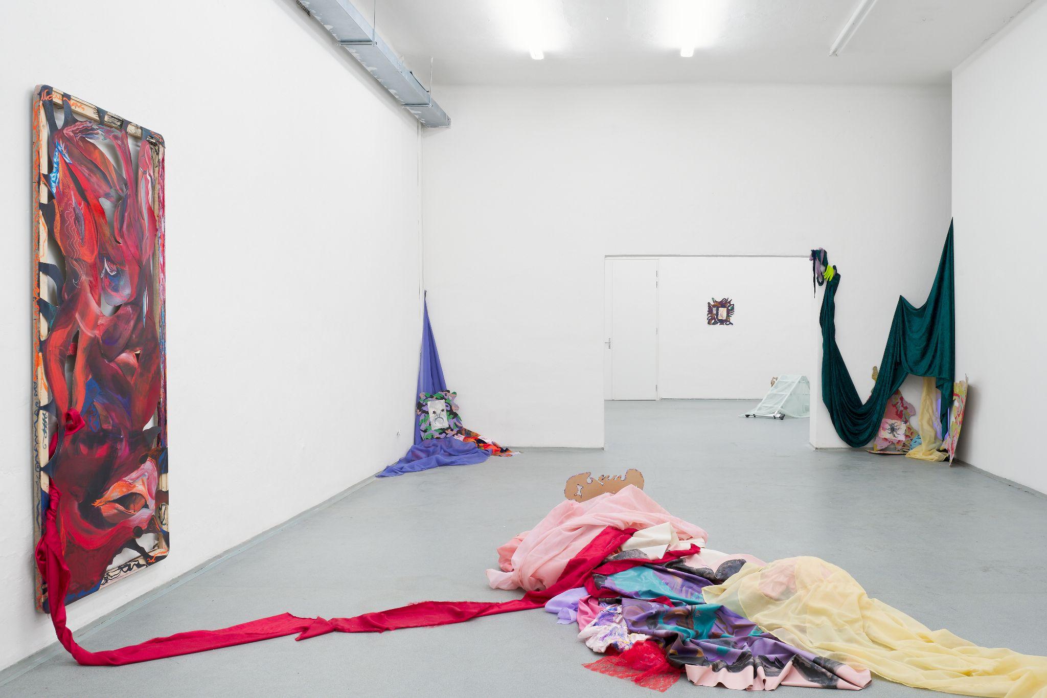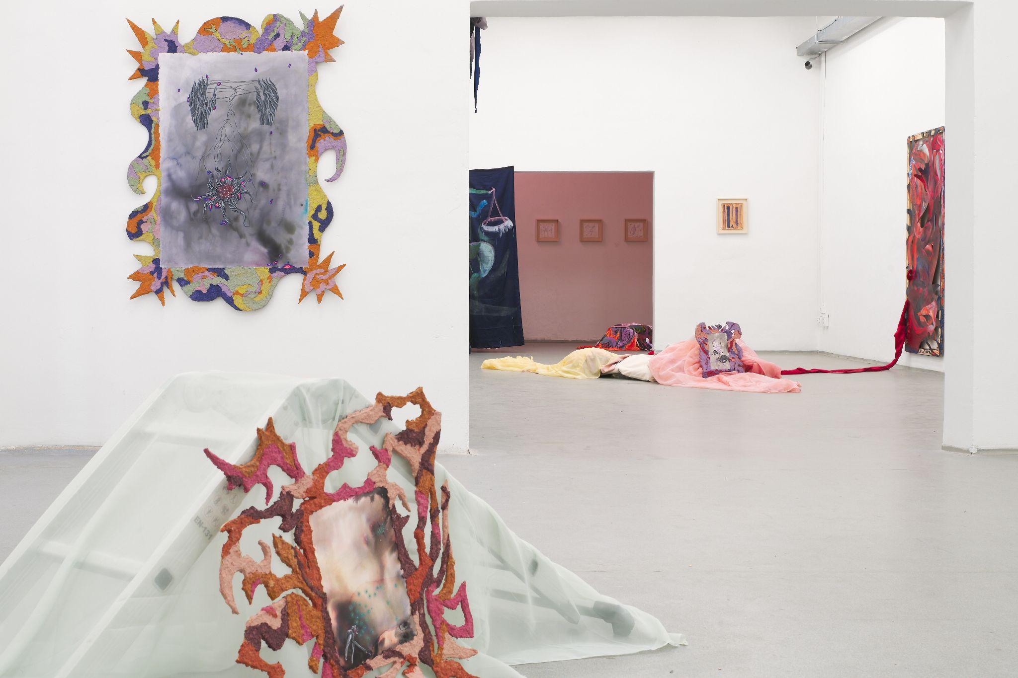 The joint exhibition by Denisa Štefanigová and Asztrid Csatlós is an impressive scenography for two players. Although in daily life, exactly like Fleabag, they feel the pressure of society judging their love life or their capacity for empathy, and in the exhibition, they also allows the viewers in, behind the imaginary fourth wall, they got rid of the manipulative feeling of wrongdoing. Their thematic straddling between consuming sensuous desire and yearning for freedom interconnect textiles as a procedural means of liberation - frivolously colored remnants of a boudoir robe on one side, and no longer necessary sleeping bag, faded by running for safety, on the other. For both authors, fabric and garment serve as a memory of the night predator, which still remains warm. In her painterly expressive figurations, full of tender details, personified animals and instructive titles, Denisa confesses out of a desire for pleasure, which she wants to embrace and master without both societal and self-reproach. Her installation with drawings in the back room is an intimate dive into the corners of her own wildness and fragility, which she may be publicly exhibiting for the very first time, as well as the concerned drawings. Asztrid regularly walks along the road a short distance from her home, where she finds traces of the night before - a pile of dirty jackets, a piece of tent, sometimes it is a shoe. The route between the fields has been a refugee route towards the West since 2015. She uses these ready made installations as natural habitats for her sensitive watercolors, impressively framed in papier maché. We are used to perceive refugees with empathy and we usually feel a kind of superior necessity to help them. From her position of a direct observer of the traces of the night run, during which they "devour" the given resources and leave the remnants behind, Asztrid emanicipates them effectively and hands them their own power and real human characteristics.