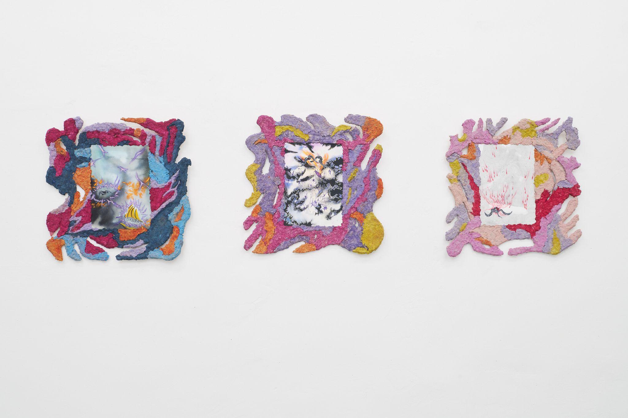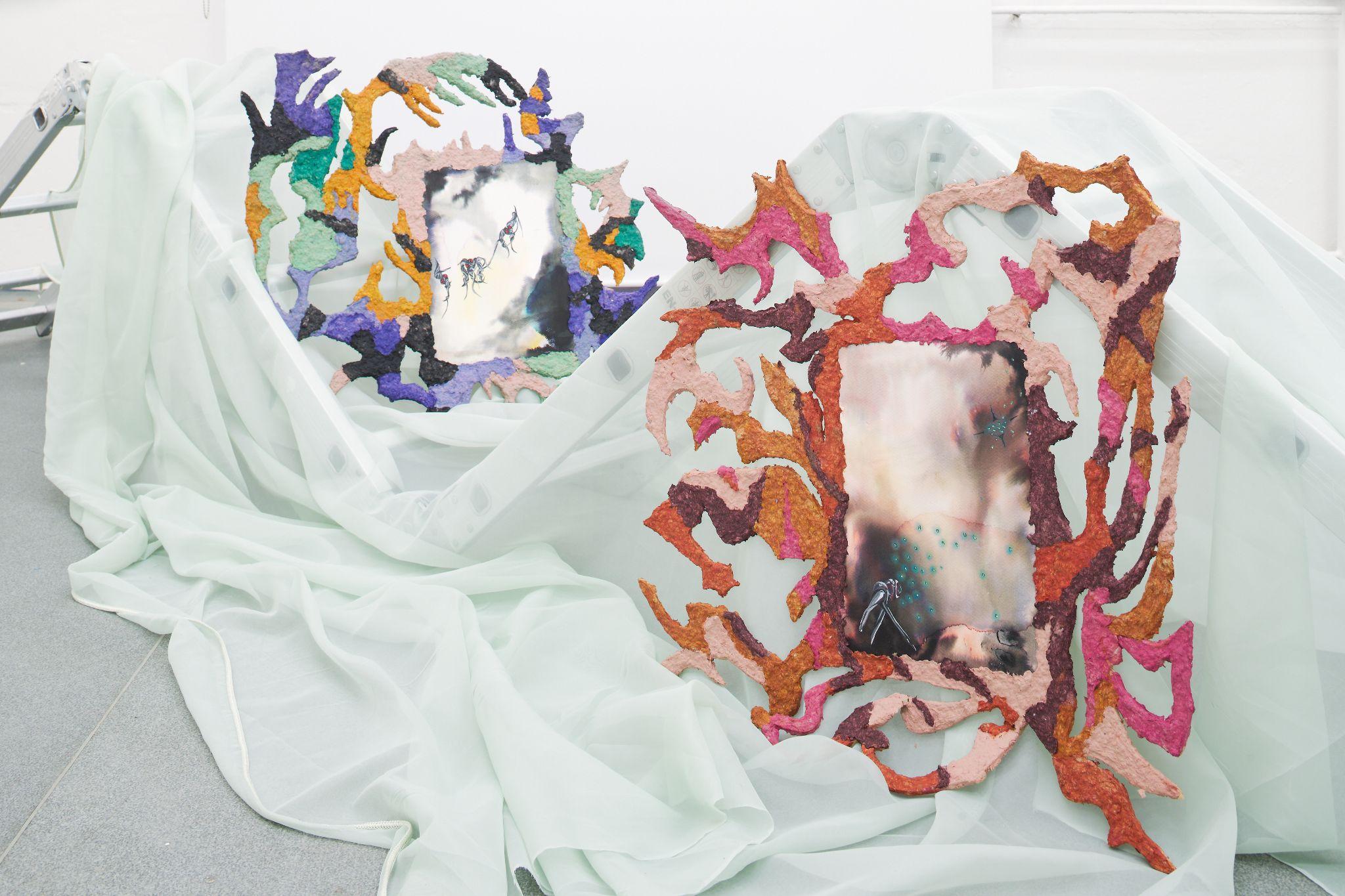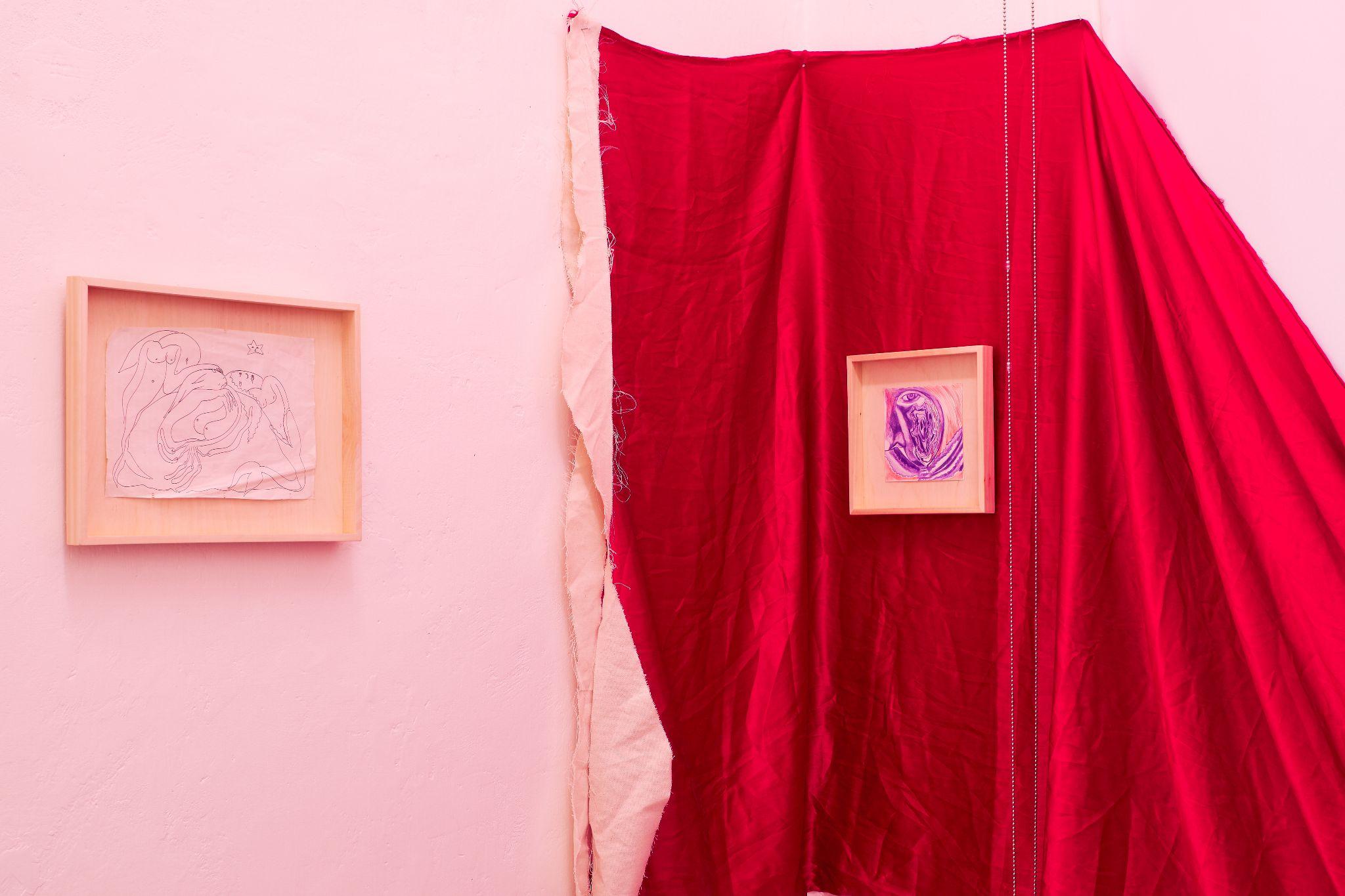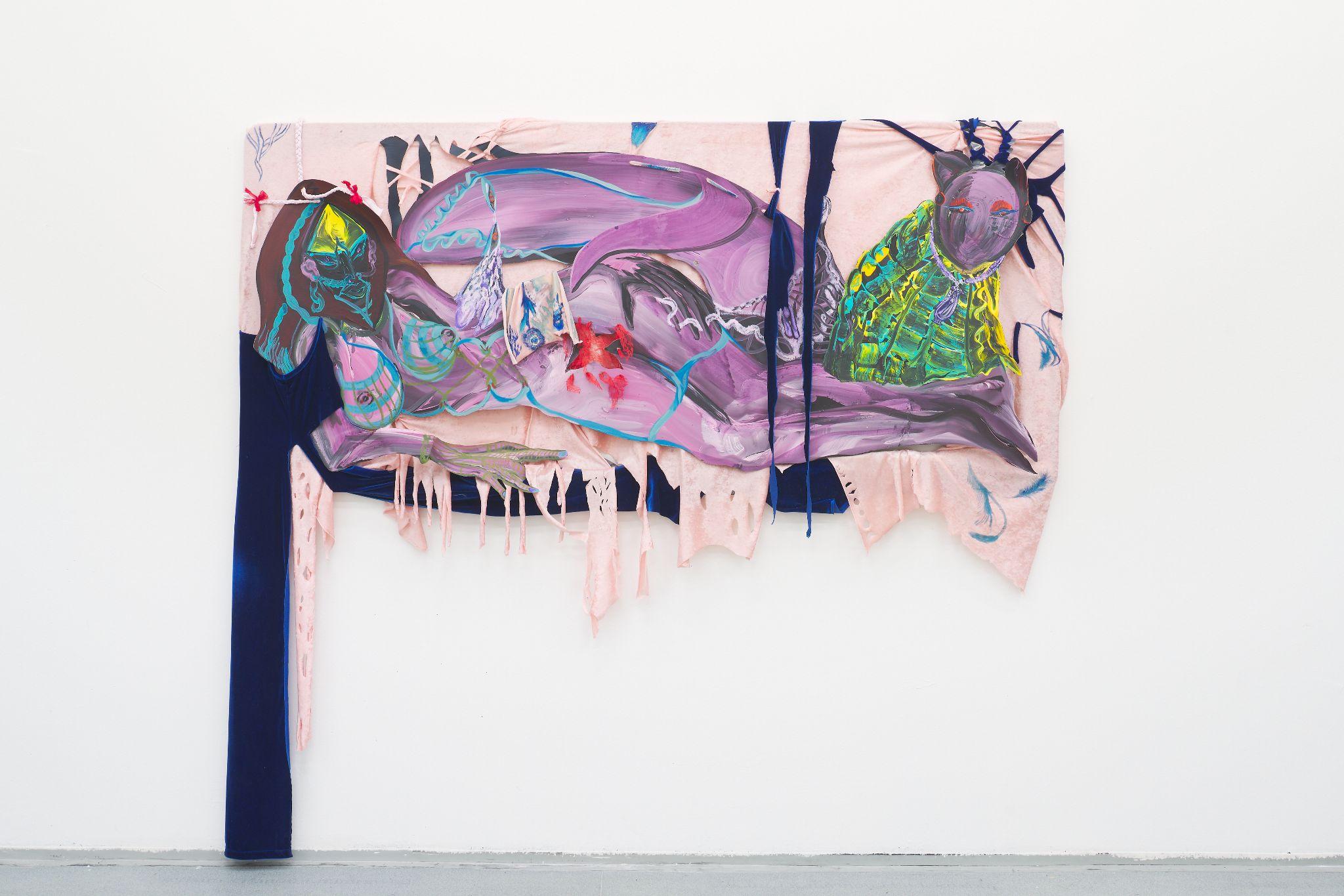 The joint exhibition by Denisa Štefanigová and Asztrid Csatlós is an impressive scenography for two players. Although in daily life, exactly like Fleabag, they feel the pressure of society judging their love life or their capacity for empathy, and in the exhibition, they also allows the viewers in, behind the imaginary fourth wall, they got rid of the manipulative feeling of wrongdoing. Their thematic straddling between consuming sensuous desire and yearning for freedom interconnect textiles as a procedural means of liberation - frivolously colored remnants of a boudoir robe on one side, and no longer necessary sleeping bag, faded by running for safety, on the other. For both authors, fabric and garment serve as a memory of the night predator, which still remains warm. In her painterly expressive figurations, full of tender details, personified animals and instructive titles, Denisa confesses out of a desire for pleasure, which she wants to embrace and master without both societal and self-reproach. Her installation with drawings in the back room is an intimate dive into the corners of her own wildness and fragility, which she may be publicly exhibiting for the very first time, as well as the concerned drawings. Asztrid regularly walks along the road a short distance from her home, where she finds traces of the night before - a pile of dirty jackets, a piece of tent, sometimes it is a shoe. The route between the fields has been a refugee route towards the West since 2015. She uses these ready made installations as natural habitats for her sensitive watercolors, impressively framed in papier maché. We are used to perceive refugees with empathy and we usually feel a kind of superior necessity to help them. From her position of a direct observer of the traces of the night run, during which they "devour" the given resources and leave the remnants behind, Asztrid emanicipates them effectively and hands them their own power and real human characteristics.
