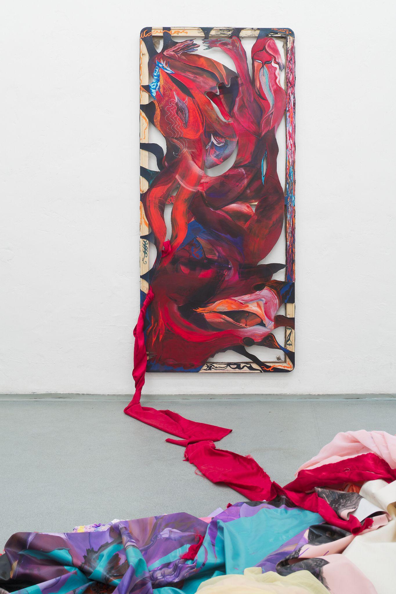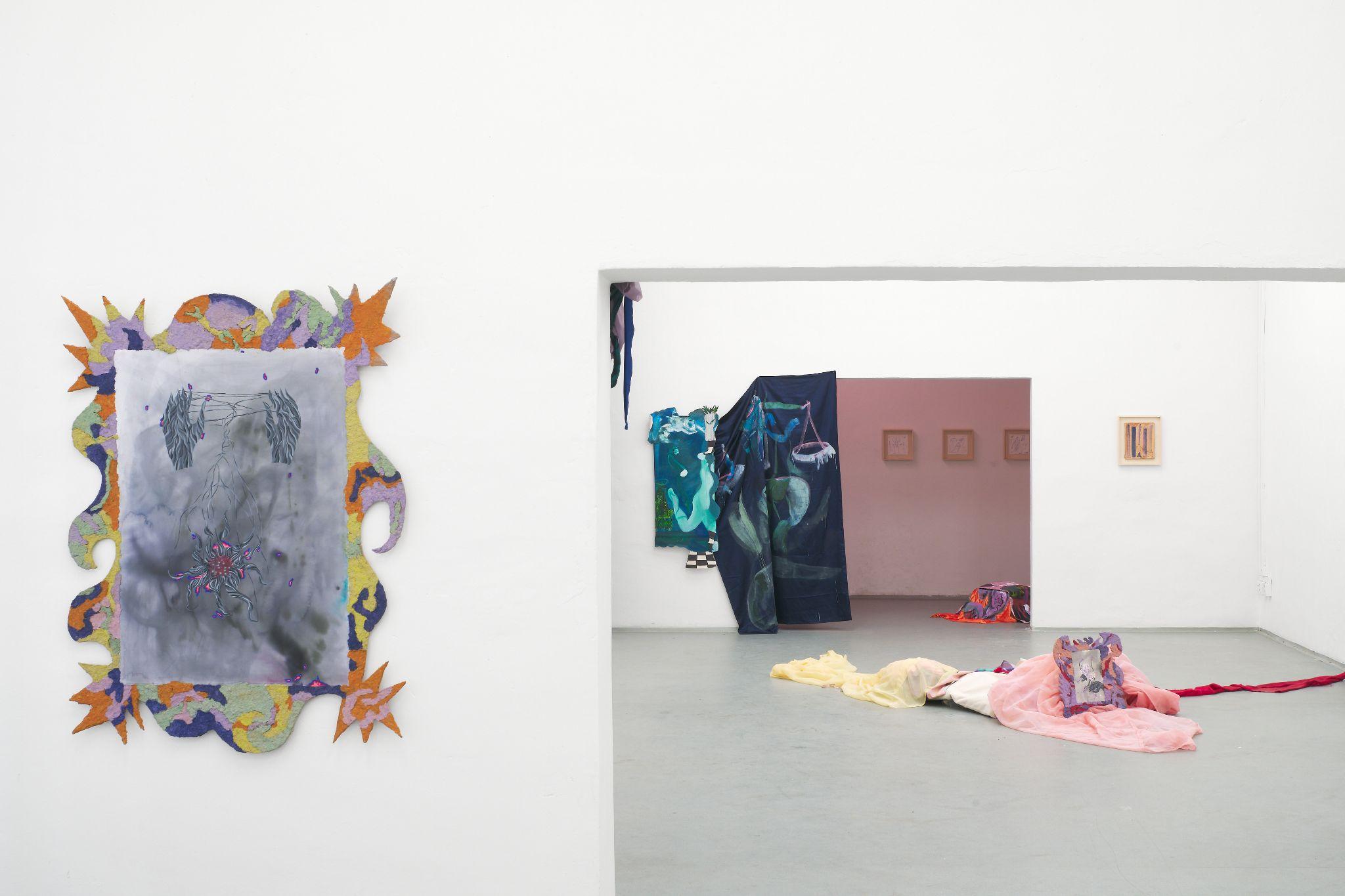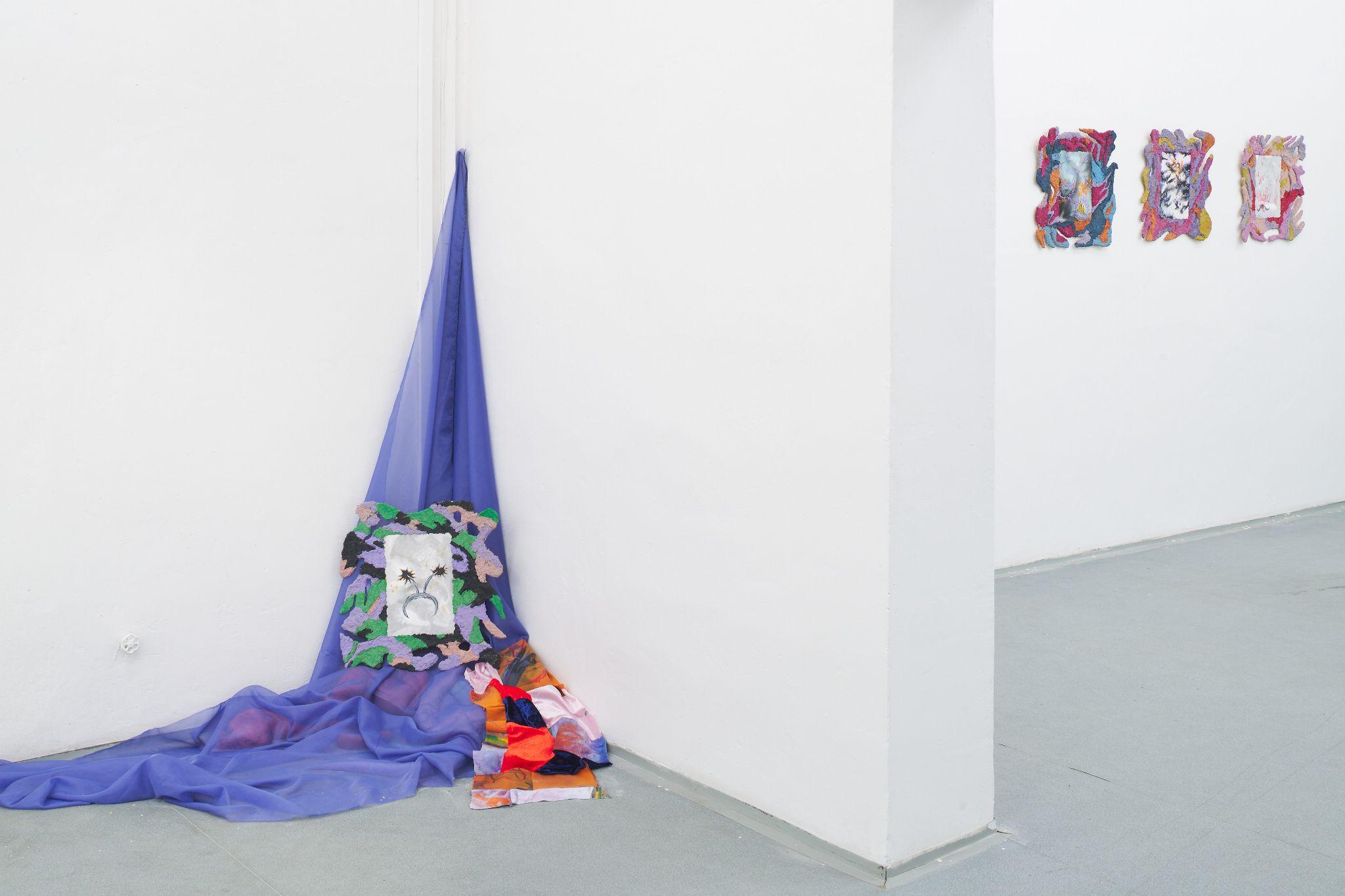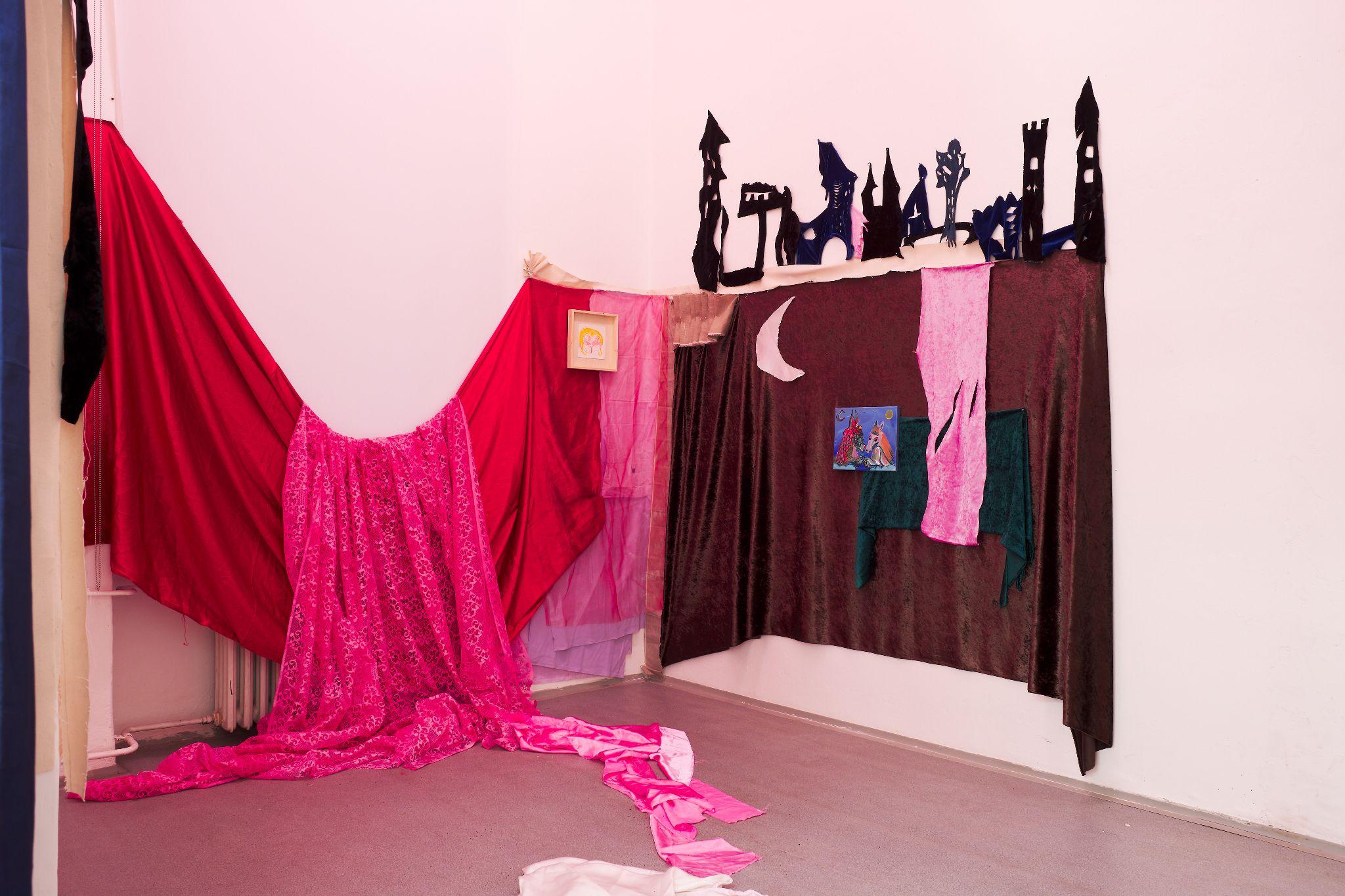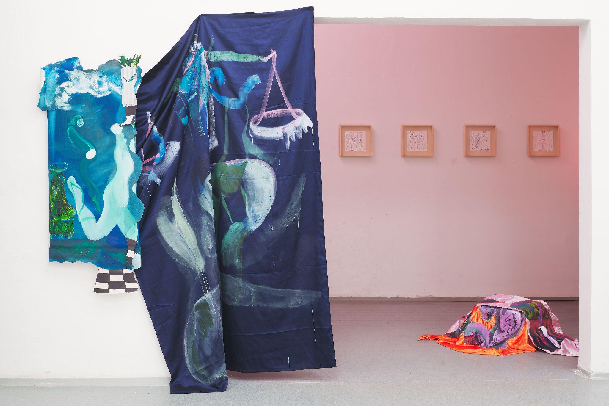 The exhibition Tools of Liberation represents a decorated room of a fortune-teller, where the symbolism of mythological animals can be interpreted, weaknesses revealed, solace found for turbulent passions, but where you can also desperately wander in a dystopian battlefield littered with seductive shreds of unattainable freedom. The installation of the exhibition responds to the actual space division of the gallery - in side, smaller rooms, each author is devoted to her own story and perception of the bodily imprint, while in the center largest room, the approaches of the two artists meet in a symptomatically passionate dialogue, in which even paintings and framed watercolours become organic material. Pieces of fabric somewhere imitate the material situation near the refugee route, elsewhere as if it was a smooth piece of clothing which slipped from a body to the ground, recalling the wild night in the morning. Above all, the fabrics together form a common, imaginative and amoebic body that does not succumb to any external demands.