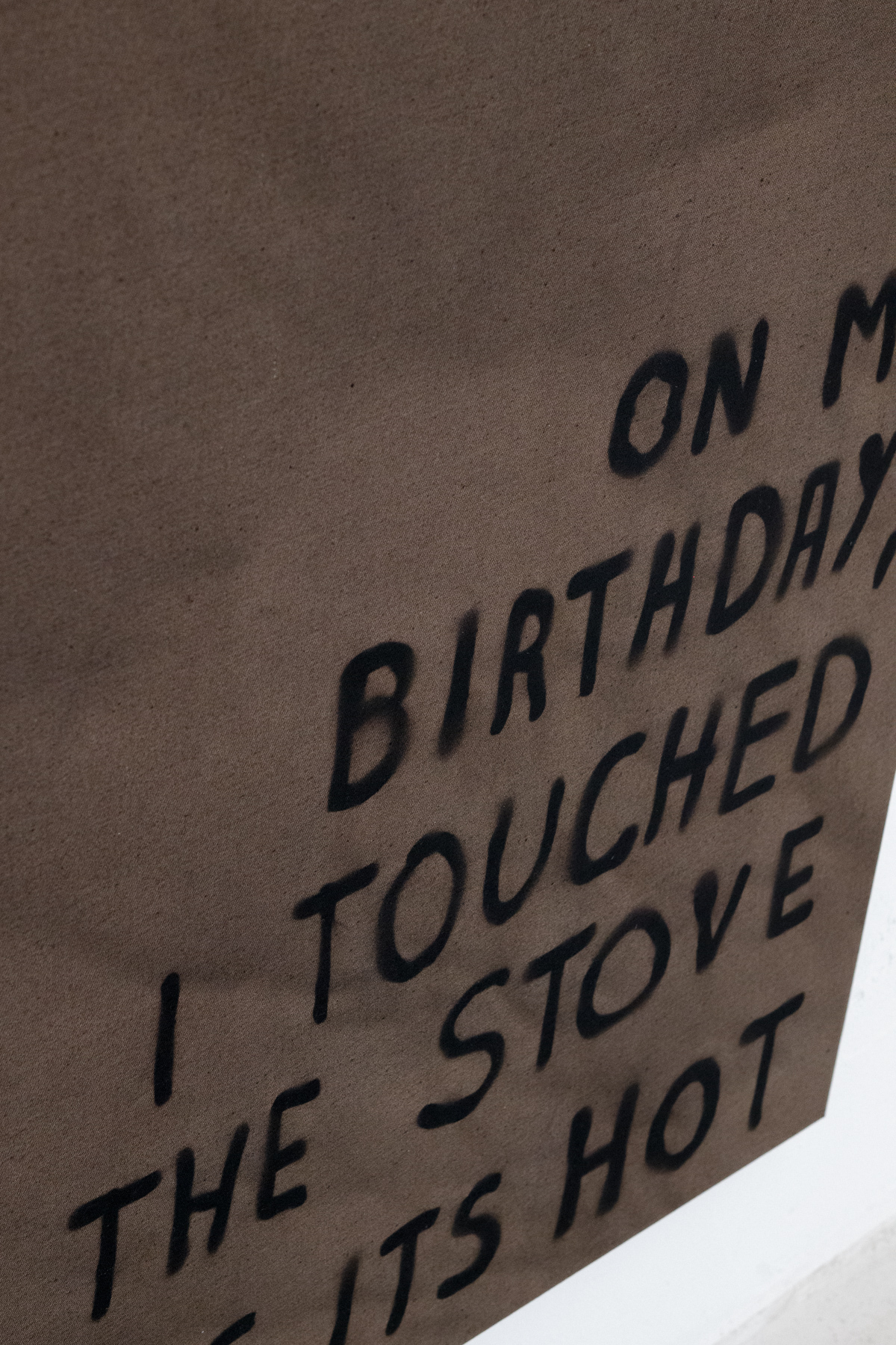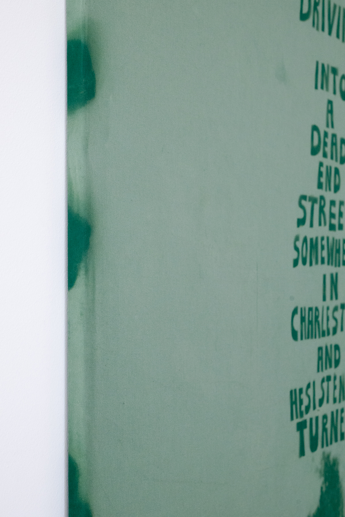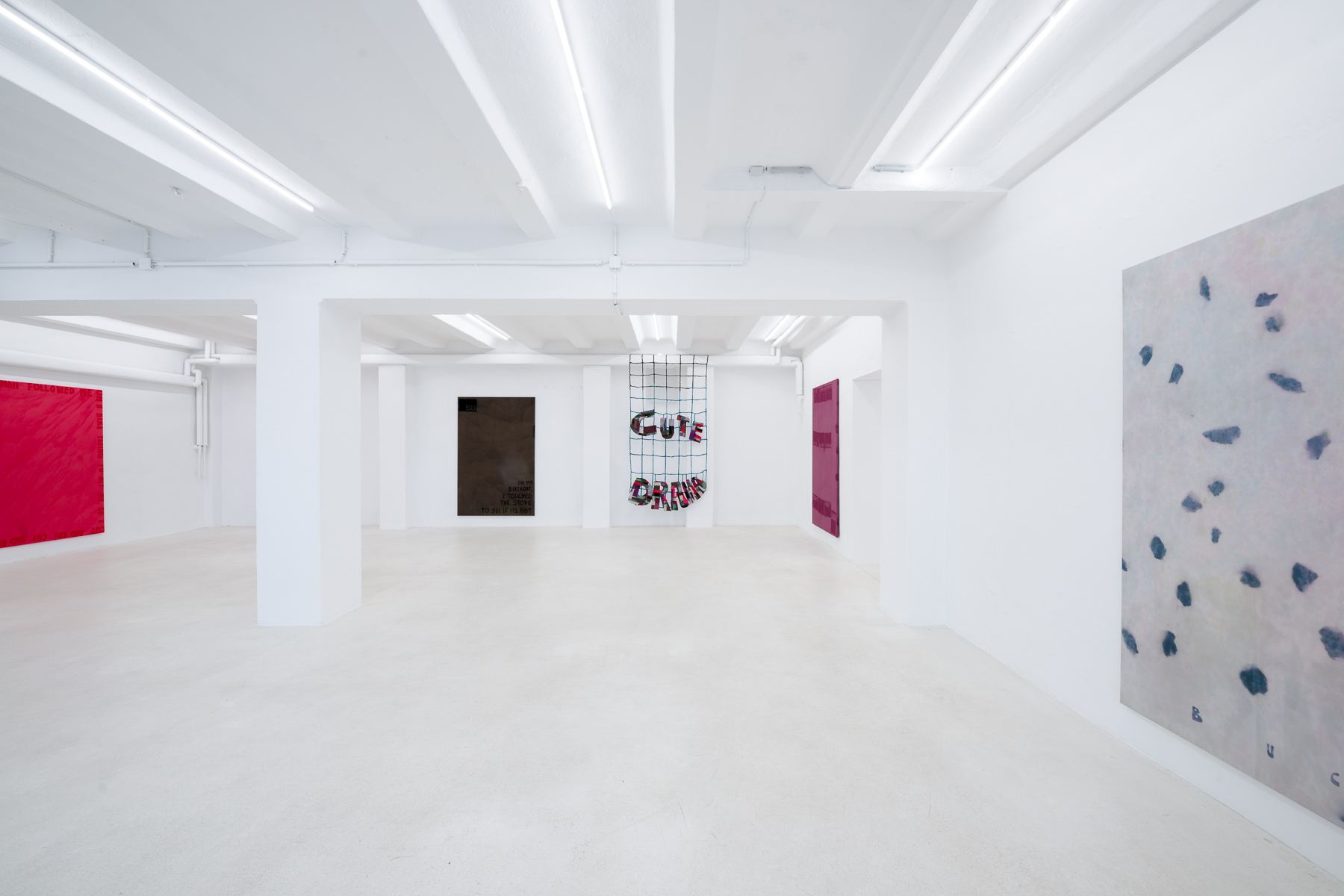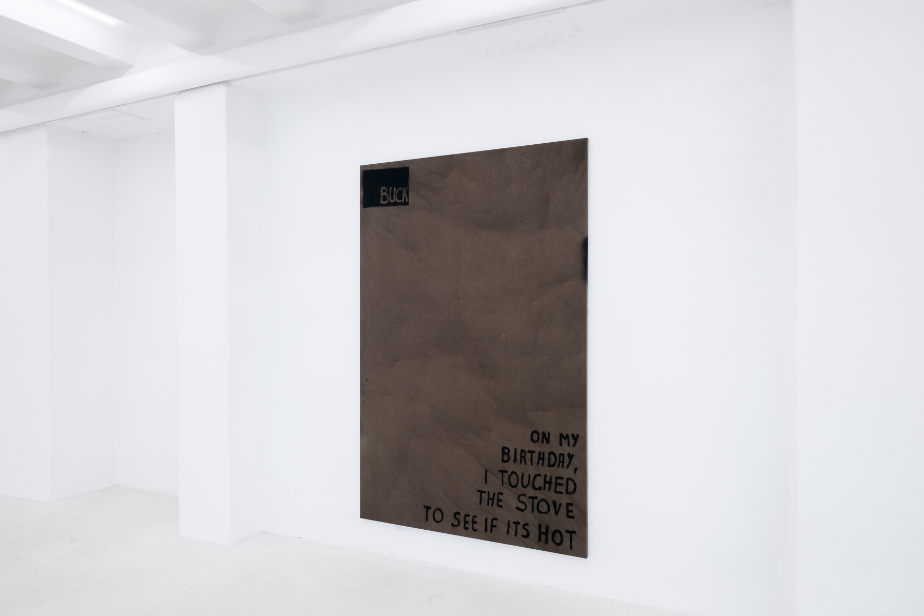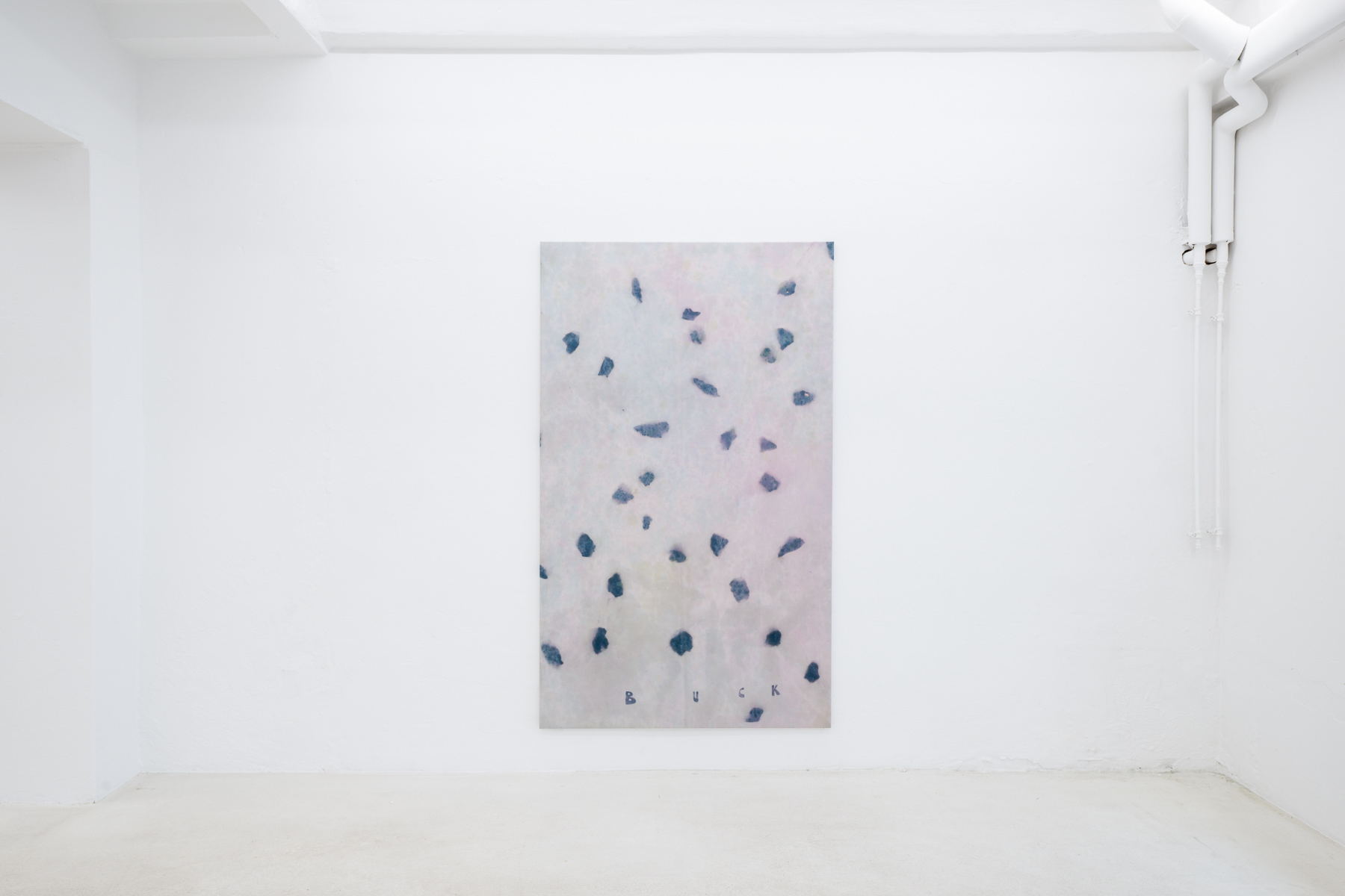 Typography and text play a significant role in Buckâs work and are explored as artistic elements. This idea stemmed from his previous works, where Buck incorporated his name, studio address, and cell phone number into his images, which references the idea of an artist as a business. While his name continues to appear as a recurring element in his current work, Buck also utilises poetic phrases that adorn the canvases. These sentences serve as fragments of memories and moments from the artistâs life, inviting the viewer to revisit their own associations and memories.