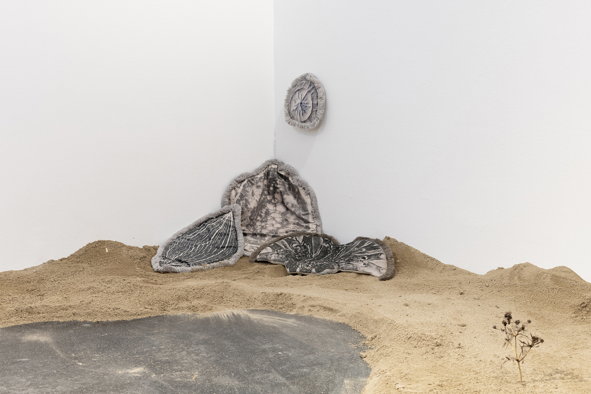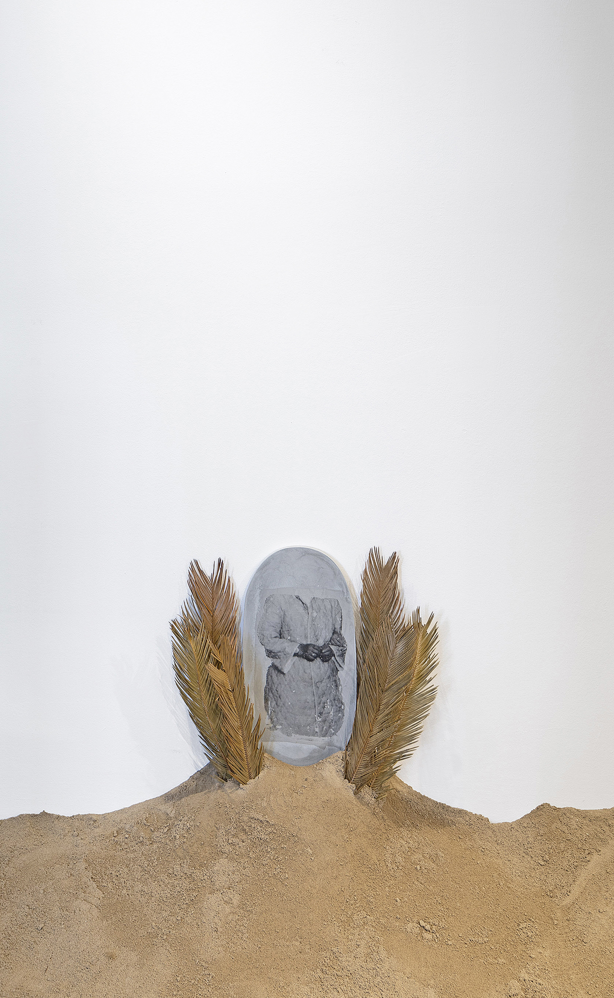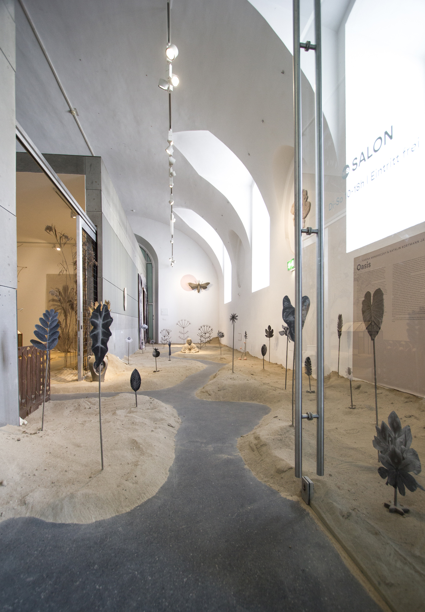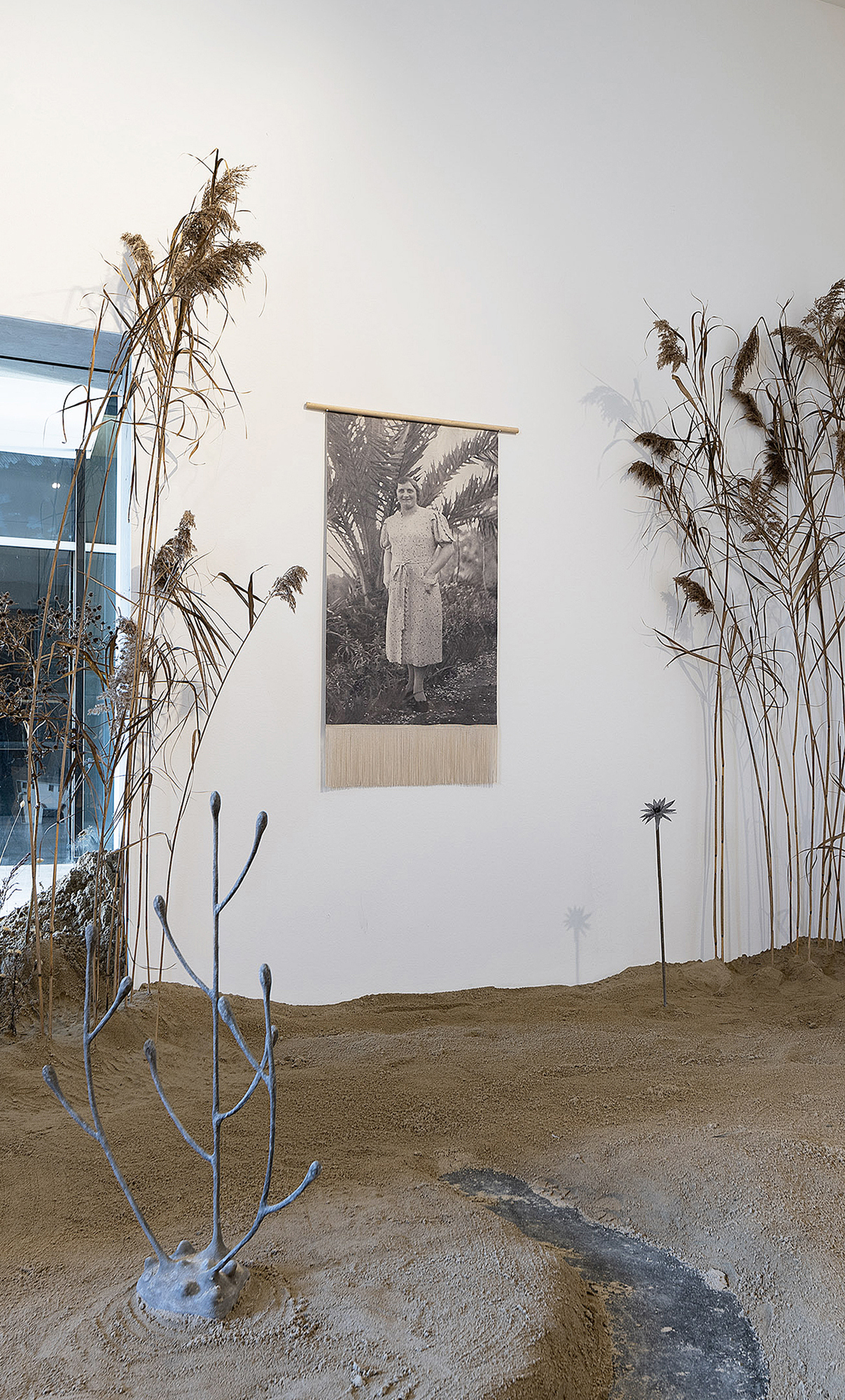 Oasis is a subtly composed, extensive installation of sculptures, photographs, printed textiles, and drawings that is supplemented with a sound component. In it, Mendreczky (*1988 in Budapest, Hungary) and Kortmann Járay (*1986 Budapest, Hungary) take up both spiritual narratives and personal family histories and translate them into unusual pictures and objects that seem alien and familiar to us at the same time. Besides set pieces from nature like shells and sand, the space is populated with hybrid creatures with human traits and plant characteristics or that represent a merging of animal and object. They are free interpretations of elements and motifs from old fairy tales and myths. There are also spiritual-religious symbols such as the pomegranate, date palms, or folded hands, as well as historical photographs from family albums in which a particular aura is inherent. Female figures are positioned in various places in the space and sustain the mystical scenery.