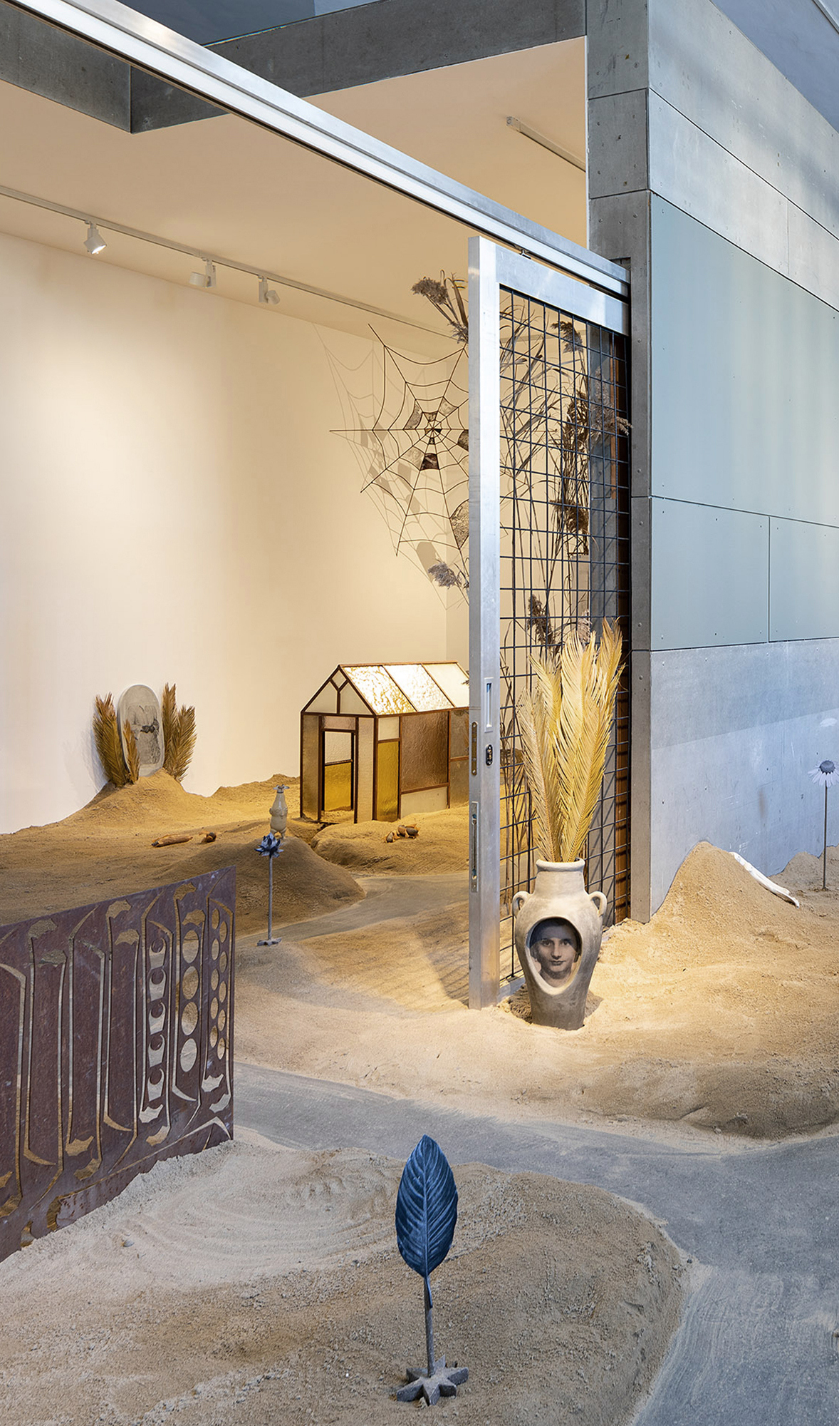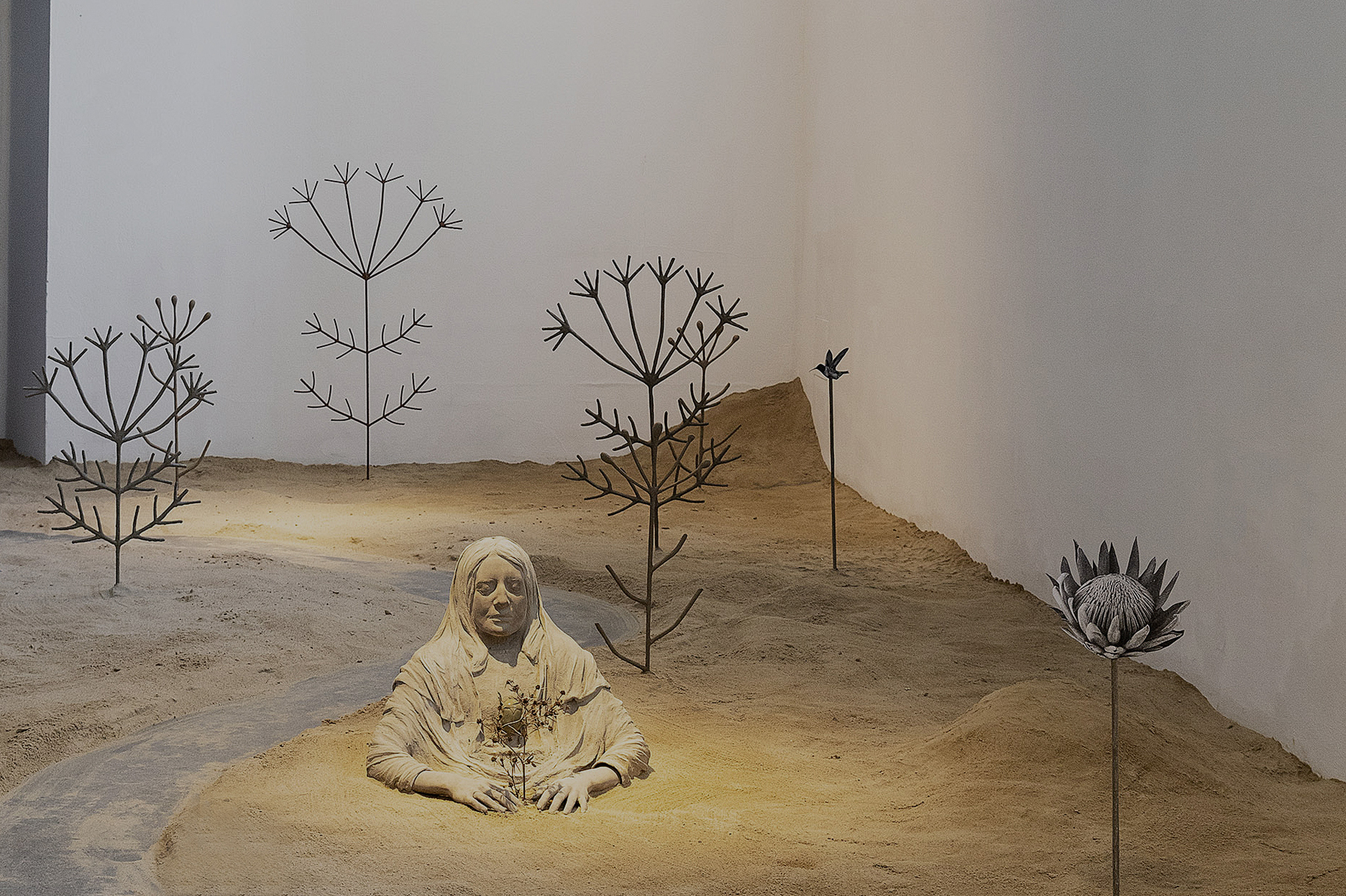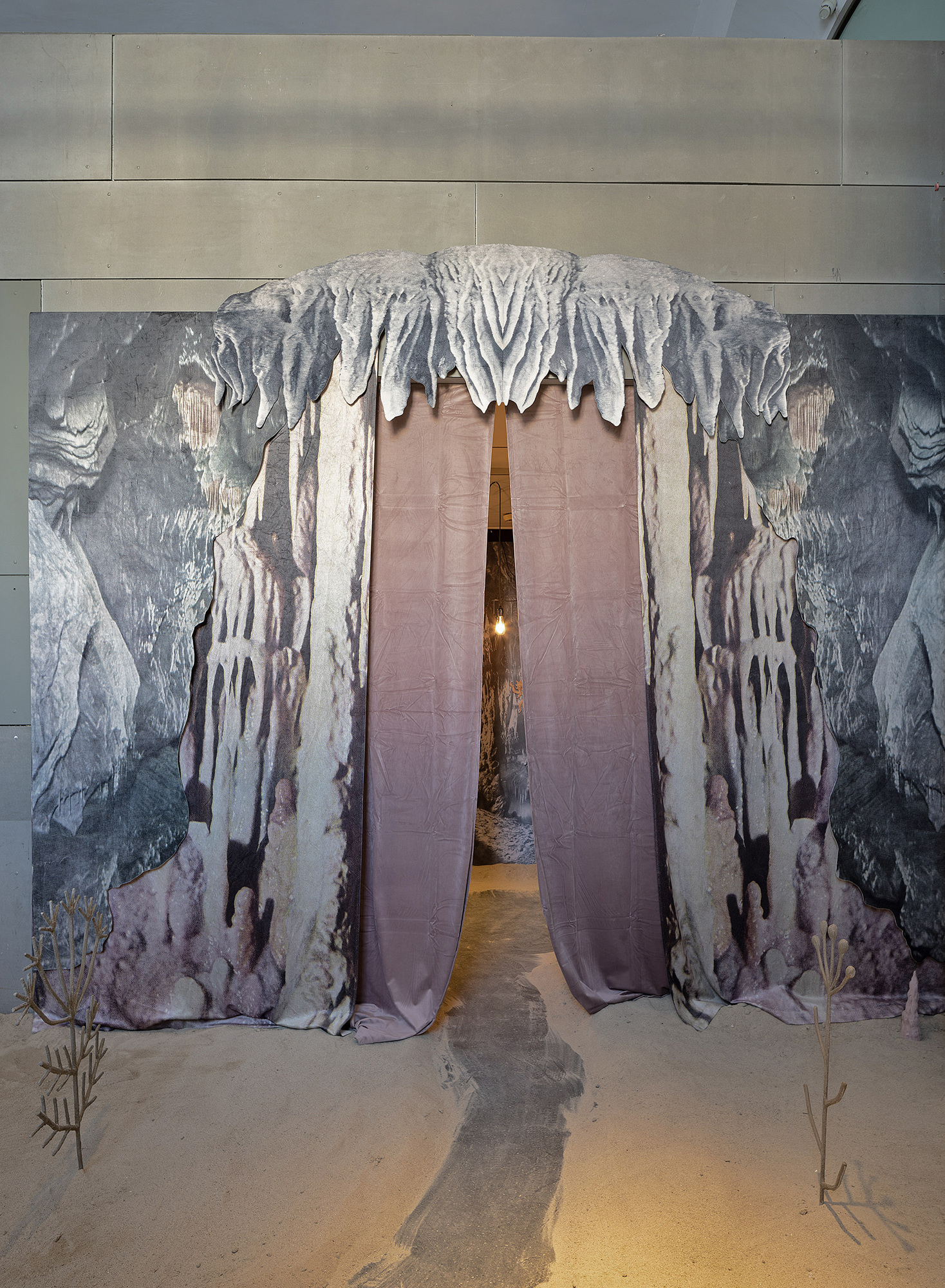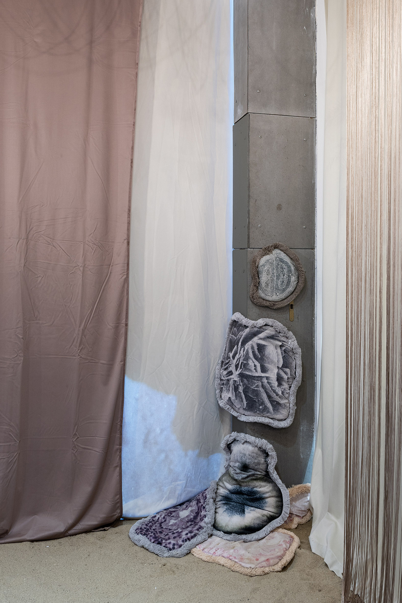 Oasis is a subtly composed, extensive installation of sculptures, photographs, printed textiles, and drawings that is supplemented with a sound component. In it, Mendreczky (*1988 in Budapest, Hungary) and Kortmann Járay (*1986 Budapest, Hungary) take up both spiritual narratives and personal family histories and translate them into unusual pictures and objects that seem alien and familiar to us at the same time. Besides set pieces from nature like shells and sand, the space is populated with hybrid creatures with human traits and plant characteristics or that represent a merging of animal and object. They are free interpretations of elements and motifs from old fairy tales and myths. There are also spiritual-religious symbols such as the pomegranate, date palms, or folded hands, as well as historical photographs from family albums in which a particular aura is inherent. Female figures are positioned in various places in the space and sustain the mystical scenery.
