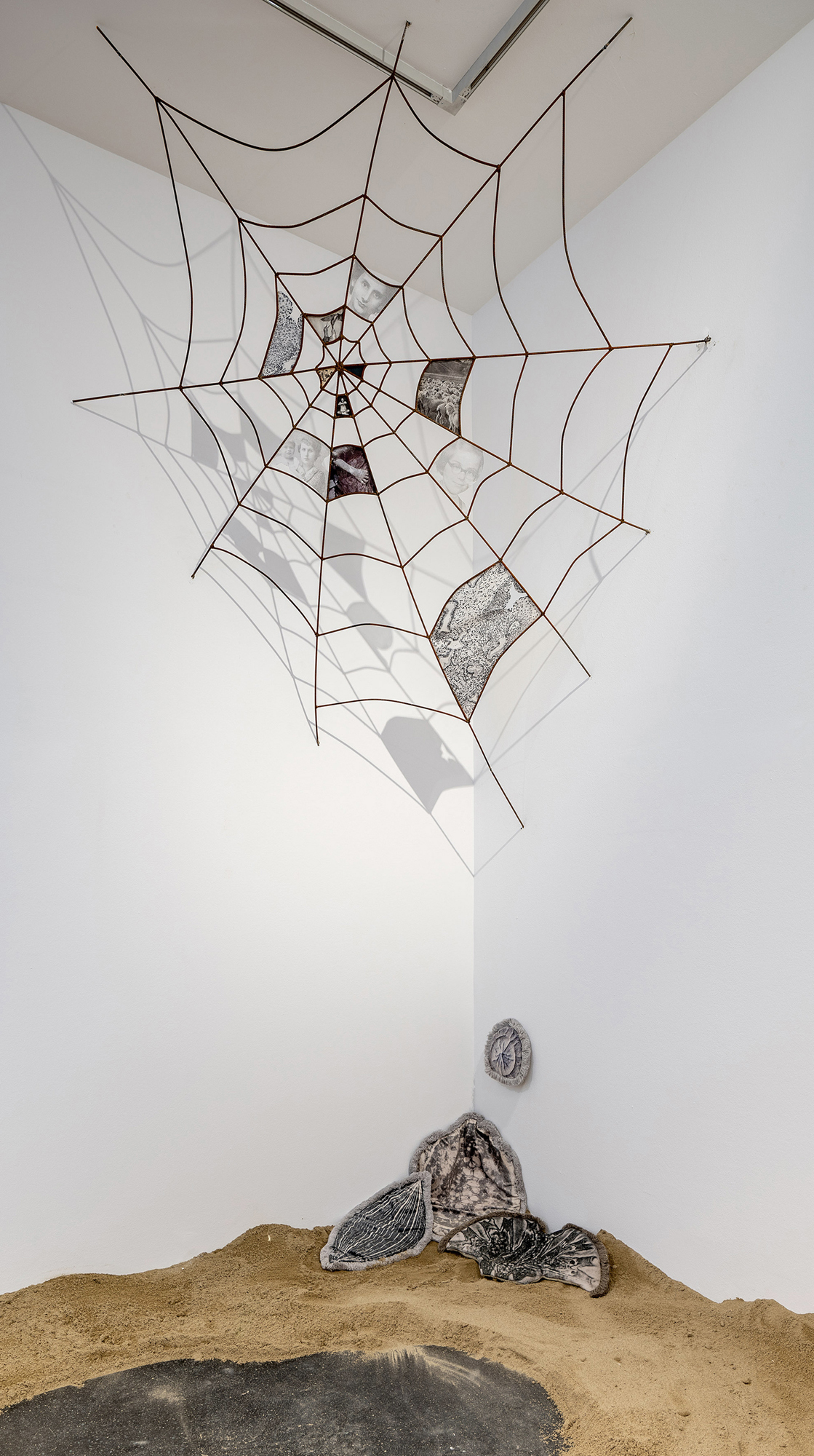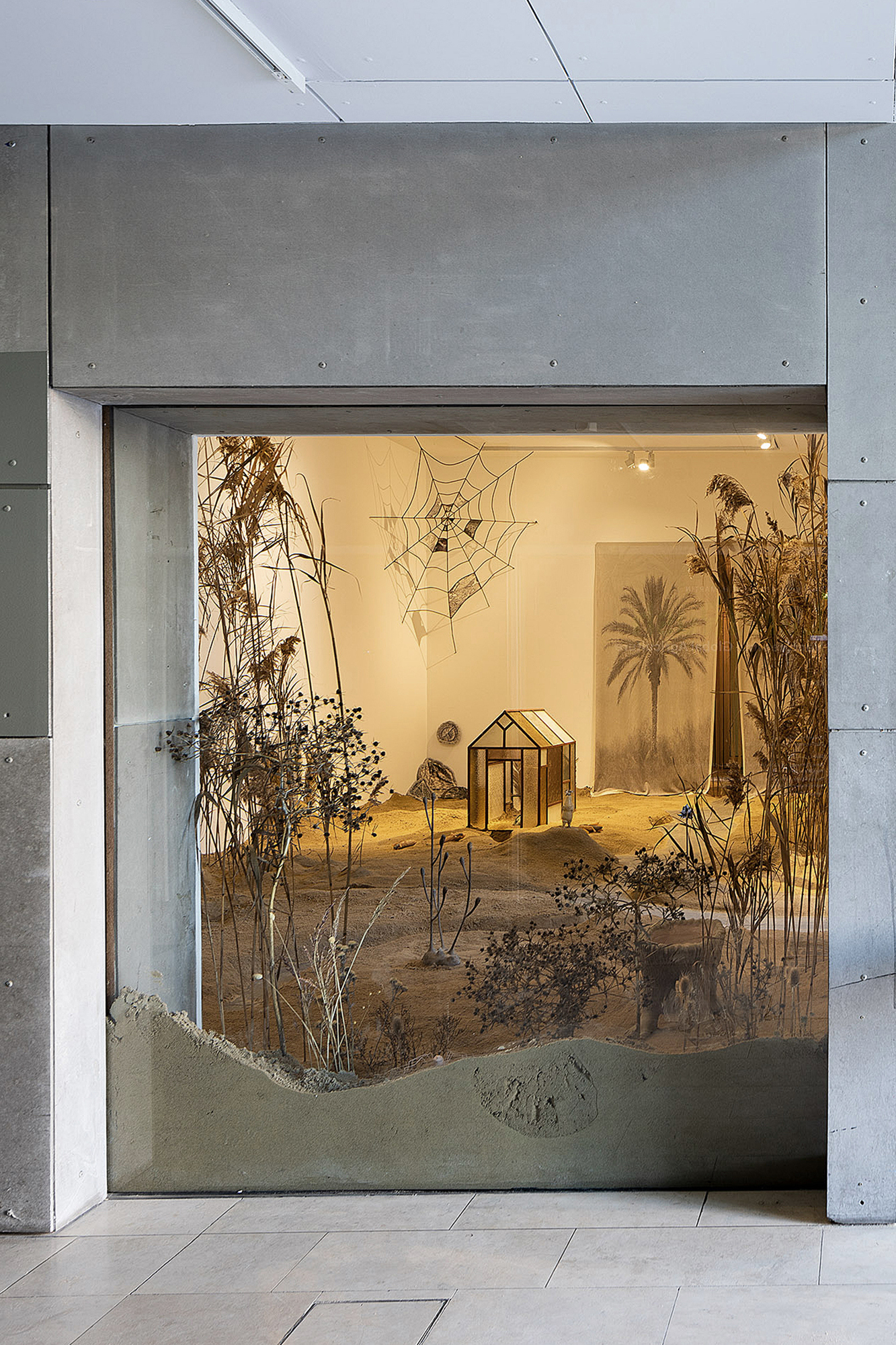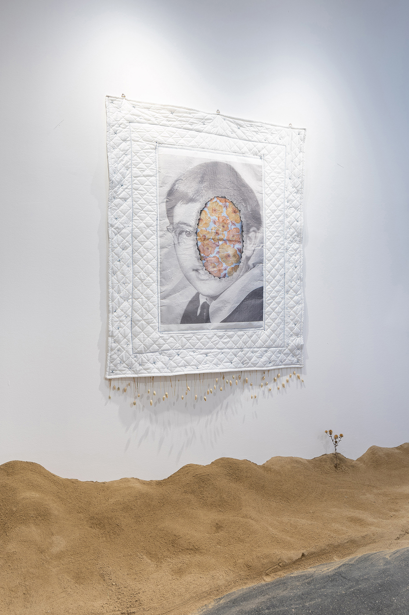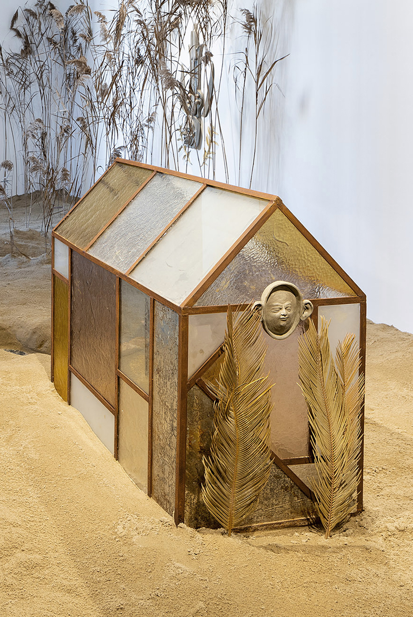 Oasis is a subtly composed, extensive installation of sculptures, photographs, printed textiles, and drawings that is supplemented with a sound component. In it, Mendreczky (*1988 in Budapest, Hungary) and Kortmann Járay (*1986 Budapest, Hungary) take up both spiritual narratives and personal family histories and translate them into unusual pictures and objects that seem alien and familiar to us at the same time. Besides set pieces from nature like shells and sand, the space is populated with hybrid creatures with human traits and plant characteristics or that represent a merging of animal and object. They are free interpretations of elements and motifs from old fairy tales and myths. There are also spiritual-religious symbols such as the pomegranate, date palms, or folded hands, as well as historical photographs from family albums in which a particular aura is inherent. Female figures are positioned in various places in the space and sustain the mystical scenery.