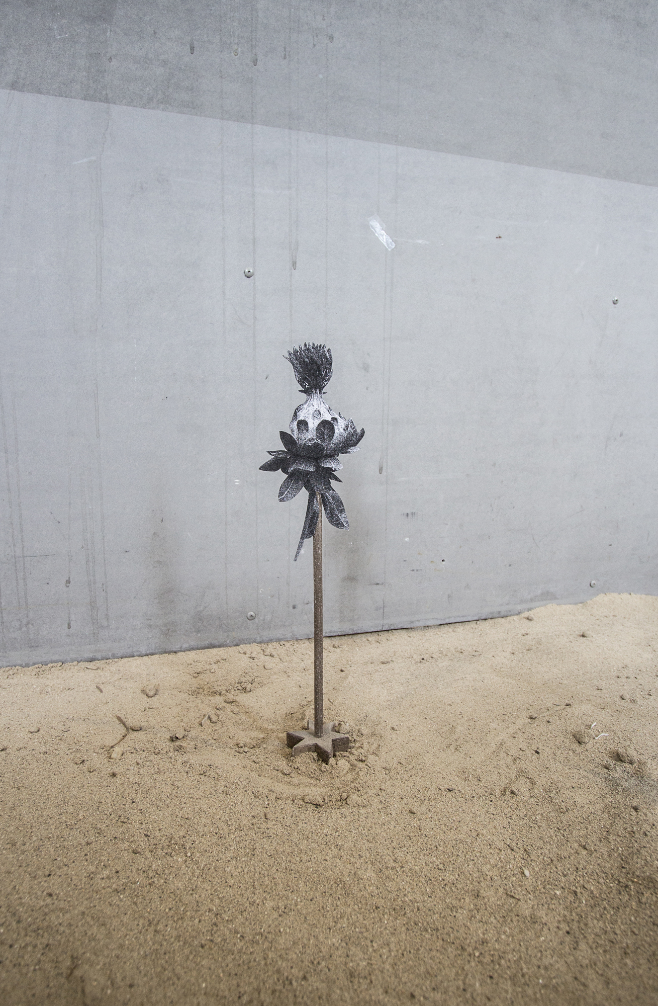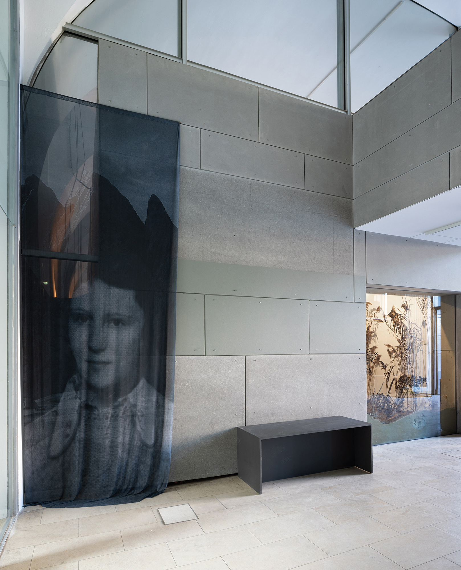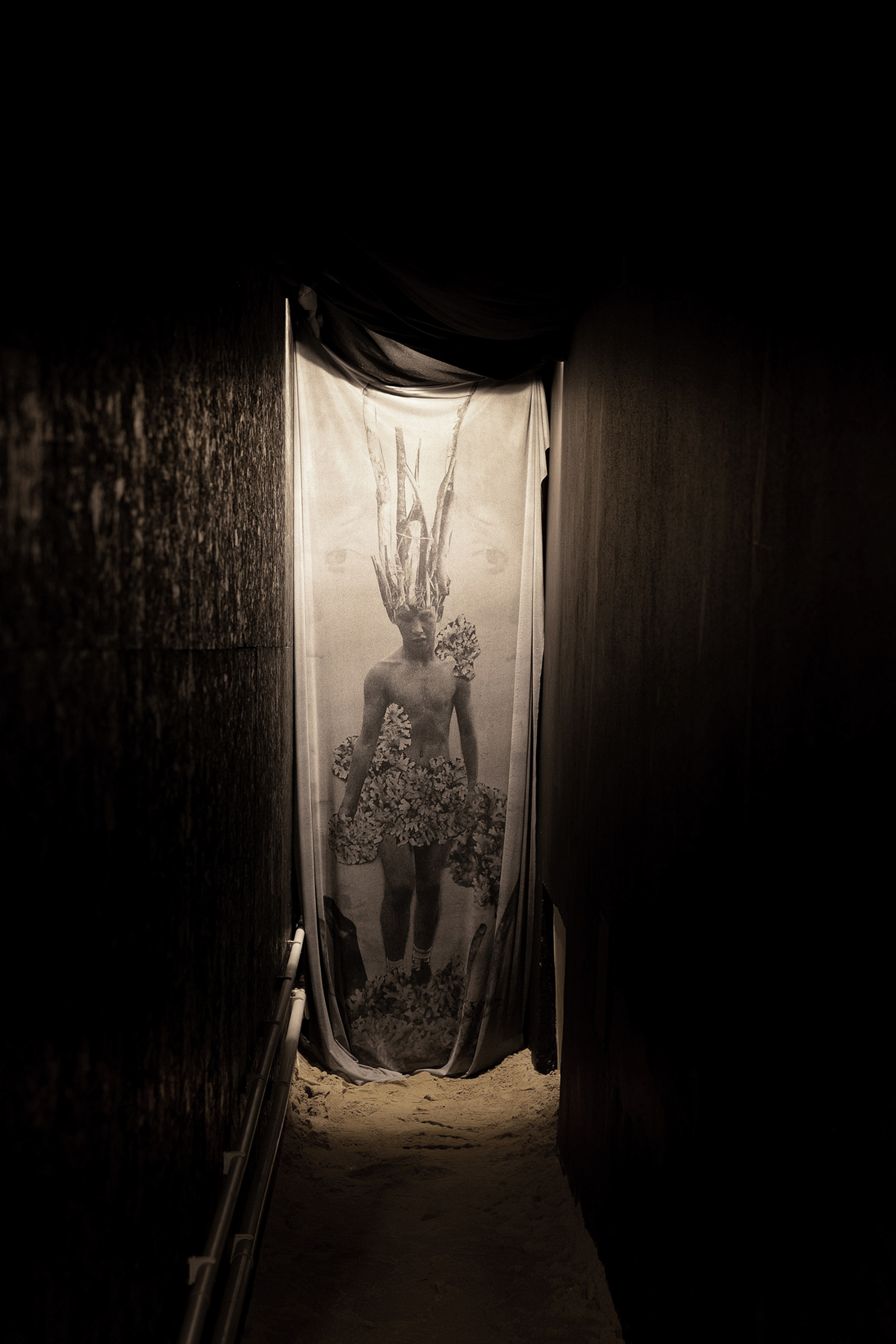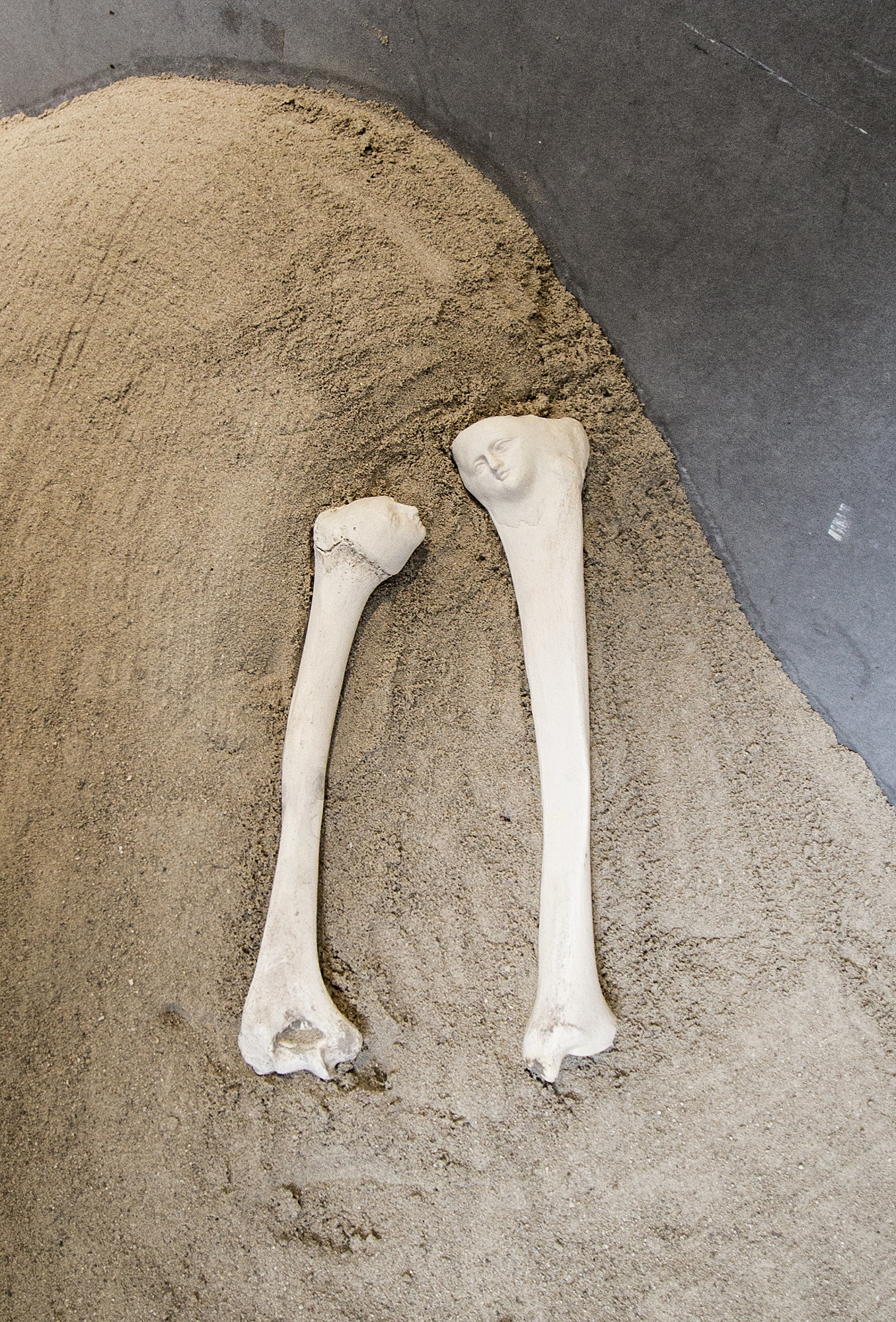 Oasis is a subtly composed, extensive installation of sculptures, photographs, printed textiles, and drawings that is supplemented with a sound component. In it, Mendreczky (*1988 in Budapest, Hungary) and Kortmann Járay (*1986 Budapest, Hungary) take up both spiritual narratives and personal family histories and translate them into unusual pictures and objects that seem alien and familiar to us at the same time. Besides set pieces from nature like shells and sand, the space is populated with hybrid creatures with human traits and plant characteristics or that represent a merging of animal and object. They are free interpretations of elements and motifs from old fairy tales and myths. There are also spiritual-religious symbols such as the pomegranate, date palms, or folded hands, as well as historical photographs from family albums in which a particular aura is inherent. Female figures are positioned in various places in the space and sustain the mystical scenery.