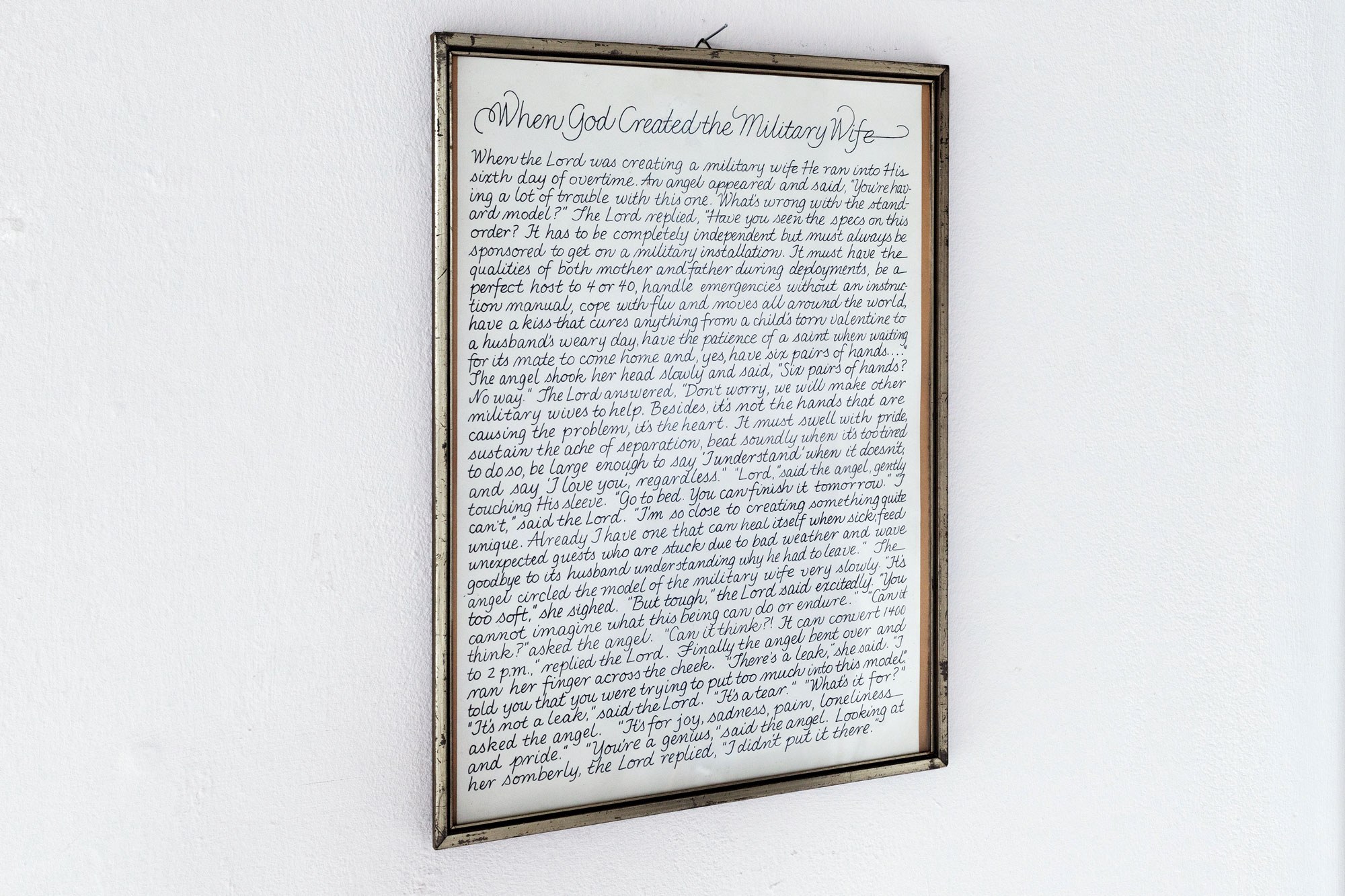 This exhibition will serve as the conclusion of a work cycle. To foreshadow the new cycle, the object When God Created The Military Wife is already on display. This object was taken from the artistsâ grandparentâs house after they both had passed away in late 2022. Being the granddaughter of a major-general and his wife, Rohde witnessed second-handedly what a representational life looks like. The idea of the military wifeâs role is to take pride in sacrificing oneself and putting oneâs owns needs behind everyone elses. This calligraphic piece, which glorifies that idea, was gifted to my grandmother as a welcome gift from the other military wives, when they were moved to the U.S. in the seventies.