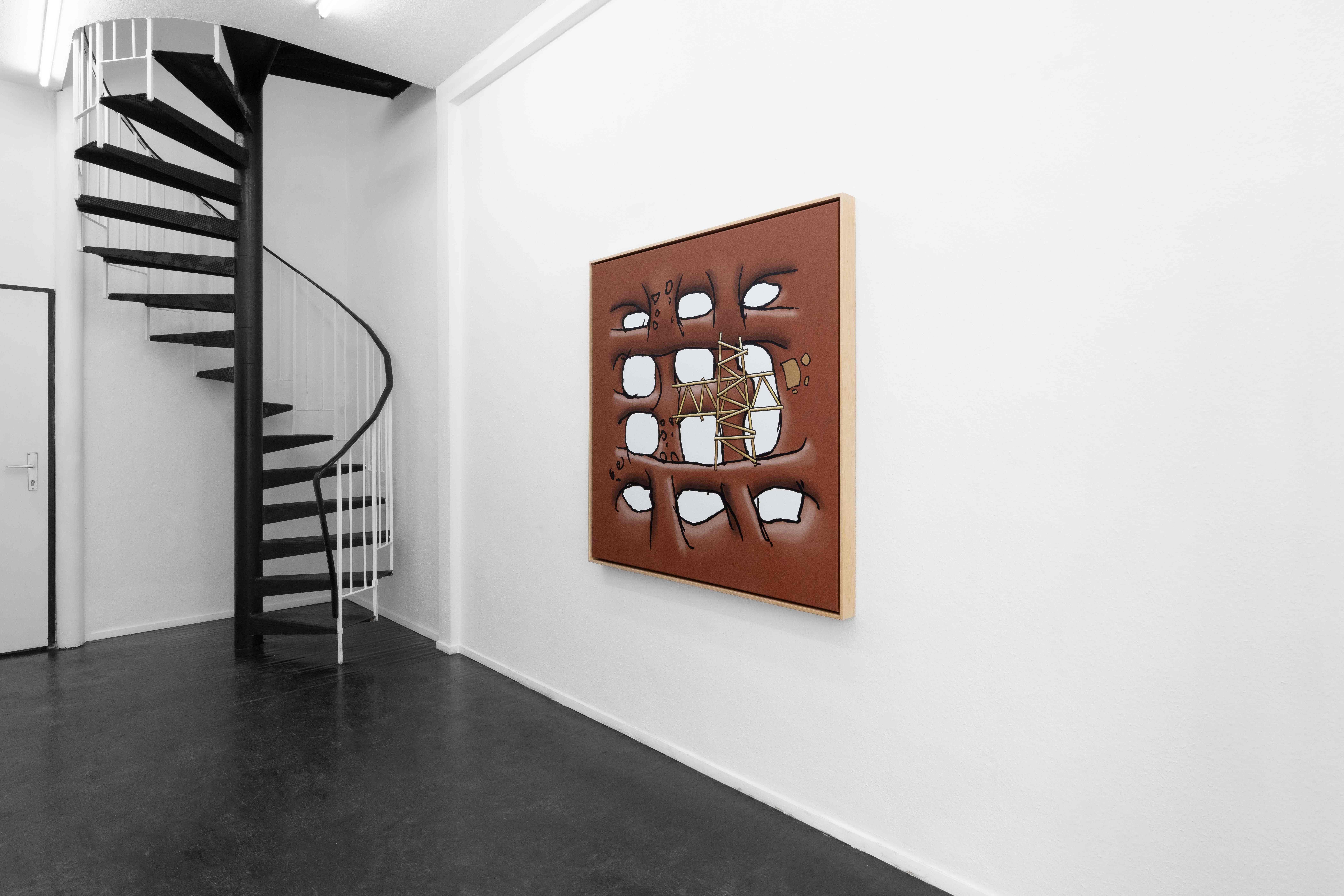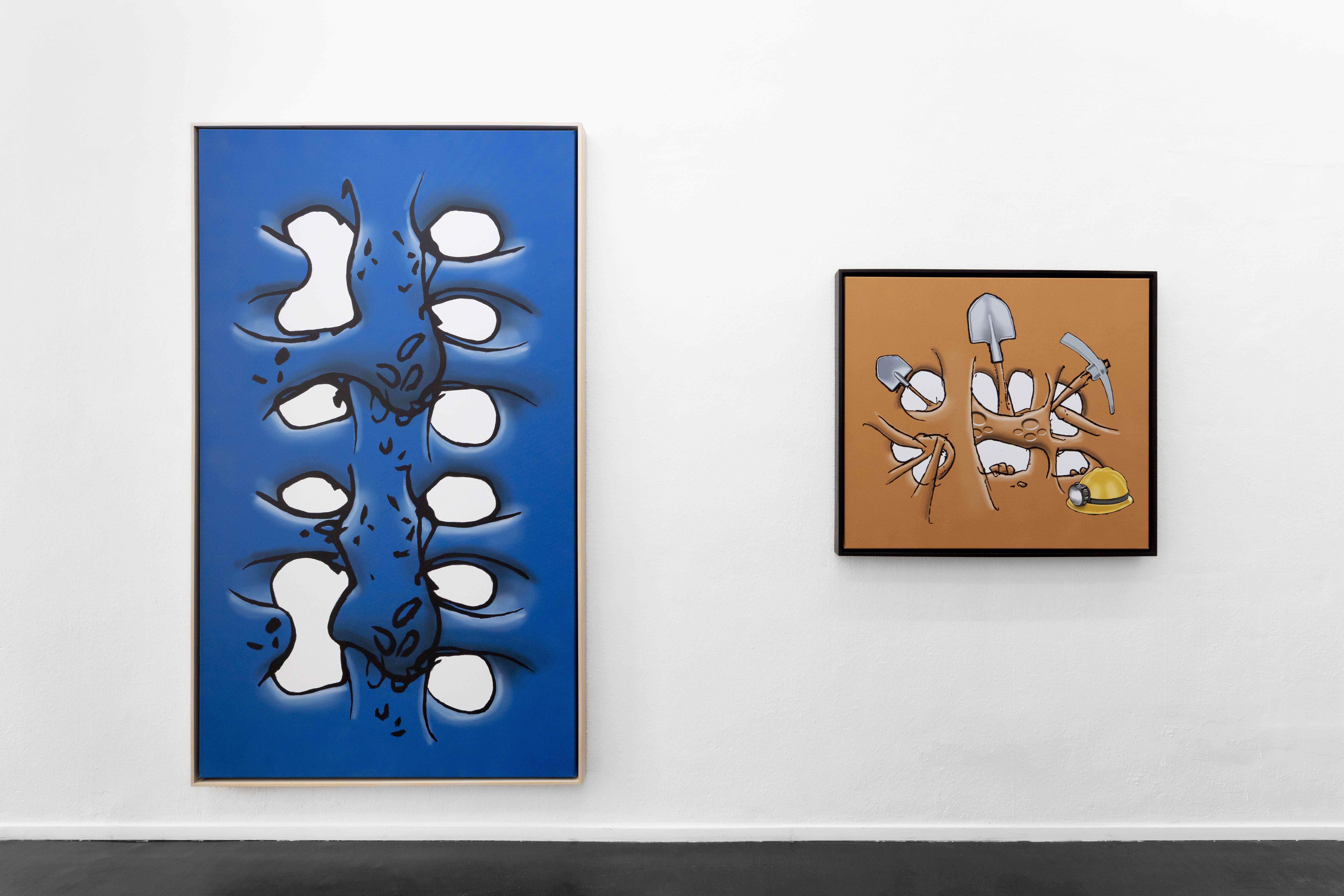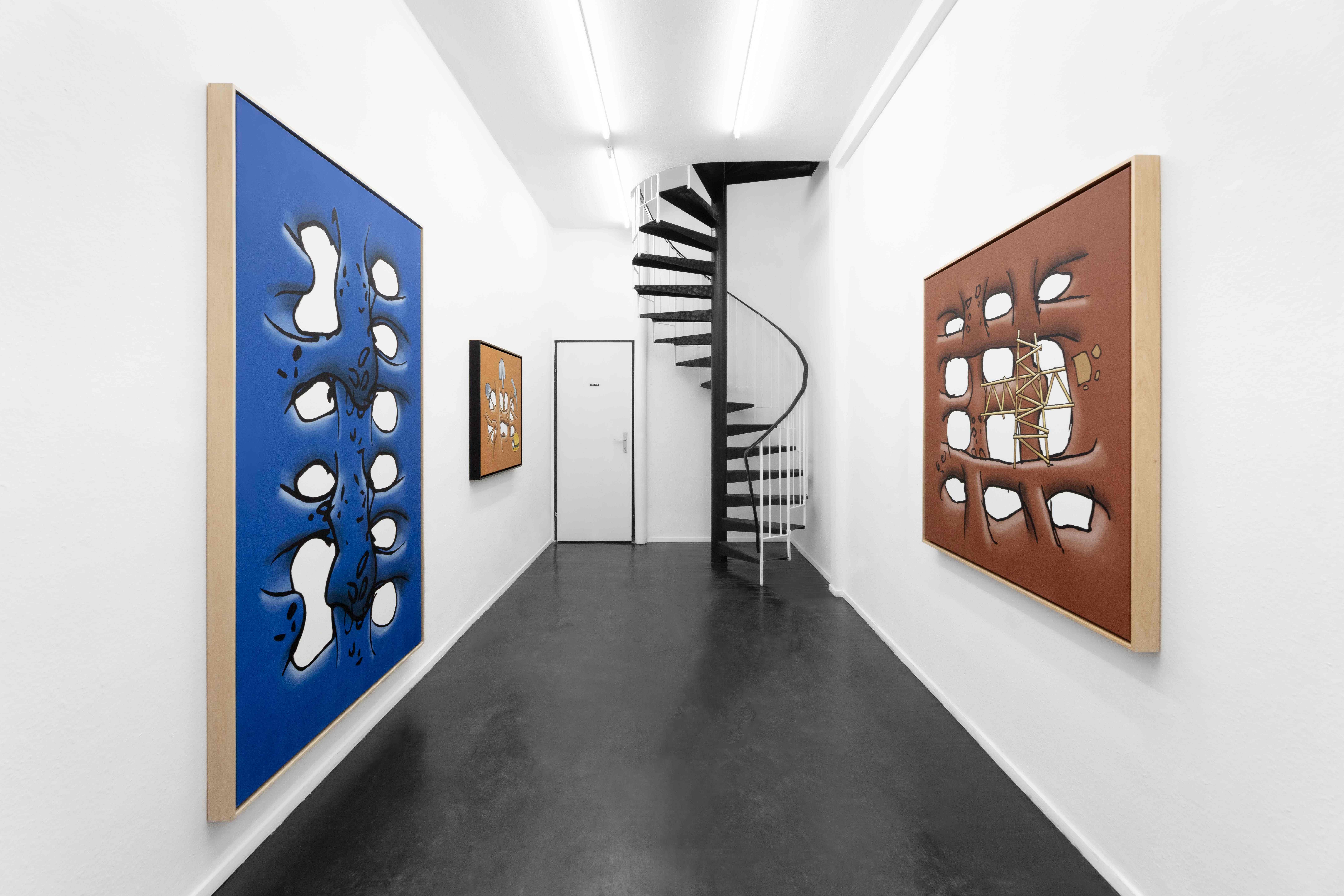 Five new works on canvas show clusters of air pockets on monochromatic grounds. They are at once representational and abstract - following the spatial norms of everyday terrestrial experience while vaguely respecting the finer points of Euclidean geometry. You are in a hole, you are in a cave, you are inside you. The evident morphological integrity of the series - dealing with asymmetrical symmetry, polymetric patterns, seamless shell forms and contemporary theories of spatial organisation - produces obvious phenomenological problems. What we are looking for is a basic unit of artistic signification to simplify the complex variegated order, which society is no longer able to face.