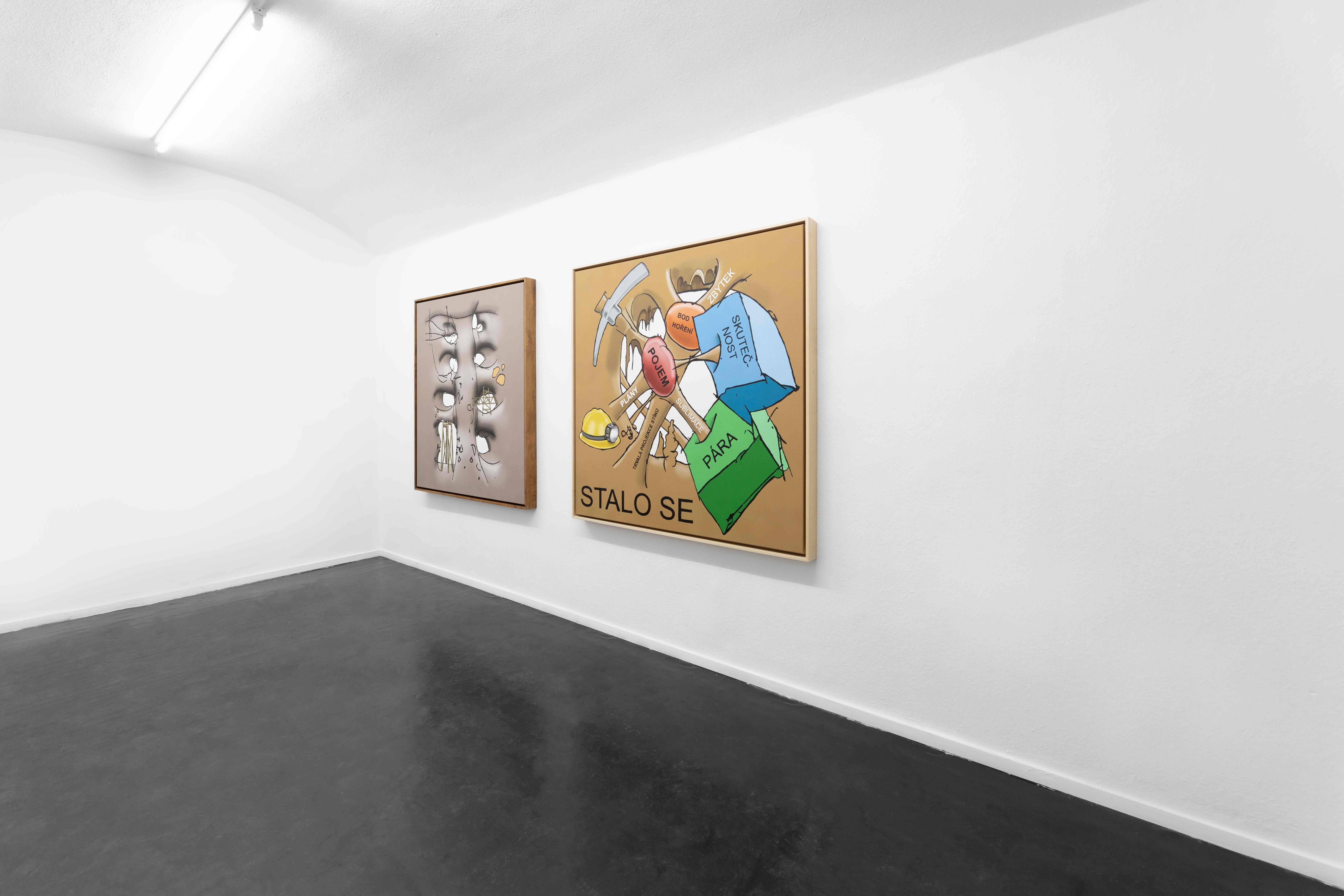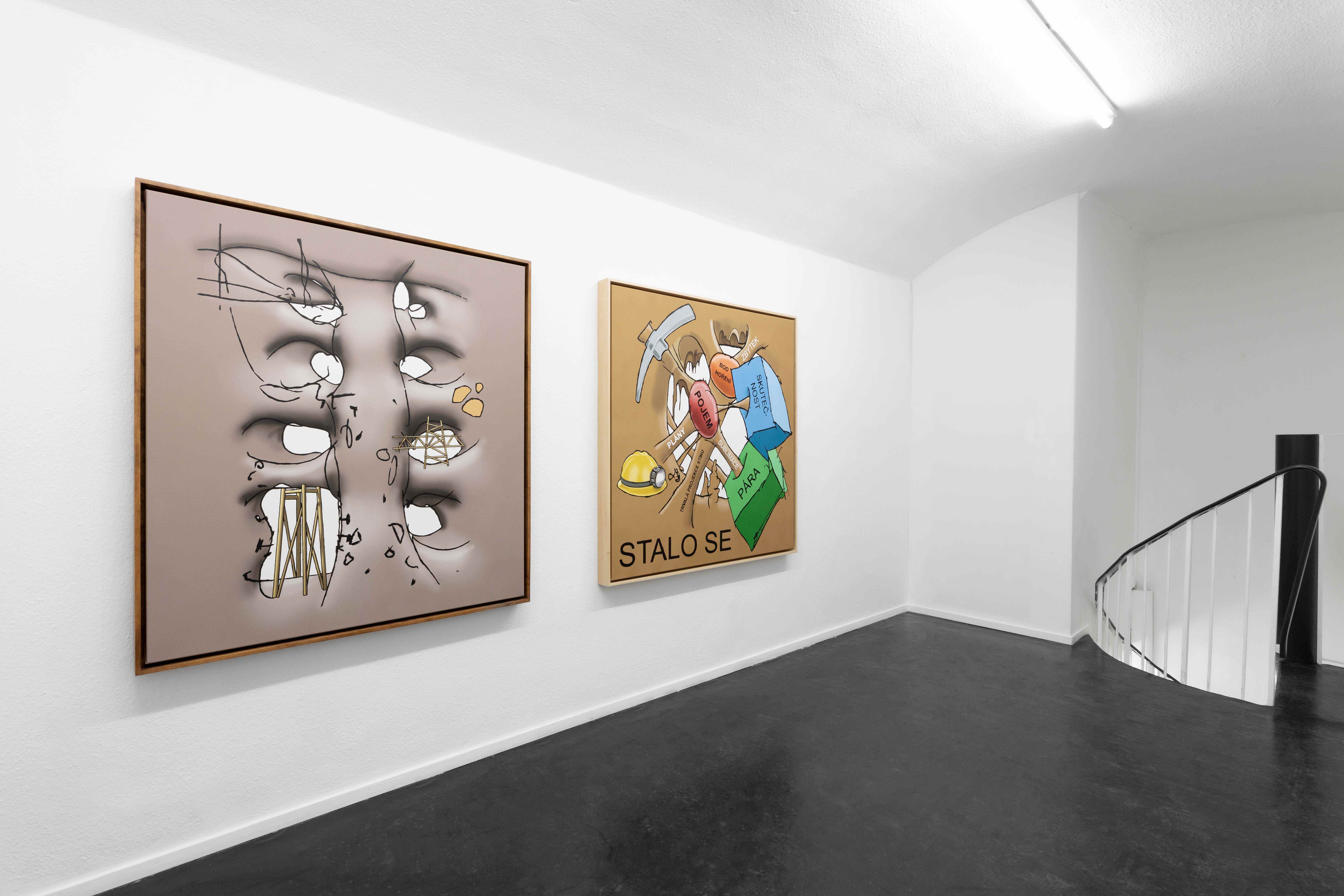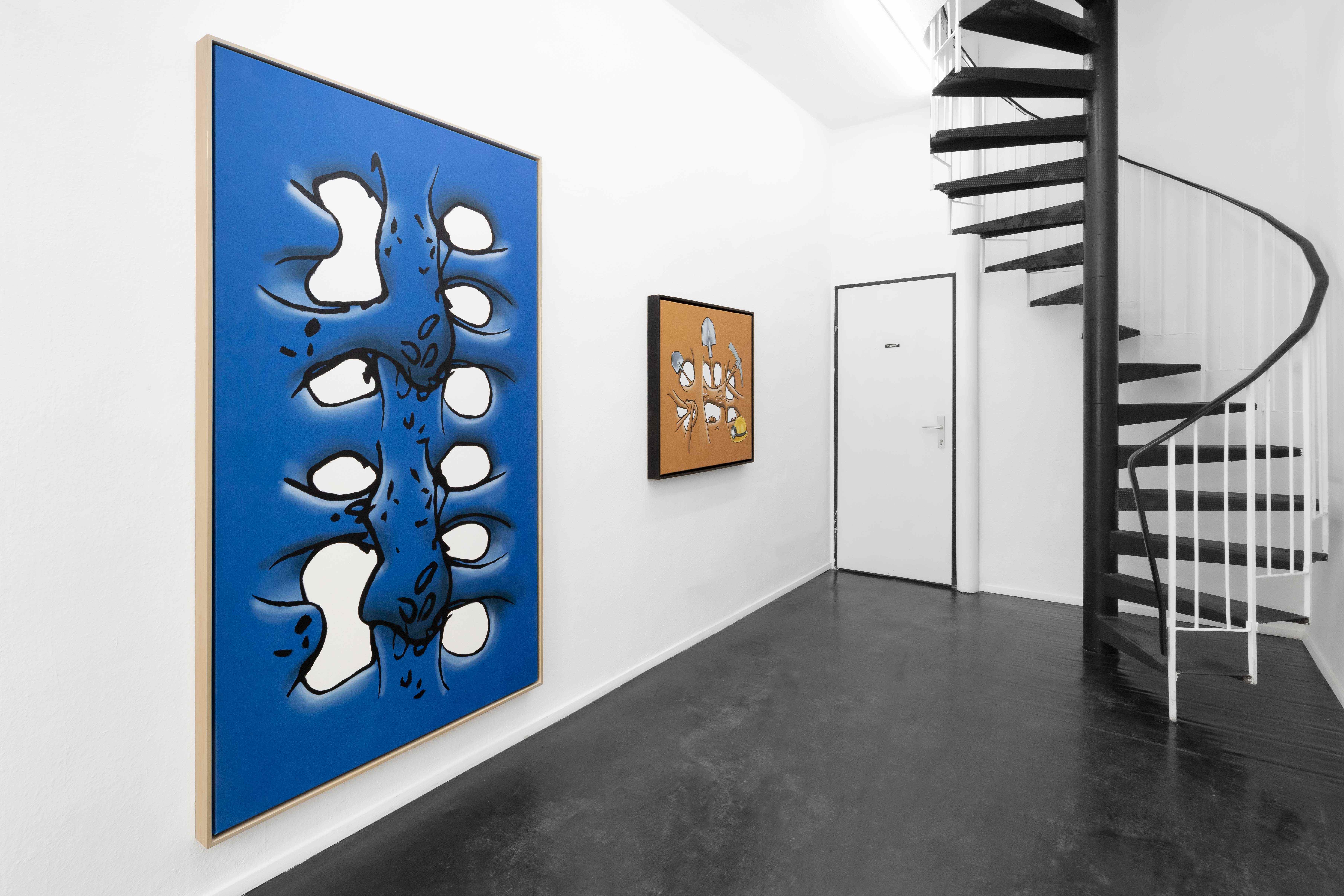 Five new works on canvas show clusters of air pockets on monochromatic grounds. They are at once representational and abstract - following the spatial norms of everyday terrestrial experience while vaguely respecting the finer points of Euclidean geometry. You are in a hole, you are in a cave, you are inside you. The evident morphological integrity of the series - dealing with asymmetrical symmetry, polymetric patterns, seamless shell forms and contemporary theories of spatial organisation - produces obvious phenomenological problems. What we are looking for is a basic unit of artistic signification to simplify the complex variegated order, which society is no longer able to face.