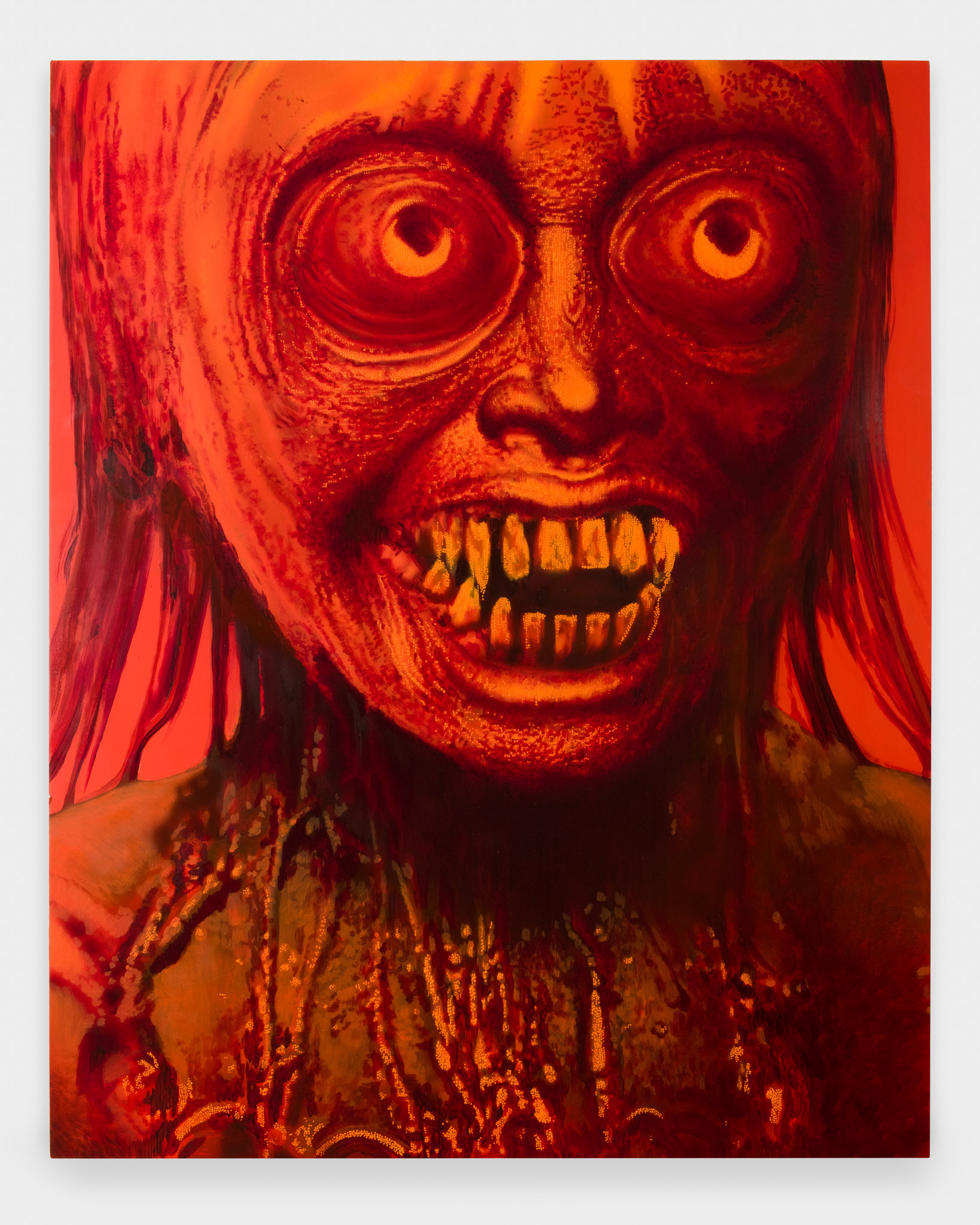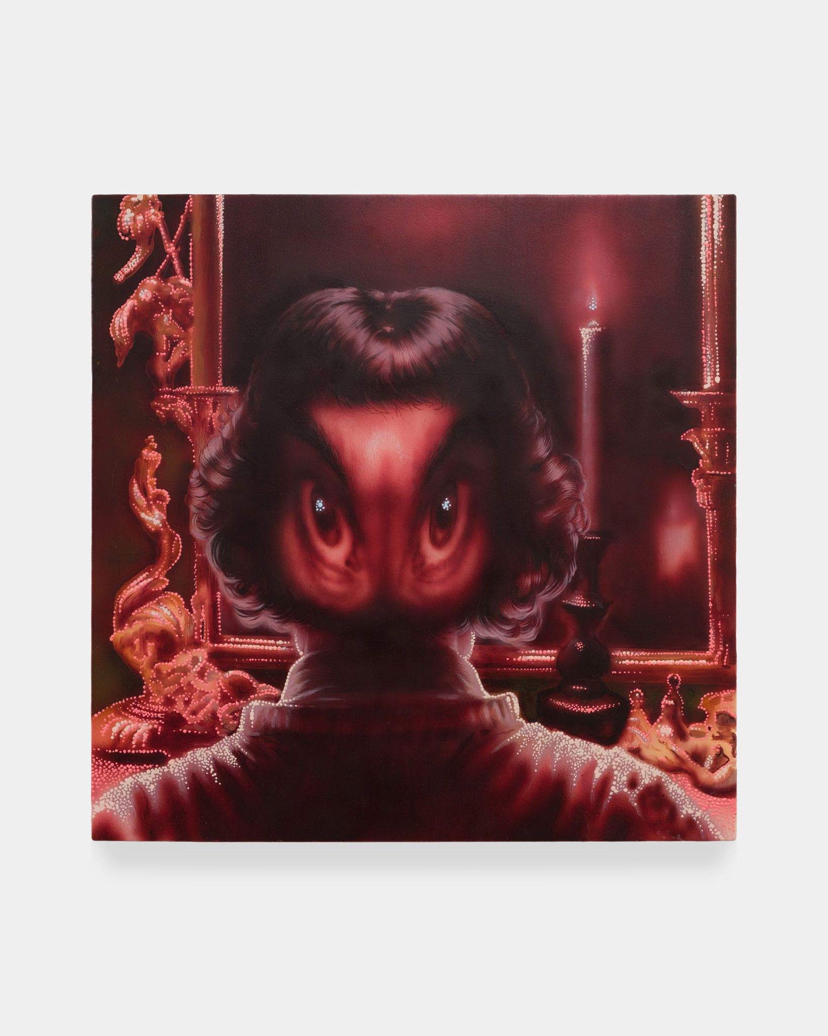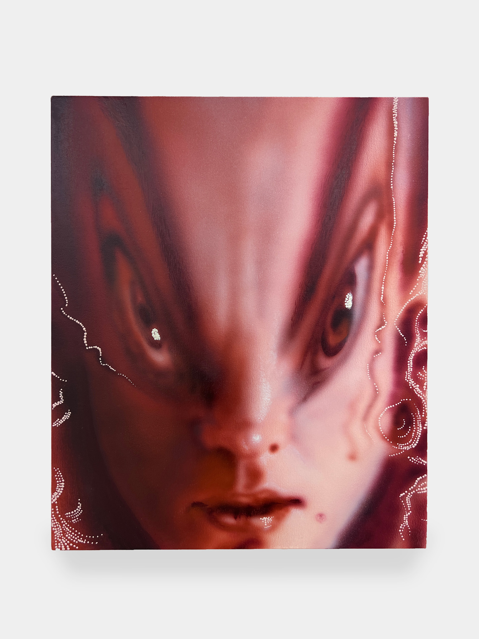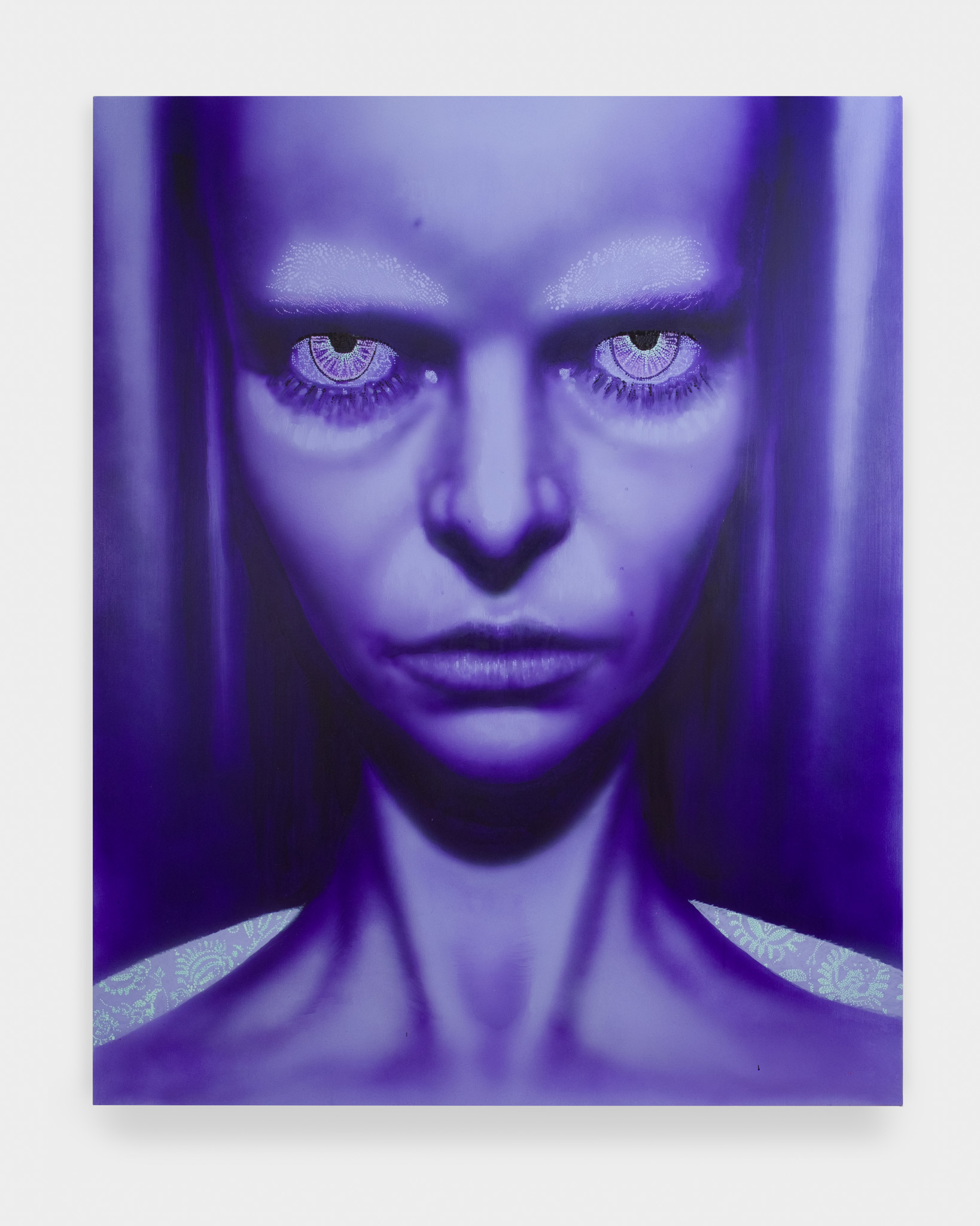 In a painting titled Xtro, the back of an impeccably styled head of hair is overtaken by a fierce pair of eyes, a feature that dominates the artistâs oeuvre. This work is daubed with pearlesque spots, which pervert Roy Lichtensteinâs meticulous Ben-Day dots. Similar ornamentation exists everywhere, such as in the portrait of a bizarre snake hybrid, Second Instar, rendered in vibrant shades of blue and green, or Semiochem, the haunting portrait of a humanoid creature with glowing eyes and a disconcerting grimace.