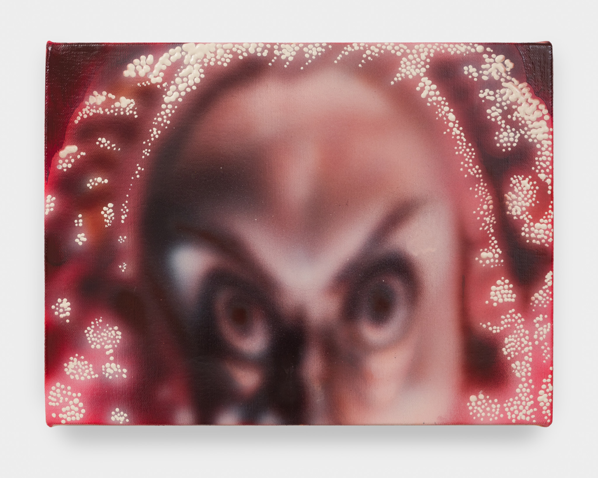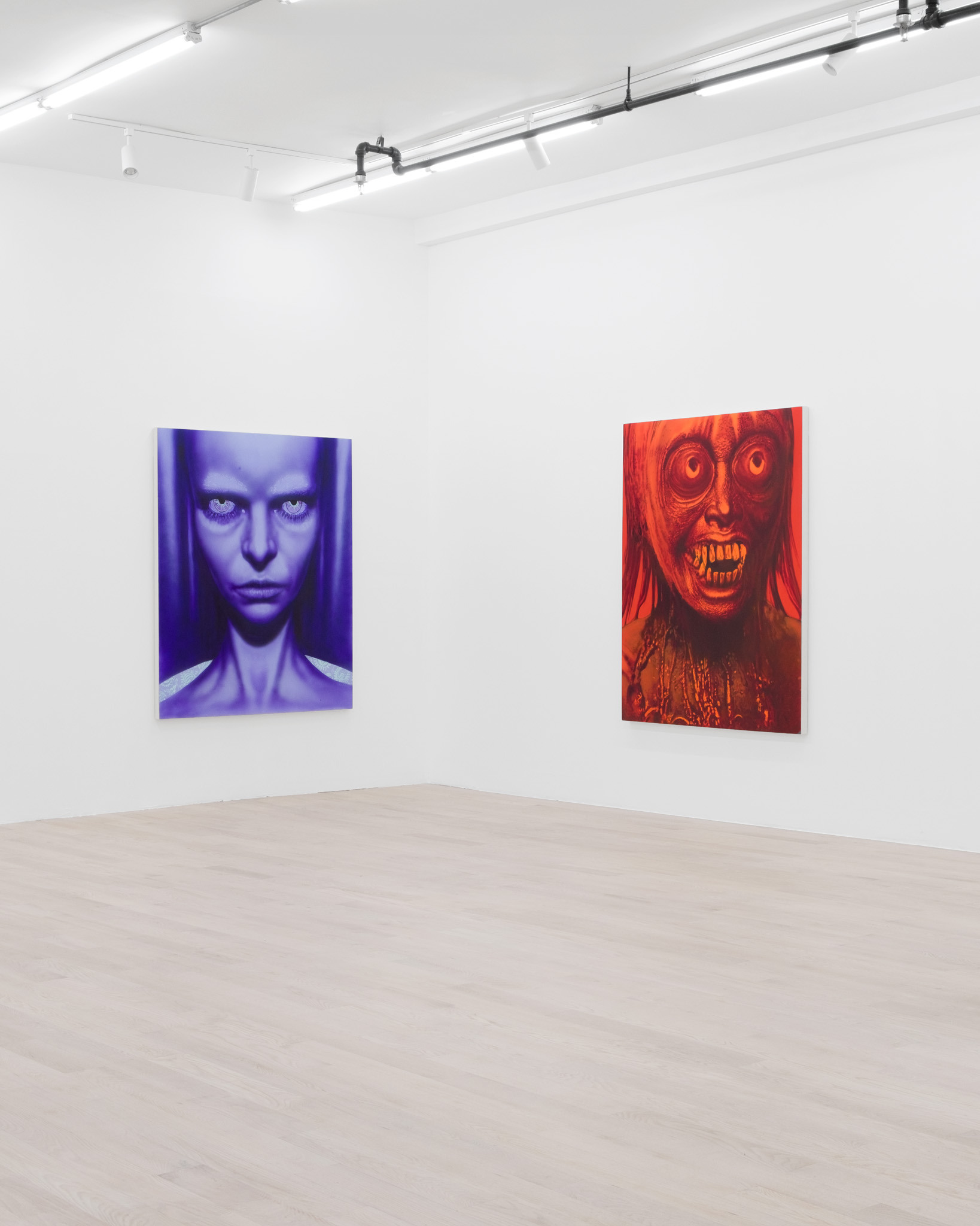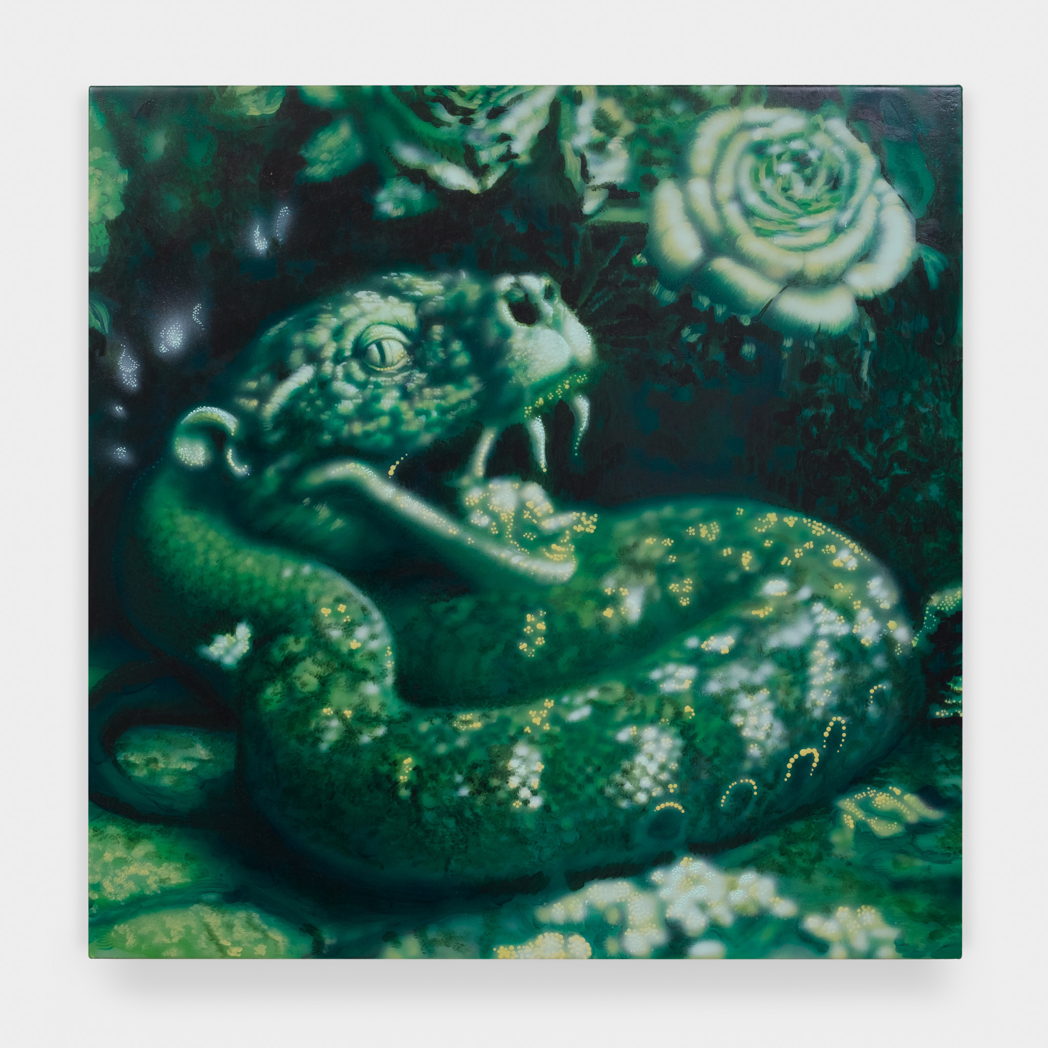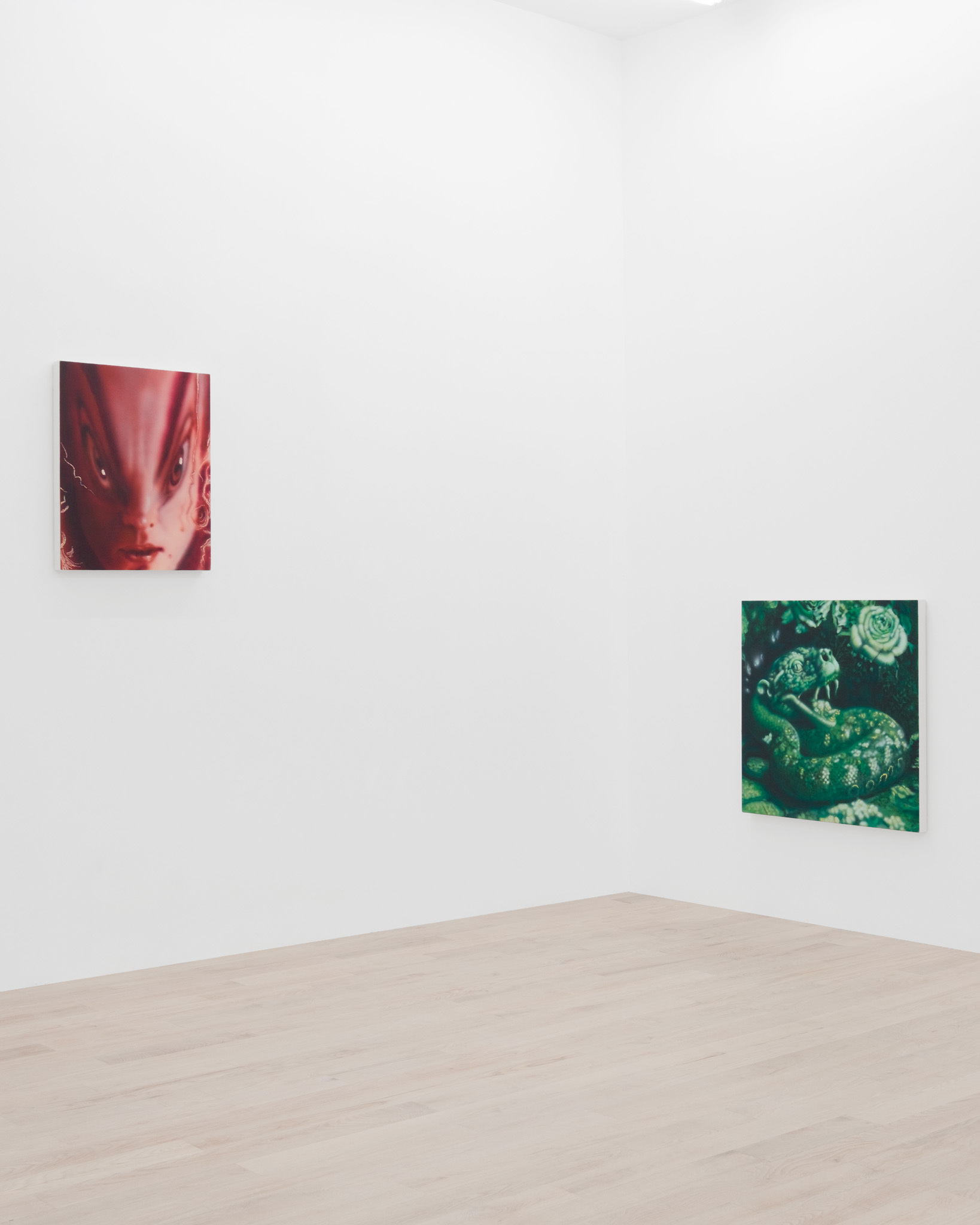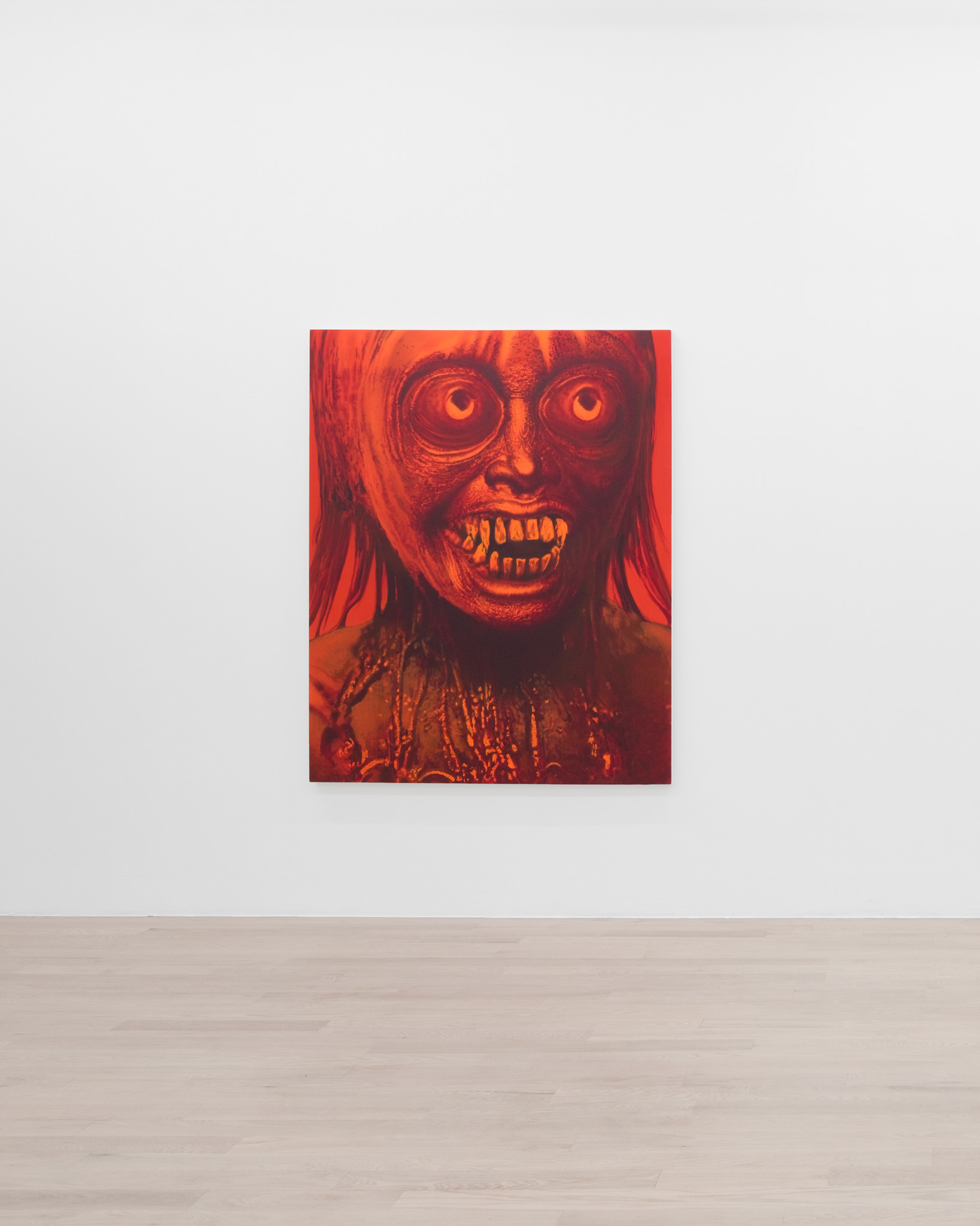 In a painting titled Xtro, the back of an impeccably styled head of hair is overtaken by a fierce pair of eyes, a feature that dominates the artistâs oeuvre. This work is daubed with pearlesque spots, which pervert Roy Lichtensteinâs meticulous Ben-Day dots. Similar ornamentation exists everywhere, such as in the portrait of a bizarre snake hybrid, Second Instar, rendered in vibrant shades of blue and green, or Semiochem, the haunting portrait of a humanoid creature with glowing eyes and a disconcerting grimace.