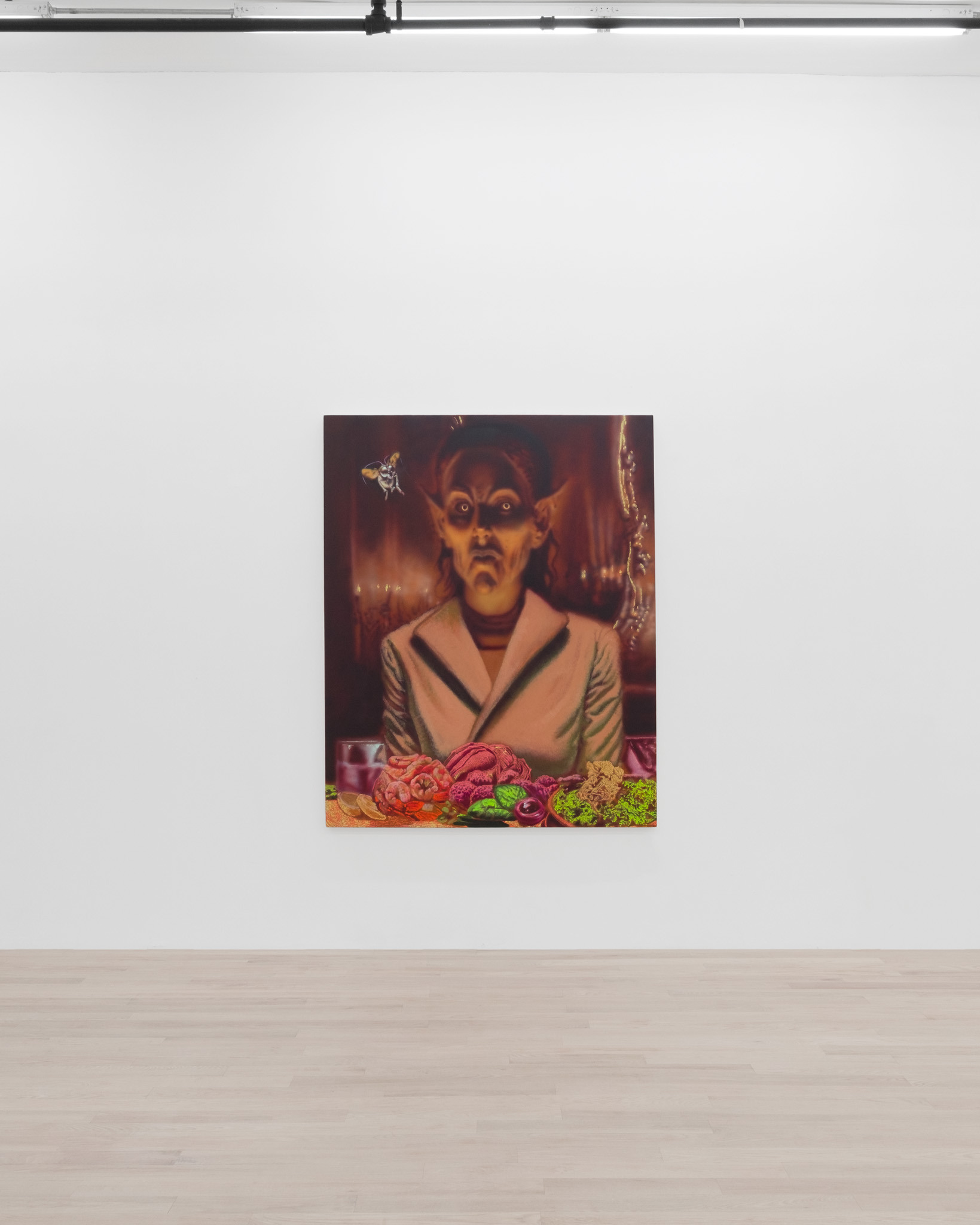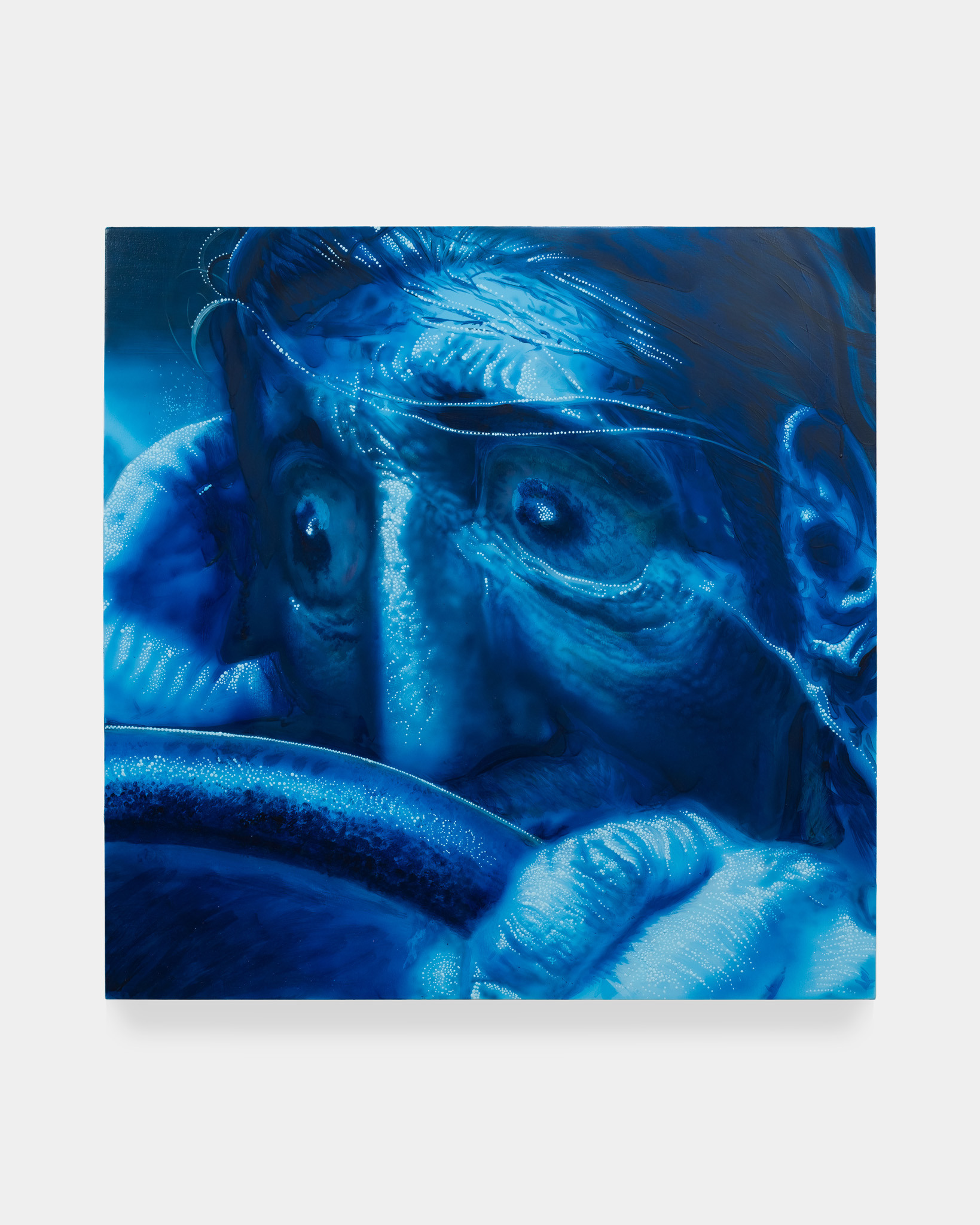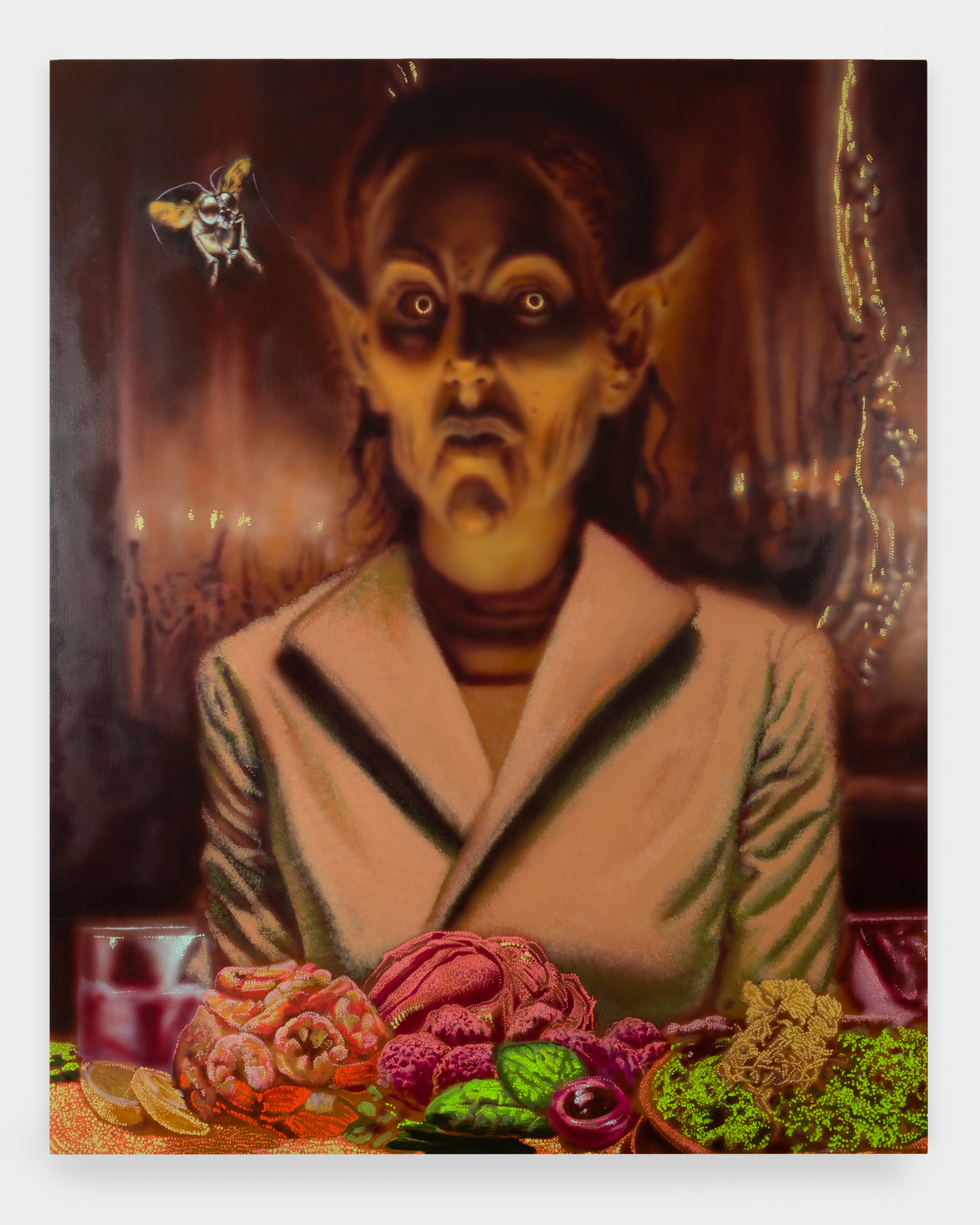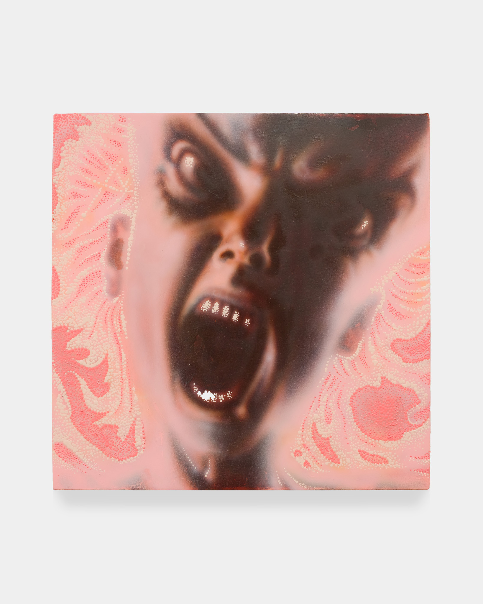 In a painting titled Xtro, the back of an impeccably styled head of hair is overtaken by a fierce pair of eyes, a feature that dominates the artistâs oeuvre. This work is daubed with pearlesque spots, which pervert Roy Lichtensteinâs meticulous Ben-Day dots. Similar ornamentation exists everywhere, such as in the portrait of a bizarre snake hybrid, Second Instar, rendered in vibrant shades of blue and green, or Semiochem, the haunting portrait of a humanoid creature with glowing eyes and a disconcerting grimace.