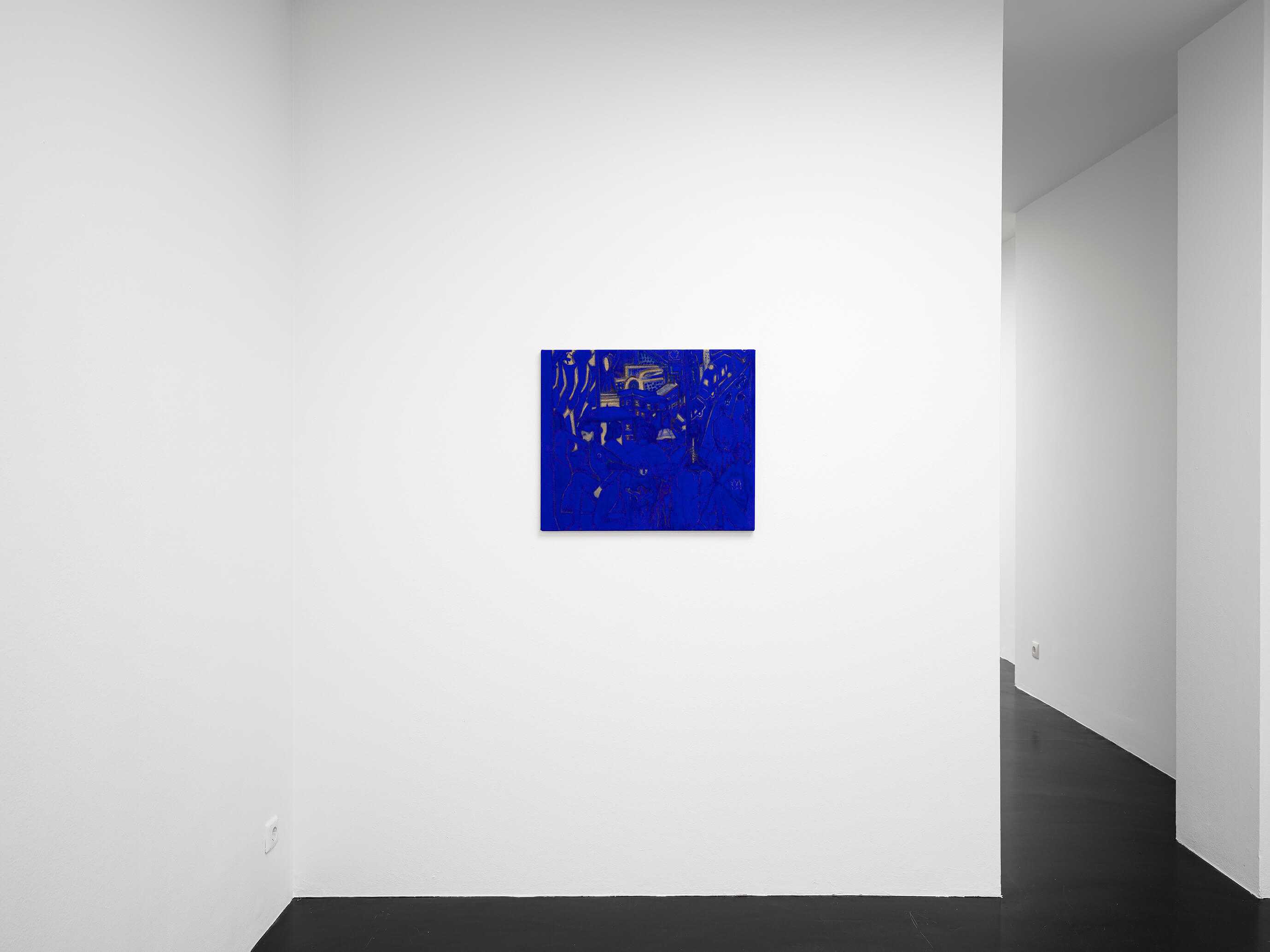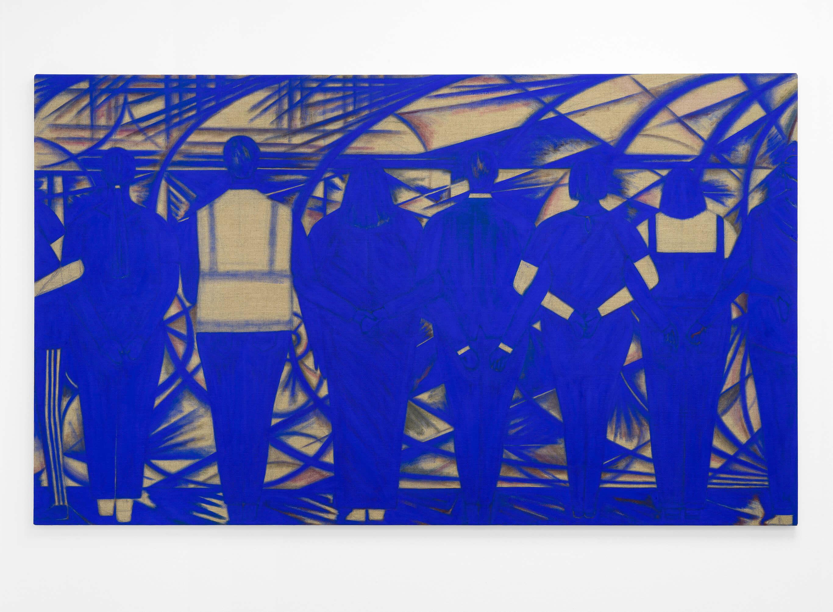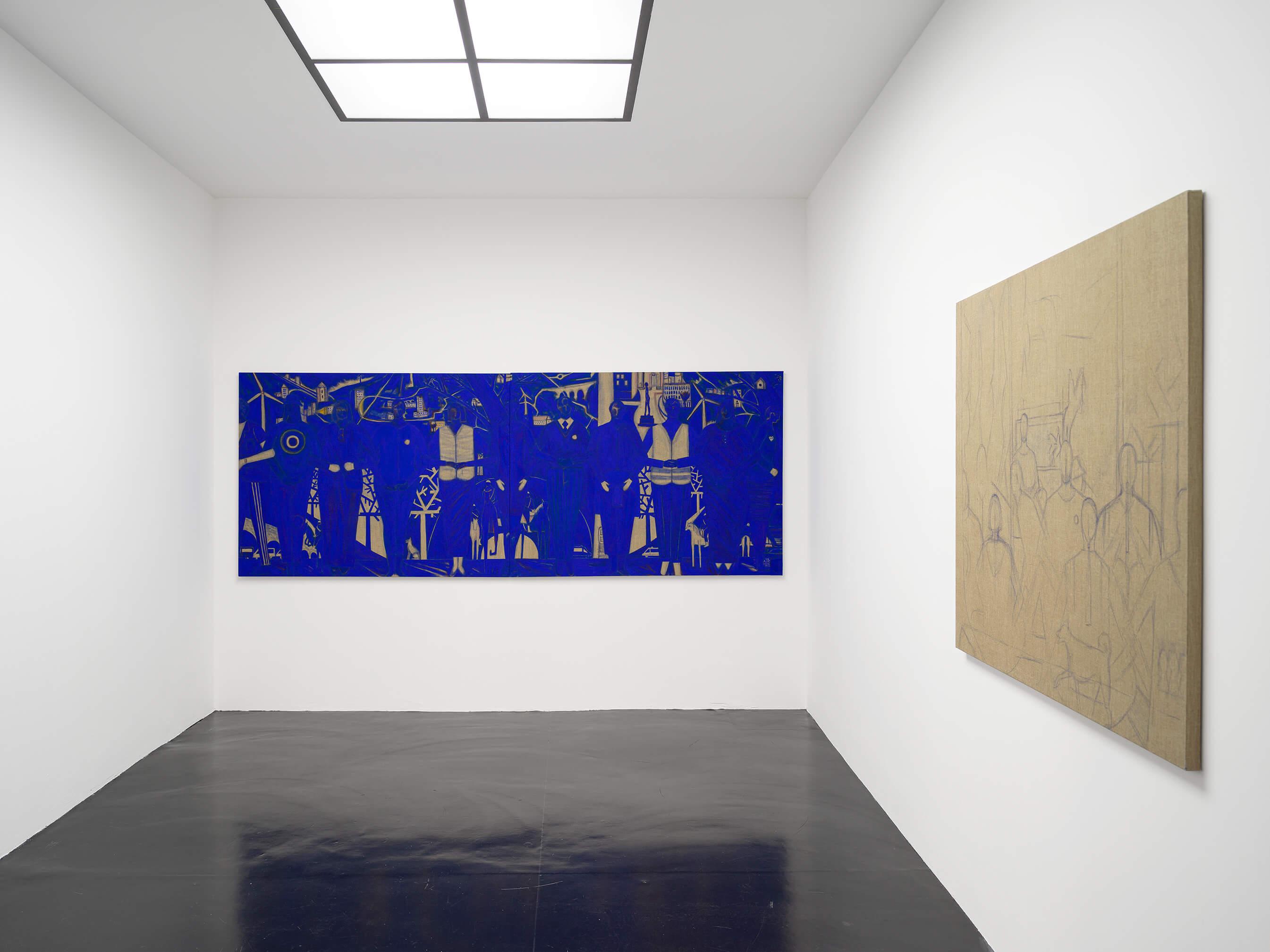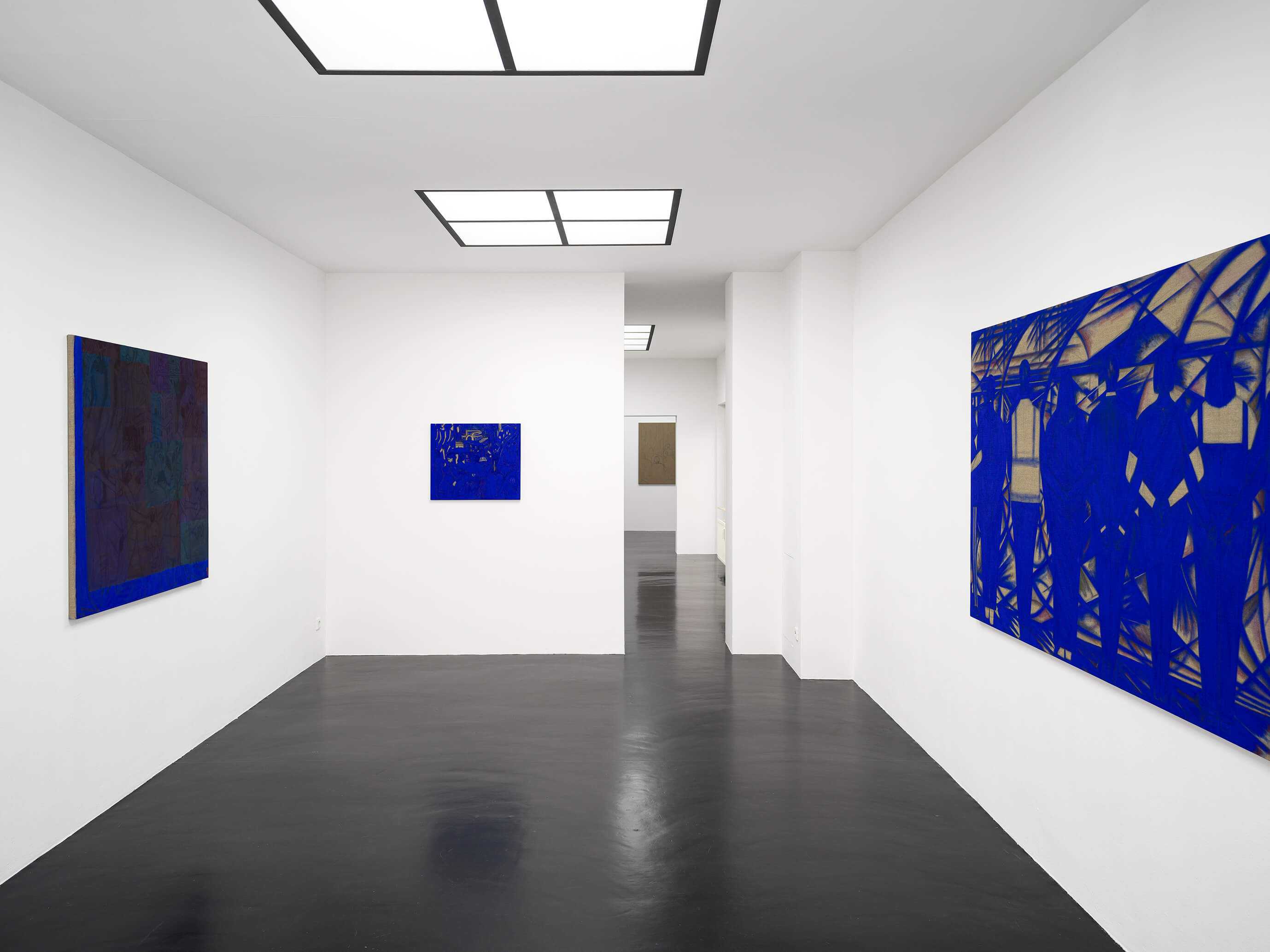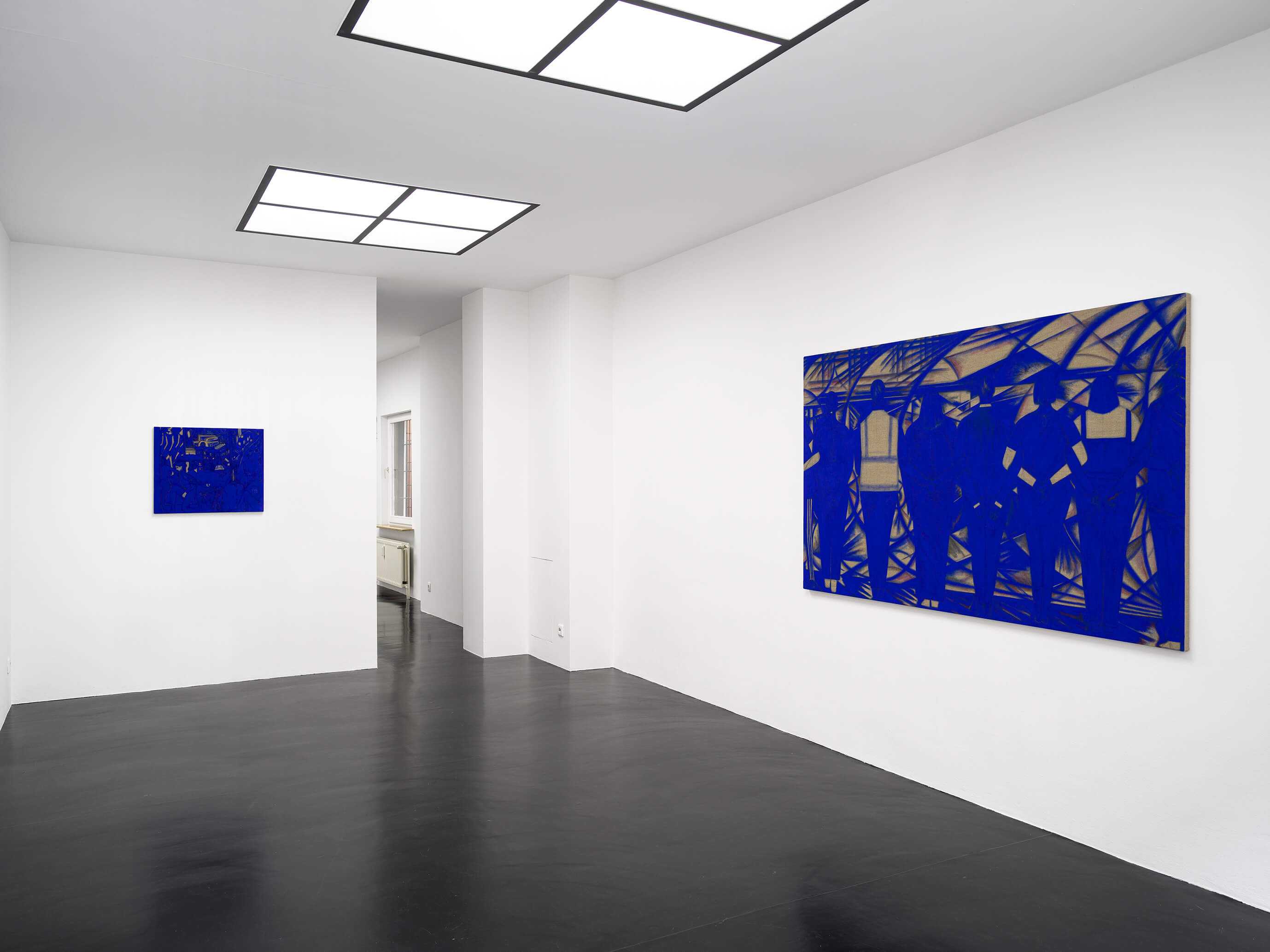 Matthias Nogglerâs paintings question the act of seeing. His figures are frontal, yet they are painted in a velvety blue colorâas if by night itself, rendering their forms barely intelligible. They stand in formations, on provisional stages, arms linkedâeither confronting the viewer or turning their backs to them. They appear trapped within the frames, blurring into their surroundings, their bodies contorted to fit and pose. However, their stiffness and resoluteness have an activating quality, as if calling out the status quo of passive viewing. Nogglerâs work has long been characterized by the appropriation of various historical references and painterly styles. In Iterations, the canvases are loaded with the knowledge about the failed potential of modernist political painting. In that fashion, Nogglerâs figures demand attention and action, however, due to their reduced visibility, those very acts are hindered. The resulting works are abstracted images, which no longer hold hope for grand actions, but attempt to hold the viewer in an unresolved tension of perceiving.