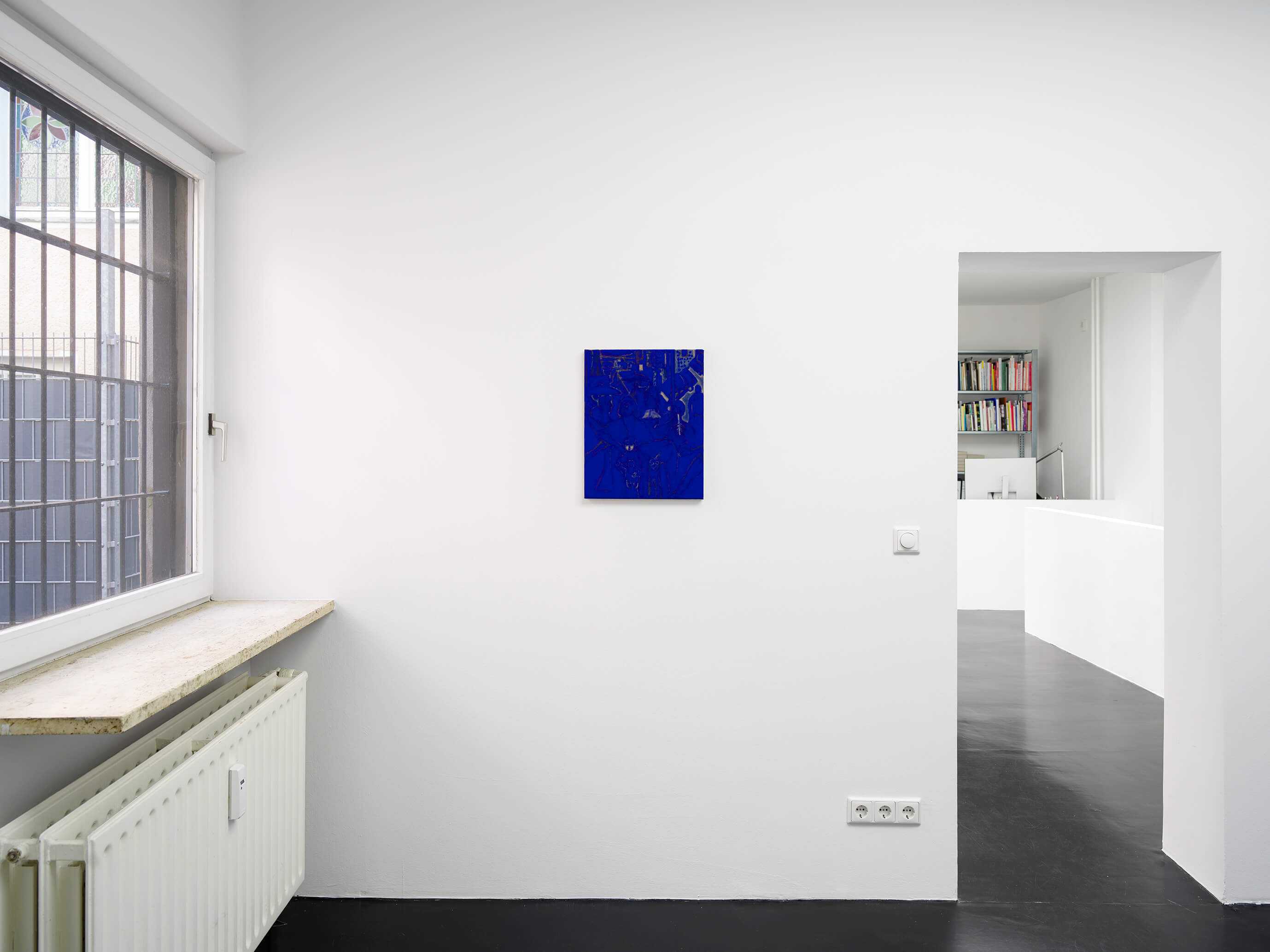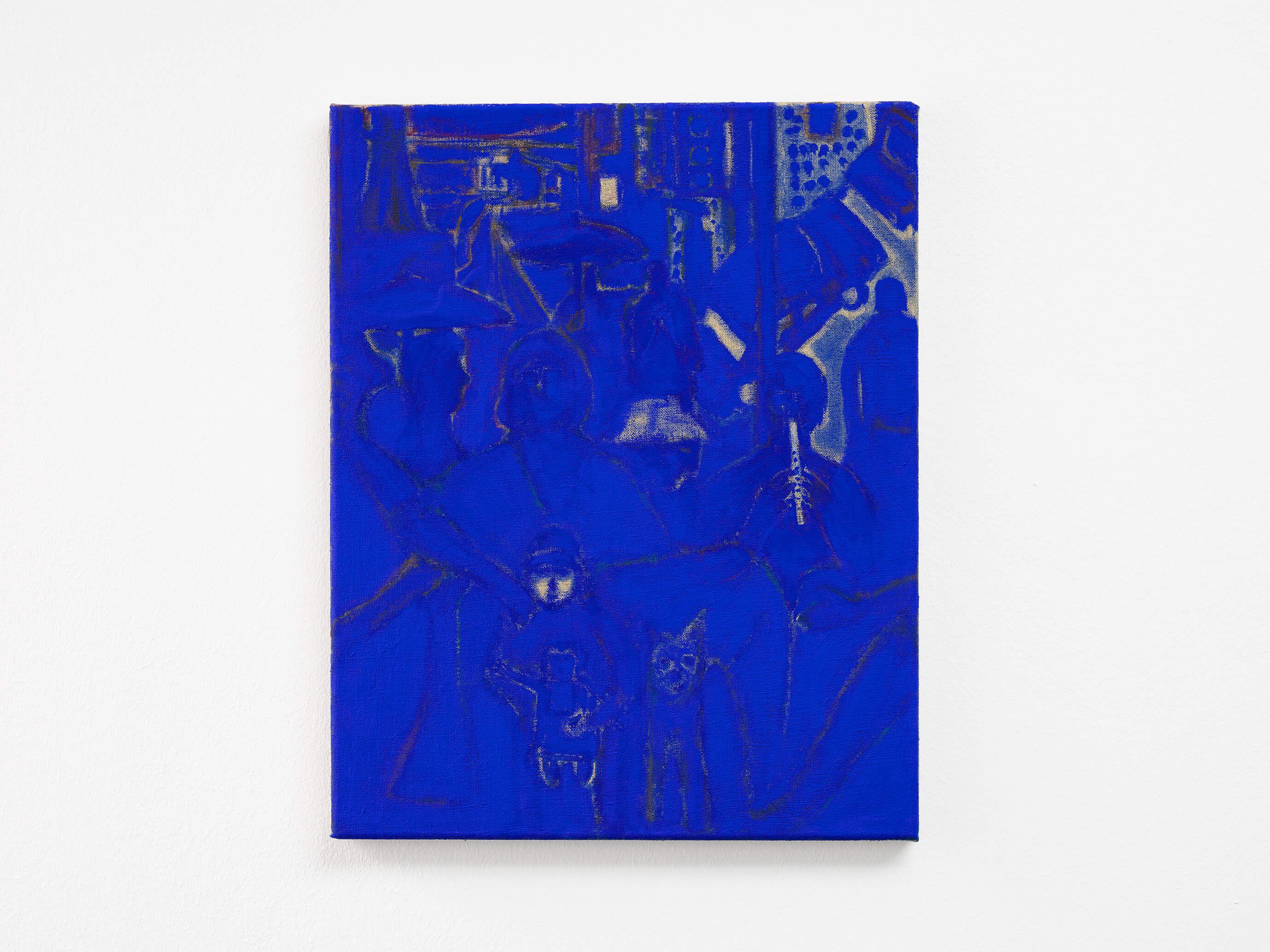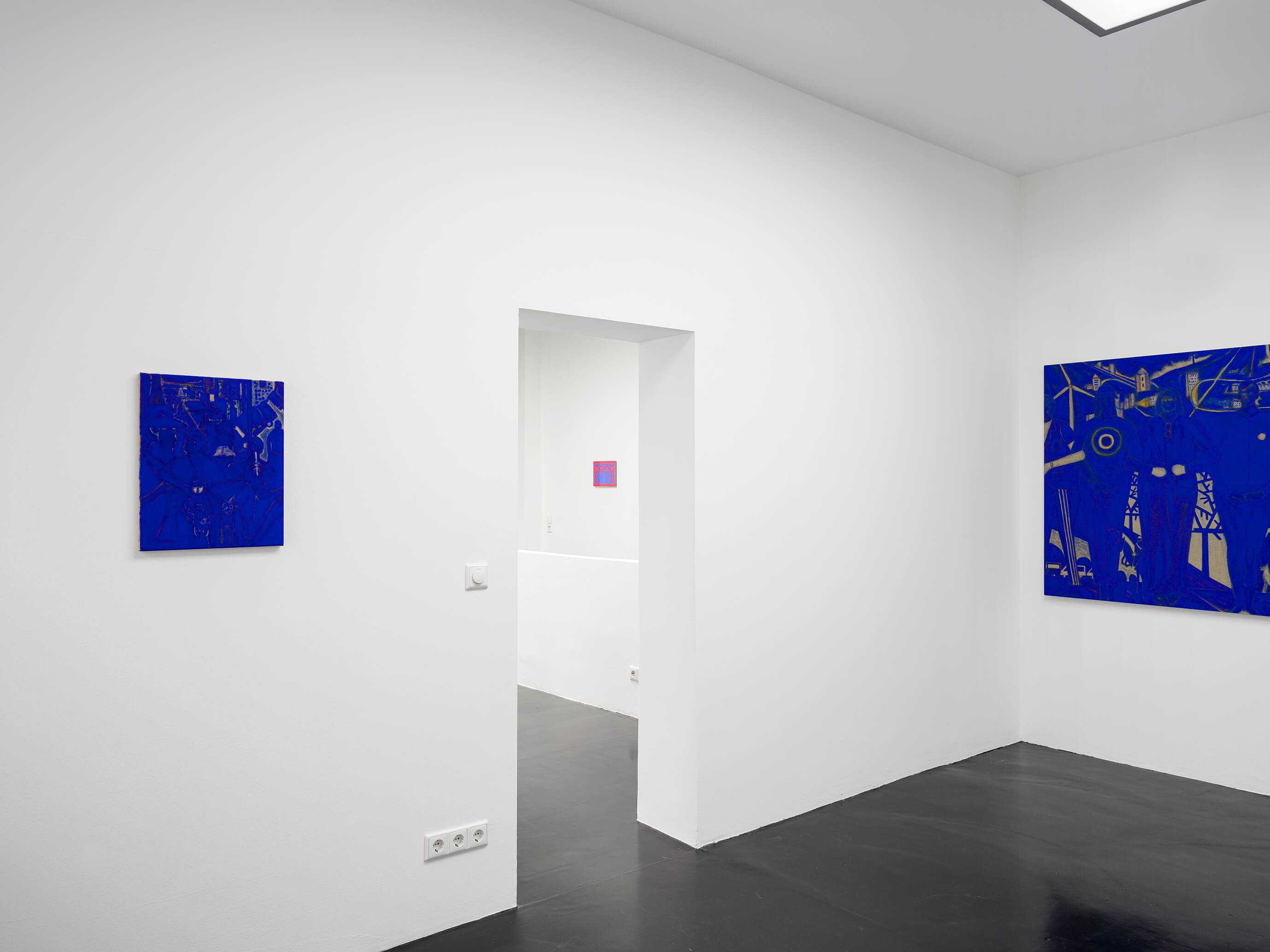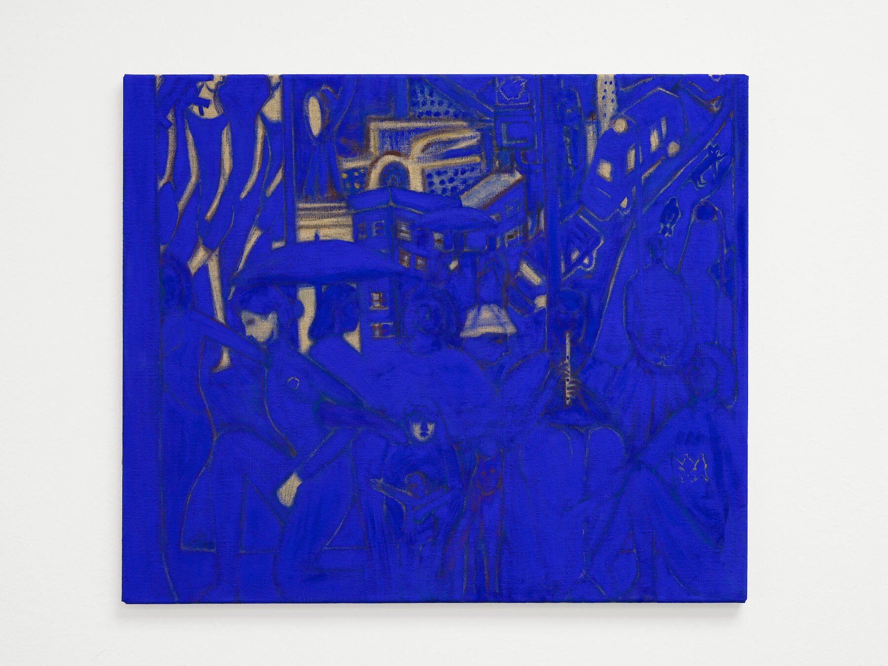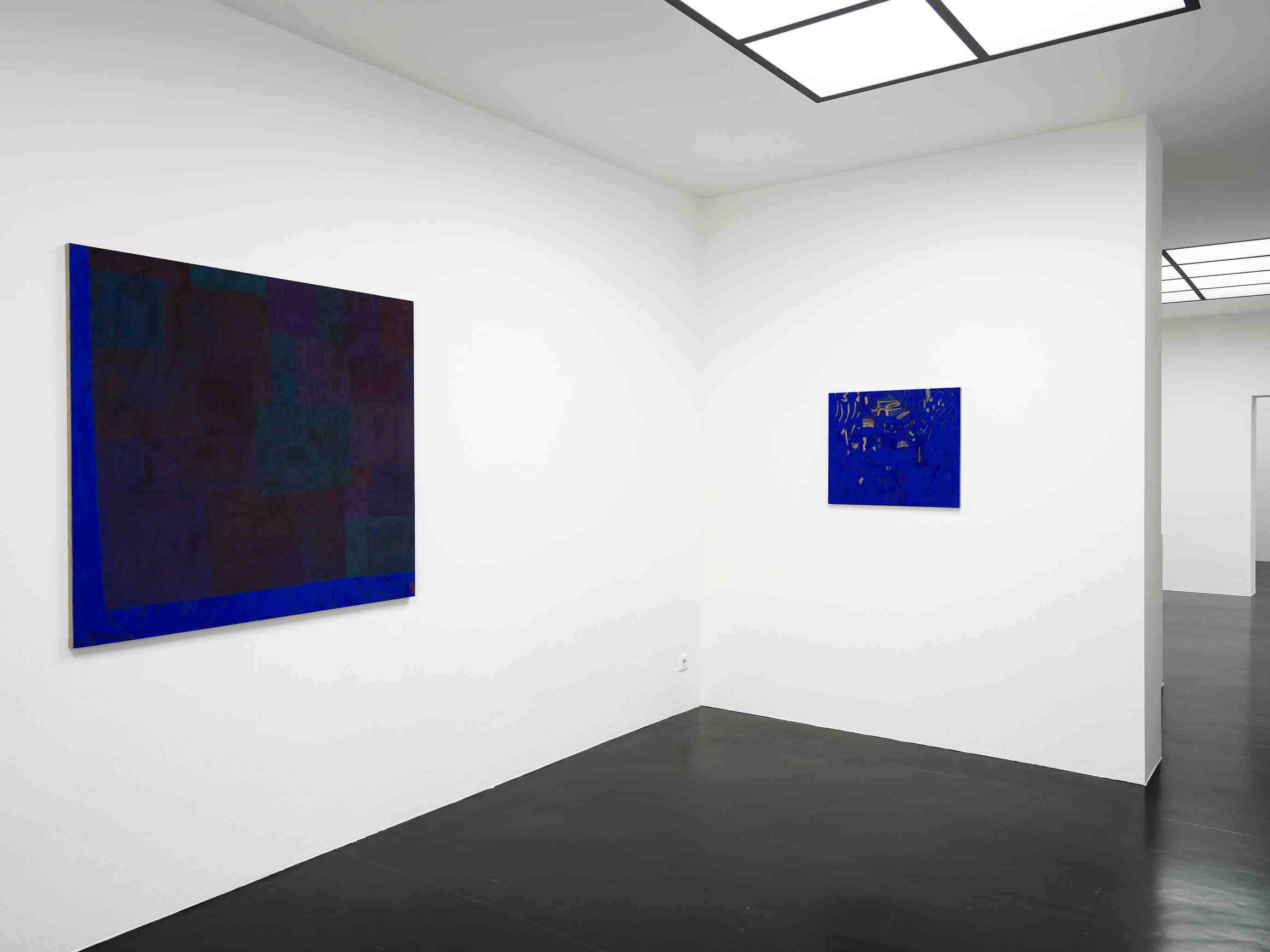 Matthias Nogglerâs paintings question the act of seeing. His figures are frontal, yet they are painted in a velvety blue colorâas if by night itself, rendering their forms barely intelligible. They stand in formations, on provisional stages, arms linkedâeither confronting the viewer or turning their backs to them. They appear trapped within the frames, blurring into their surroundings, their bodies contorted to fit and pose. However, their stiffness and resoluteness have an activating quality, as if calling out the status quo of passive viewing. Nogglerâs work has long been characterized by the appropriation of various historical references and painterly styles. In Iterations, the canvases are loaded with the knowledge about the failed potential of modernist political painting. In that fashion, Nogglerâs figures demand attention and action, however, due to their reduced visibility, those very acts are hindered. The resulting works are abstracted images, which no longer hold hope for grand actions, but attempt to hold the viewer in an unresolved tension of perceiving.