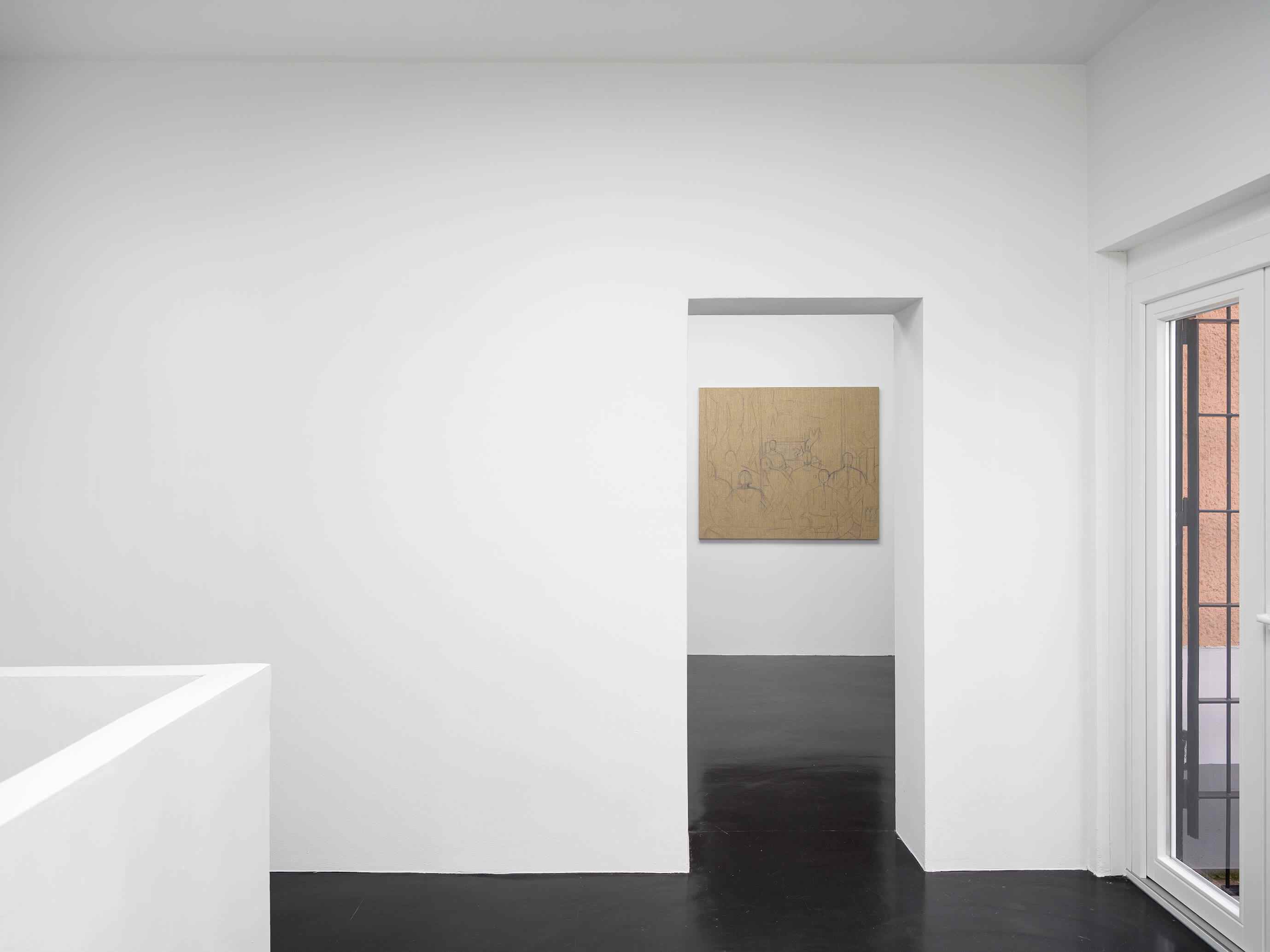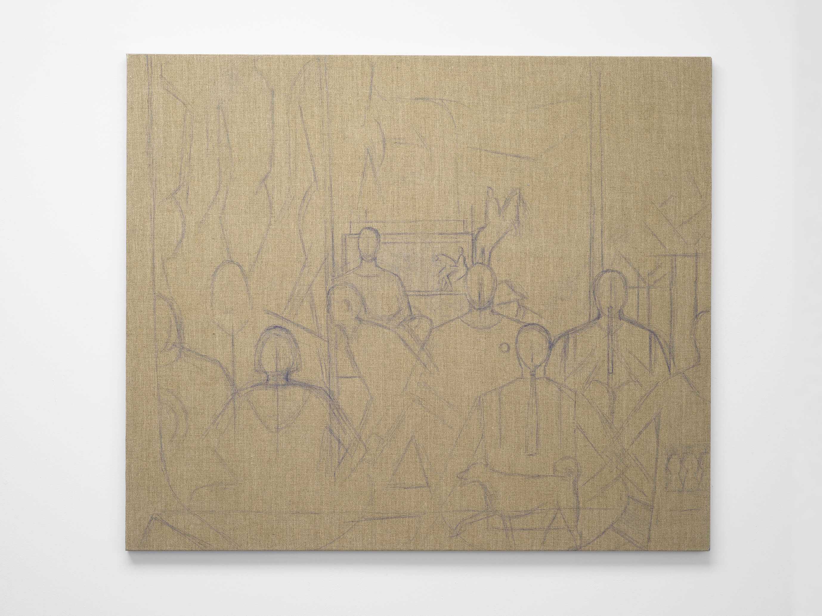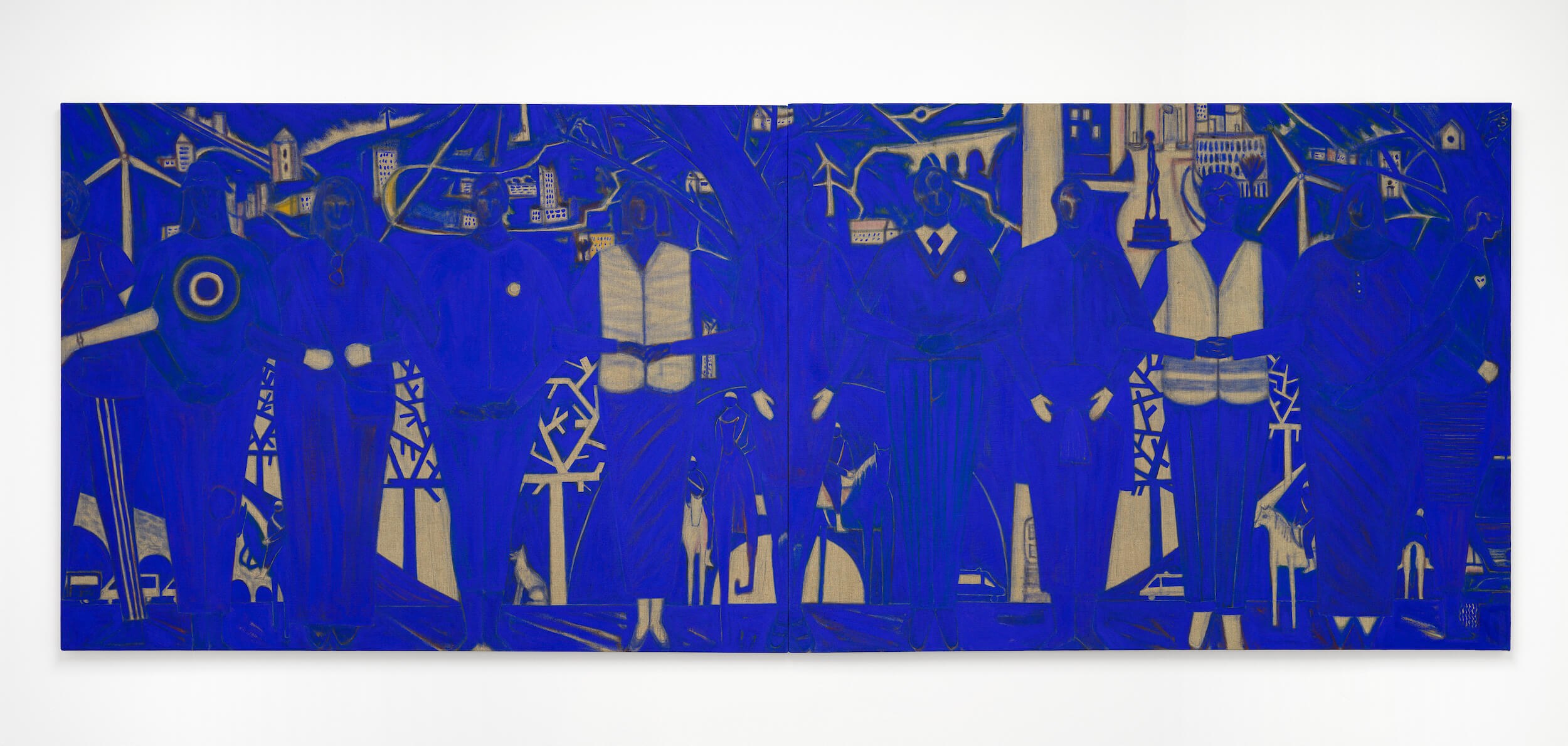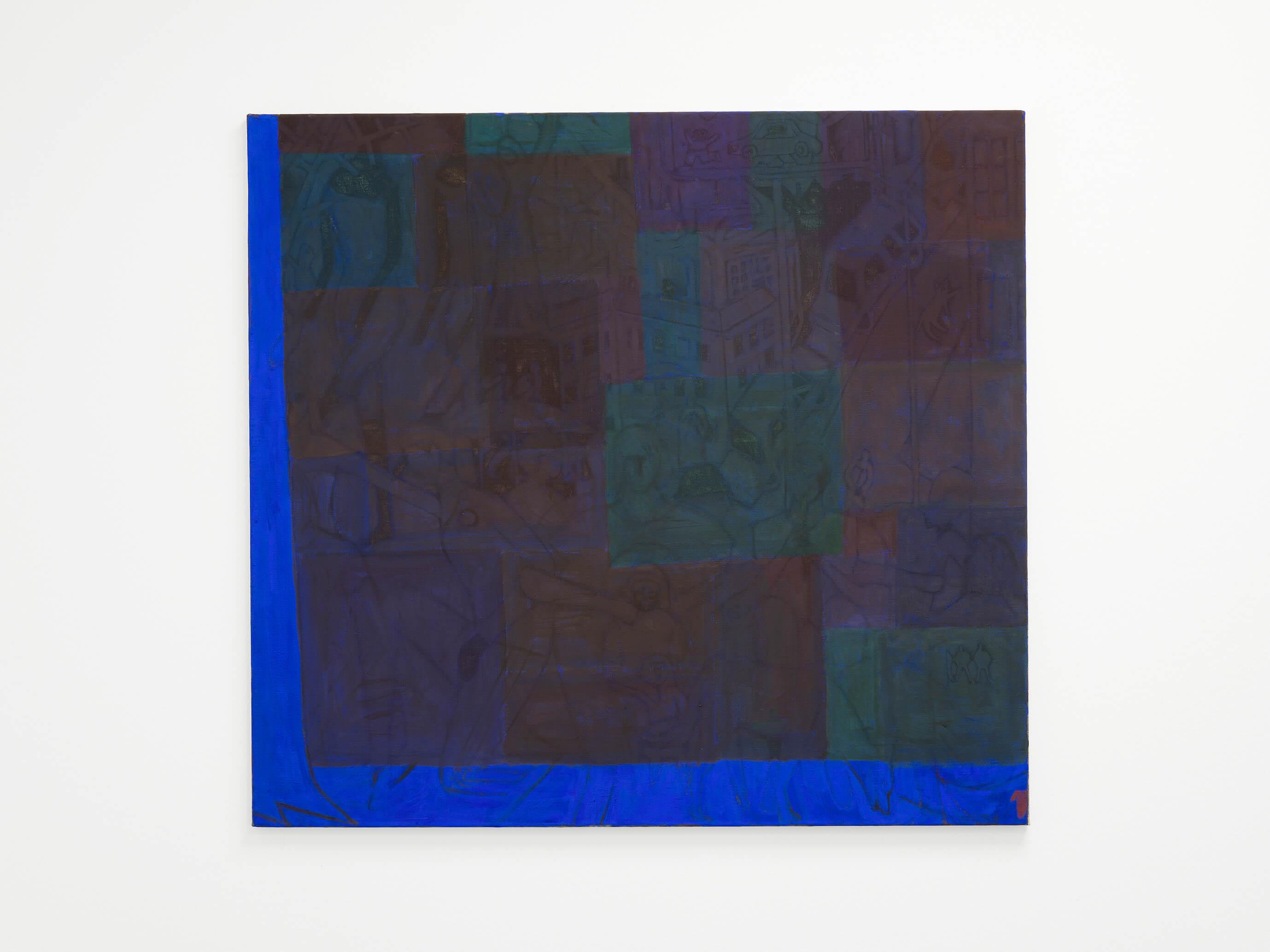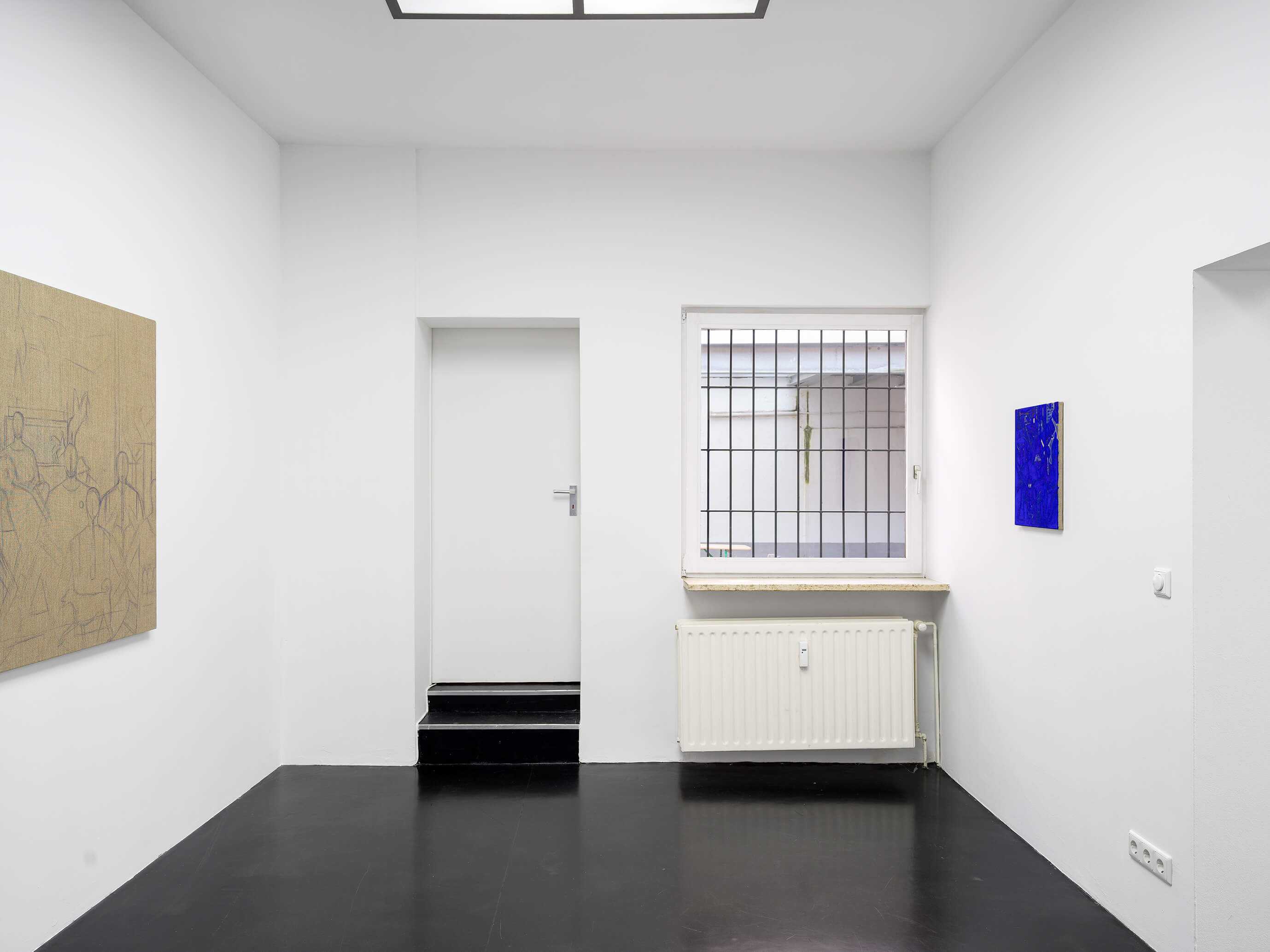 Matthias Nogglerâs paintings question the act of seeing. His figures are frontal, yet they are painted in a velvety blue colorâas if by night itself, rendering their forms barely intelligible. They stand in formations, on provisional stages, arms linkedâeither confronting the viewer or turning their backs to them. They appear trapped within the frames, blurring into their surroundings, their bodies contorted to fit and pose. However, their stiffness and resoluteness have an activating quality, as if calling out the status quo of passive viewing. Nogglerâs work has long been characterized by the appropriation of various historical references and painterly styles. In Iterations, the canvases are loaded with the knowledge about the failed potential of modernist political painting. In that fashion, Nogglerâs figures demand attention and action, however, due to their reduced visibility, those very acts are hindered. The resulting works are abstracted images, which no longer hold hope for grand actions, but attempt to hold the viewer in an unresolved tension of perceiving.