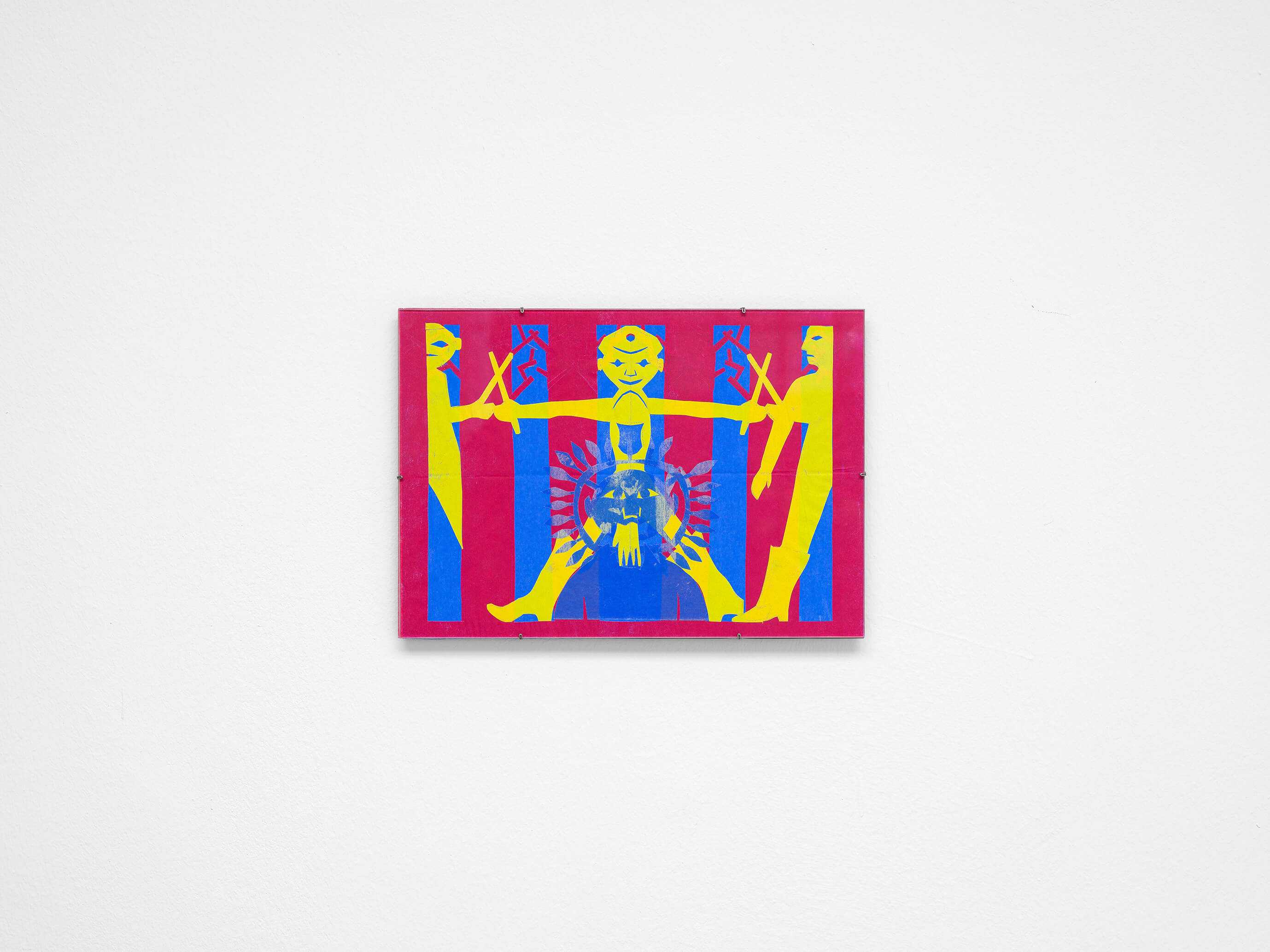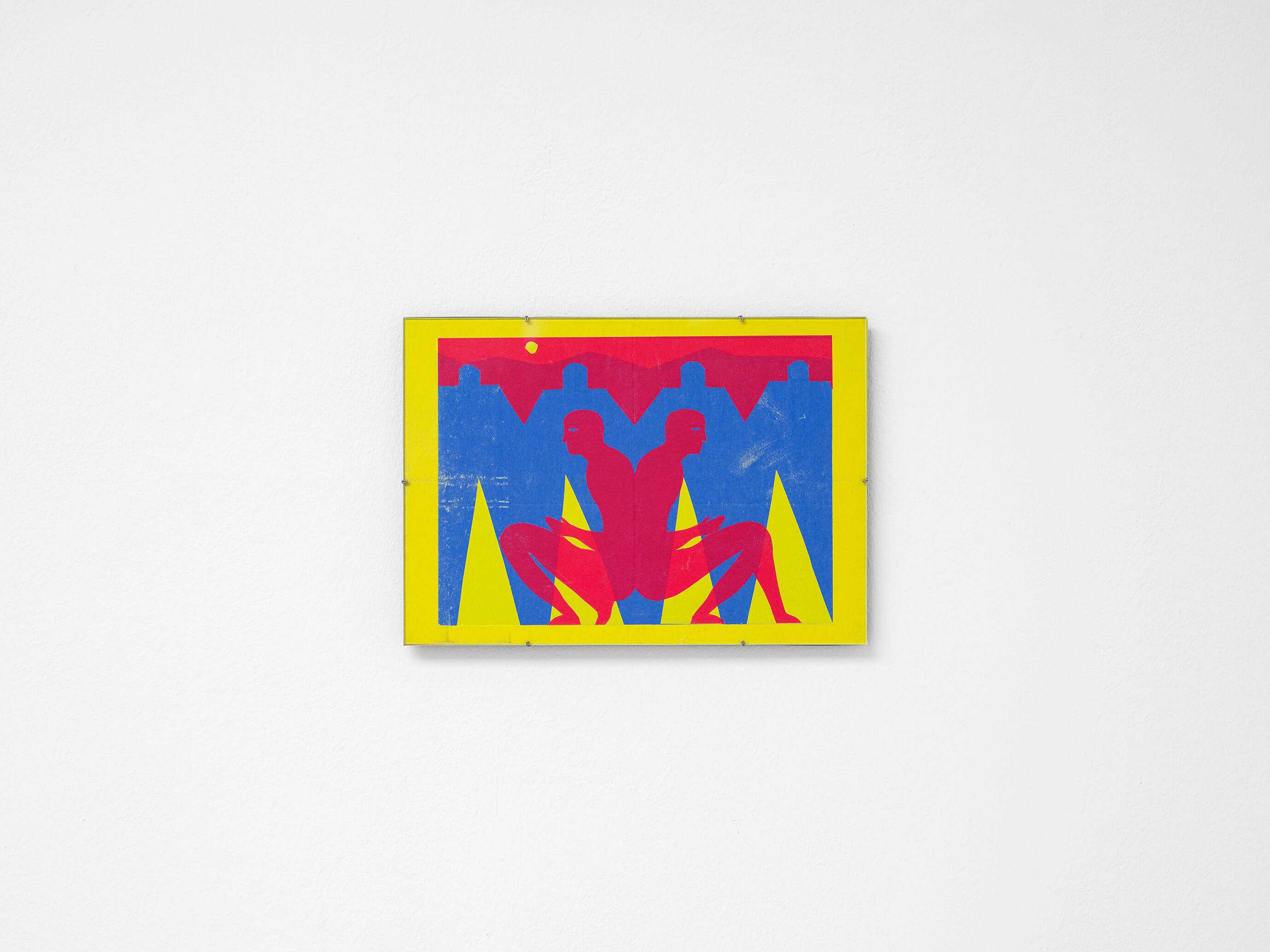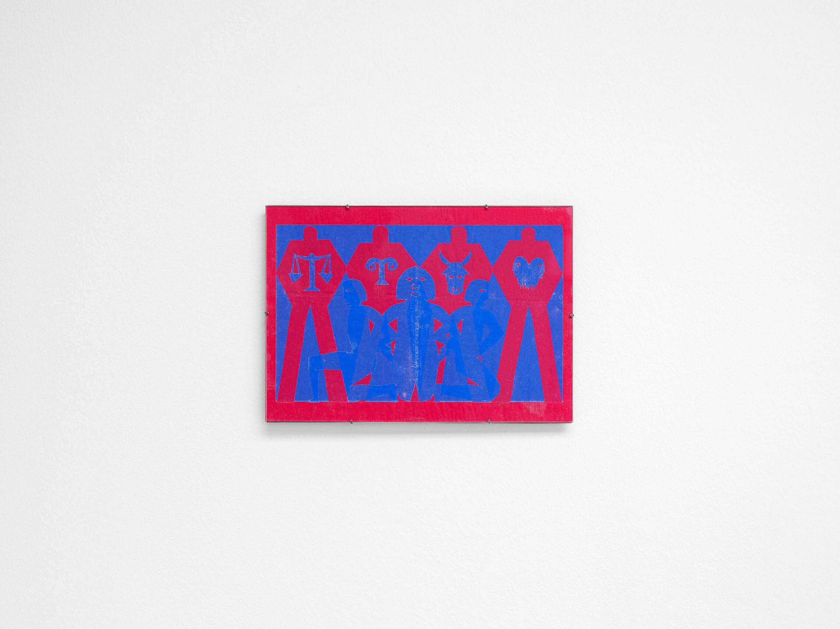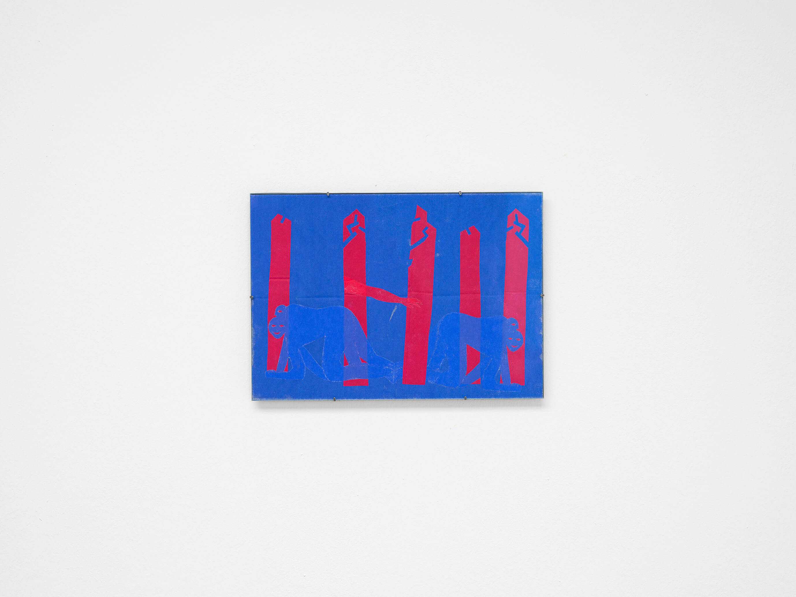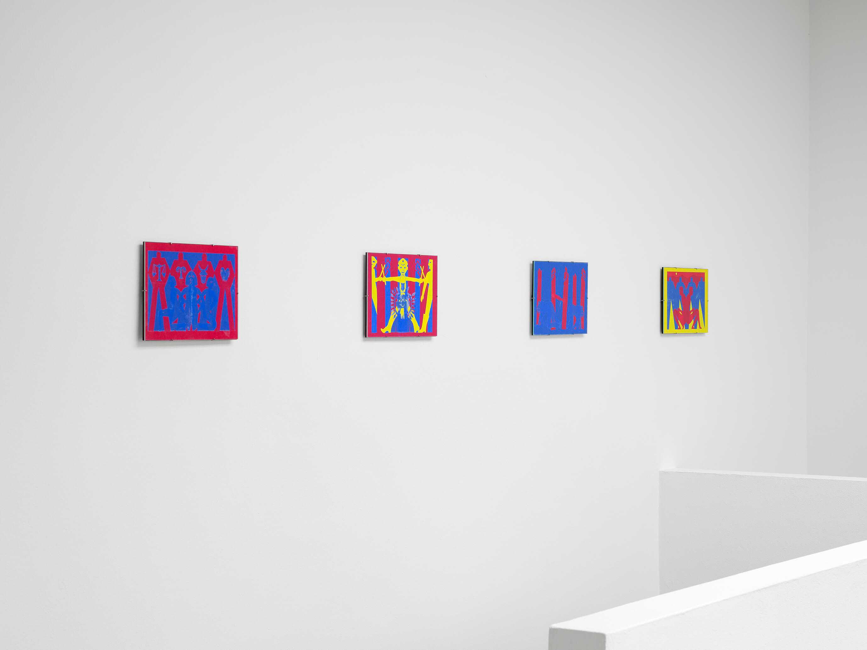 Matthias Nogglerâs paintings question the act of seeing. His figures are frontal, yet they are painted in a velvety blue colorâas if by night itself, rendering their forms barely intelligible. They stand in formations, on provisional stages, arms linkedâeither confronting the viewer or turning their backs to them. They appear trapped within the frames, blurring into their surroundings, their bodies contorted to fit and pose. However, their stiffness and resoluteness have an activating quality, as if calling out the status quo of passive viewing. Nogglerâs work has long been characterized by the appropriation of various historical references and painterly styles. In Iterations, the canvases are loaded with the knowledge about the failed potential of modernist political painting. In that fashion, Nogglerâs figures demand attention and action, however, due to their reduced visibility, those very acts are hindered. The resulting works are abstracted images, which no longer hold hope for grand actions, but attempt to hold the viewer in an unresolved tension of perceiving.